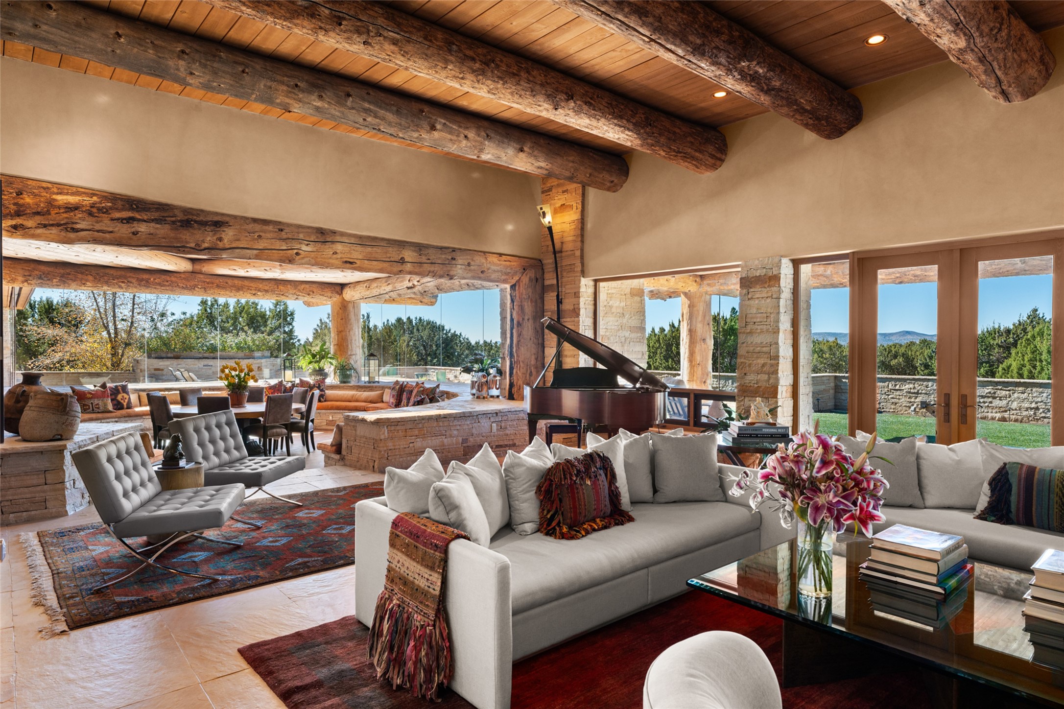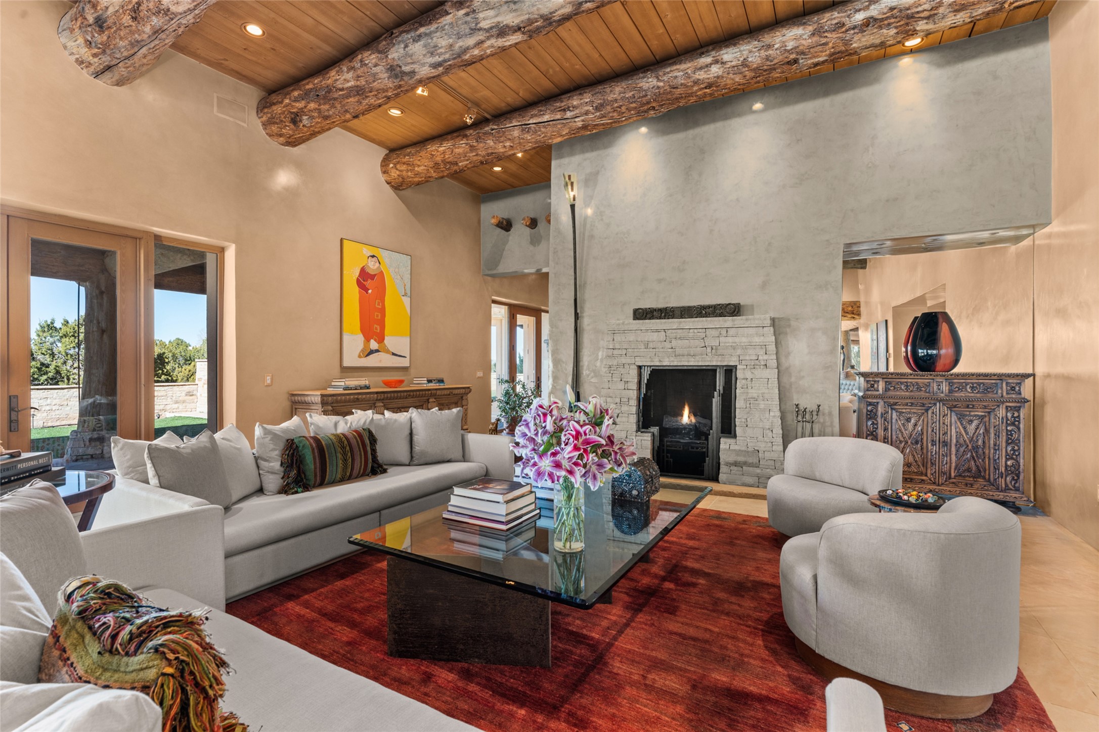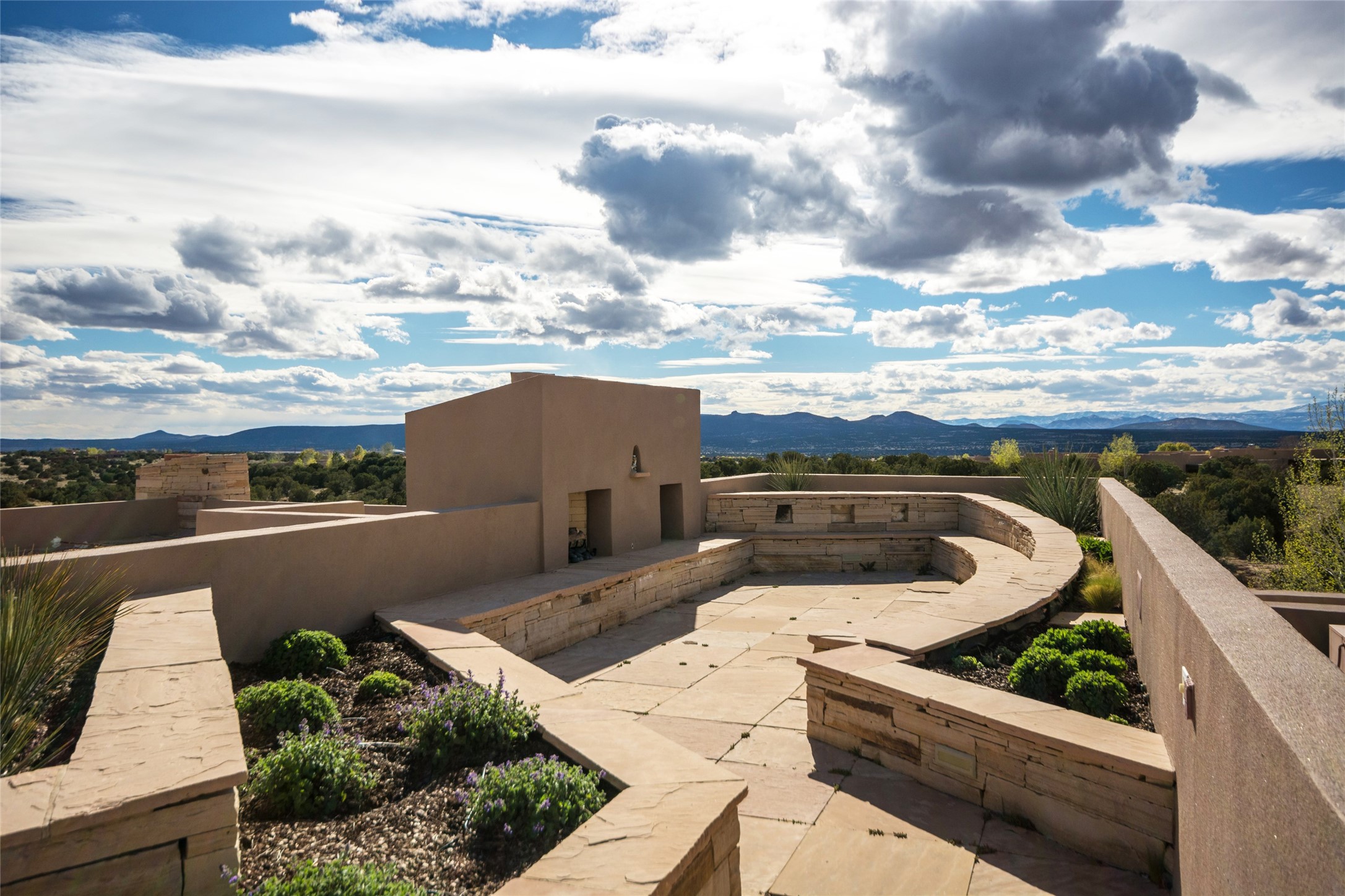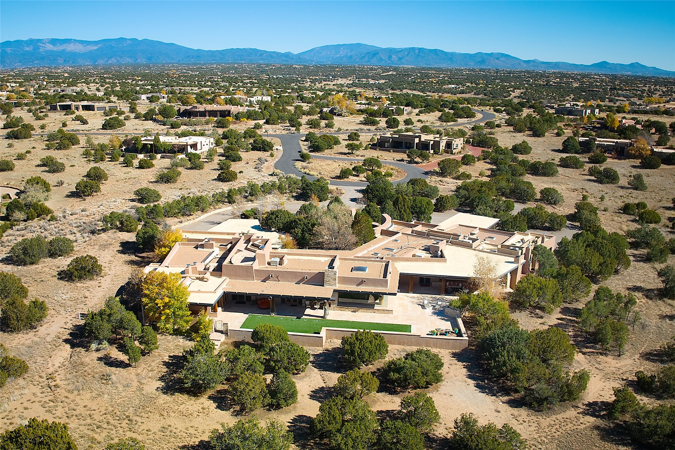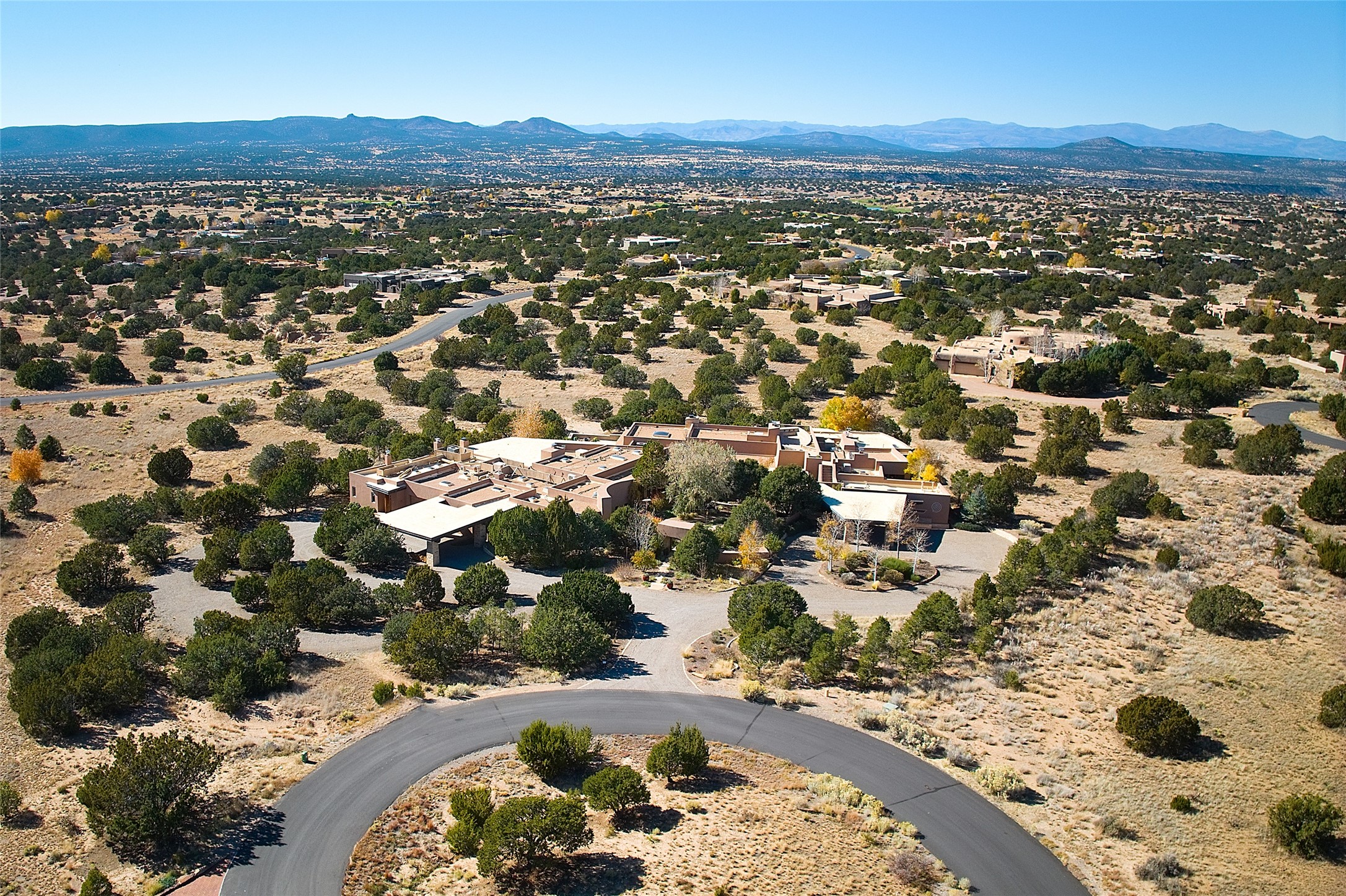 Constructed of solid adobe, this magnificent four-bedroom, 10,354-square-foot estate is an opulent oasis in the renowned community of Las Campanas. Luxurious details and amenities abound: plaster walls, 11 fireplaces, a central vacuum system, remote-controlled window shades, an indoor-outdoor sound system, and hand-adzed wood and upholstered leather doors. Highlights include a living room with a custom-designed fireplace and glass sconces hand-blown by artist Duane Dahl; a kiva-inspired dining room with sturdy reclaimed posts and stacked ceiling vigas; a media room with surround sound; and a kitchen with a butler's pantry, two dishwashers and sinks, a six-burner Dacor range, warming drawers, three ovens, and a walk-in pantry. The oversized owner's suite has two marble baths with custom-designed cantilevered cabinetry and a shared garden. Each of the two guest suites includes a custom closet and a private porch. Artists and professionals will appreciate the office and craft suite, which has a separate entrance. Portales with automatic sunshades, patios, and a rooftop deck are perfect for entertaining and enjoying majestic sunsets. The property also offers a heated garage, two porte cochres, two circular driveways, and extensive parking. The superior amenities of Las Campanas include two Jack Nicklaus Signature golf courses, an equestrian center, indoor and outdoor swimming pools, tennis courts, a fitness center, a spa, and a clubhouse offering casual and fine dining.