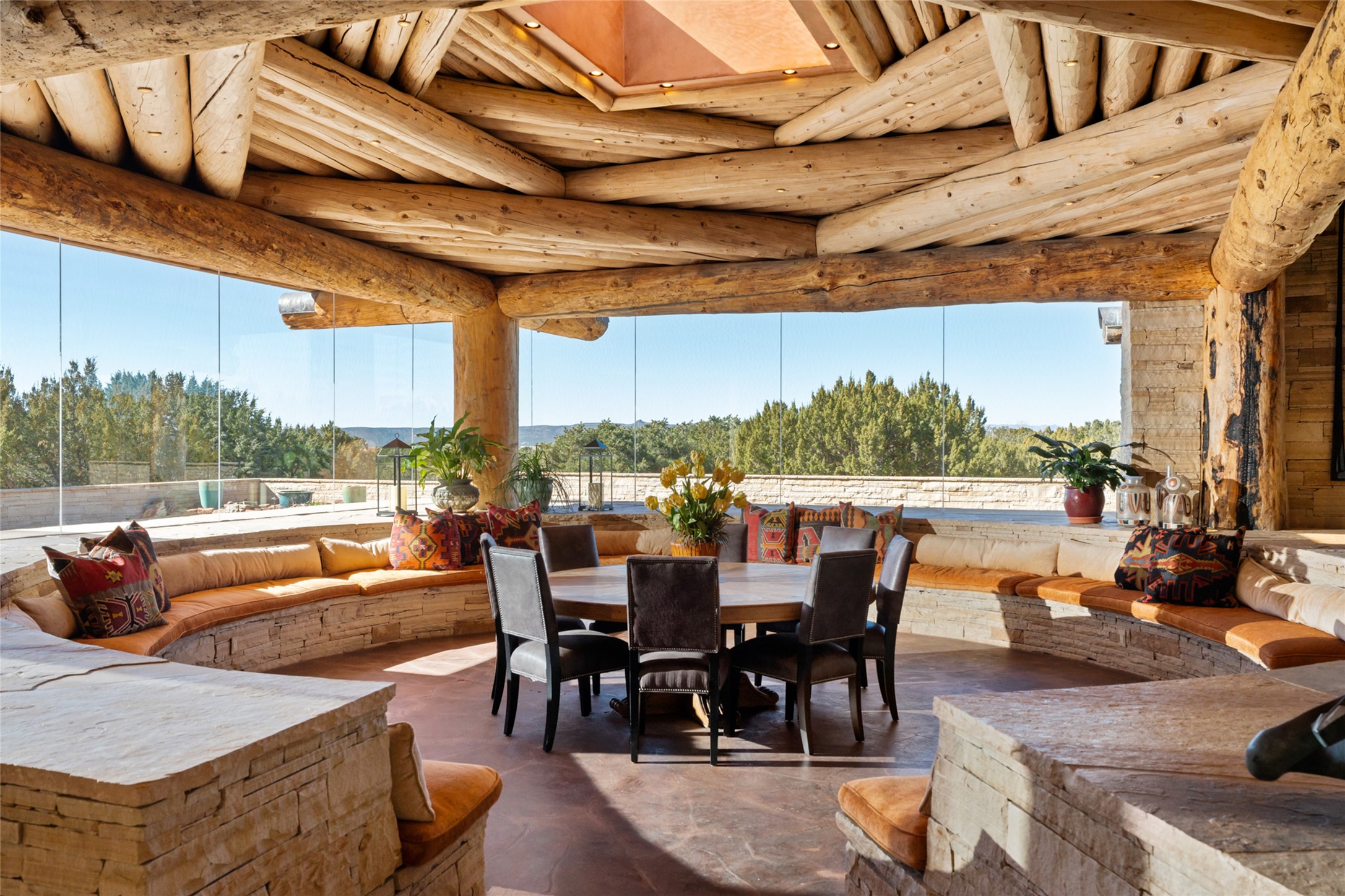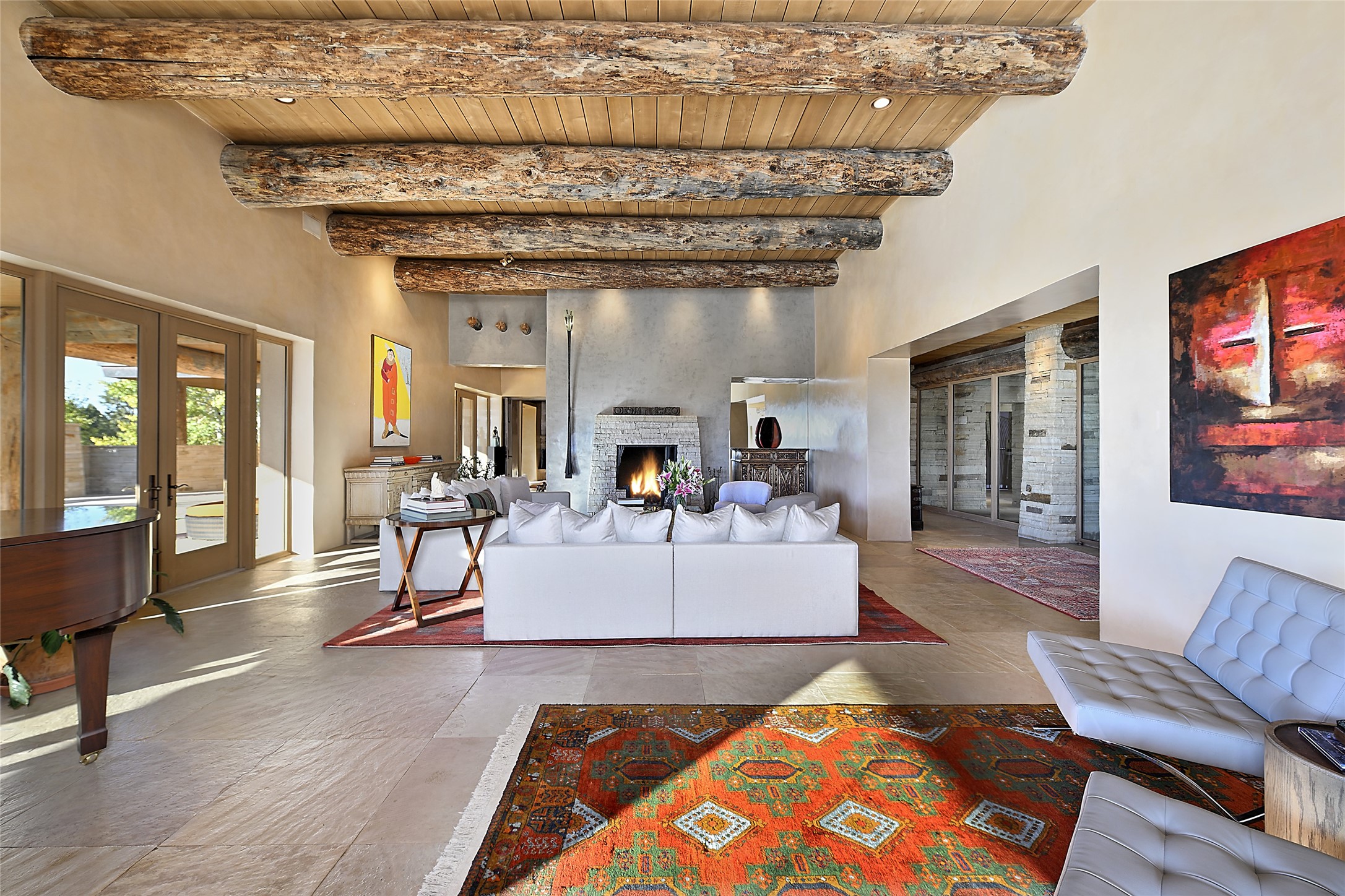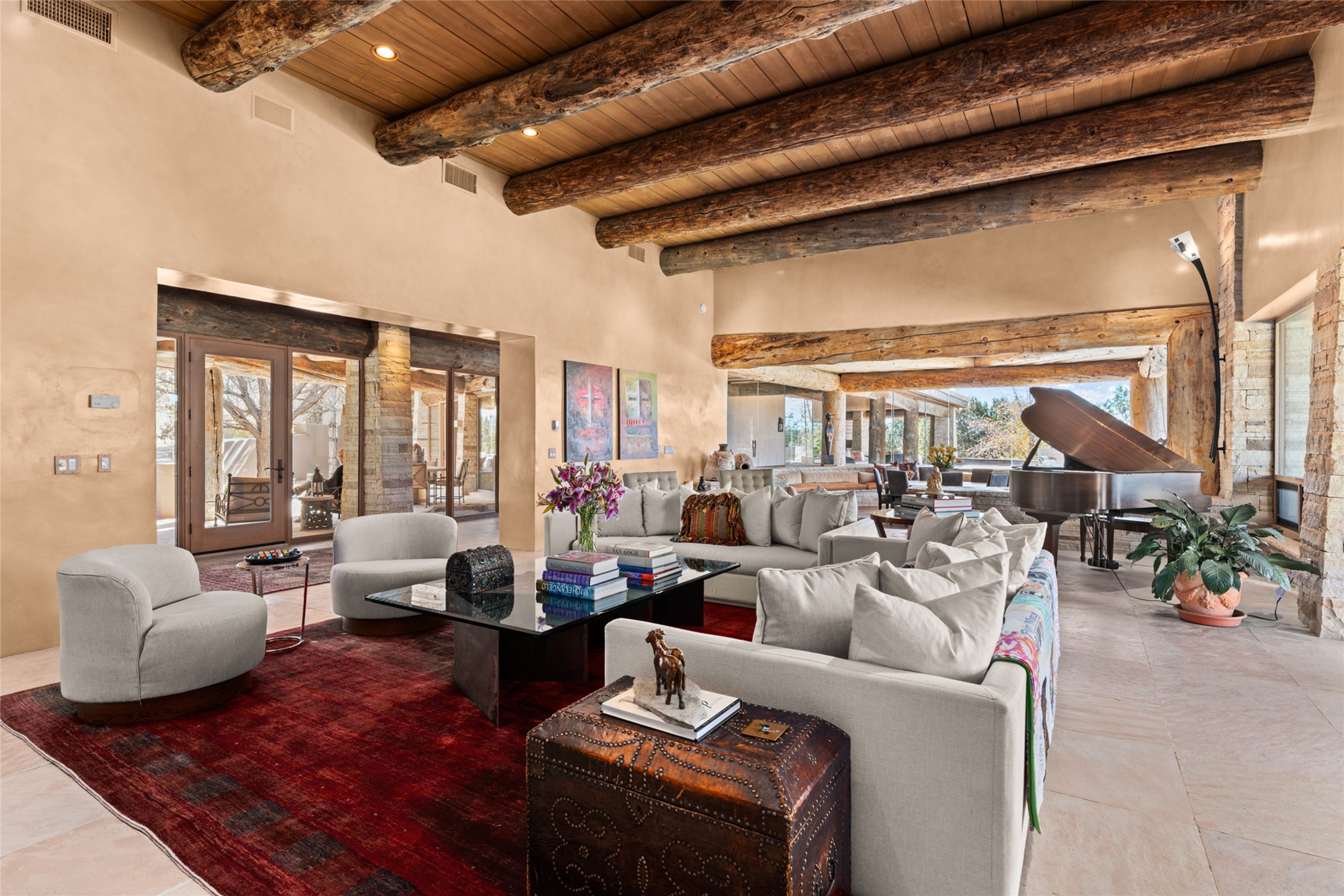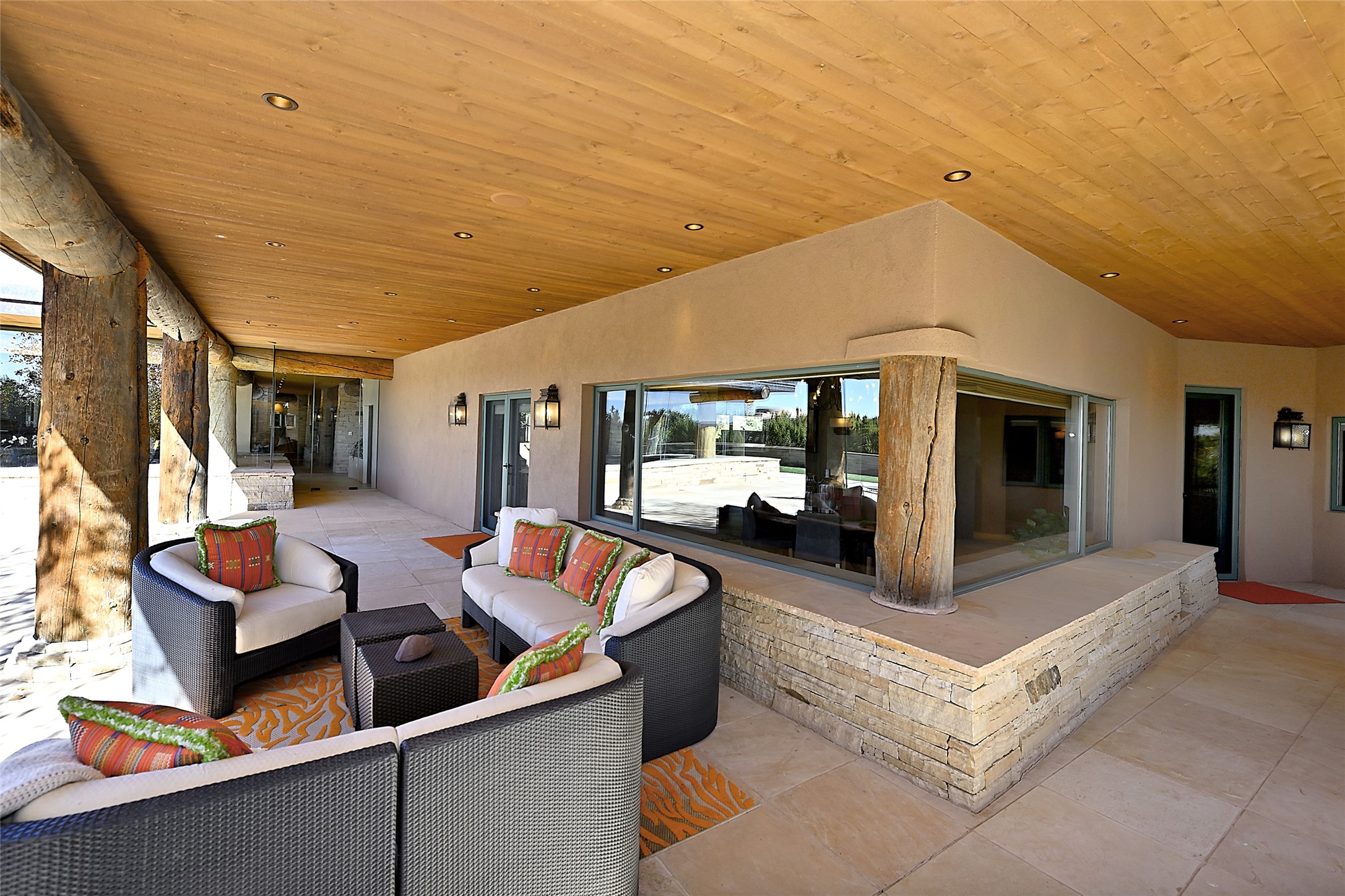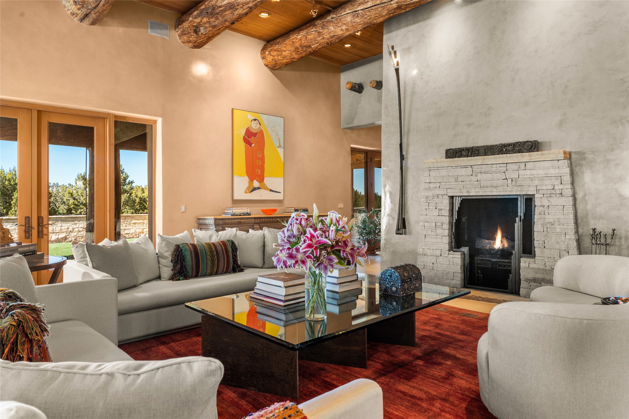 Constructed of solid adobe, this magnificent four-bedroom, 10,354-square-foot estate is an opulent oasis in the renowned community of Las Campanas. Luxurious details and amenities abound: plaster walls, 11 fireplaces, a central vacuum system, remote-controlled window shades, an indoor-outdoor sound system, and hand-adzed wood and upholstered leather doors. Highlights include a living room with a custom-designed fireplace and glass sconces hand-blown by artist Duane Dahl; a kiva-inspired dining room with sturdy reclaimed posts and stacked ceiling vigas; a media room with surround sound; and a kitchen with a butler's pantry, two dishwashers and sinks, a six-burner Dacor range, warming drawers, three ovens, and a walk-in pantry. The oversized owner's suite has two marble baths with custom-designed cantilevered cabinetry and a shared garden. Each of the two guest suites includes a custom closet and a private porch. Artists and professionals will appreciate the office and craft suite, which has a separate entrance. Portales with automatic sunshades, patios, and a rooftop deck are perfect for entertaining and enjoying majestic sunsets. The property also offers a heated garage, two porte cochres, two circular driveways, and extensive parking. The superior amenities of Las Campanas include two Jack Nicklaus Signature golf courses, an equestrian center, indoor and outdoor swimming pools, tennis courts, a fitness center, a spa, and a clubhouse offering casual and fine dining.