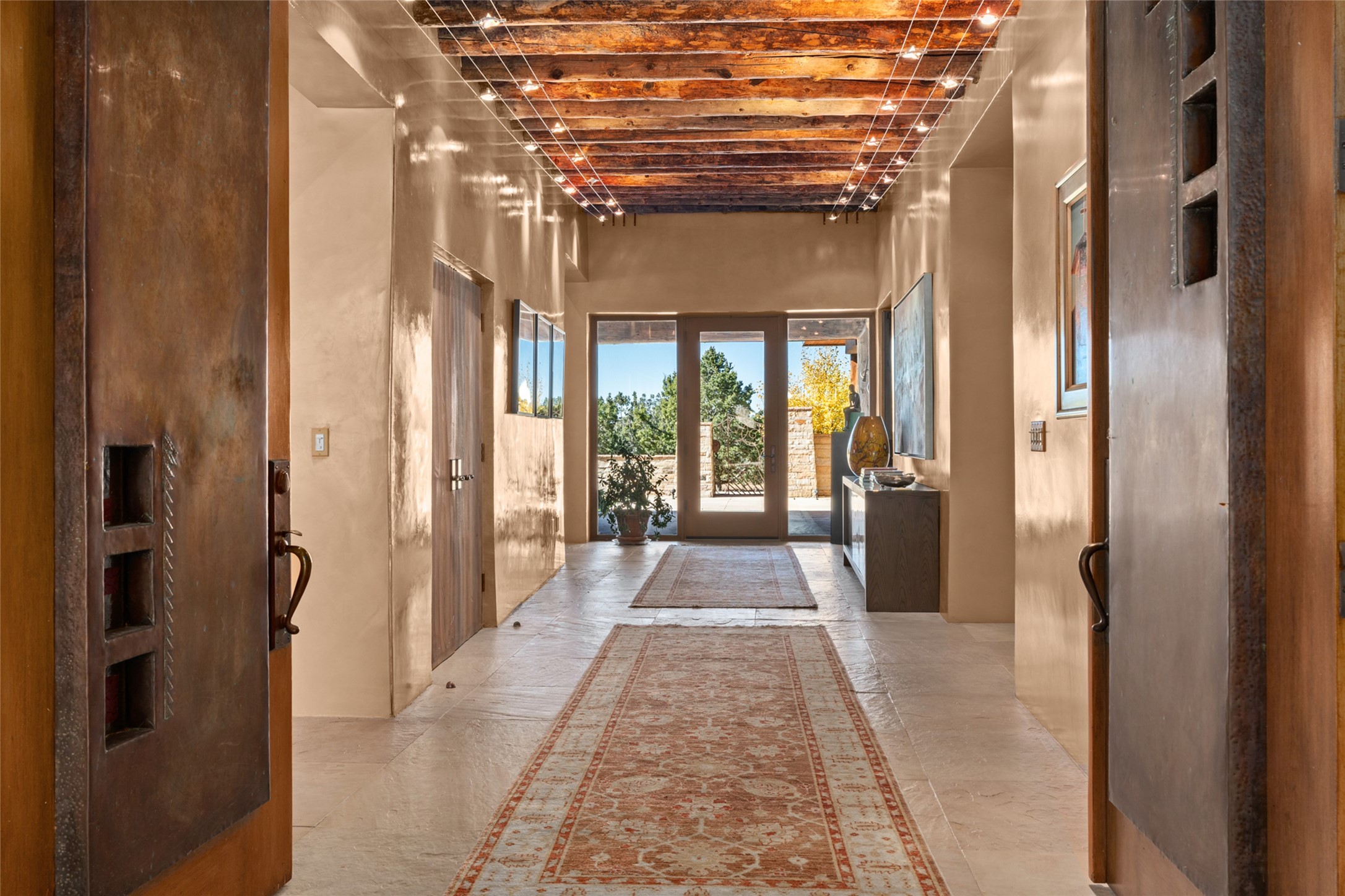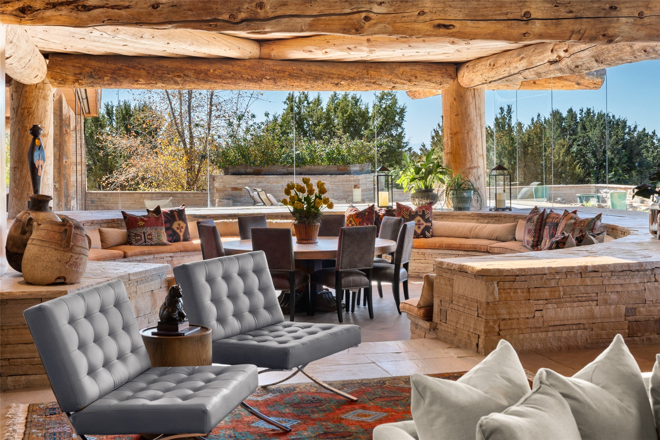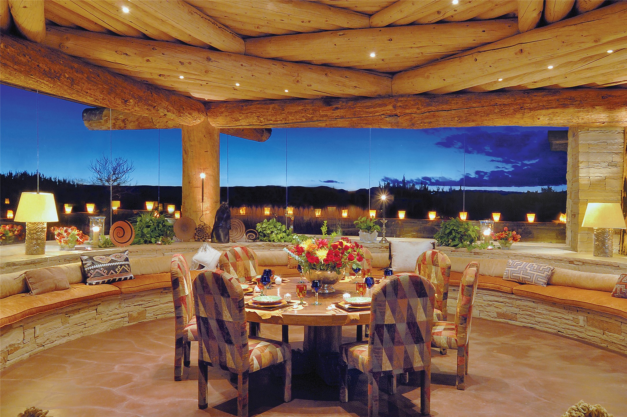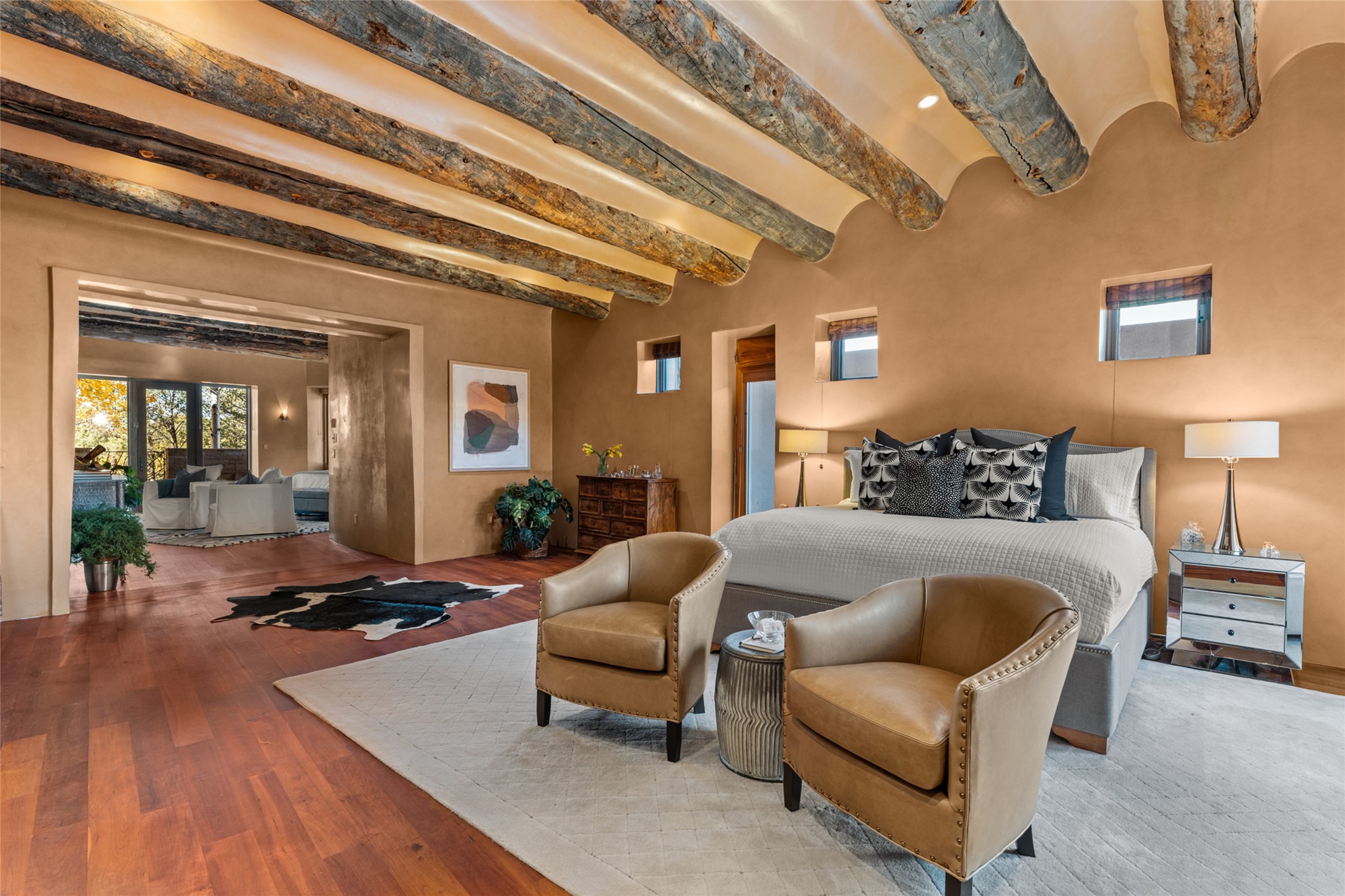 Constructed of solid adobe, this magnificent four-bedroom, 10,354-square-foot estate is an opulent oasis in the renowned community of Las Campanas. Luxurious details and amenities abound: plaster walls, 11 fireplaces, a central vacuum system, remote-controlled window shades, an indoor-outdoor sound system, and hand-adzed wood and upholstered leather doors. Highlights include a living room with a custom-designed fireplace and glass sconces hand-blown by artist Duane Dahl; a kiva-inspired dining room with sturdy reclaimed posts and stacked ceiling vigas; a media room with surround sound; and a kitchen with a butler's pantry, two dishwashers and sinks, a six-burner Dacor range, warming drawers, three ovens, and a walk-in pantry. The oversized owner's suite has two marble baths with custom-designed cantilevered cabinetry and a shared garden. Each of the two guest suites includes a custom closet and a private porch. Artists and professionals will appreciate the office and craft suite, which has a separate entrance. Portales with automatic sunshades, patios, and a rooftop deck are perfect for entertaining and enjoying majestic sunsets. The property also offers a heated garage, two porte cochres, two circular driveways, and extensive parking. The superior amenities of Las Campanas include two Jack Nicklaus Signature golf courses, an equestrian center, indoor and outdoor swimming pools, tennis courts, a fitness center, a spa, and a clubhouse offering casual and fine dining.