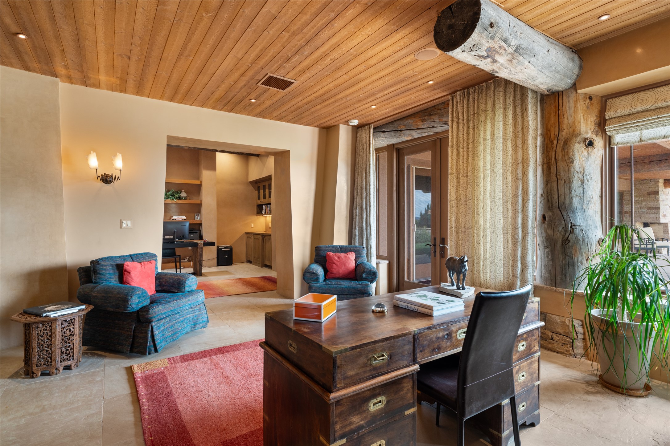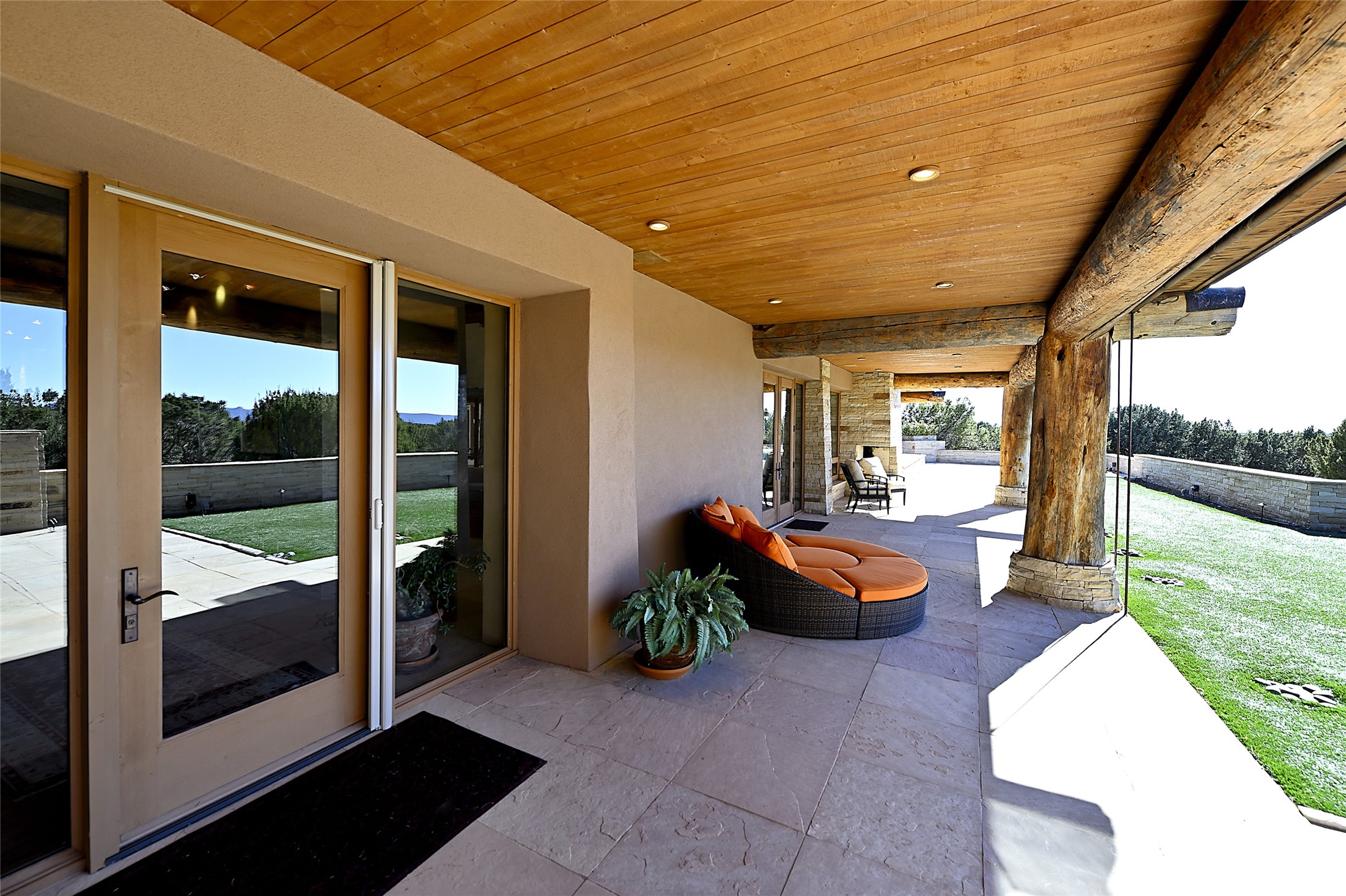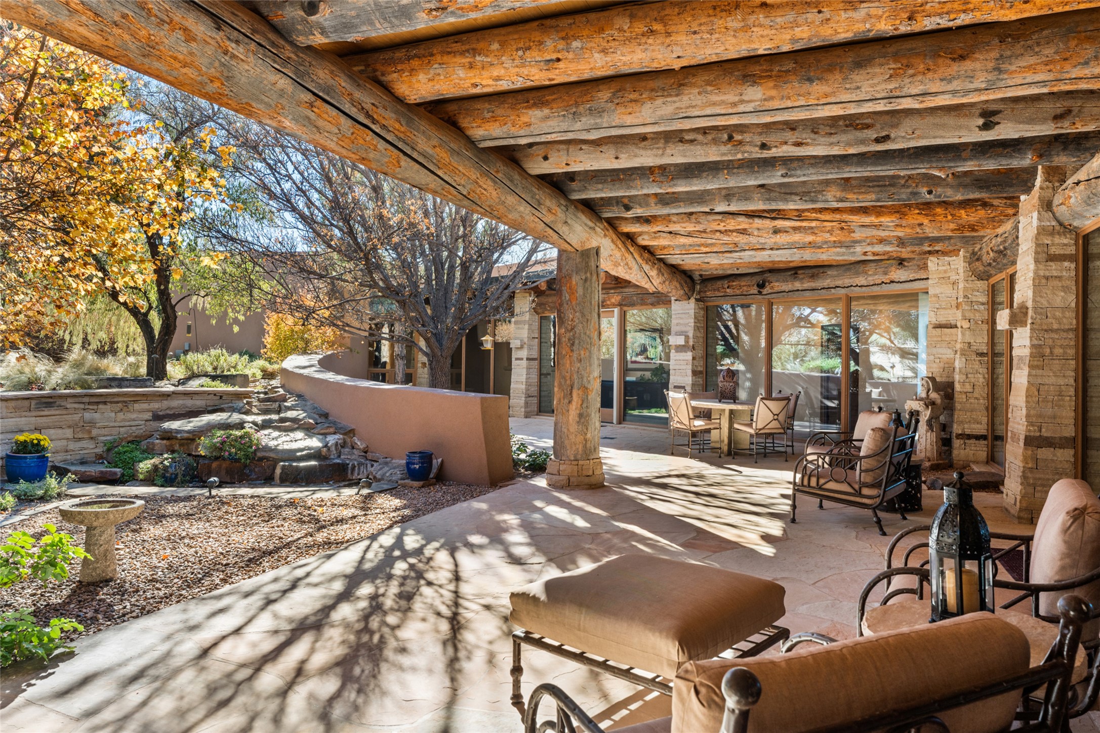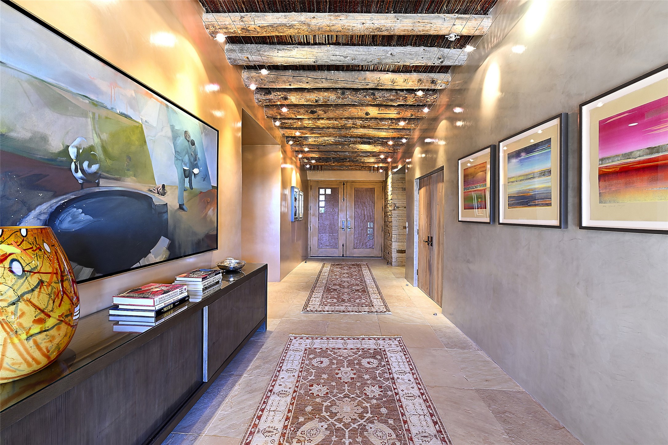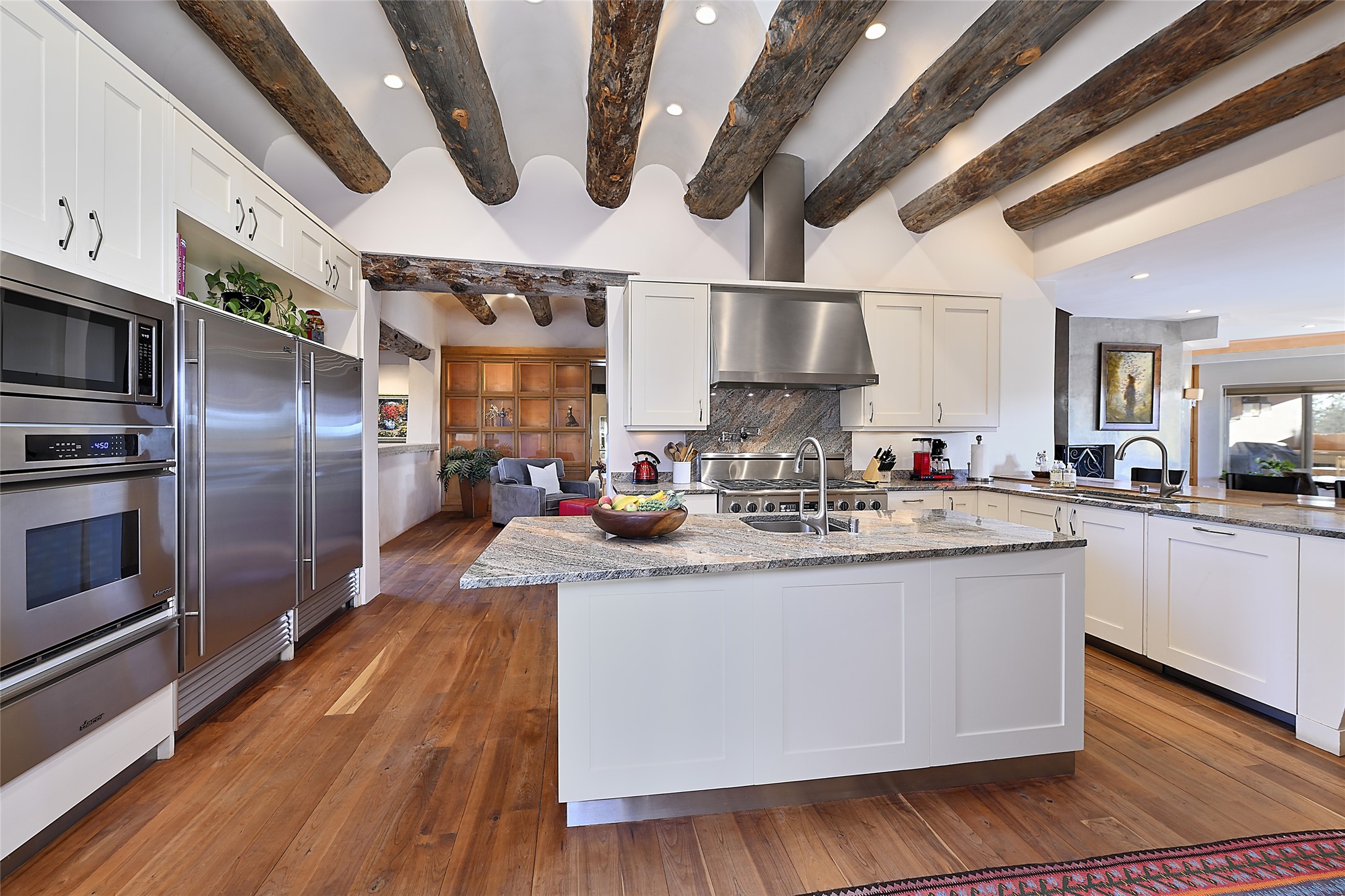 Constructed of solid adobe, this magnificent four-bedroom, 10,354-square-foot estate is an opulent oasis in the renowned community of Las Campanas. Luxurious details and amenities abound: plaster walls, 11 fireplaces, a central vacuum system, remote-controlled window shades, an indoor-outdoor sound system, and hand-adzed wood and upholstered leather doors. Highlights include a living room with a custom-designed fireplace and glass sconces hand-blown by artist Duane Dahl; a kiva-inspired dining room with sturdy reclaimed posts and stacked ceiling vigas; a media room with surround sound; and a kitchen with a butler's pantry, two dishwashers and sinks, a six-burner Dacor range, warming drawers, three ovens, and a walk-in pantry. The oversized owner's suite has two marble baths with custom-designed cantilevered cabinetry and a shared garden. Each of the two guest suites includes a custom closet and a private porch. Artists and professionals will appreciate the office and craft suite, which has a separate entrance. Portales with automatic sunshades, patios, and a rooftop deck are perfect for entertaining and enjoying majestic sunsets. The property also offers a heated garage, two porte cochres, two circular driveways, and extensive parking. The superior amenities of Las Campanas include two Jack Nicklaus Signature golf courses, an equestrian center, indoor and outdoor swimming pools, tennis courts, a fitness center, a spa, and a clubhouse offering casual and fine dining.