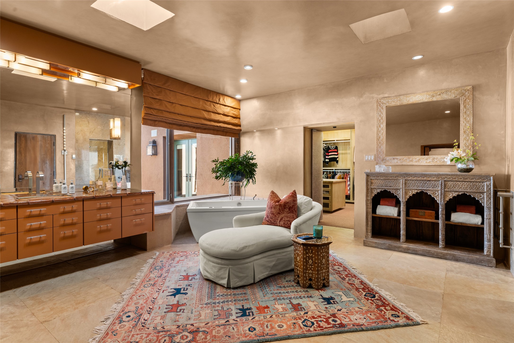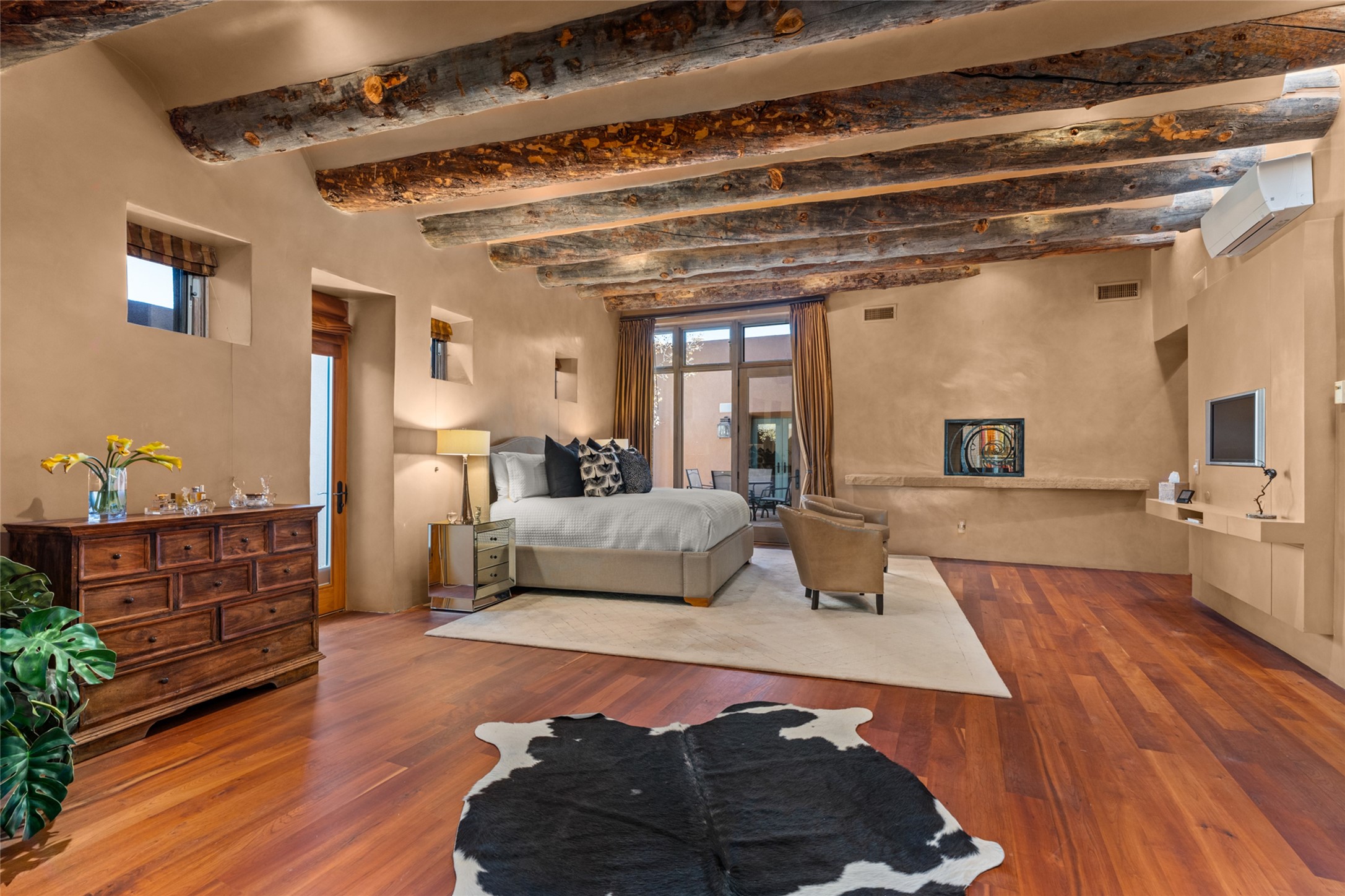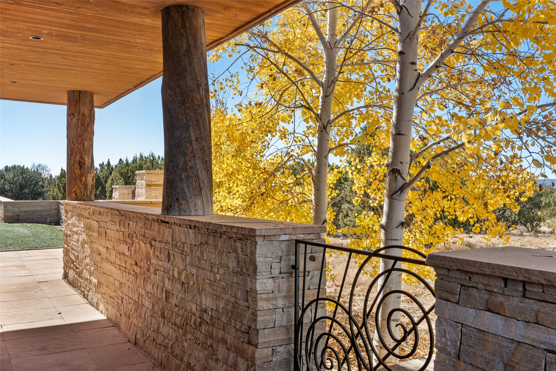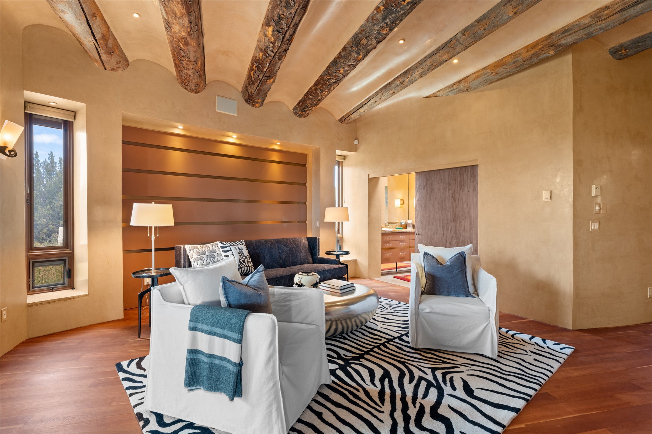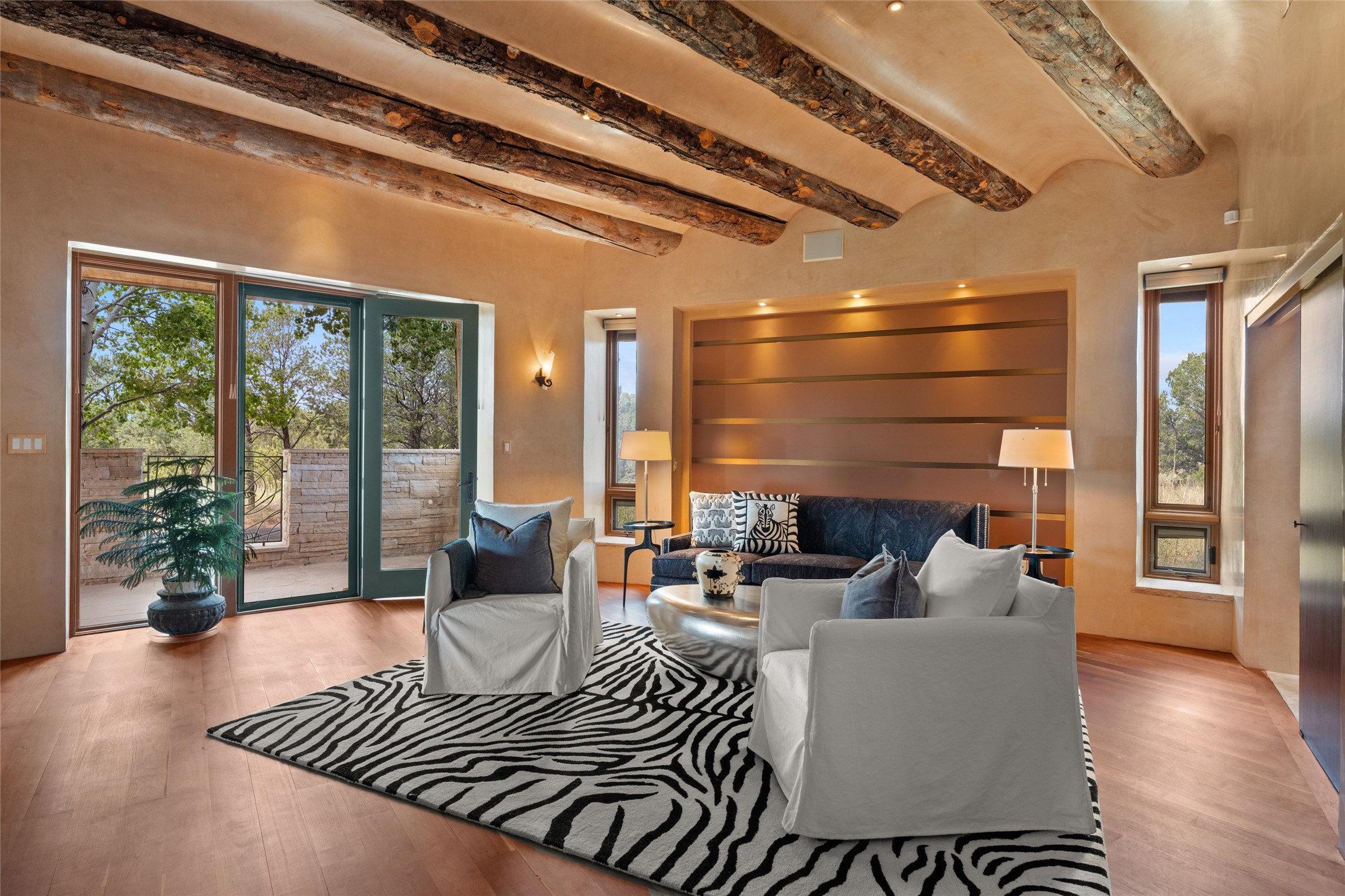Constructed of solid adobe, this magnificent four-bedroom, 10,354-square-foot estate is an opulent oasis in the renowned community of Las Campanas. Luxurious details and amenities abound: plaster walls, 11 fireplaces, a central vacuum system, remote-controlled window shades, an indoor-outdoor sound system, and hand-adzed wood and upholstered leather doors. Highlights include a living room with a custom-designed fireplace and glass sconces hand-blown by artist Duane Dahl; a kiva-inspired dining room with sturdy reclaimed posts and stacked ceiling vigas; a media room with surround sound; and a kitchen with a butler's pantry, two dishwashers and sinks, a six-burner Dacor range, warming drawers, three ovens, and a walk-in pantry. The oversized owner's suite has two marble baths with custom-designed cantilevered cabinetry and a shared garden. Each of the two guest suites includes a custom closet and a private porch. Artists and professionals will appreciate the office and craft suite, which has a separate entrance. Portales with automatic sunshades, patios, and a rooftop deck are perfect for entertaining and enjoying majestic sunsets. The property also offers a heated garage, two porte cochres, two circular driveways, and extensive parking. The superior amenities of Las Campanas include two Jack Nicklaus Signature golf courses, an equestrian center, indoor and outdoor swimming pools, tennis courts, a fitness center, a spa, and a clubhouse offering casual and fine dining.