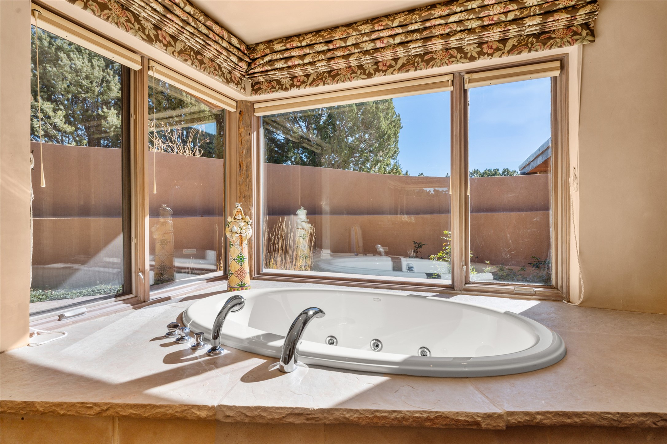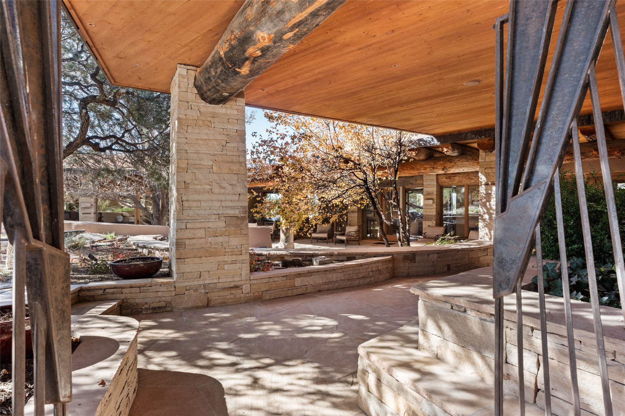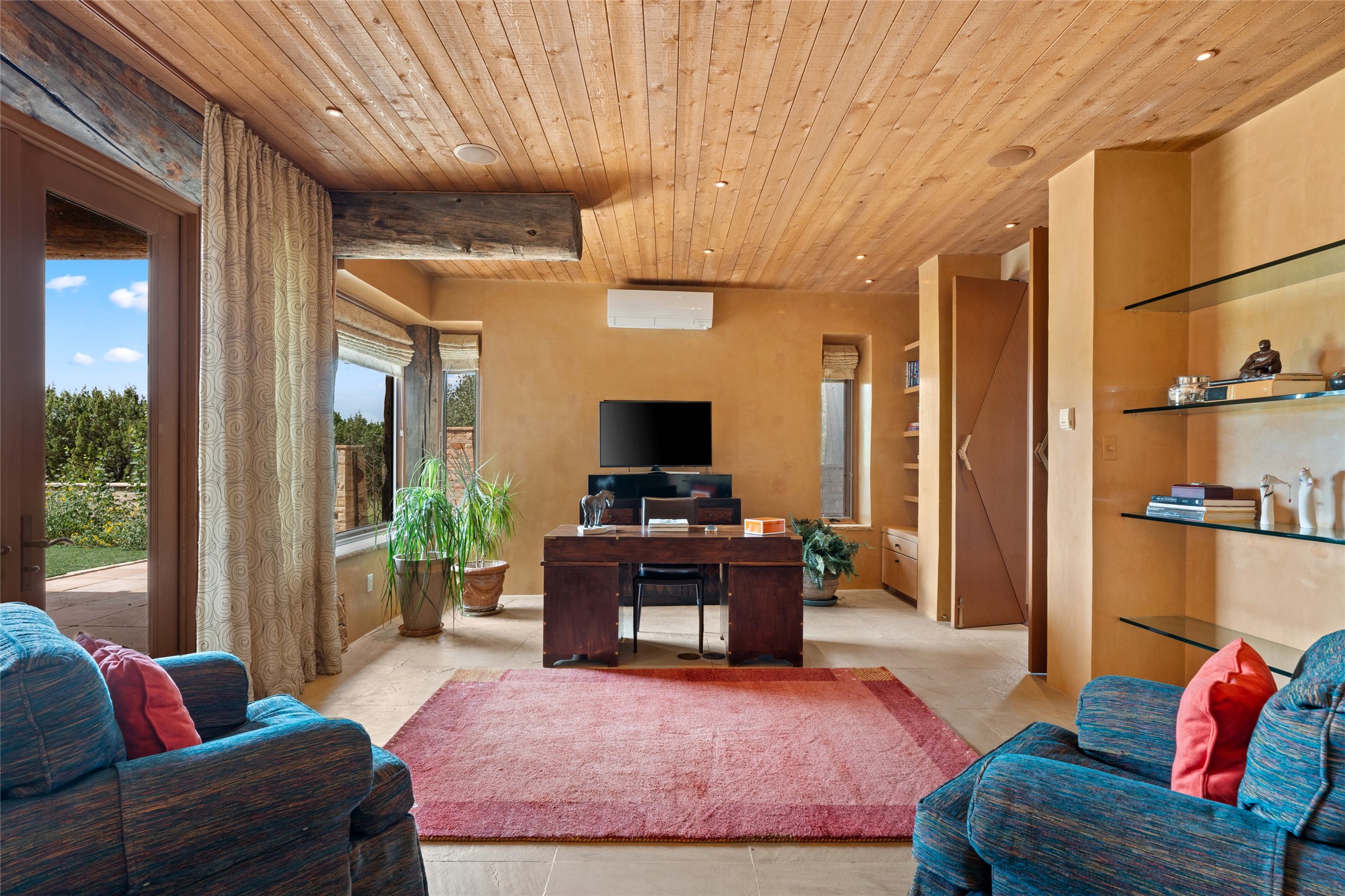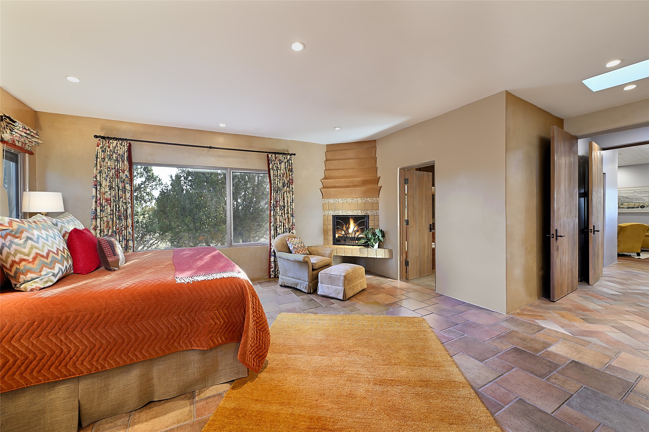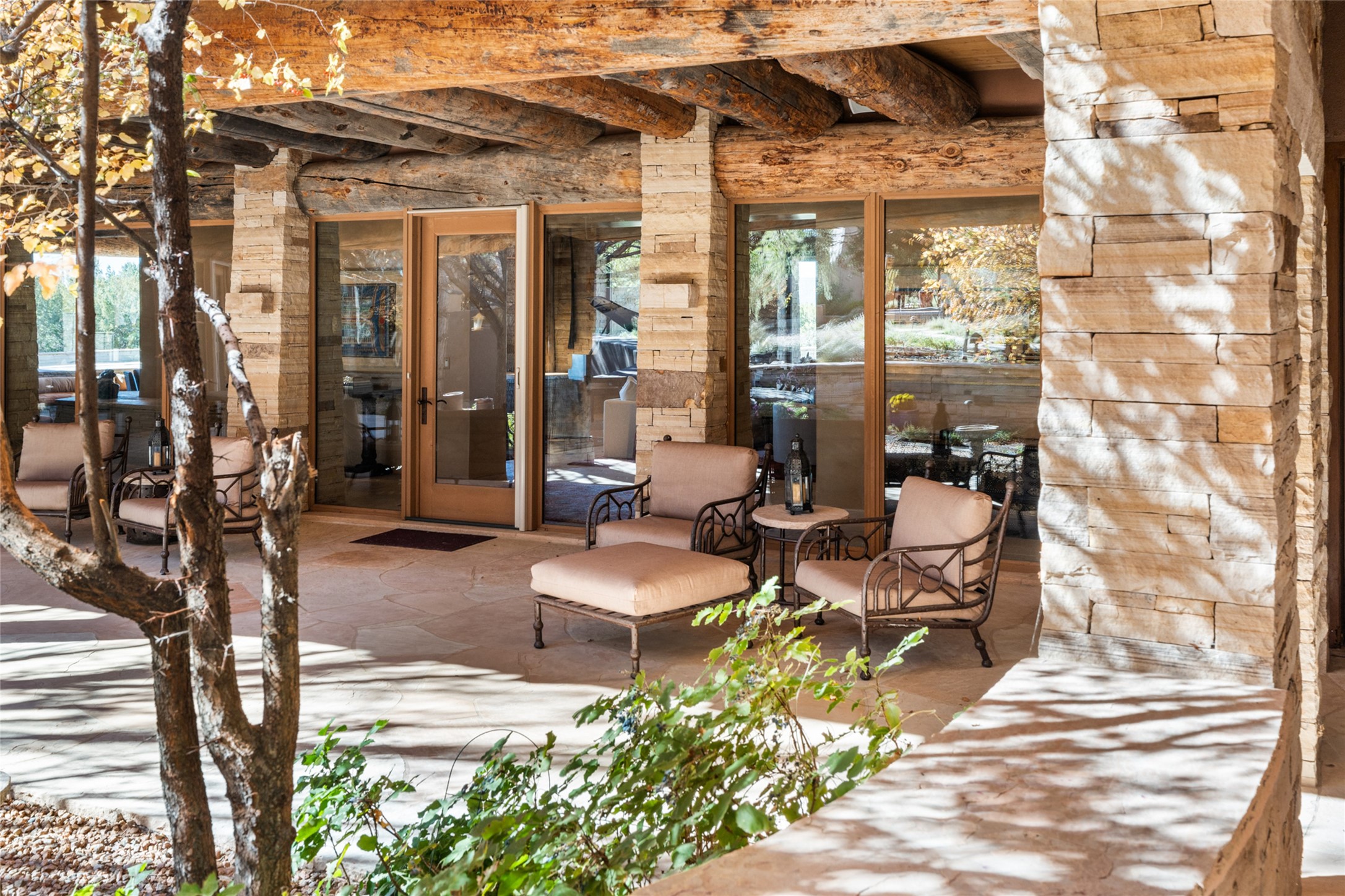Constructed of solid adobe, this magnificent four-bedroom, 10,354-square-foot estate is an opulent oasis in the renowned community of Las Campanas. Luxurious details and amenities abound: plaster walls, 11 fireplaces, a central vacuum system, remote-controlled window shades, an indoor-outdoor sound system, and hand-adzed wood and upholstered leather doors. Highlights include a living room with a custom-designed fireplace and glass sconces hand-blown by artist Duane Dahl; a kiva-inspired dining room with sturdy reclaimed posts and stacked ceiling vigas; a media room with surround sound; and a kitchen with a butler's pantry, two dishwashers and sinks, a six-burner Dacor range, warming drawers, three ovens, and a walk-in pantry. The oversized owner's suite has two marble baths with custom-designed cantilevered cabinetry and a shared garden. Each of the two guest suites includes a custom closet and a private porch. Artists and professionals will appreciate the office and craft suite, which has a separate entrance. Portales with automatic sunshades, patios, and a rooftop deck are perfect for entertaining and enjoying majestic sunsets. The property also offers a heated garage, two porte cochres, two circular driveways, and extensive parking. The superior amenities of Las Campanas include two Jack Nicklaus Signature golf courses, an equestrian center, indoor and outdoor swimming pools, tennis courts, a fitness center, a spa, and a clubhouse offering casual and fine dining.