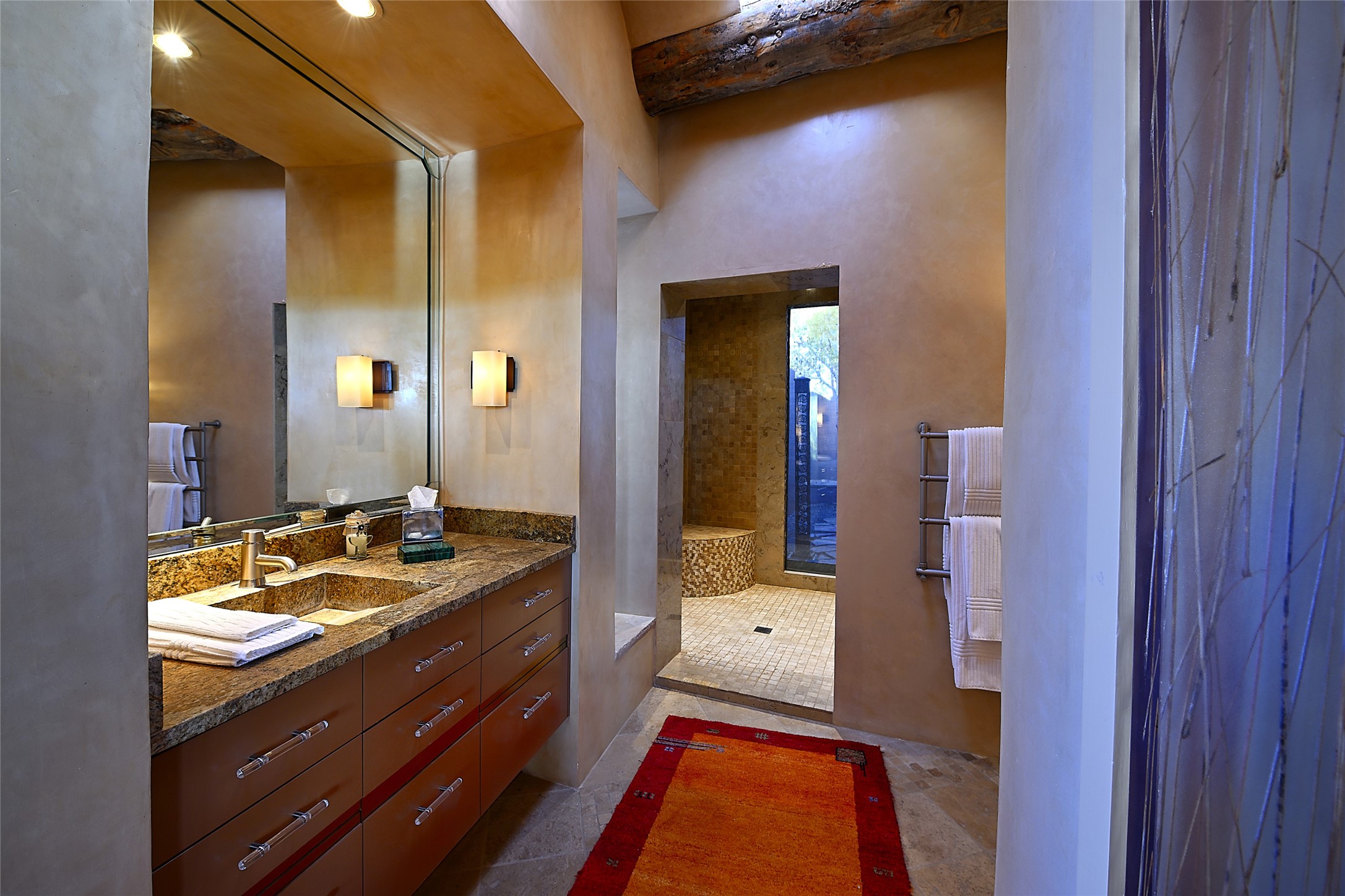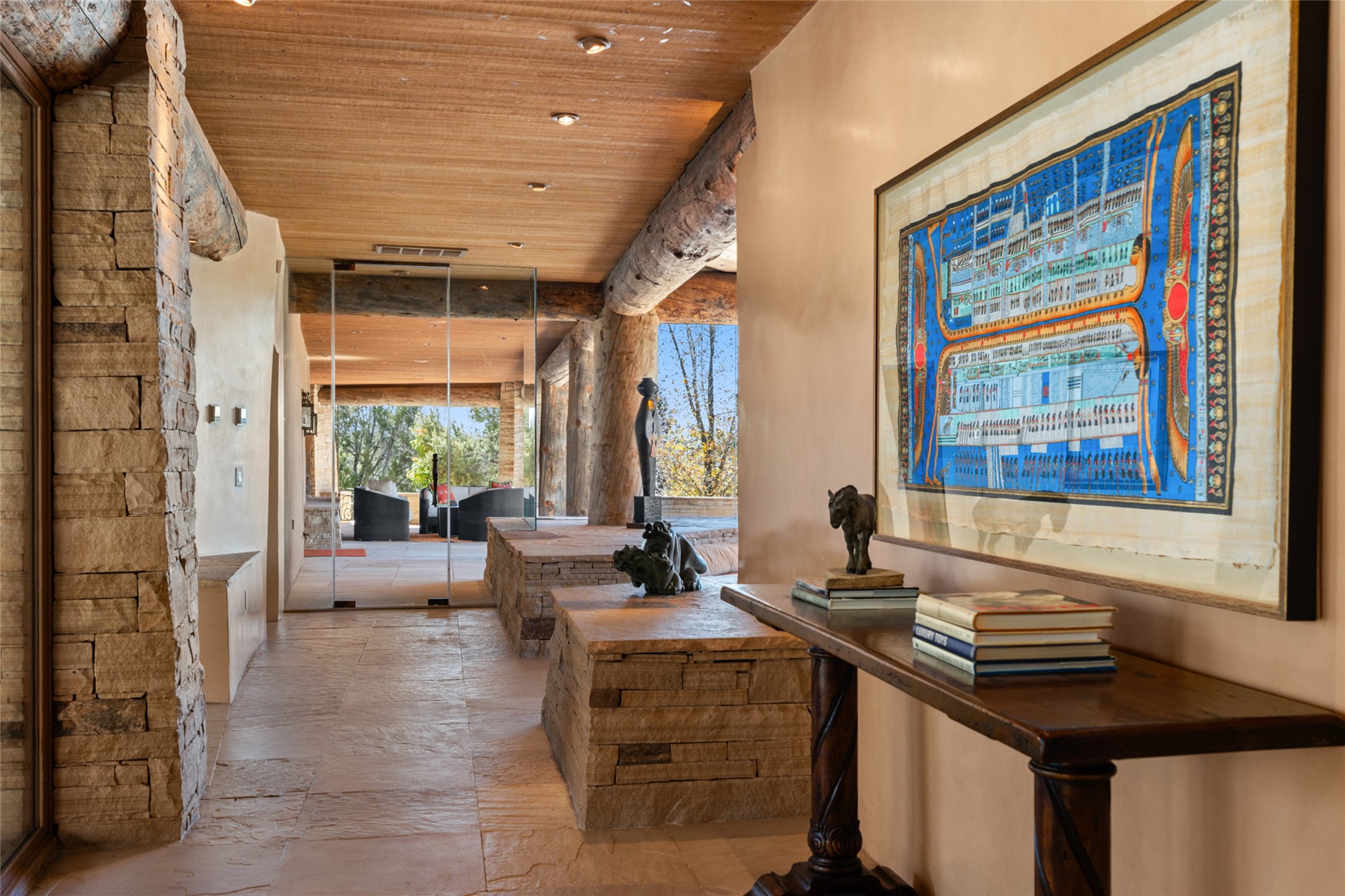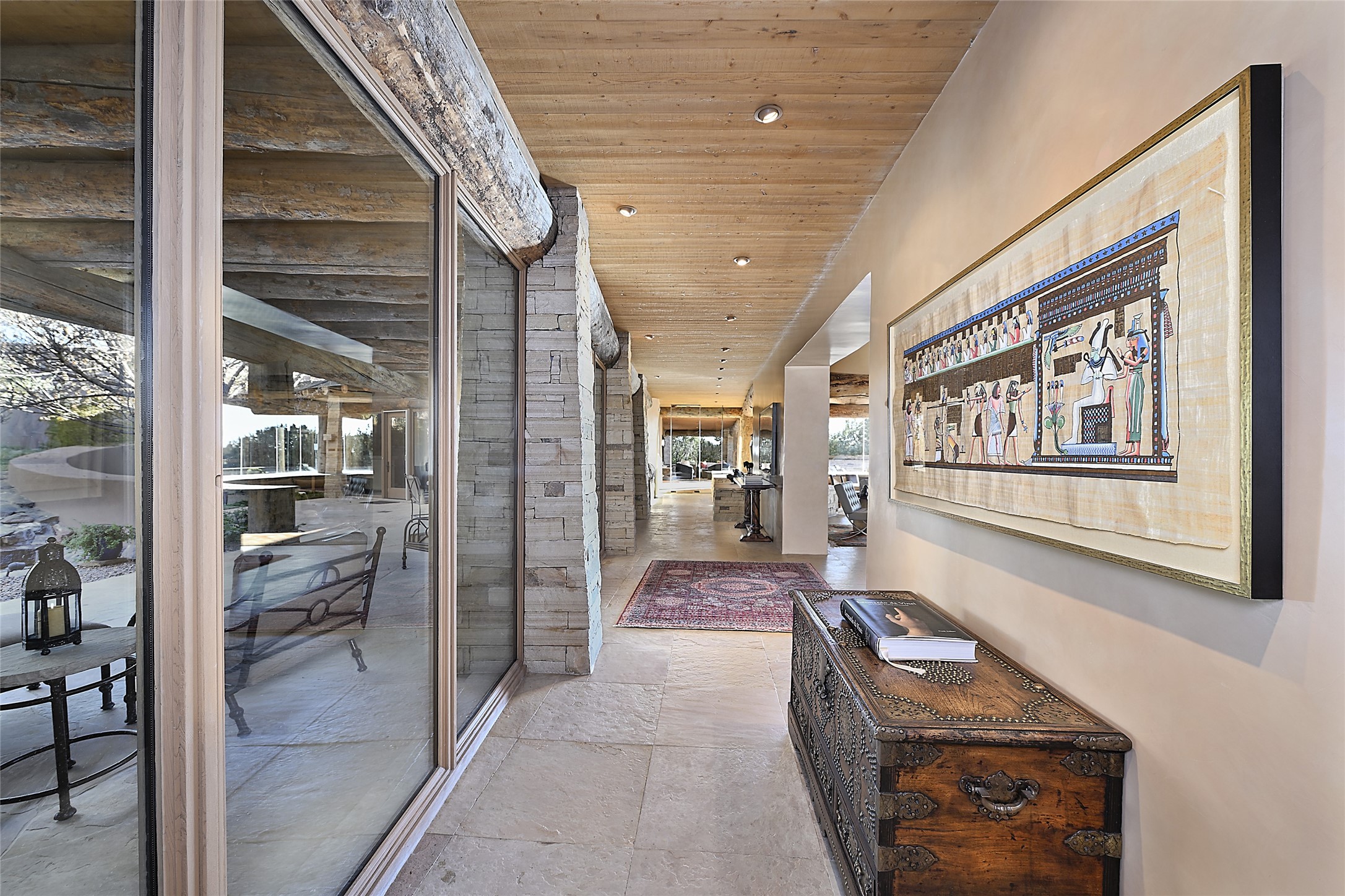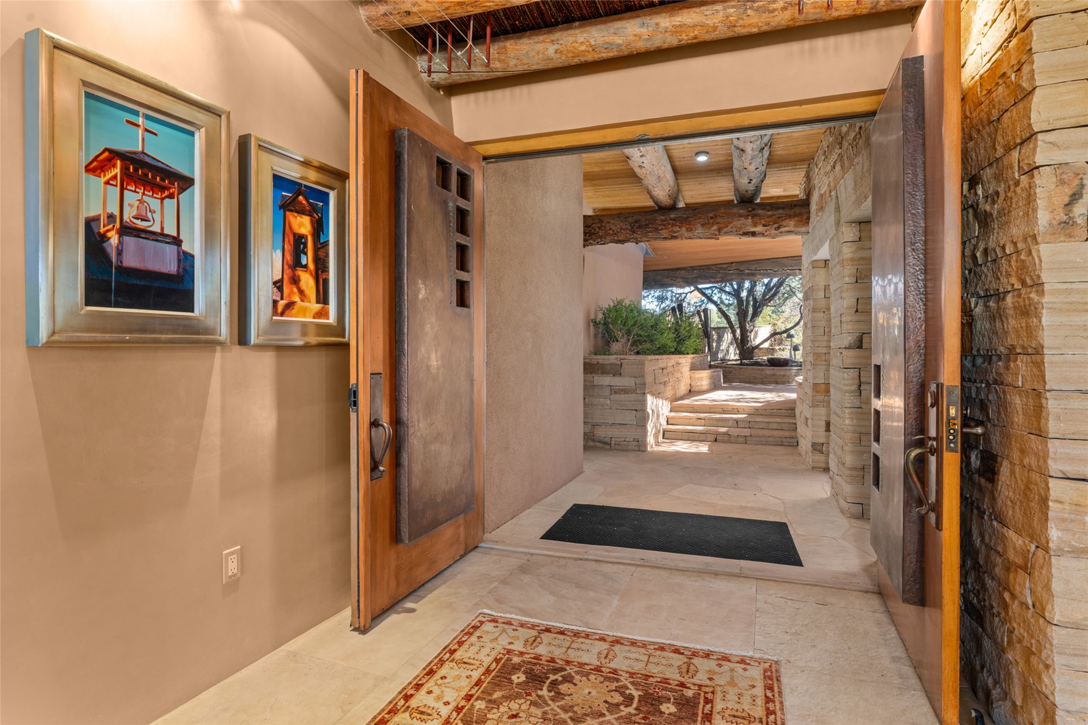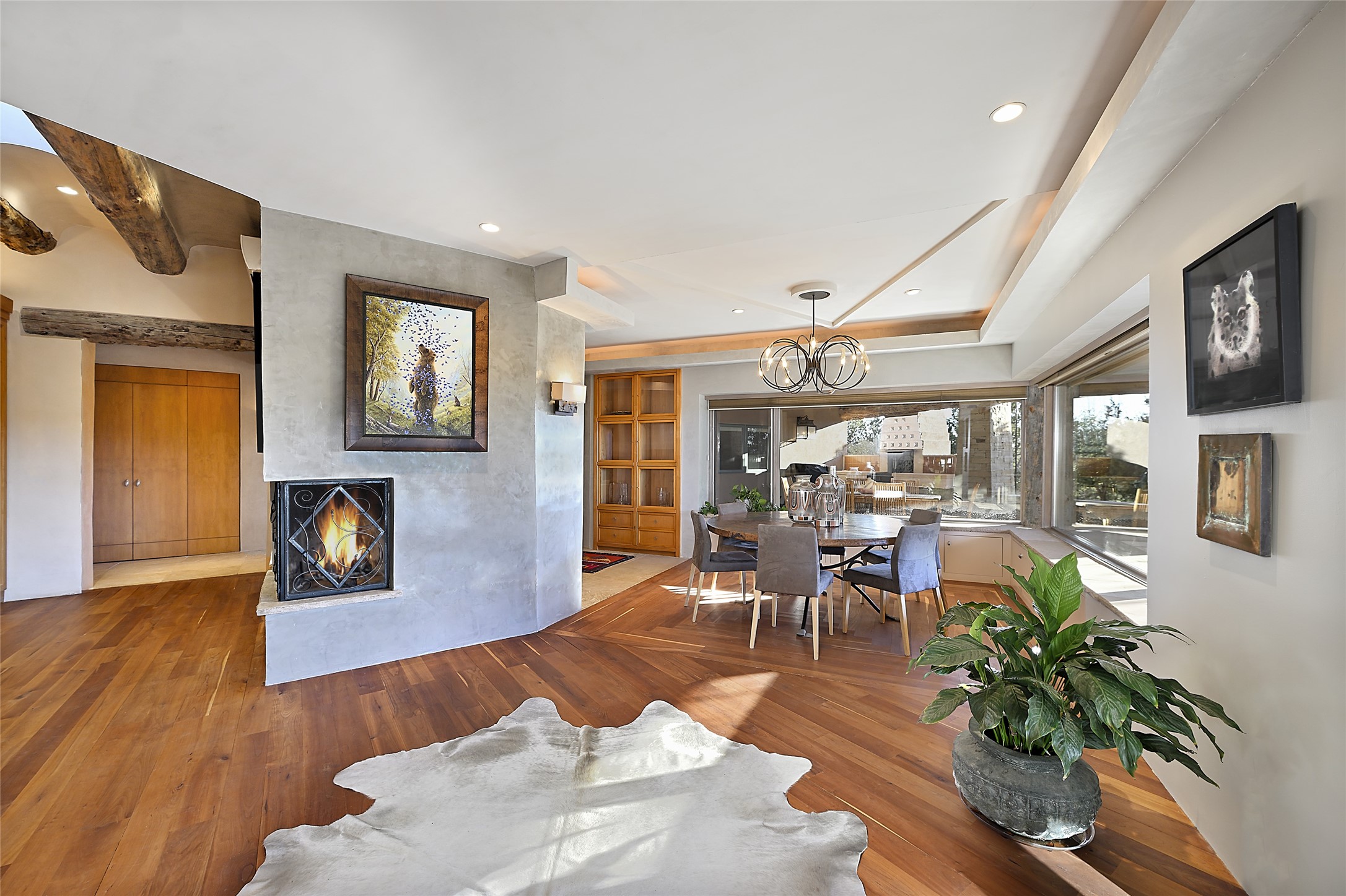 Constructed of solid adobe, this magnificent four-bedroom, 10,354-square-foot estate is an opulent oasis in the renowned community of Las Campanas. Luxurious details and amenities abound: plaster walls, 11 fireplaces, a central vacuum system, remote-controlled window shades, an indoor-outdoor sound system, and hand-adzed wood and upholstered leather doors. Highlights include a living room with a custom-designed fireplace and glass sconces hand-blown by artist Duane Dahl; a kiva-inspired dining room with sturdy reclaimed posts and stacked ceiling vigas; a media room with surround sound; and a kitchen with a butler's pantry, two dishwashers and sinks, a six-burner Dacor range, warming drawers, three ovens, and a walk-in pantry. The oversized owner's suite has two marble baths with custom-designed cantilevered cabinetry and a shared garden. Each of the two guest suites includes a custom closet and a private porch. Artists and professionals will appreciate the office and craft suite, which has a separate entrance. Portales with automatic sunshades, patios, and a rooftop deck are perfect for entertaining and enjoying majestic sunsets. The property also offers a heated garage, two porte cochres, two circular driveways, and extensive parking. The superior amenities of Las Campanas include two Jack Nicklaus Signature golf courses, an equestrian center, indoor and outdoor swimming pools, tennis courts, a fitness center, a spa, and a clubhouse offering casual and fine dining.