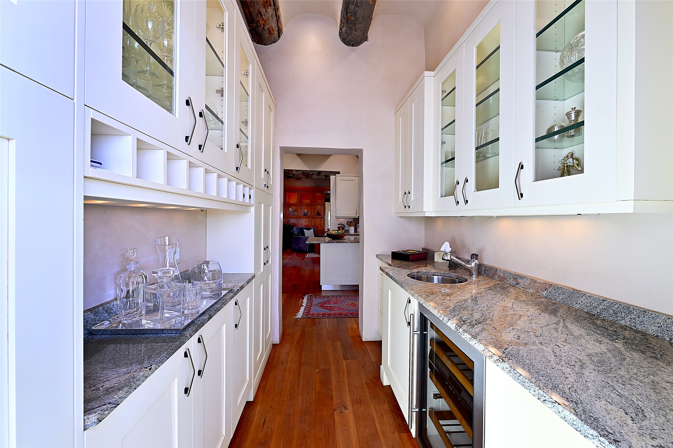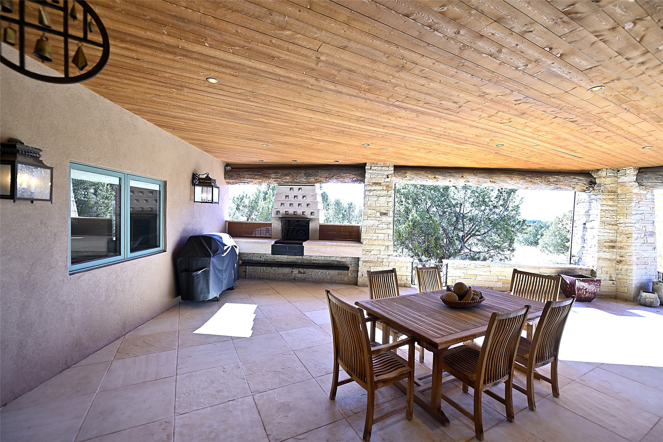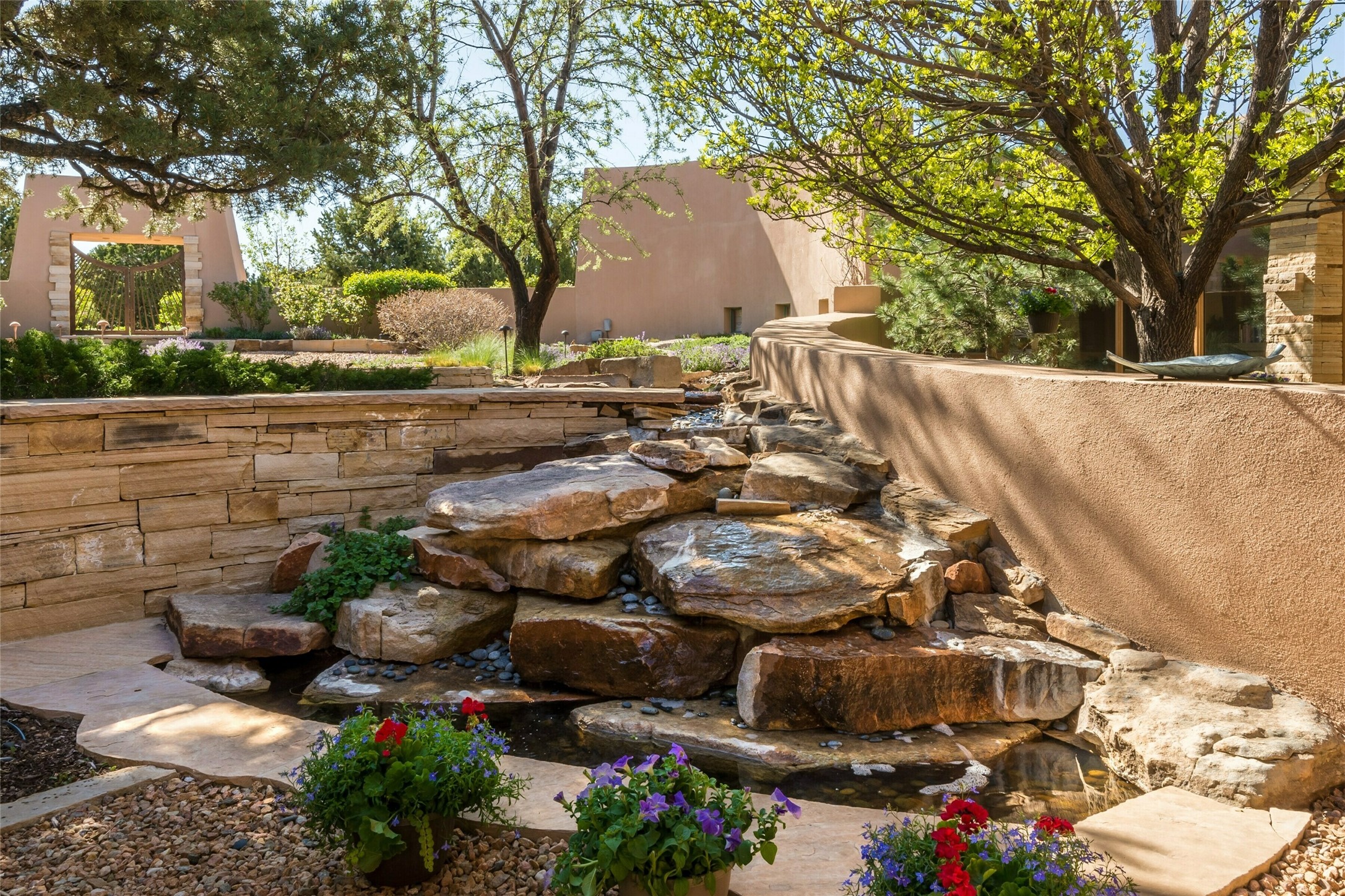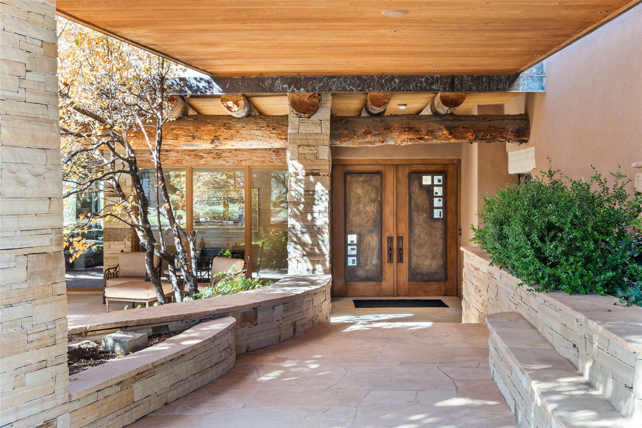 Constructed of solid adobe, this magnificent four-bedroom, 10,354-square-foot estate is an opulent oasis in the renowned community of Las Campanas. Luxurious details and amenities abound: plaster walls, 11 fireplaces, a central vacuum system, remote-controlled window shades, an indoor-outdoor sound system, and hand-adzed wood and upholstered leather doors. Highlights include a living room with a custom-designed fireplace and glass sconces hand-blown by artist Duane Dahl; a kiva-inspired dining room with sturdy reclaimed posts and stacked ceiling vigas; a media room with surround sound; and a kitchen with a butler's pantry, two dishwashers and sinks, a six-burner Dacor range, warming drawers, three ovens, and a walk-in pantry. The oversized owner's suite has two marble baths with custom-designed cantilevered cabinetry and a shared garden. Each of the two guest suites includes a custom closet and a private porch. Artists and professionals will appreciate the office and craft suite, which has a separate entrance. Portales with automatic sunshades, patios, and a rooftop deck are perfect for entertaining and enjoying majestic sunsets. The property also offers a heated garage, two porte cochres, two circular driveways, and extensive parking. The superior amenities of Las Campanas include two Jack Nicklaus Signature golf courses, an equestrian center, indoor and outdoor swimming pools, tennis courts, a fitness center, a spa, and a clubhouse offering casual and fine dining.