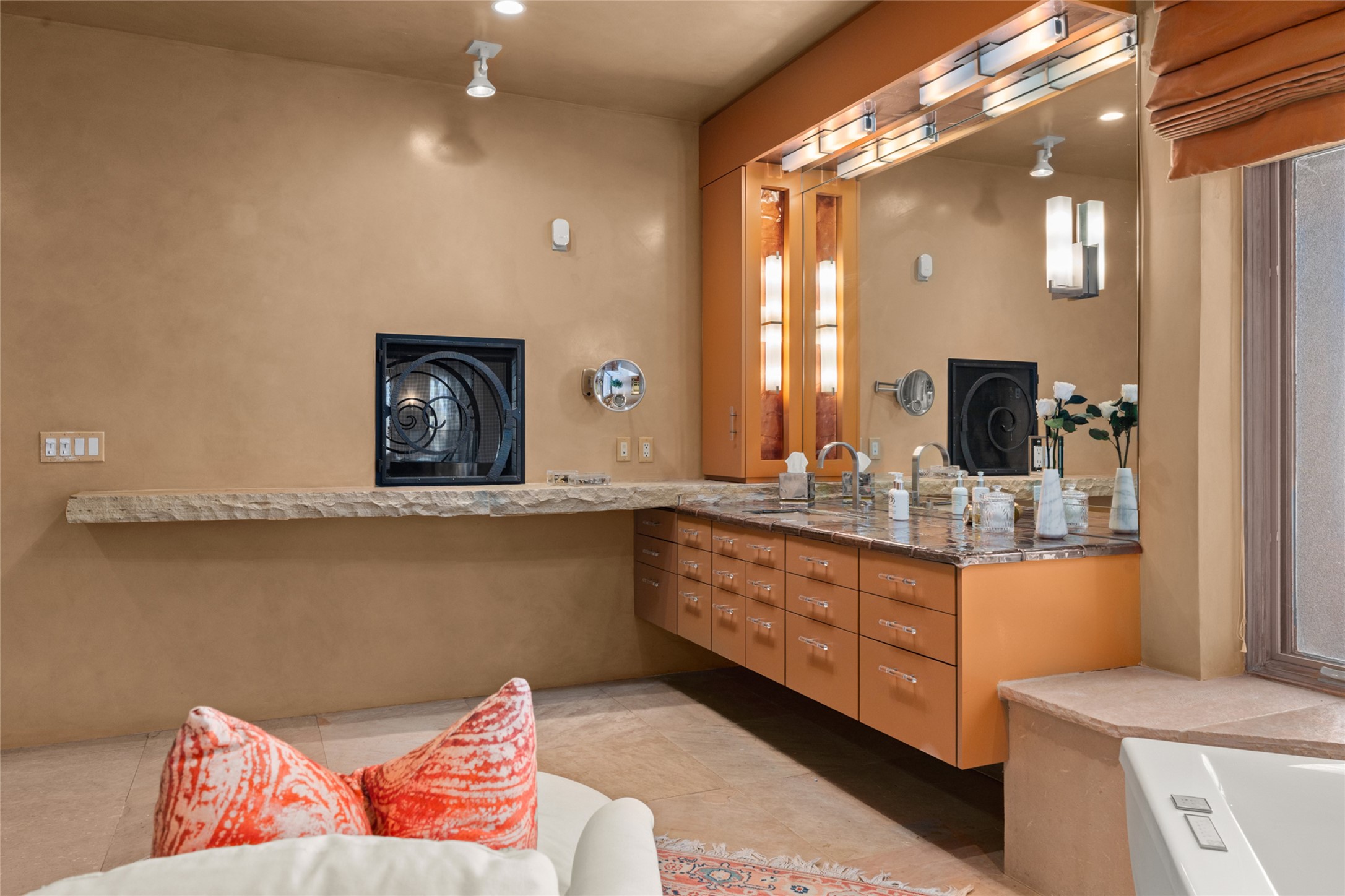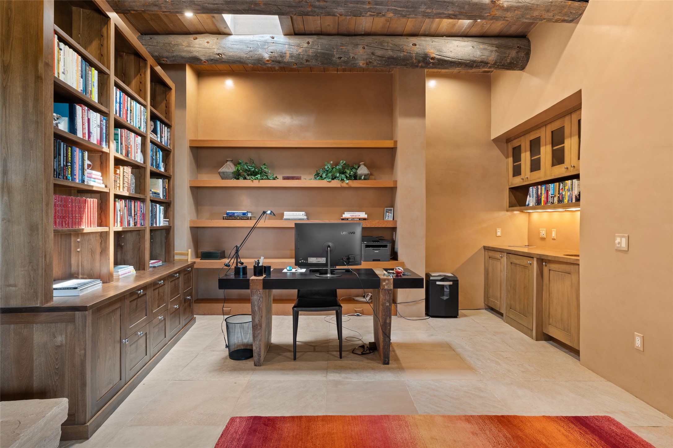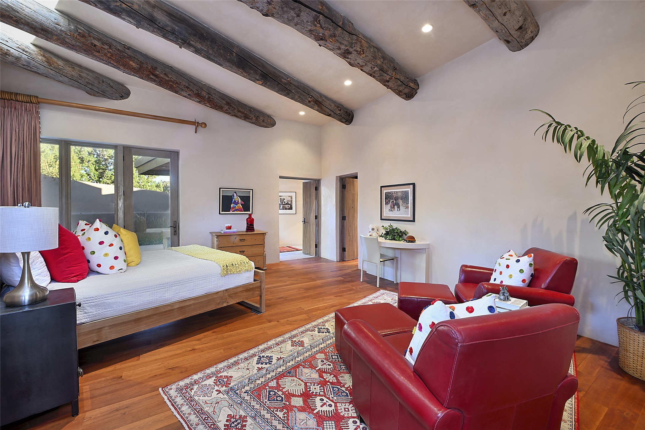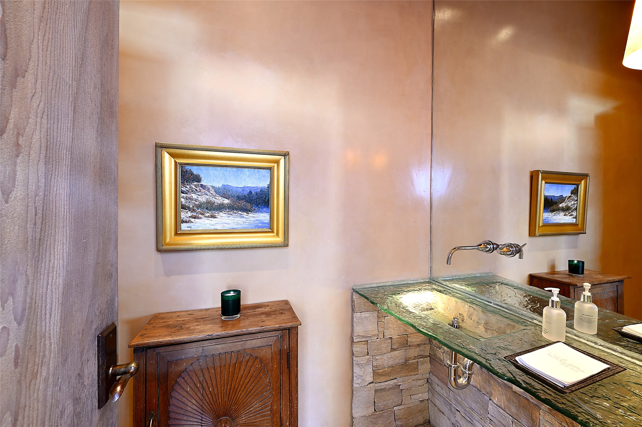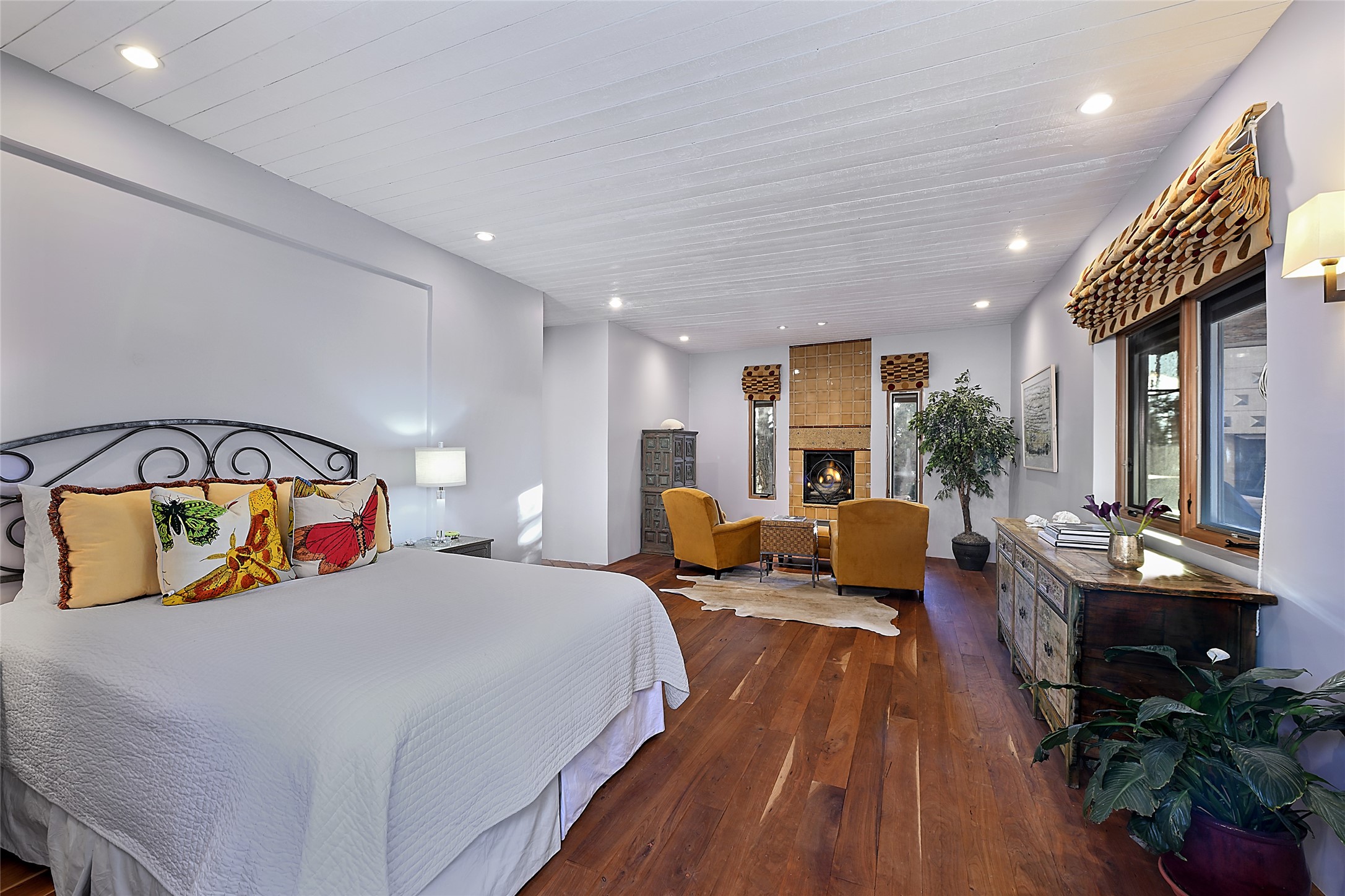 Constructed of solid adobe, this magnificent four-bedroom, 10,354-square-foot estate is an opulent oasis in the renowned community of Las Campanas. Luxurious details and amenities abound: plaster walls, 11 fireplaces, a central vacuum system, remote-controlled window shades, an indoor-outdoor sound system, and hand-adzed wood and upholstered leather doors. Highlights include a living room with a custom-designed fireplace and glass sconces hand-blown by artist Duane Dahl; a kiva-inspired dining room with sturdy reclaimed posts and stacked ceiling vigas; a media room with surround sound; and a kitchen with a butler's pantry, two dishwashers and sinks, a six-burner Dacor range, warming drawers, three ovens, and a walk-in pantry. The oversized owner's suite has two marble baths with custom-designed cantilevered cabinetry and a shared garden. Each of the two guest suites includes a custom closet and a private porch. Artists and professionals will appreciate the office and craft suite, which has a separate entrance. Portales with automatic sunshades, patios, and a rooftop deck are perfect for entertaining and enjoying majestic sunsets. The property also offers a heated garage, two porte cochres, two circular driveways, and extensive parking. The superior amenities of Las Campanas include two Jack Nicklaus Signature golf courses, an equestrian center, indoor and outdoor swimming pools, tennis courts, a fitness center, a spa, and a clubhouse offering casual and fine dining.