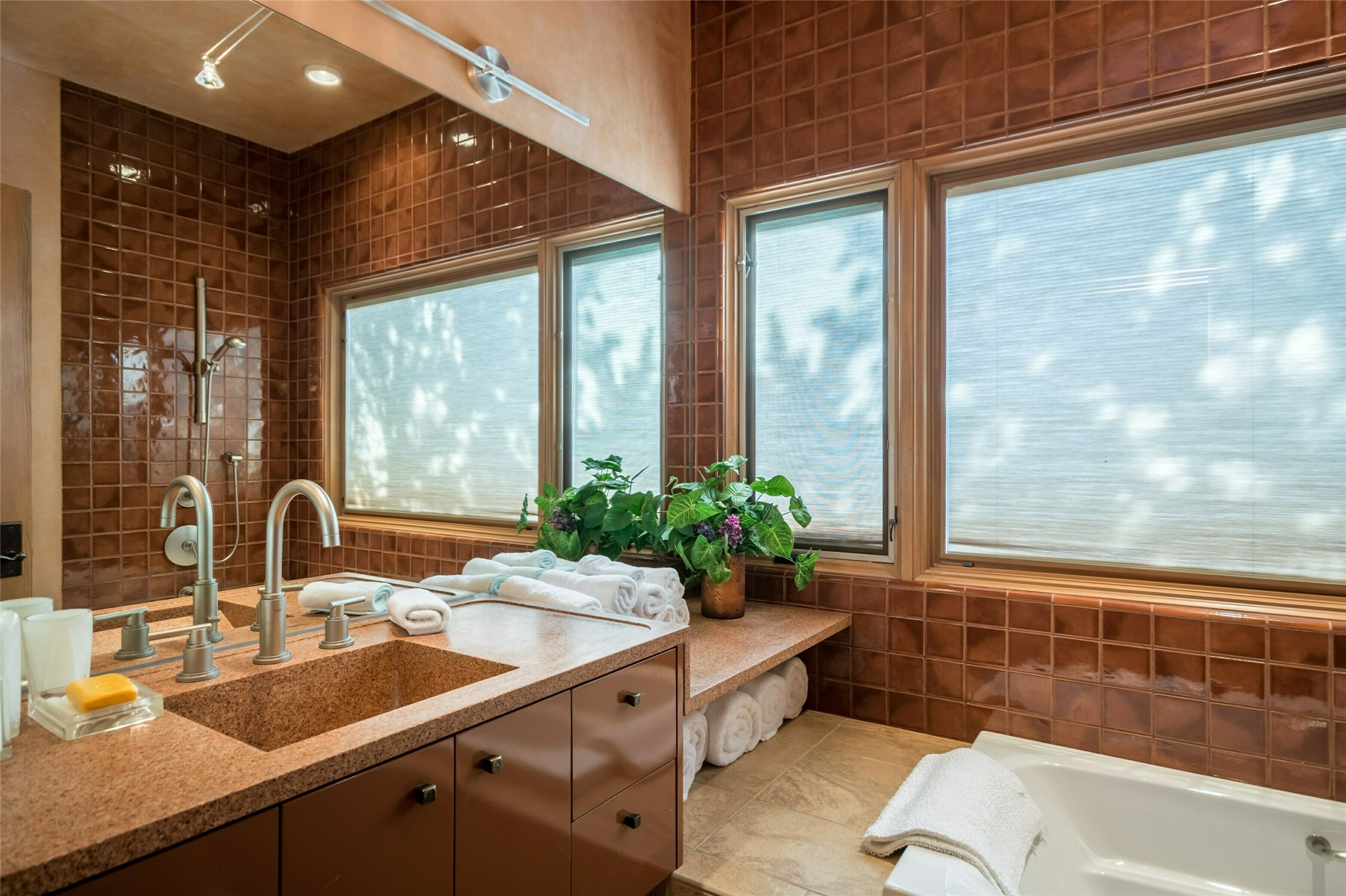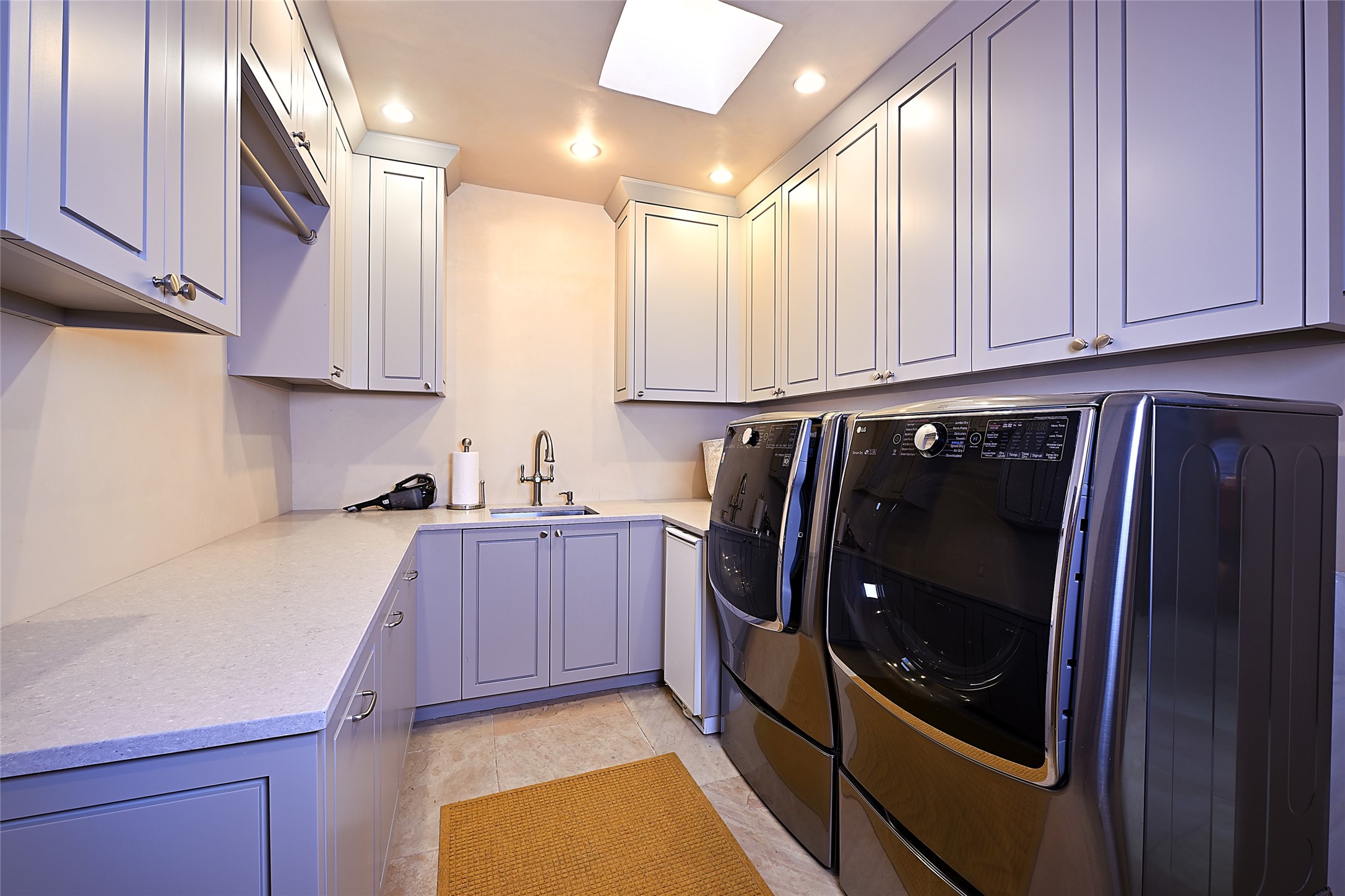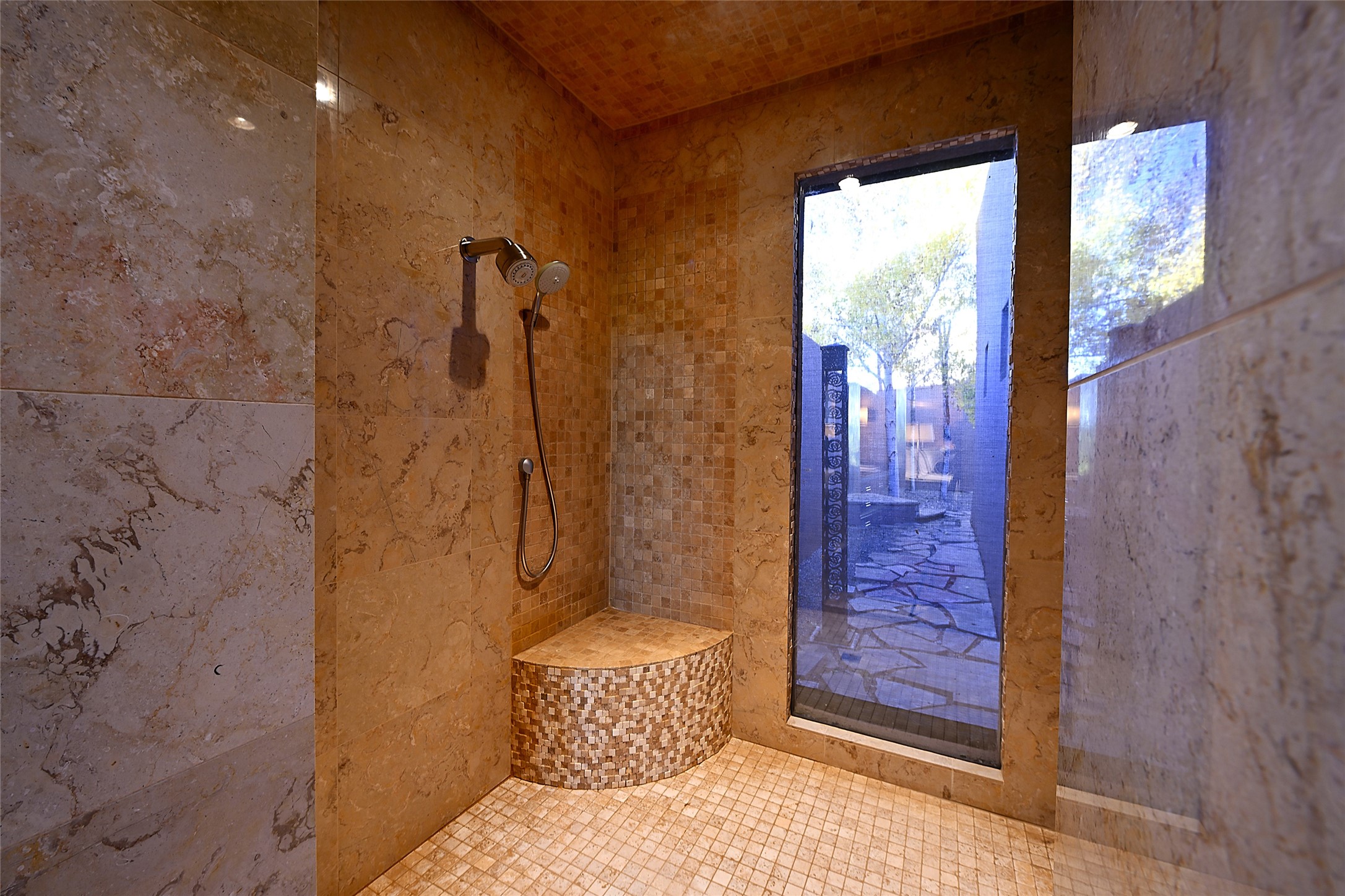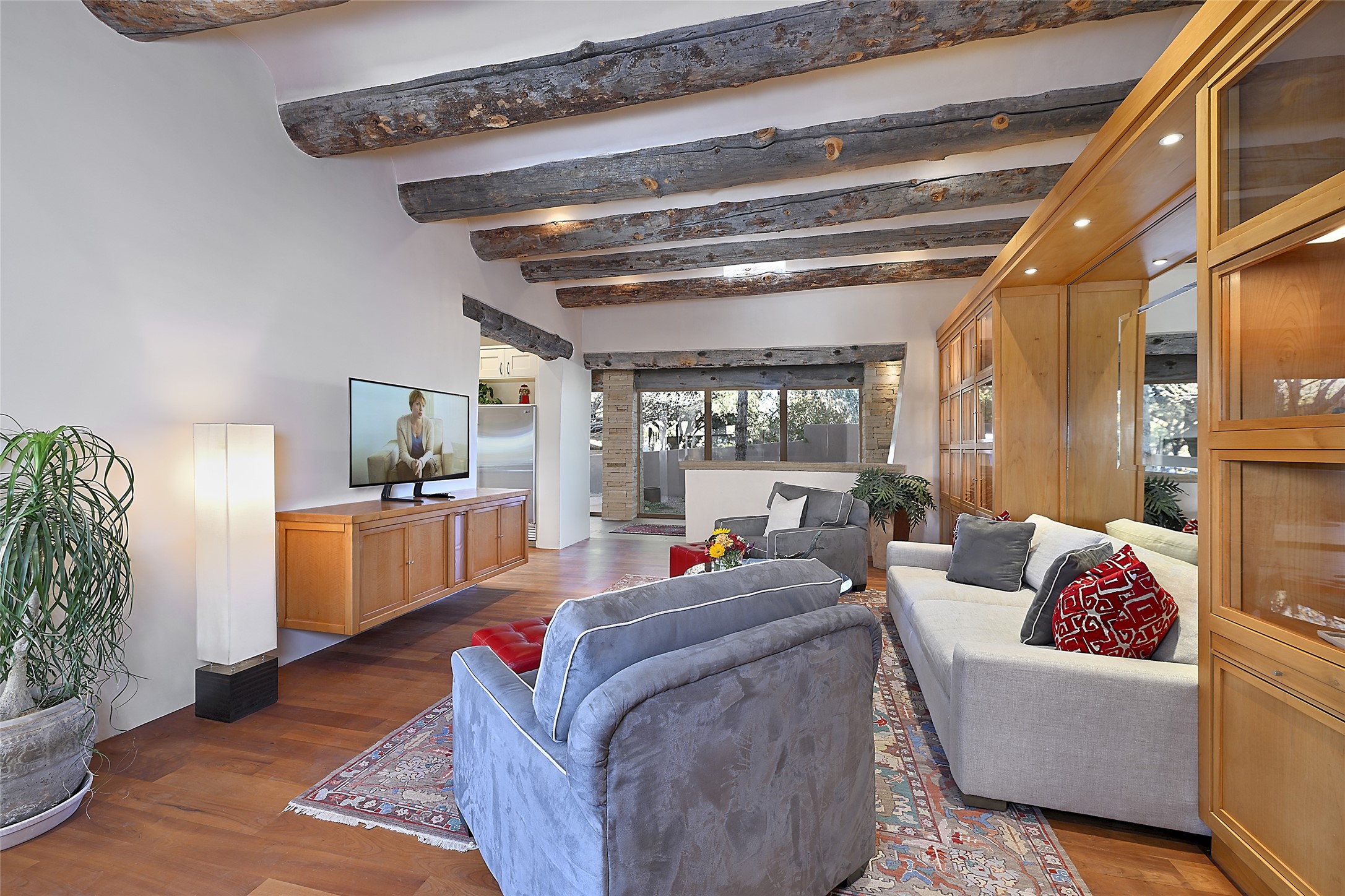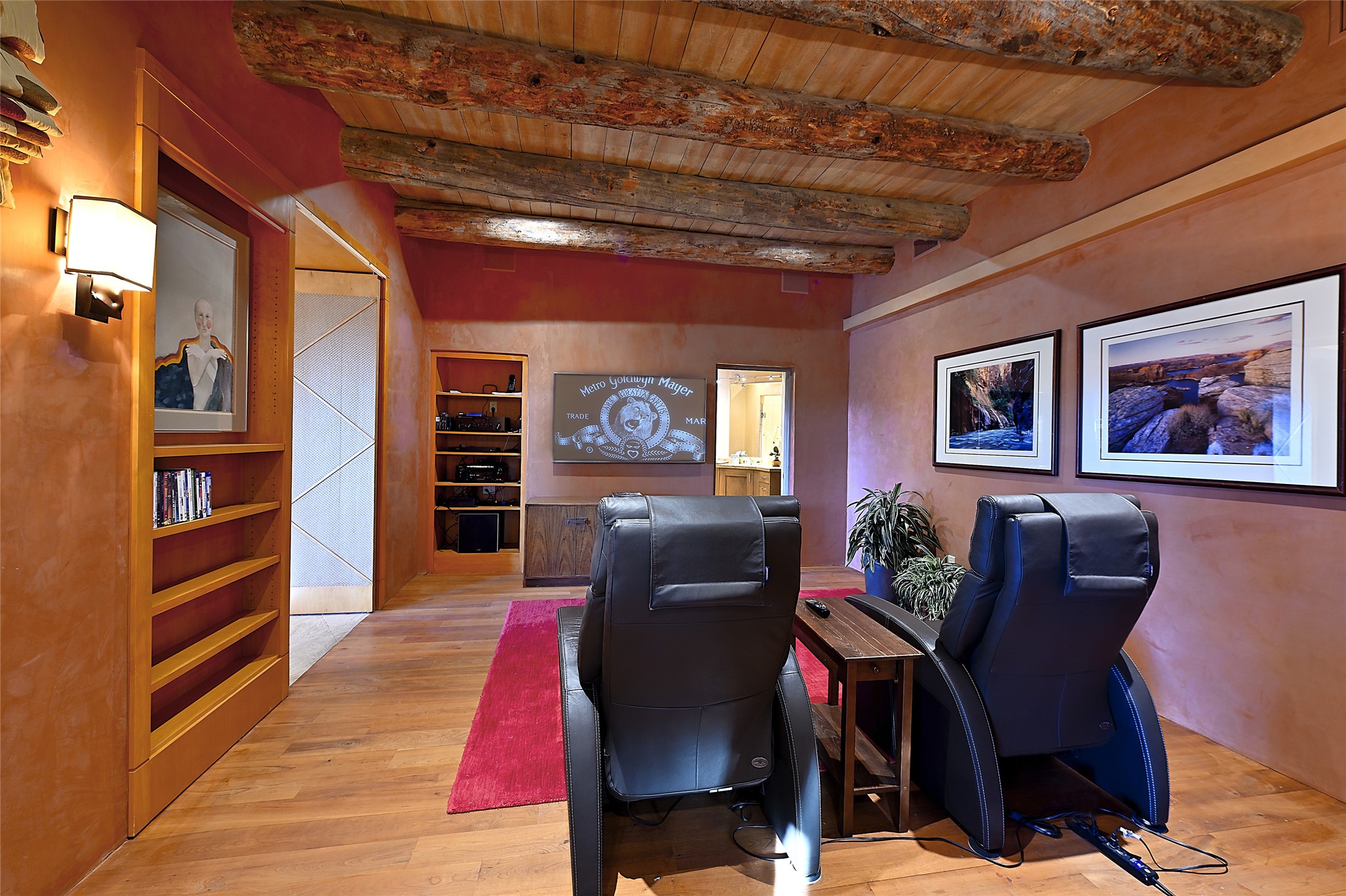 Constructed of solid adobe, this magnificent four-bedroom, 10,354-square-foot estate is an opulent oasis in the renowned community of Las Campanas. Luxurious details and amenities abound: plaster walls, 11 fireplaces, a central vacuum system, remote-controlled window shades, an indoor-outdoor sound system, and hand-adzed wood and upholstered leather doors. Highlights include a living room with a custom-designed fireplace and glass sconces hand-blown by artist Duane Dahl; a kiva-inspired dining room with sturdy reclaimed posts and stacked ceiling vigas; a media room with surround sound; and a kitchen with a butler's pantry, two dishwashers and sinks, a six-burner Dacor range, warming drawers, three ovens, and a walk-in pantry. The oversized owner's suite has two marble baths with custom-designed cantilevered cabinetry and a shared garden. Each of the two guest suites includes a custom closet and a private porch. Artists and professionals will appreciate the office and craft suite, which has a separate entrance. Portales with automatic sunshades, patios, and a rooftop deck are perfect for entertaining and enjoying majestic sunsets. The property also offers a heated garage, two porte cochres, two circular driveways, and extensive parking. The superior amenities of Las Campanas include two Jack Nicklaus Signature golf courses, an equestrian center, indoor and outdoor swimming pools, tennis courts, a fitness center, a spa, and a clubhouse offering casual and fine dining.