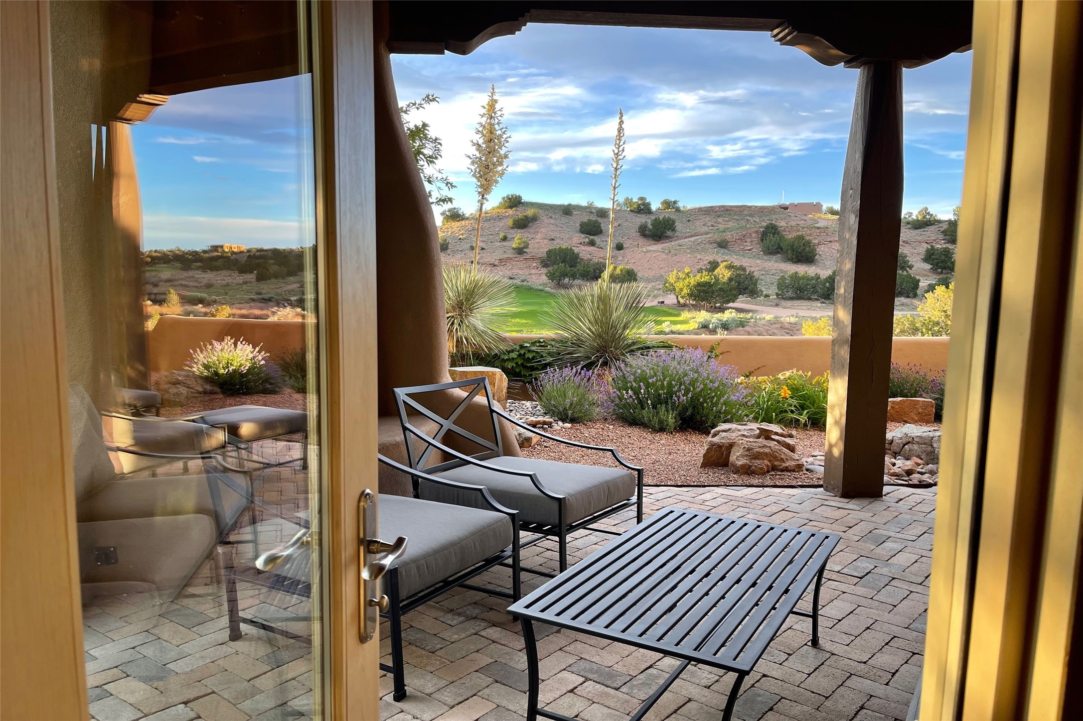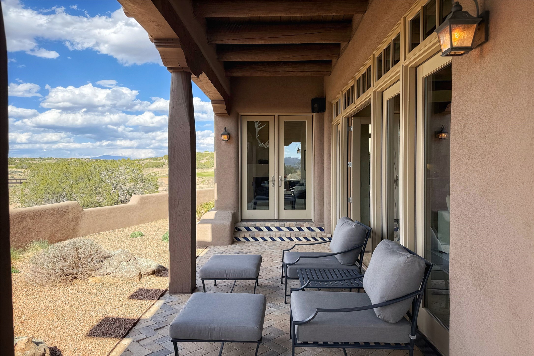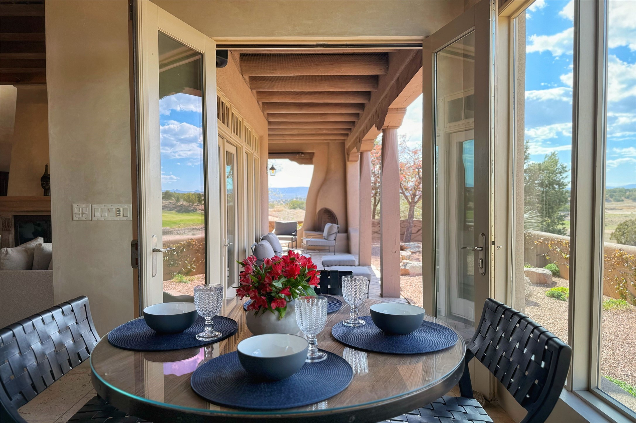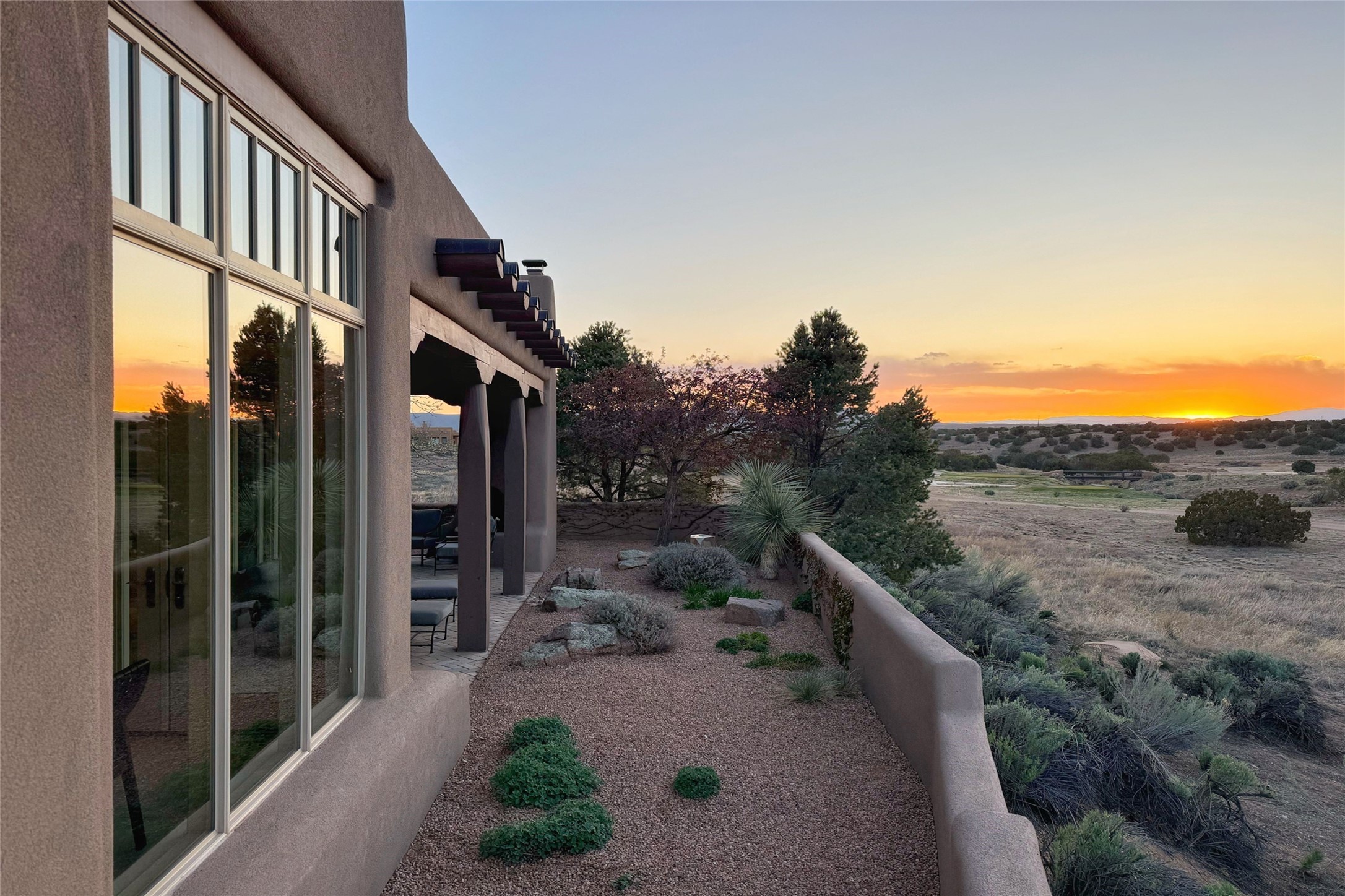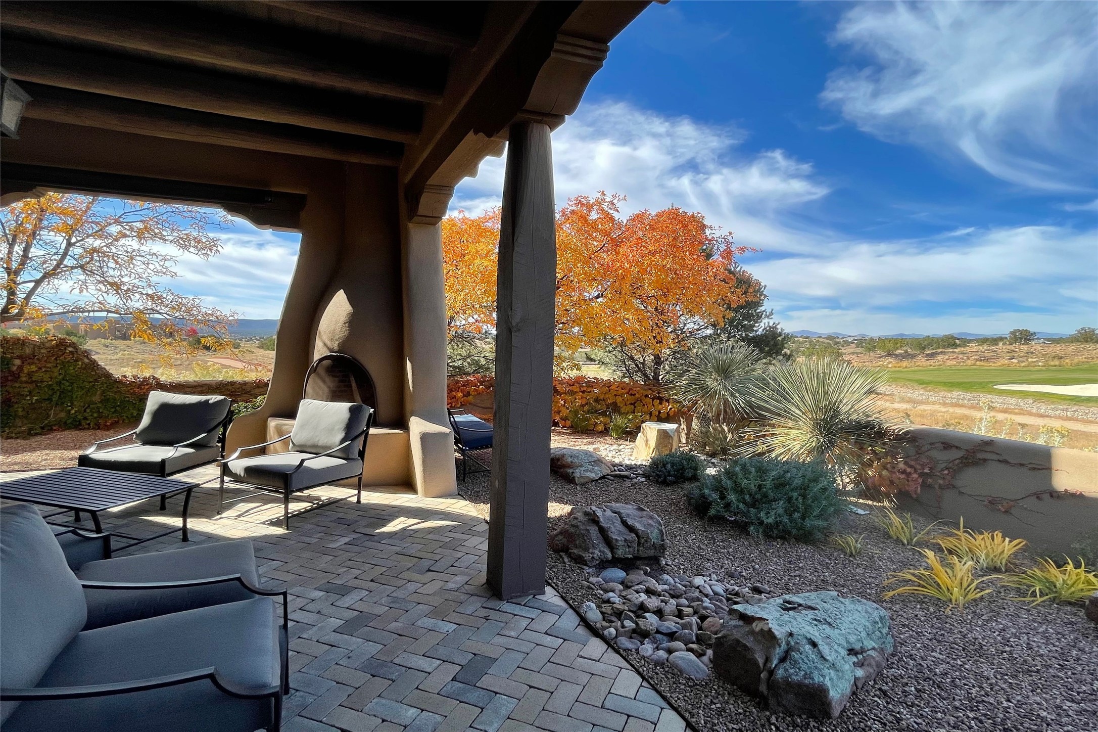 A superb location, this Las Campanas villa home provides majestic panoramic views of the Jack Nicklaus sunset golf course and Jemez / Sangre de Cristo mountain ranges. Surrounded by large open space owned by The Club at Las Campanas, affording excellent privacy. European-inspired architecture and finishes create an opulent, yet relaxed environment. Enjoy golf course views at a comfortable distance. The home sits at the end of a cul-de-sac, providing extra privacy and tranquility and ample guest parking. This home won the Parade of Homes awards for Best Floor Plan and Best Outdoor Space and features a grand arched entryway with floor lights and large Restoration Hardware mirrors to reflect the outdoors. The builder spared no expense on architectural detail and finishes: soaring 14 ft cathedral ceilings, wall wash skylights, travertine floors, handsome carved grand fireplace with custom glass doors, diamond plaster walls, granite countertops, Sub-Zero refrigerator, Wolf oven/stove, and six indoor/ two outdoor gas and wood-burning fireplaces. A sheltered interior courtyard brings the outdoors in. Choose the formal dining room that opens to the lovely courtyard or the casual eat-in nook with views. The primary bedroom suite has direct entrance to the outdoor portal overlooking the golf course and is separated from the guest bedrooms at the opposite wing of the home. Luxurious primary spa bath accesses a private enclosed side portal. Garage has large built-in cabinets for plenty of additional storage. Upgraded to entire smart home capability with high end indoor/outdoor Sonos sound system. Restoration Hardware mirrors and select indoor and all outdoor furniture pieces, as well as custom handcrafted TV cabinet and Murphy bed are included. New stucco, new roof, and tankless water heater with additional high capacity tank. Las Campanas golf membership available for purchase, subject to approval. With outstanding location, views and design, this home is truly captivating.