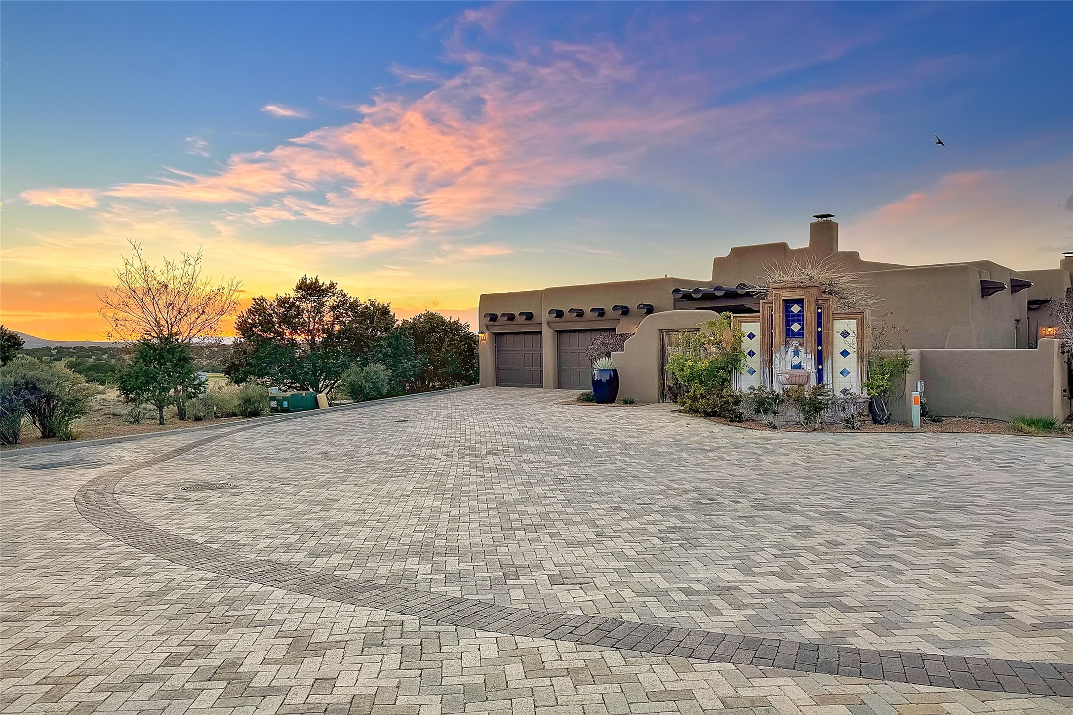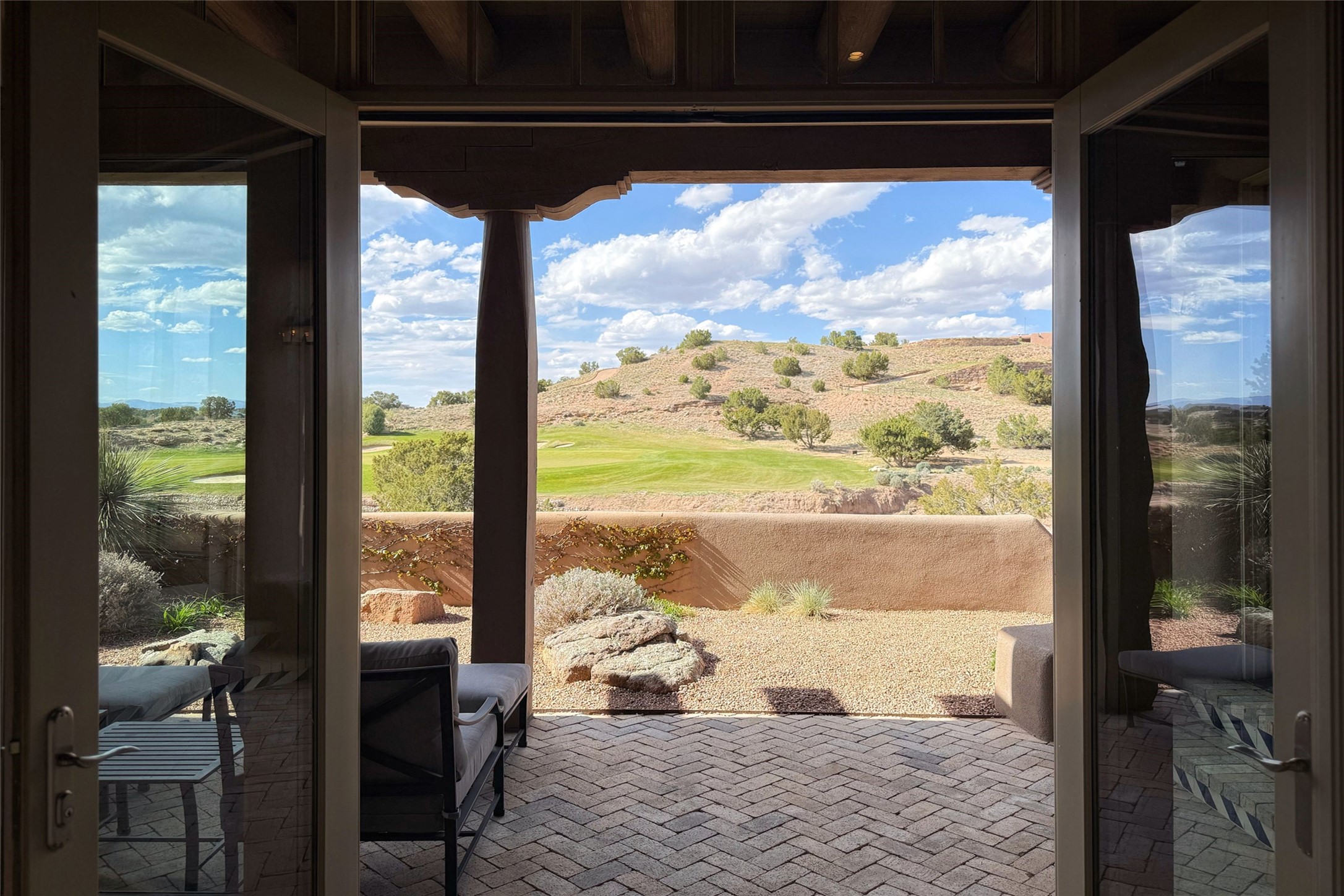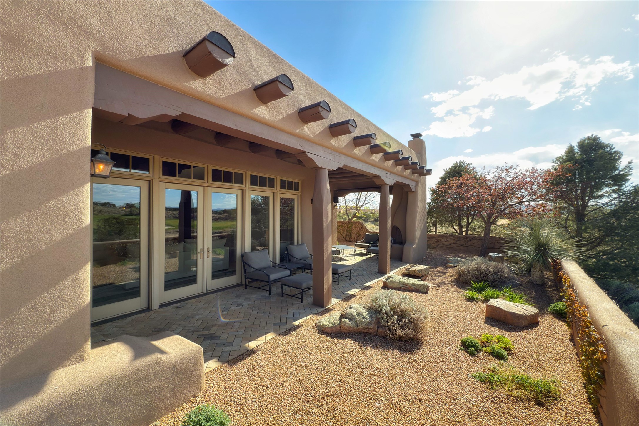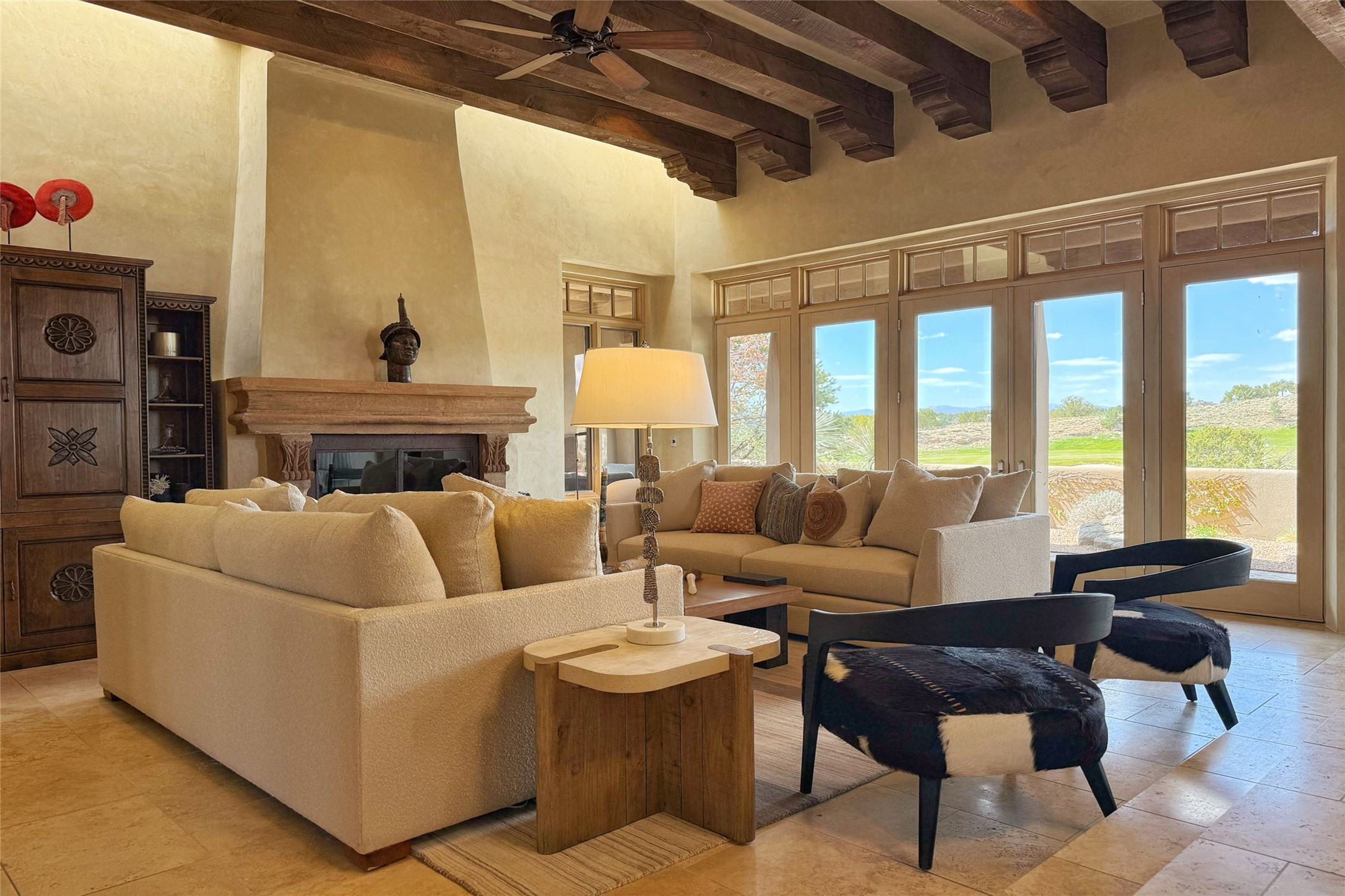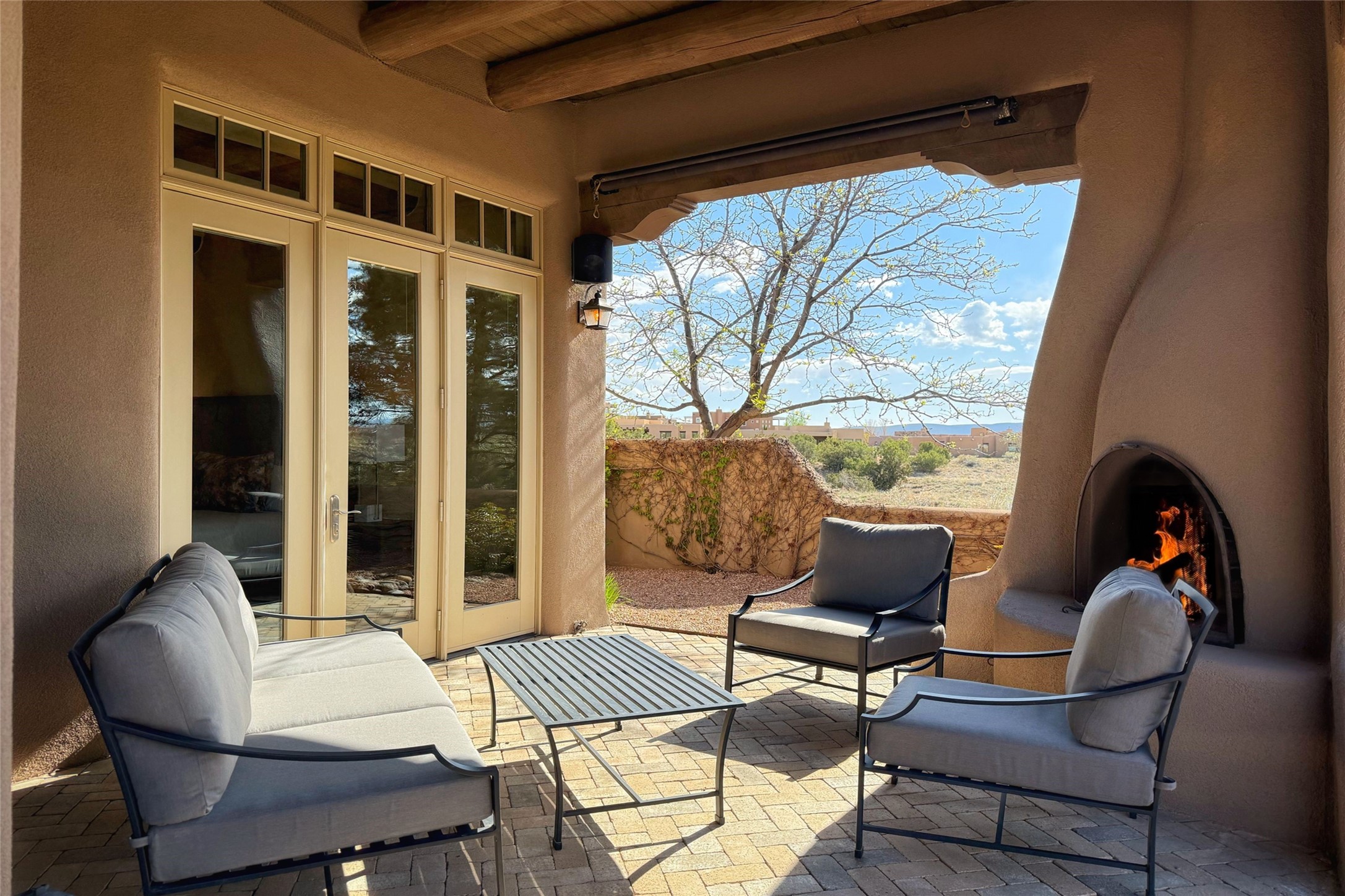 A superb location, this Las Campanas villa home provides majestic panoramic views of the Jack Nicklaus sunset golf course and Jemez / Sangre de Cristo mountain ranges. Surrounded by large open space owned by The Club at Las Campanas, affording excellent privacy. European-inspired architecture and finishes create an opulent, yet relaxed environment. Enjoy golf course views at a comfortable distance. The home sits at the end of a cul-de-sac, providing extra privacy and tranquility and ample guest parking. This home won the Parade of Homes awards for Best Floor Plan and Best Outdoor Space and features a grand arched entryway with floor lights and large Restoration Hardware mirrors to reflect the outdoors. The builder spared no expense on architectural detail and finishes: soaring 14 ft cathedral ceilings, wall wash skylights, travertine floors, handsome carved grand fireplace with custom glass doors, diamond plaster walls, granite countertops, Sub-Zero refrigerator, Wolf oven/stove, and six indoor/ two outdoor gas and wood-burning fireplaces. A sheltered interior courtyard brings the outdoors in. Choose the formal dining room that opens to the lovely courtyard or the casual eat-in nook with views. The primary bedroom suite has direct entrance to the outdoor portal overlooking the golf course and is separated from the guest bedrooms at the opposite wing of the home. Luxurious primary spa bath accesses a private enclosed side portal. Garage has large built-in cabinets for plenty of additional storage. Upgraded to entire smart home capability with high end indoor/outdoor Sonos sound system. Restoration Hardware mirrors and select indoor and all outdoor furniture pieces, as well as custom handcrafted TV cabinet and Murphy bed are included. New stucco, new roof, and tankless water heater with additional high capacity tank. Las Campanas golf membership available for purchase, subject to approval. With outstanding location, views and design, this home is truly captivating.