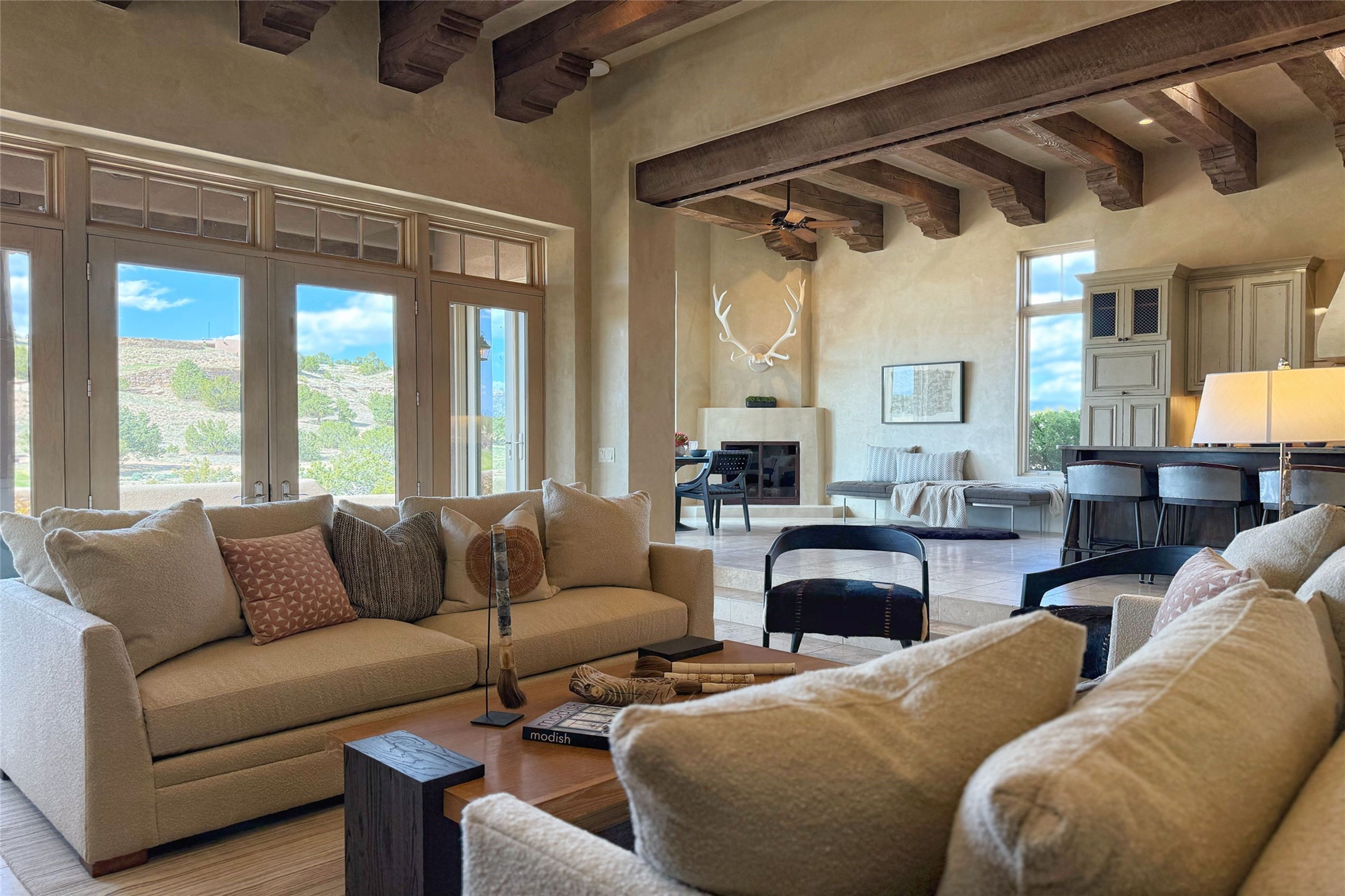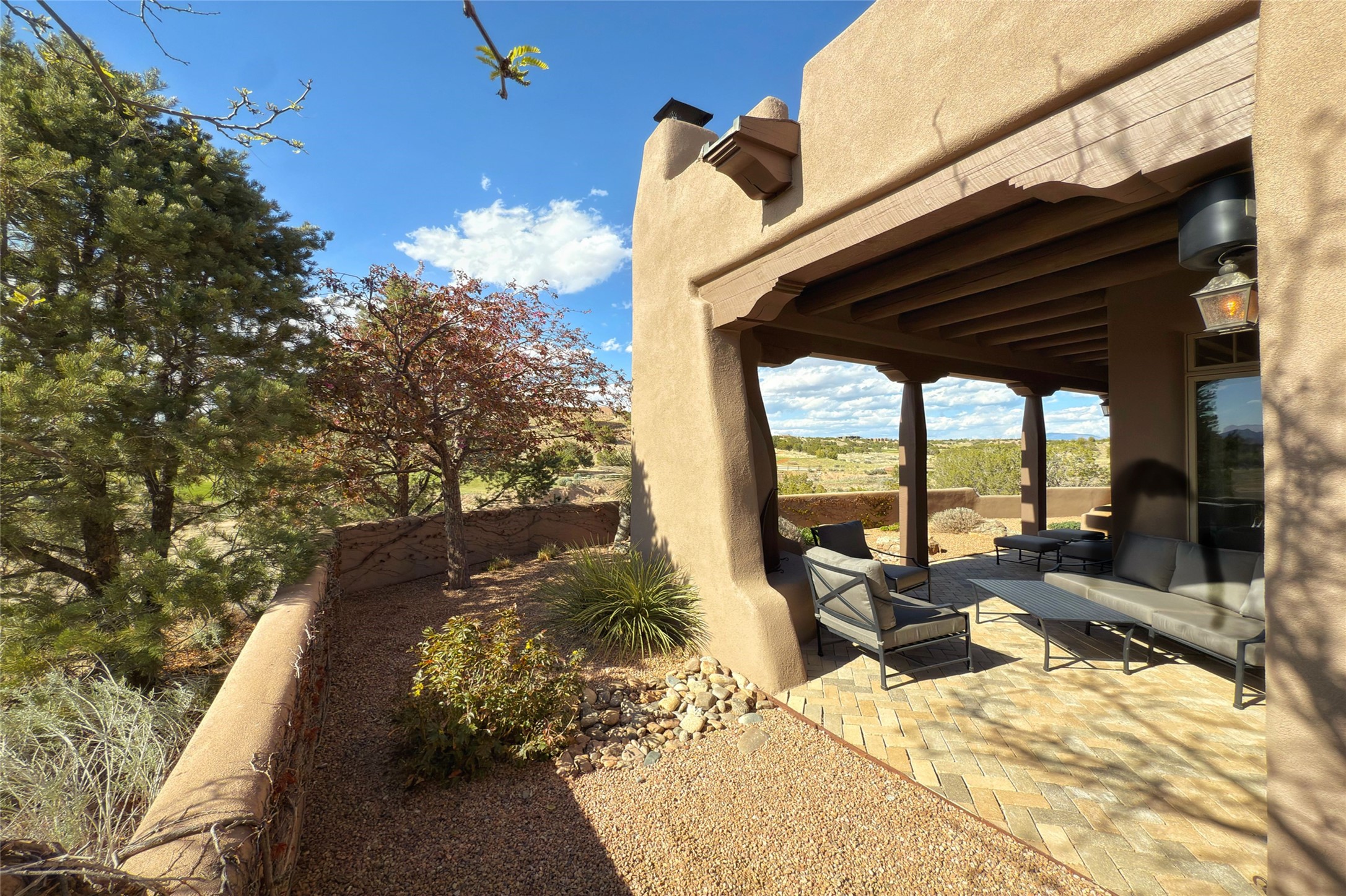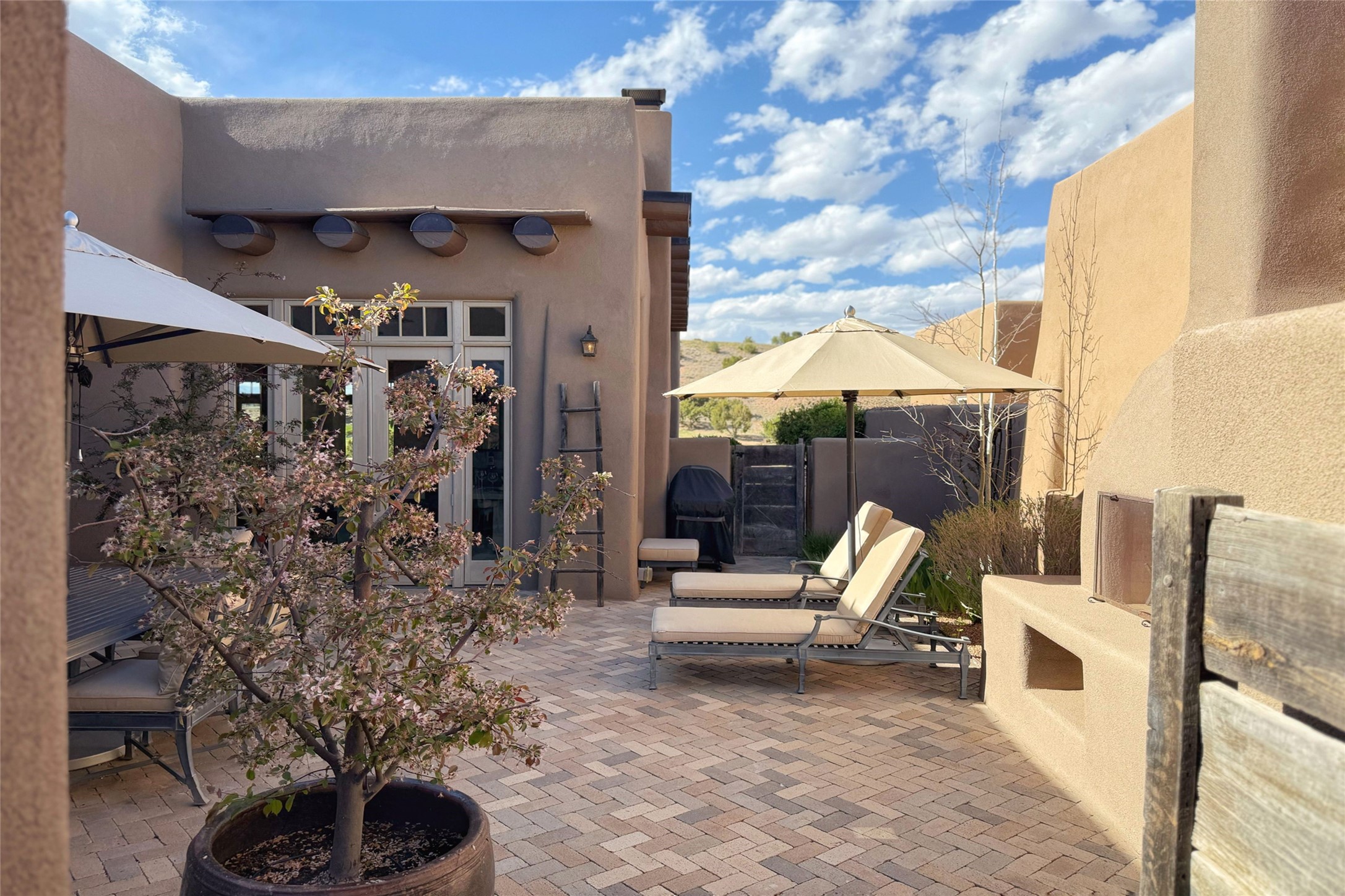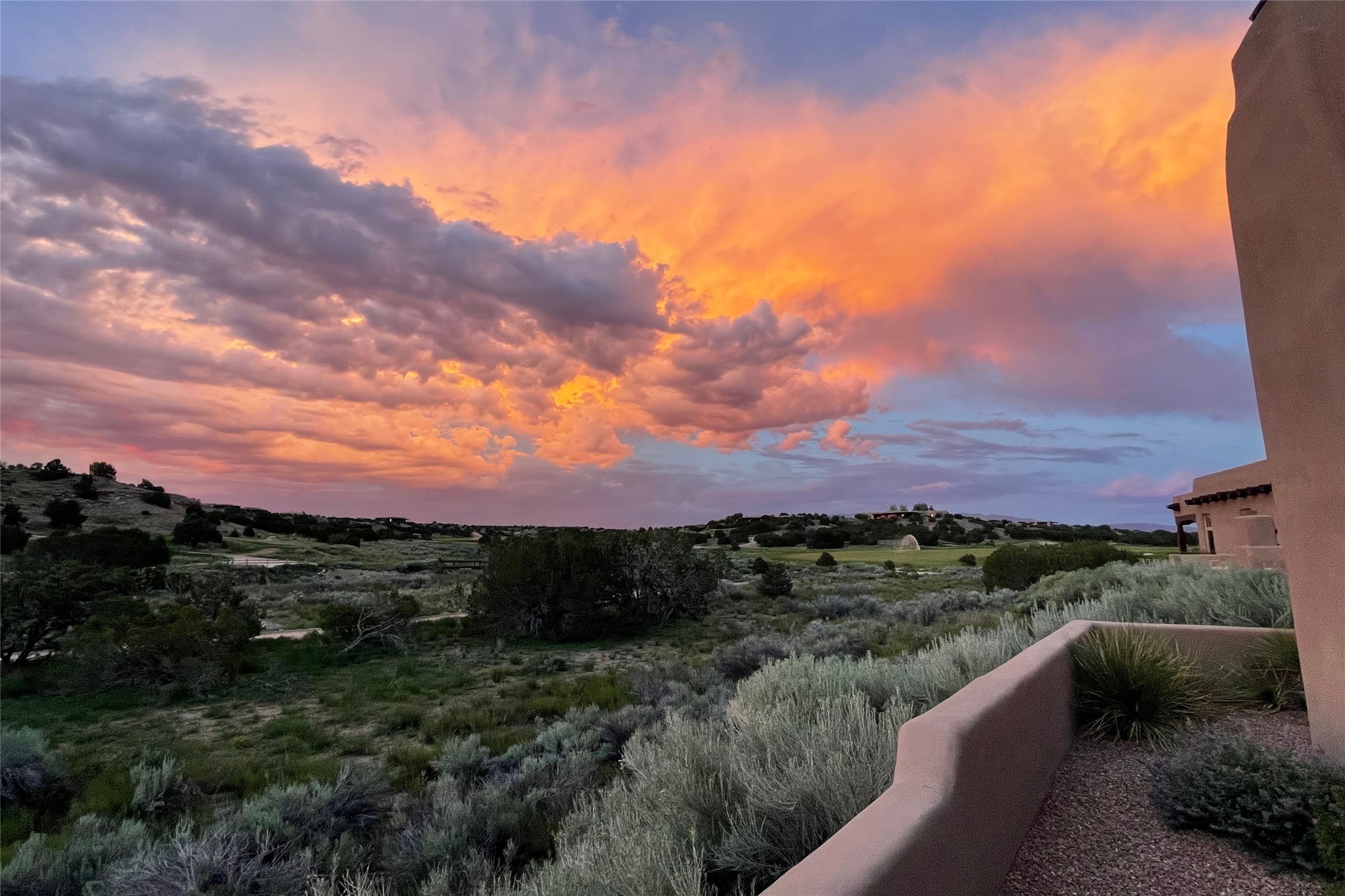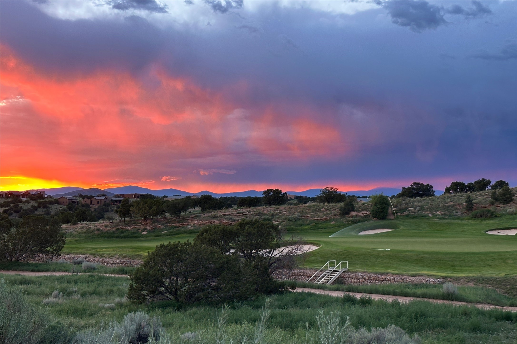 A superb location, this Las Campanas villa home provides majestic panoramic views of the Jack Nicklaus sunset golf course and Jemez / Sangre de Cristo mountain ranges. Surrounded by large open space owned by The Club at Las Campanas, affording excellent privacy. European-inspired architecture and finishes create an opulent, yet relaxed environment. Enjoy golf course views at a comfortable distance. The home sits at the end of a cul-de-sac, providing extra privacy and tranquility and ample guest parking. This home won the Parade of Homes awards for Best Floor Plan and Best Outdoor Space and features a grand arched entryway with floor lights and large Restoration Hardware mirrors to reflect the outdoors. The builder spared no expense on architectural detail and finishes: soaring 14 ft cathedral ceilings, wall wash skylights, travertine floors, handsome carved grand fireplace with custom glass doors, diamond plaster walls, granite countertops, Sub-Zero refrigerator, Wolf oven/stove, and six indoor/ two outdoor gas and wood-burning fireplaces. A sheltered interior courtyard brings the outdoors in. Choose the formal dining room that opens to the lovely courtyard or the casual eat-in nook with views. The primary bedroom suite has direct entrance to the outdoor portal overlooking the golf course and is separated from the guest bedrooms at the opposite wing of the home. Luxurious primary spa bath accesses a private enclosed side portal. Garage has large built-in cabinets for plenty of additional storage. Upgraded to entire smart home capability with high end indoor/outdoor Sonos sound system. Restoration Hardware mirrors and select indoor and all outdoor furniture pieces, as well as custom handcrafted TV cabinet and Murphy bed are included. New stucco, new roof, and tankless water heater with additional high capacity tank. Las Campanas golf membership available for purchase, subject to approval. With outstanding location, views and design, this home is truly captivating.