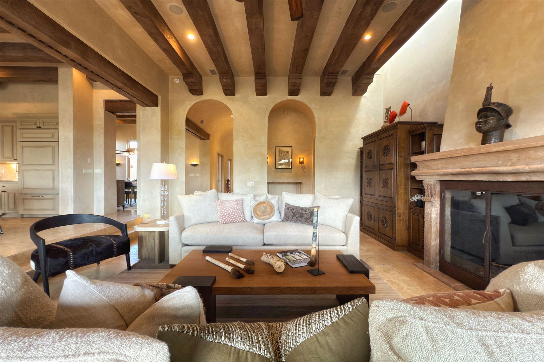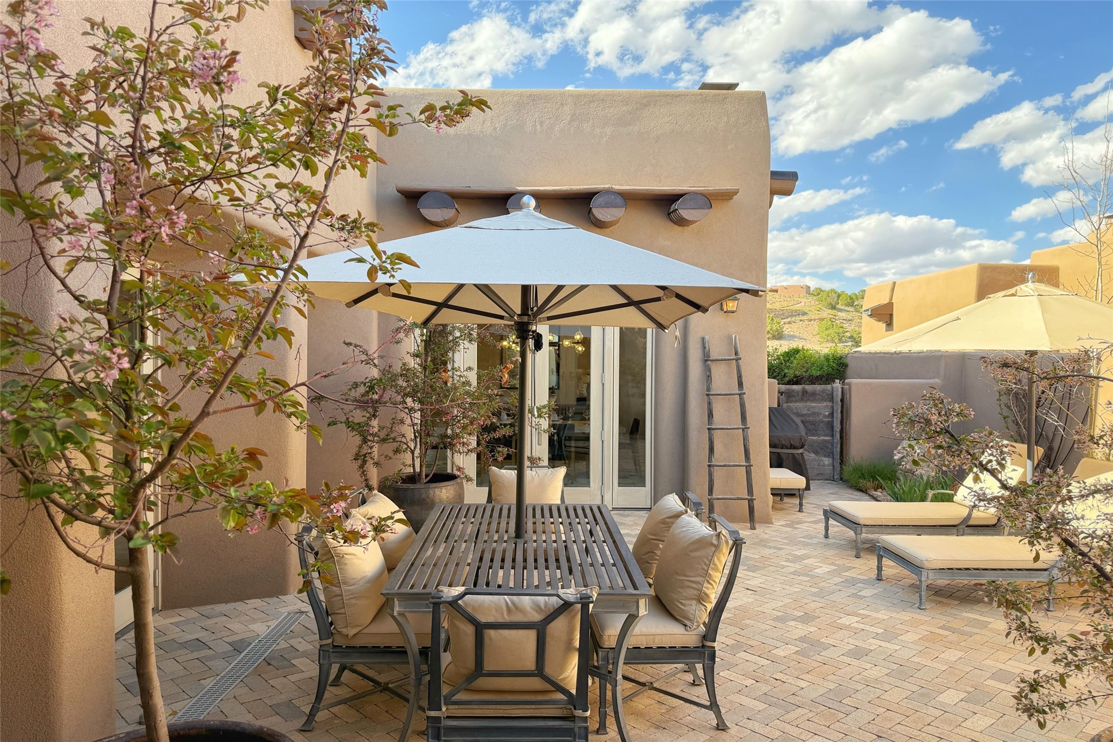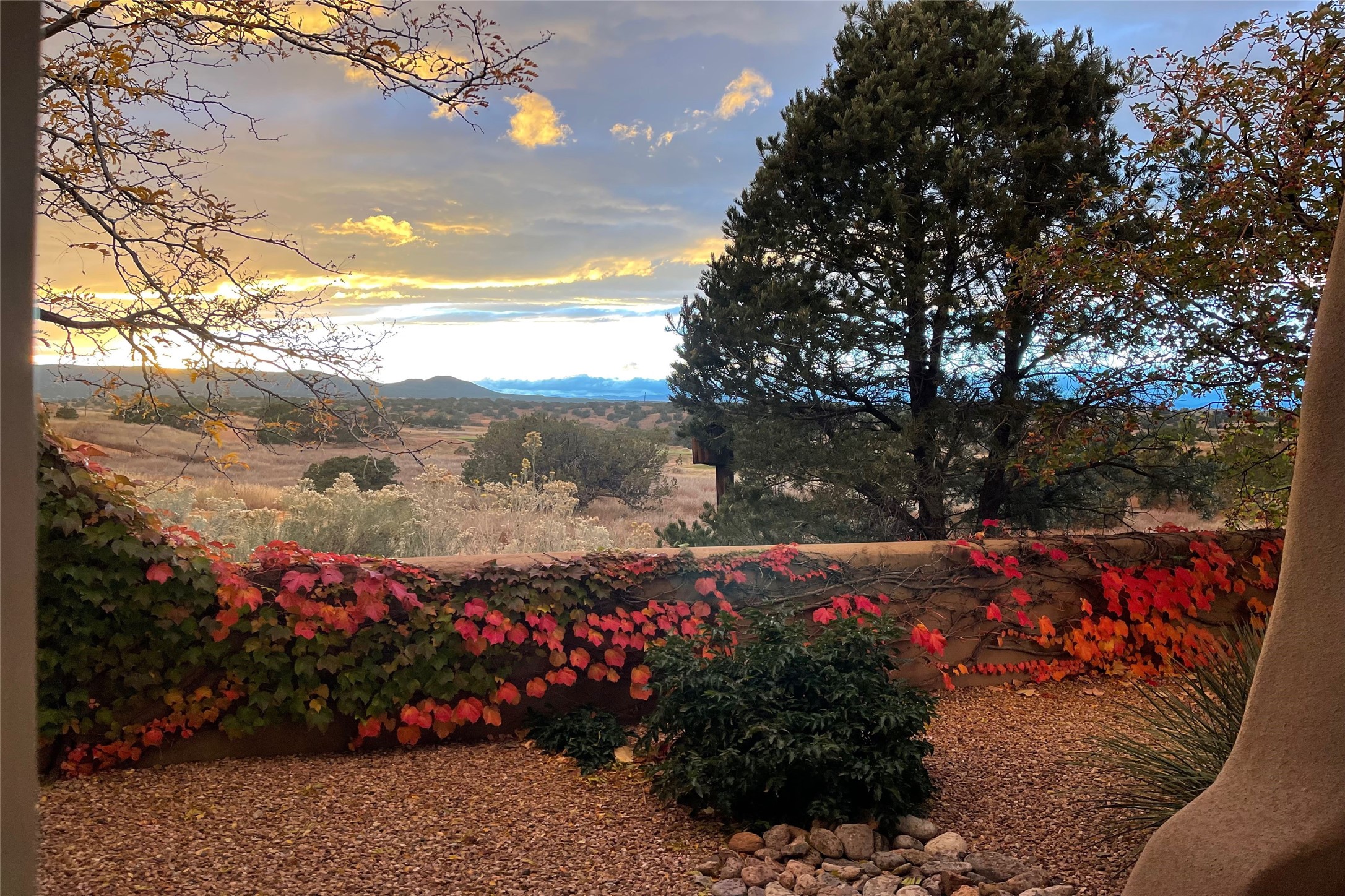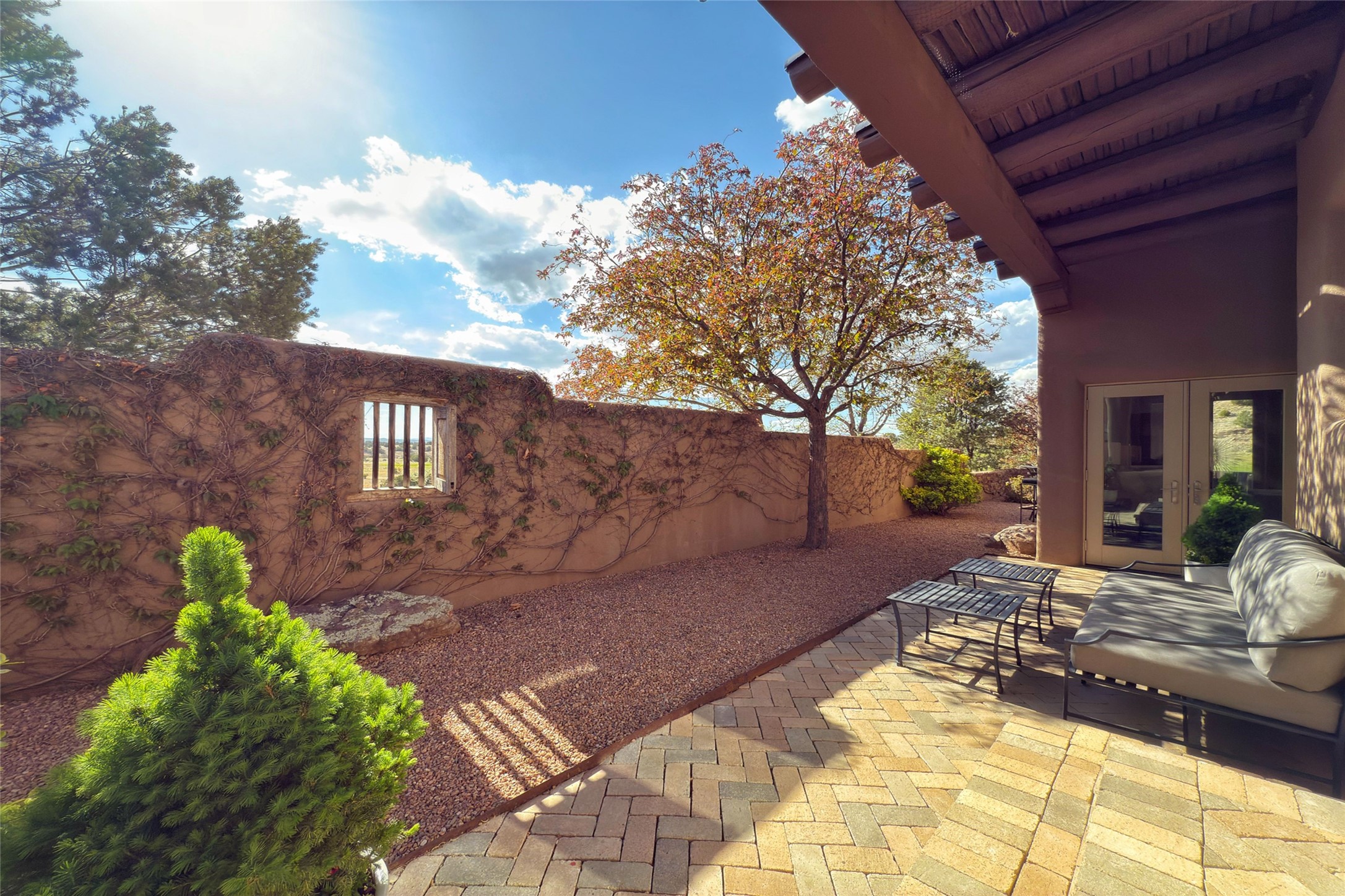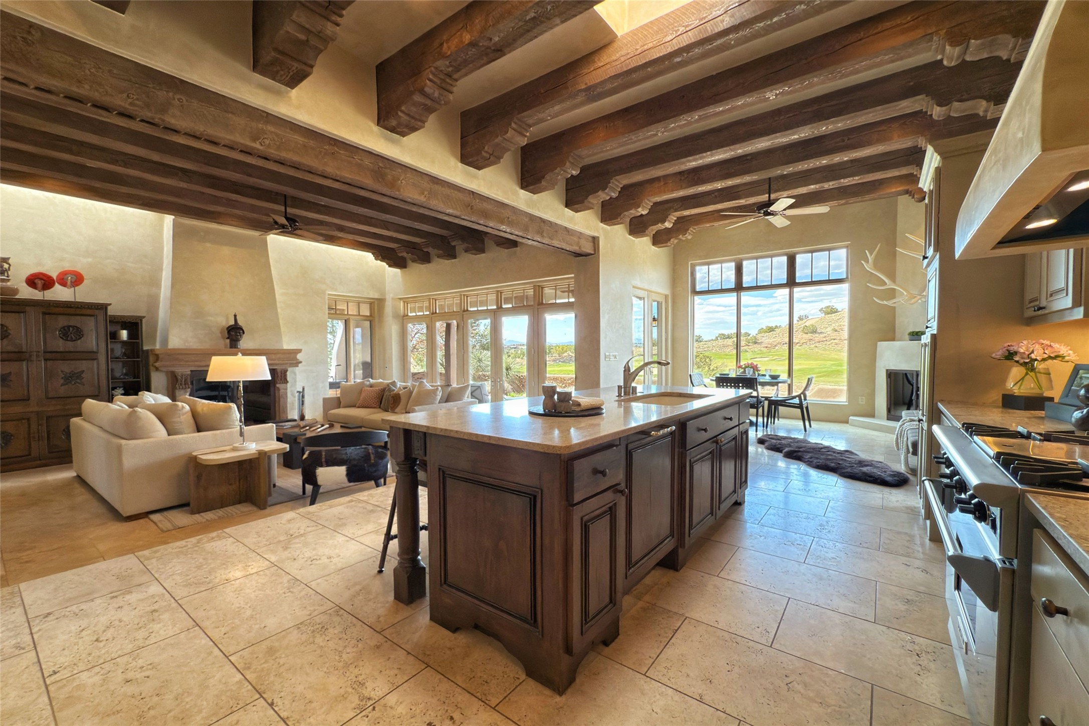 A superb location, this Las Campanas villa home provides majestic panoramic views of the Jack Nicklaus sunset golf course and Jemez / Sangre de Cristo mountain ranges. Surrounded by large open space owned by The Club at Las Campanas, affording excellent privacy. European-inspired architecture and finishes create an opulent, yet relaxed environment. Enjoy golf course views at a comfortable distance. The home sits at the end of a cul-de-sac, providing extra privacy and tranquility and ample guest parking. This home won the Parade of Homes awards for Best Floor Plan and Best Outdoor Space and features a grand arched entryway with floor lights and large Restoration Hardware mirrors to reflect the outdoors. The builder spared no expense on architectural detail and finishes: soaring 14 ft cathedral ceilings, wall wash skylights, travertine floors, handsome carved grand fireplace with custom glass doors, diamond plaster walls, granite countertops, Sub-Zero refrigerator, Wolf oven/stove, and six indoor/ two outdoor gas and wood-burning fireplaces. A sheltered interior courtyard brings the outdoors in. Choose the formal dining room that opens to the lovely courtyard or the casual eat-in nook with views. The primary bedroom suite has direct entrance to the outdoor portal overlooking the golf course and is separated from the guest bedrooms at the opposite wing of the home. Luxurious primary spa bath accesses a private enclosed side portal. Garage has large built-in cabinets for plenty of additional storage. Upgraded to entire smart home capability with high end indoor/outdoor Sonos sound system. Restoration Hardware mirrors and select indoor and all outdoor furniture pieces, as well as custom handcrafted TV cabinet and Murphy bed are included. New stucco, new roof, and tankless water heater with additional high capacity tank. Las Campanas golf membership available for purchase, subject to approval. With outstanding location, views and design, this home is truly captivating.