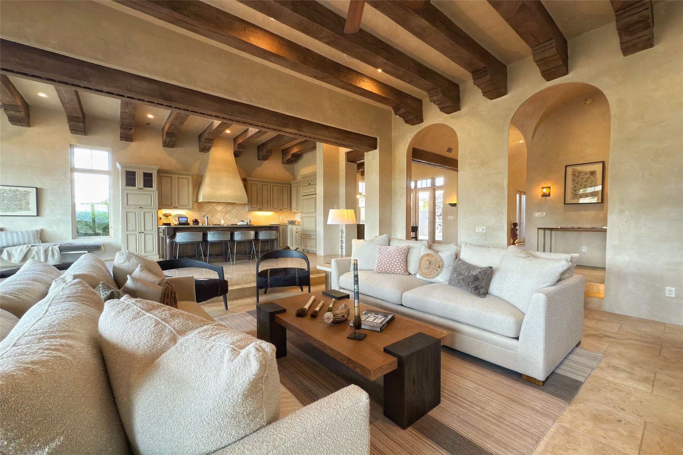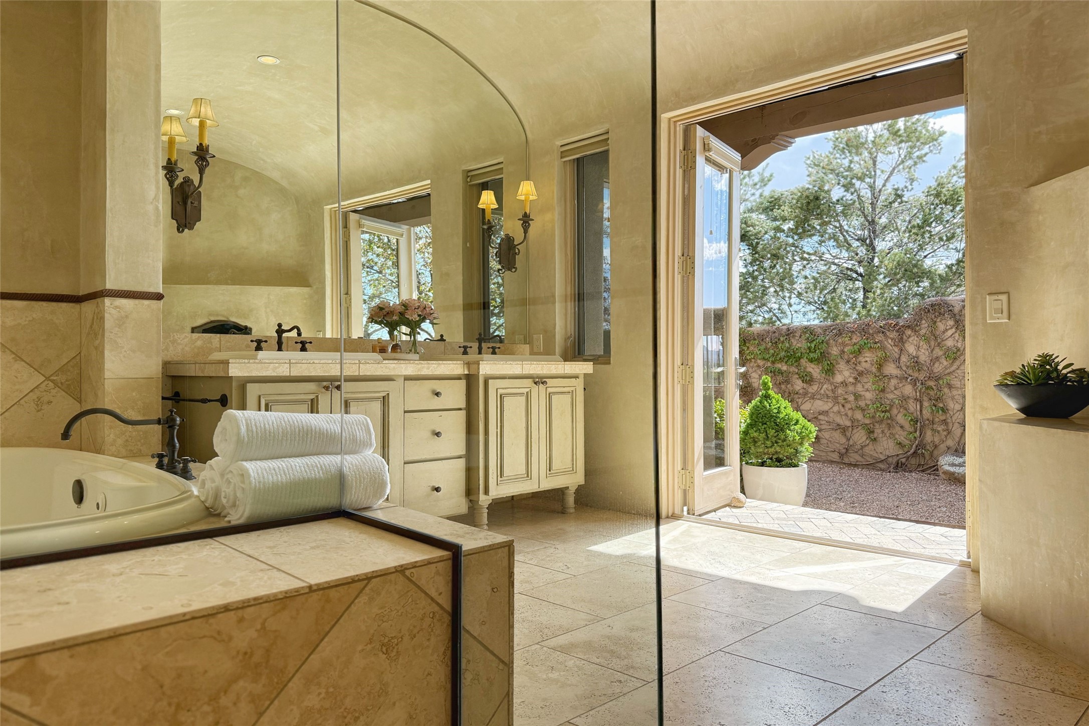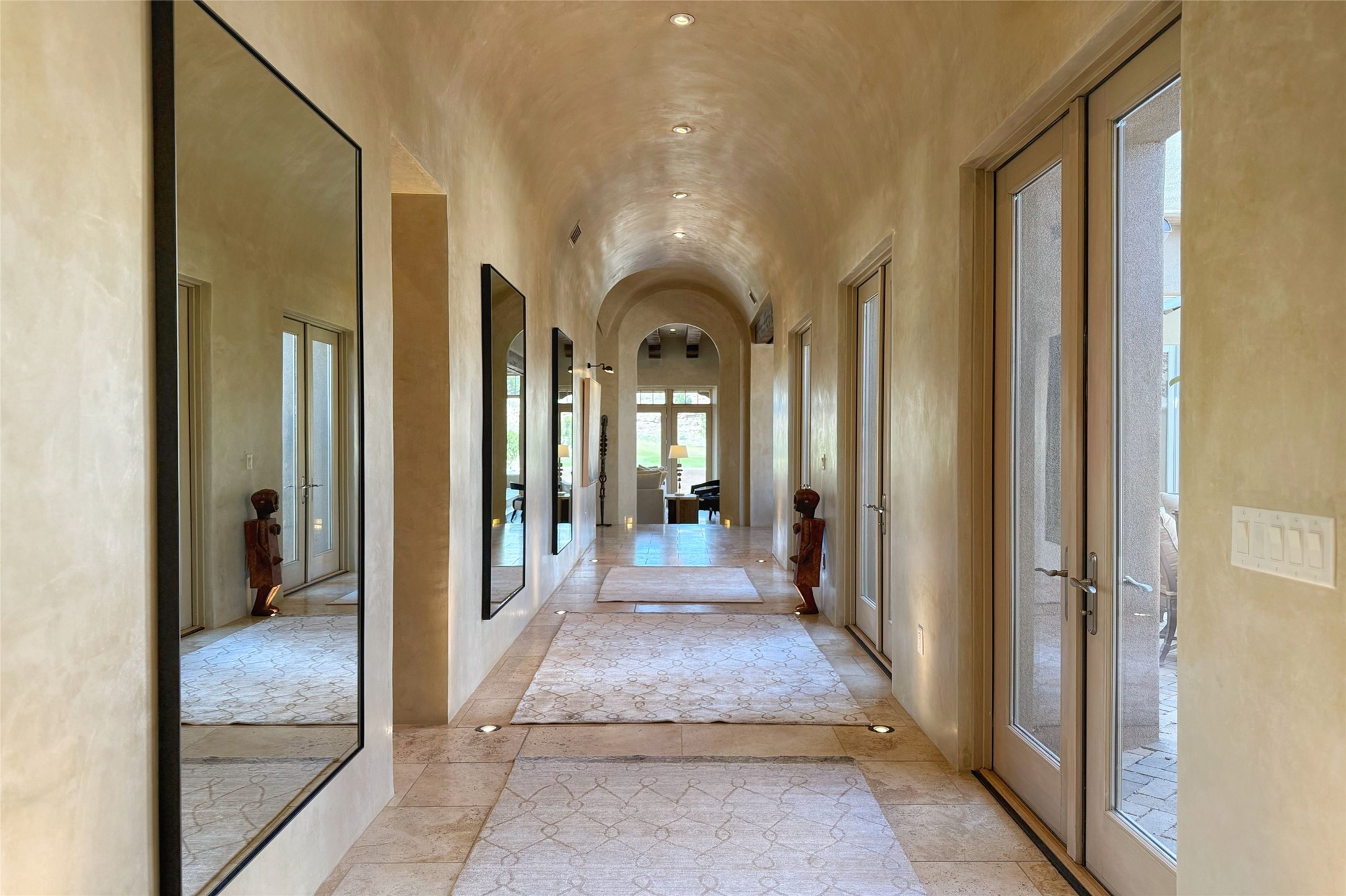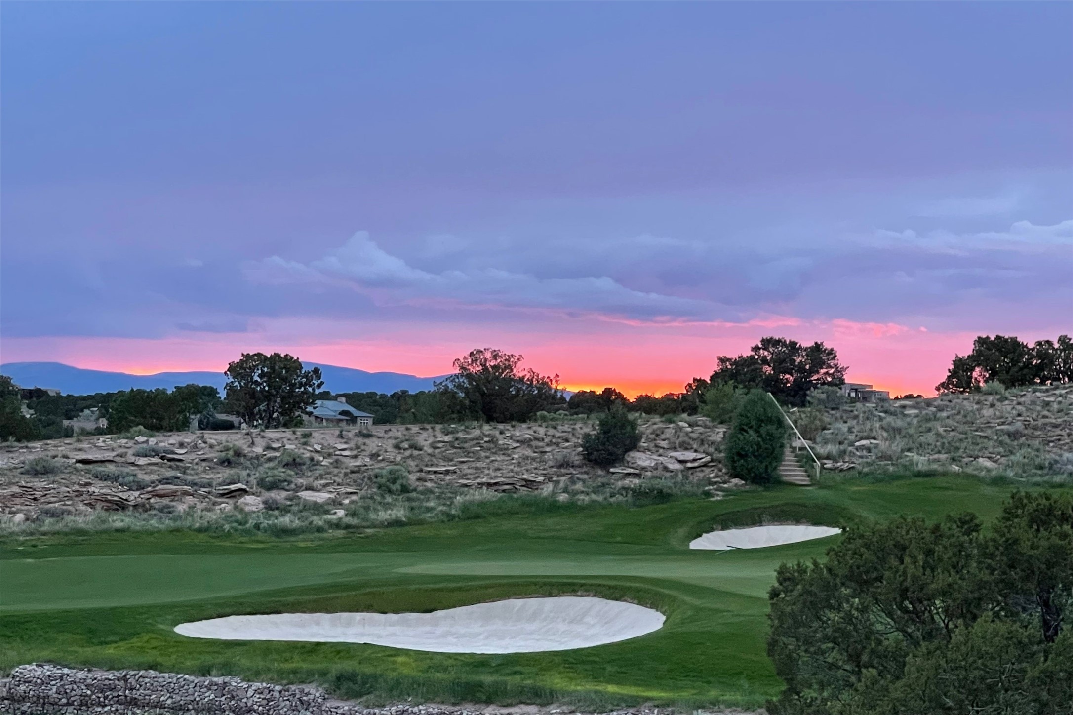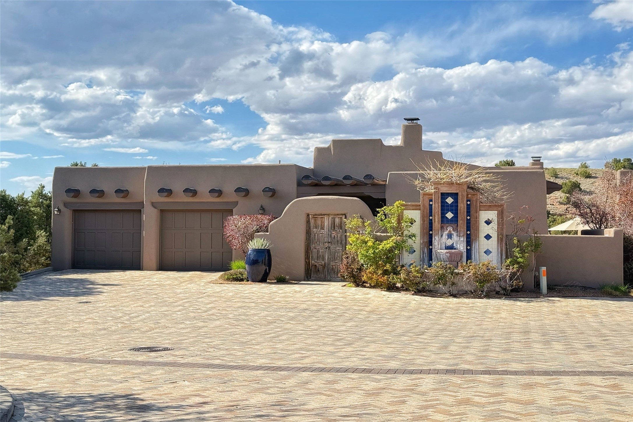 A superb location, this Las Campanas villa home provides majestic panoramic views of the Jack Nicklaus sunset golf course and Jemez / Sangre de Cristo mountain ranges. Surrounded by large open space owned by The Club at Las Campanas, affording excellent privacy. European-inspired architecture and finishes create an opulent, yet relaxed environment. Enjoy golf course views at a comfortable distance. The home sits at the end of a cul-de-sac, providing extra privacy and tranquility and ample guest parking. This home won the Parade of Homes awards for Best Floor Plan and Best Outdoor Space and features a grand arched entryway with floor lights and large Restoration Hardware mirrors to reflect the outdoors. The builder spared no expense on architectural detail and finishes: soaring 14 ft cathedral ceilings, wall wash skylights, travertine floors, handsome carved grand fireplace with custom glass doors, diamond plaster walls, granite countertops, Sub-Zero refrigerator, Wolf oven/stove, and six indoor/ two outdoor gas and wood-burning fireplaces. A sheltered interior courtyard brings the outdoors in. Choose the formal dining room that opens to the lovely courtyard or the casual eat-in nook with views. The primary bedroom suite has direct entrance to the outdoor portal overlooking the golf course and is separated from the guest bedrooms at the opposite wing of the home. Luxurious primary spa bath accesses a private enclosed side portal. Garage has large built-in cabinets for plenty of additional storage. Upgraded to entire smart home capability with high end indoor/outdoor Sonos sound system. Restoration Hardware mirrors and select indoor and all outdoor furniture pieces, as well as custom handcrafted TV cabinet and Murphy bed are included. New stucco, new roof, and tankless water heater with additional high capacity tank. Las Campanas golf membership available for purchase, subject to approval. With outstanding location, views and design, this home is truly captivating.