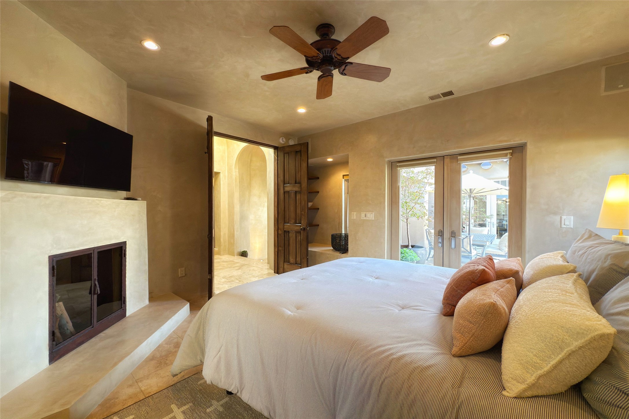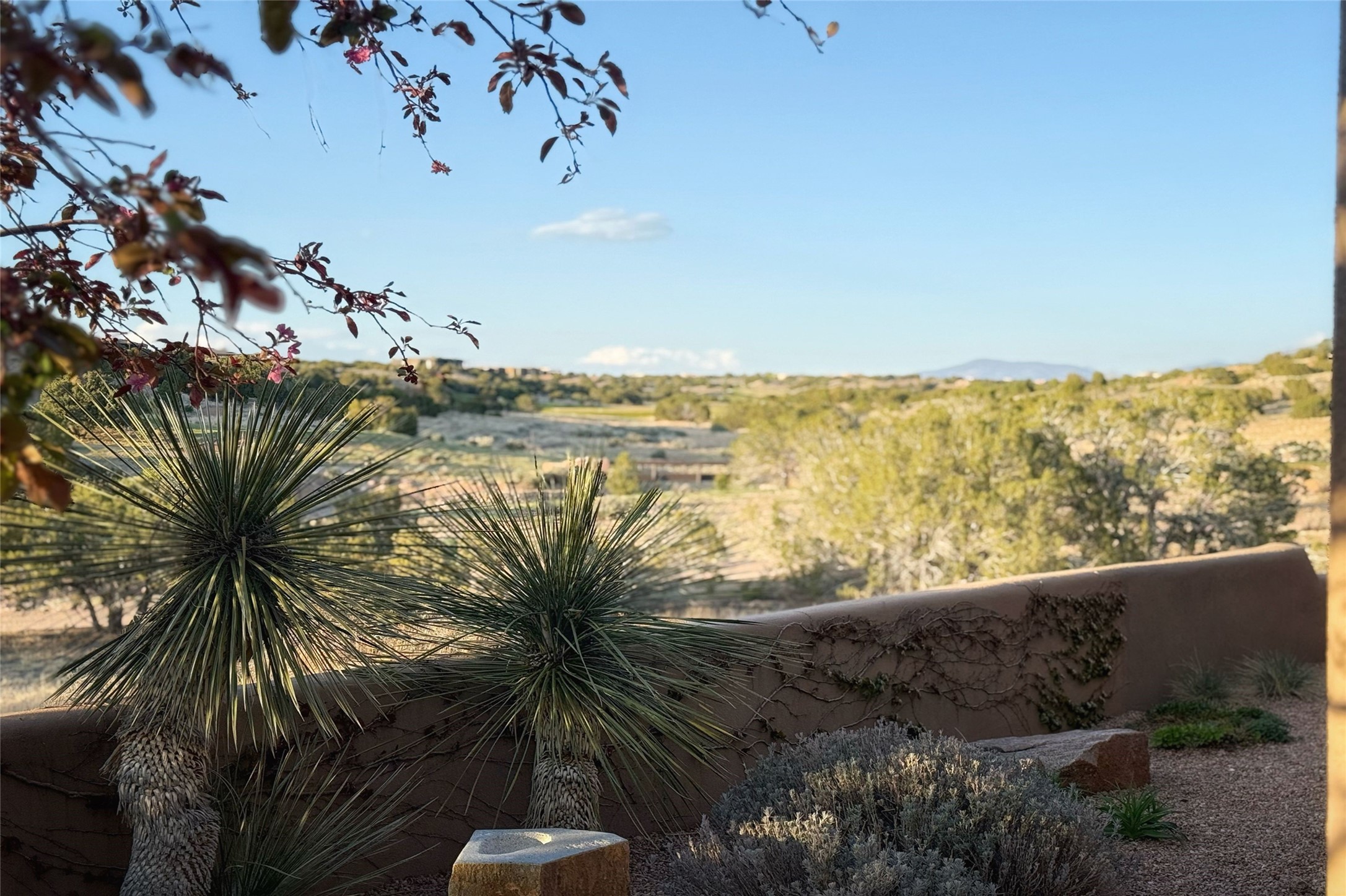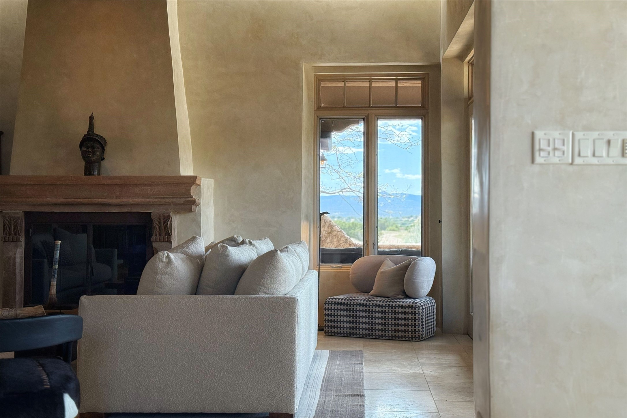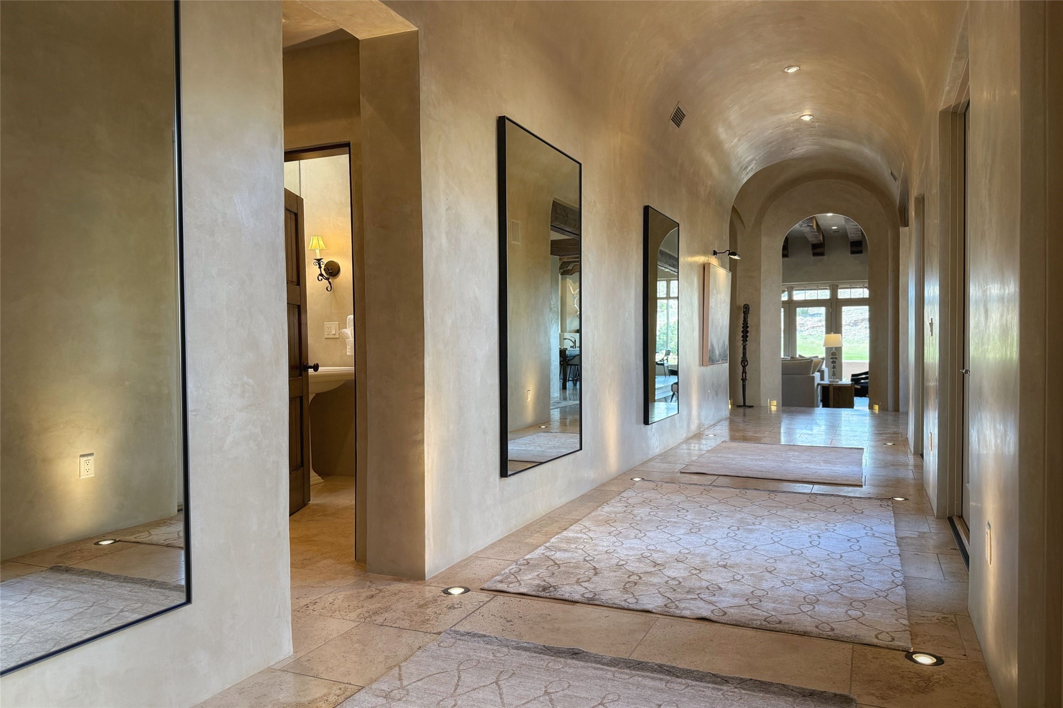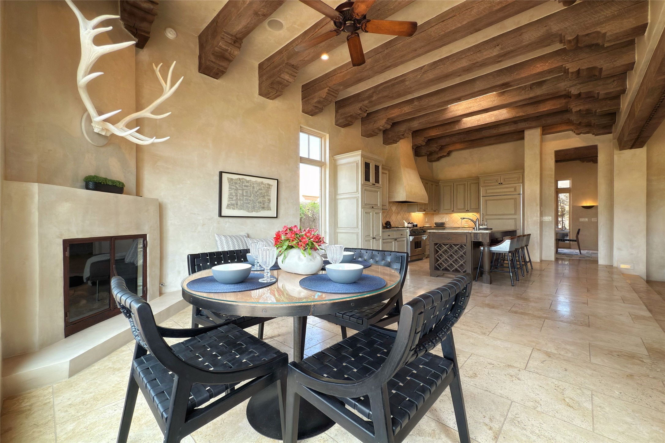 A superb location, this Las Campanas villa home provides majestic panoramic views of the Jack Nicklaus sunset golf course and Jemez / Sangre de Cristo mountain ranges. Surrounded by large open space owned by The Club at Las Campanas, affording excellent privacy. European-inspired architecture and finishes create an opulent, yet relaxed environment. Enjoy golf course views at a comfortable distance. The home sits at the end of a cul-de-sac, providing extra privacy and tranquility and ample guest parking. This home won the Parade of Homes awards for Best Floor Plan and Best Outdoor Space and features a grand arched entryway with floor lights and large Restoration Hardware mirrors to reflect the outdoors. The builder spared no expense on architectural detail and finishes: soaring 14 ft cathedral ceilings, wall wash skylights, travertine floors, handsome carved grand fireplace with custom glass doors, diamond plaster walls, granite countertops, Sub-Zero refrigerator, Wolf oven/stove, and six indoor/ two outdoor gas and wood-burning fireplaces. A sheltered interior courtyard brings the outdoors in. Choose the formal dining room that opens to the lovely courtyard or the casual eat-in nook with views. The primary bedroom suite has direct entrance to the outdoor portal overlooking the golf course and is separated from the guest bedrooms at the opposite wing of the home. Luxurious primary spa bath accesses a private enclosed side portal. Garage has large built-in cabinets for plenty of additional storage. Upgraded to entire smart home capability with high end indoor/outdoor Sonos sound system. Restoration Hardware mirrors and select indoor and all outdoor furniture pieces, as well as custom handcrafted TV cabinet and Murphy bed are included. New stucco, new roof, and tankless water heater with additional high capacity tank. Las Campanas golf membership available for purchase, subject to approval. With outstanding location, views and design, this home is truly captivating.