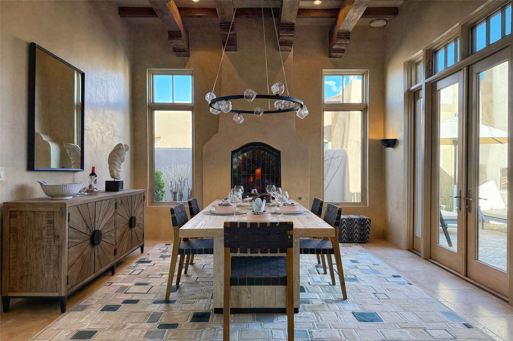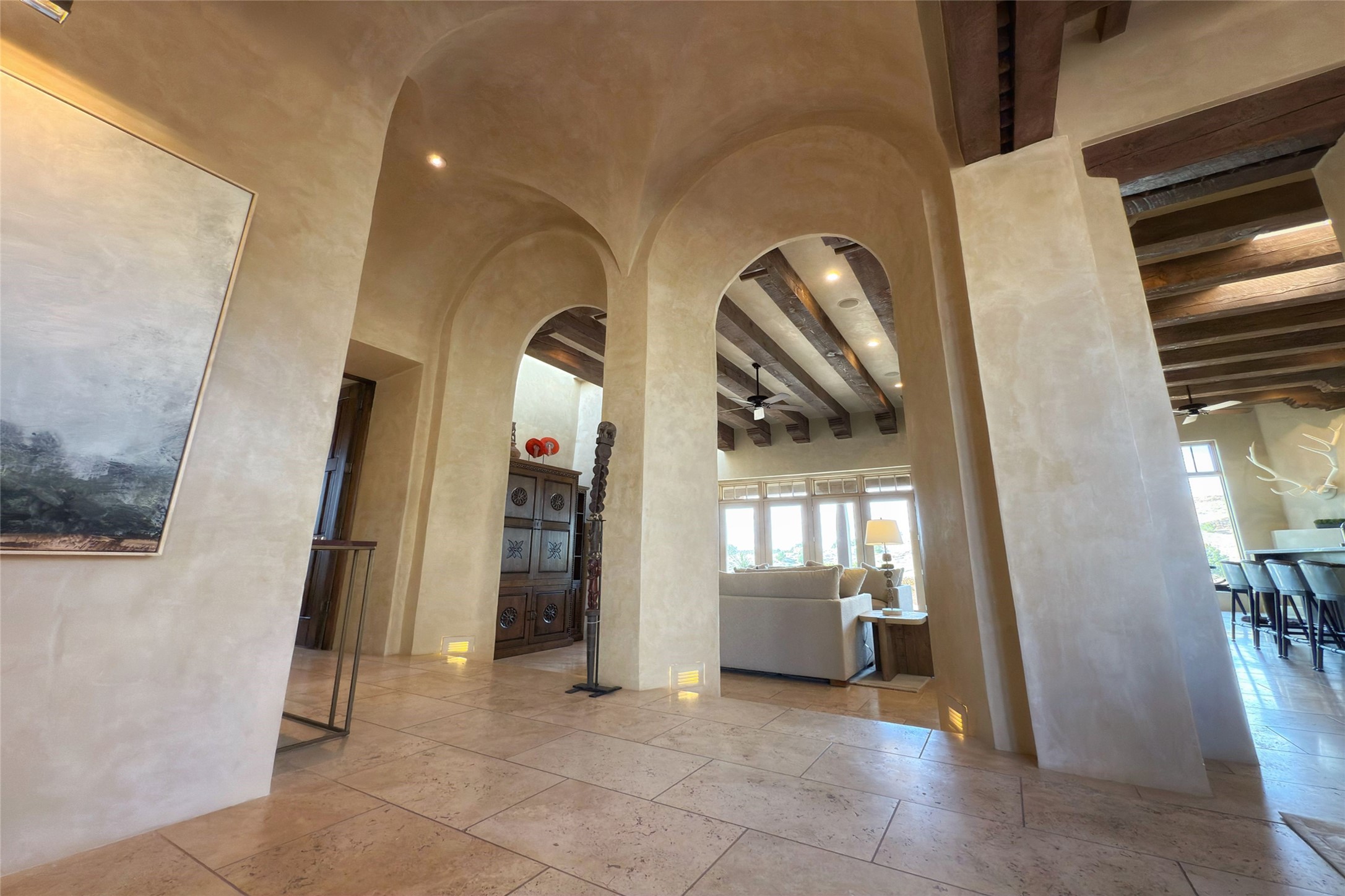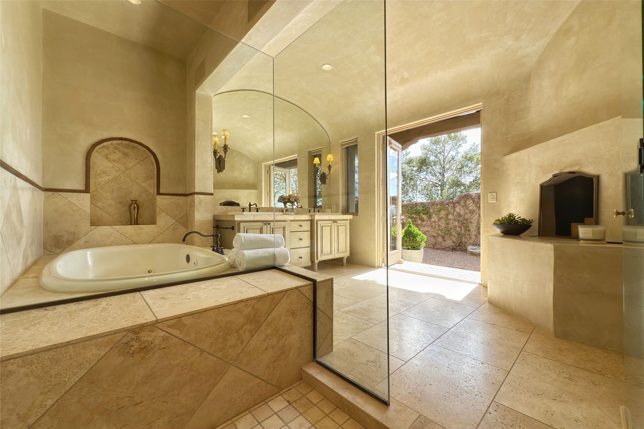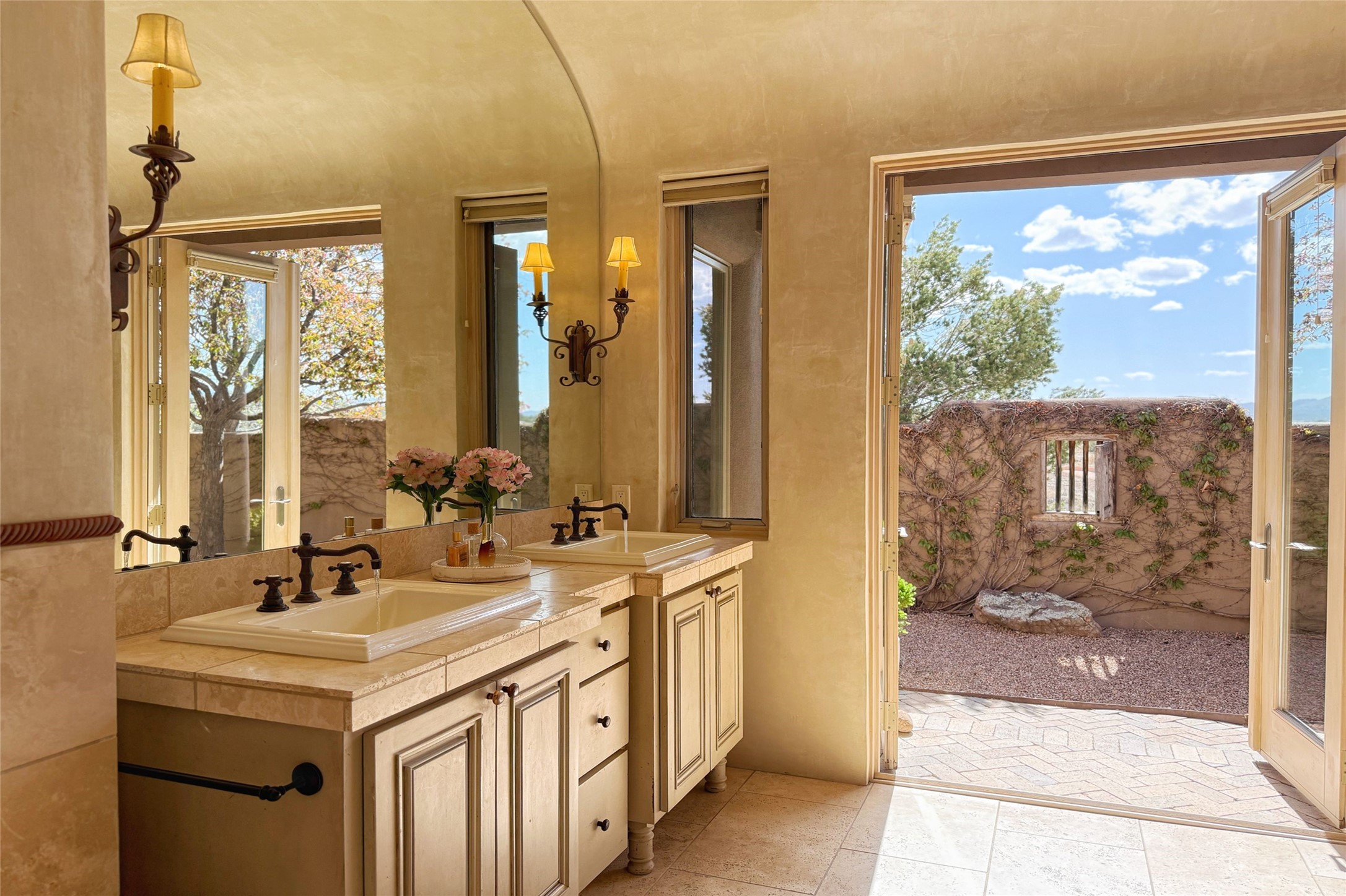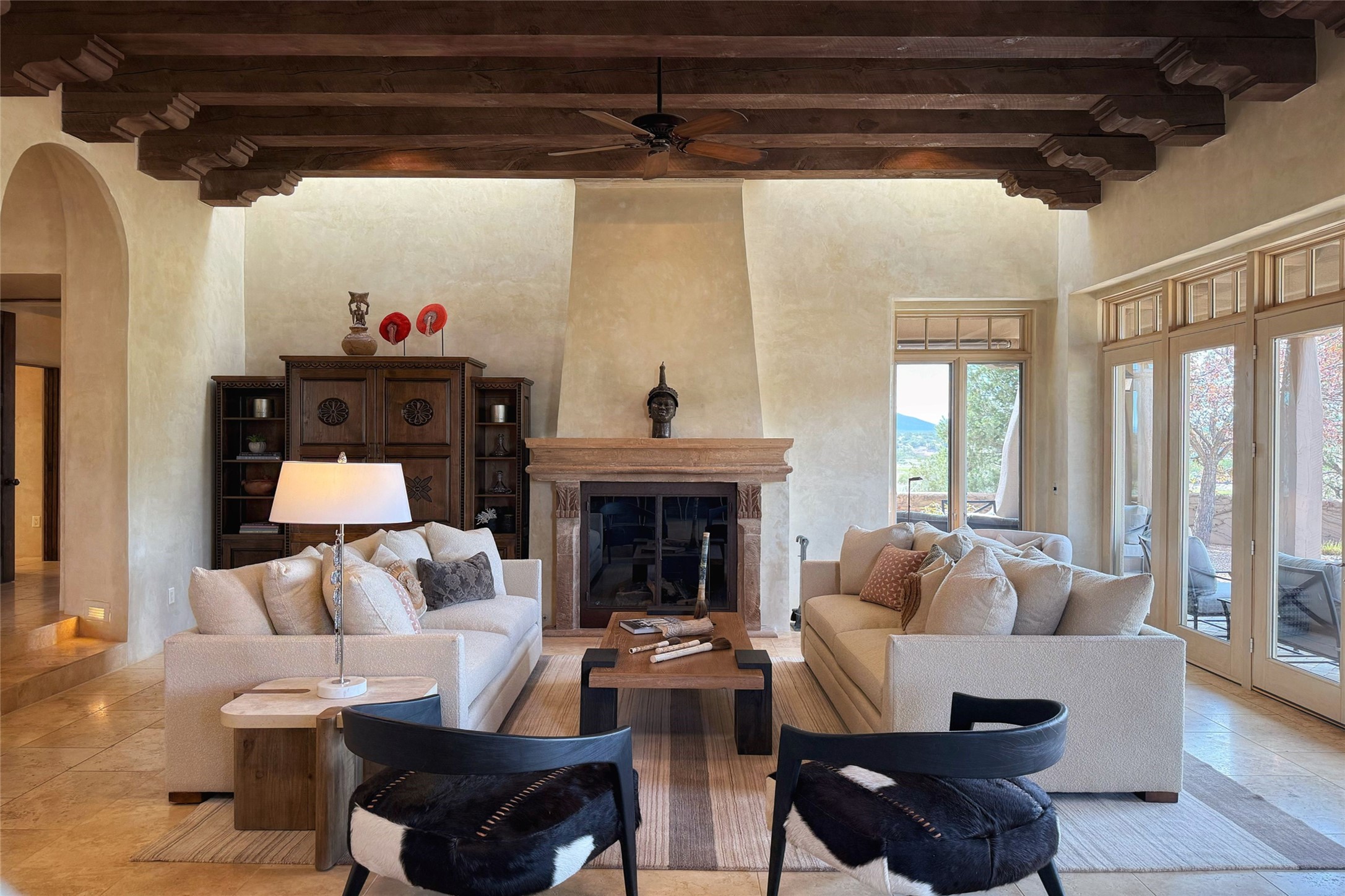 A superb location, this Las Campanas villa home provides majestic panoramic views of the Jack Nicklaus sunset golf course and Jemez / Sangre de Cristo mountain ranges. Surrounded by large open space owned by The Club at Las Campanas, affording excellent privacy. European-inspired architecture and finishes create an opulent, yet relaxed environment. Enjoy golf course views at a comfortable distance. The home sits at the end of a cul-de-sac, providing extra privacy and tranquility and ample guest parking. This home won the Parade of Homes awards for Best Floor Plan and Best Outdoor Space and features a grand arched entryway with floor lights and large Restoration Hardware mirrors to reflect the outdoors. The builder spared no expense on architectural detail and finishes: soaring 14 ft cathedral ceilings, wall wash skylights, travertine floors, handsome carved grand fireplace with custom glass doors, diamond plaster walls, granite countertops, Sub-Zero refrigerator, Wolf oven/stove, and six indoor/ two outdoor gas and wood-burning fireplaces. A sheltered interior courtyard brings the outdoors in. Choose the formal dining room that opens to the lovely courtyard or the casual eat-in nook with views. The primary bedroom suite has direct entrance to the outdoor portal overlooking the golf course and is separated from the guest bedrooms at the opposite wing of the home. Luxurious primary spa bath accesses a private enclosed side portal. Garage has large built-in cabinets for plenty of additional storage. Upgraded to entire smart home capability with high end indoor/outdoor Sonos sound system. Restoration Hardware mirrors and select indoor and all outdoor furniture pieces, as well as custom handcrafted TV cabinet and Murphy bed are included. New stucco, new roof, and tankless water heater with additional high capacity tank. Las Campanas golf membership available for purchase, subject to approval. With outstanding location, views and design, this home is truly captivating.