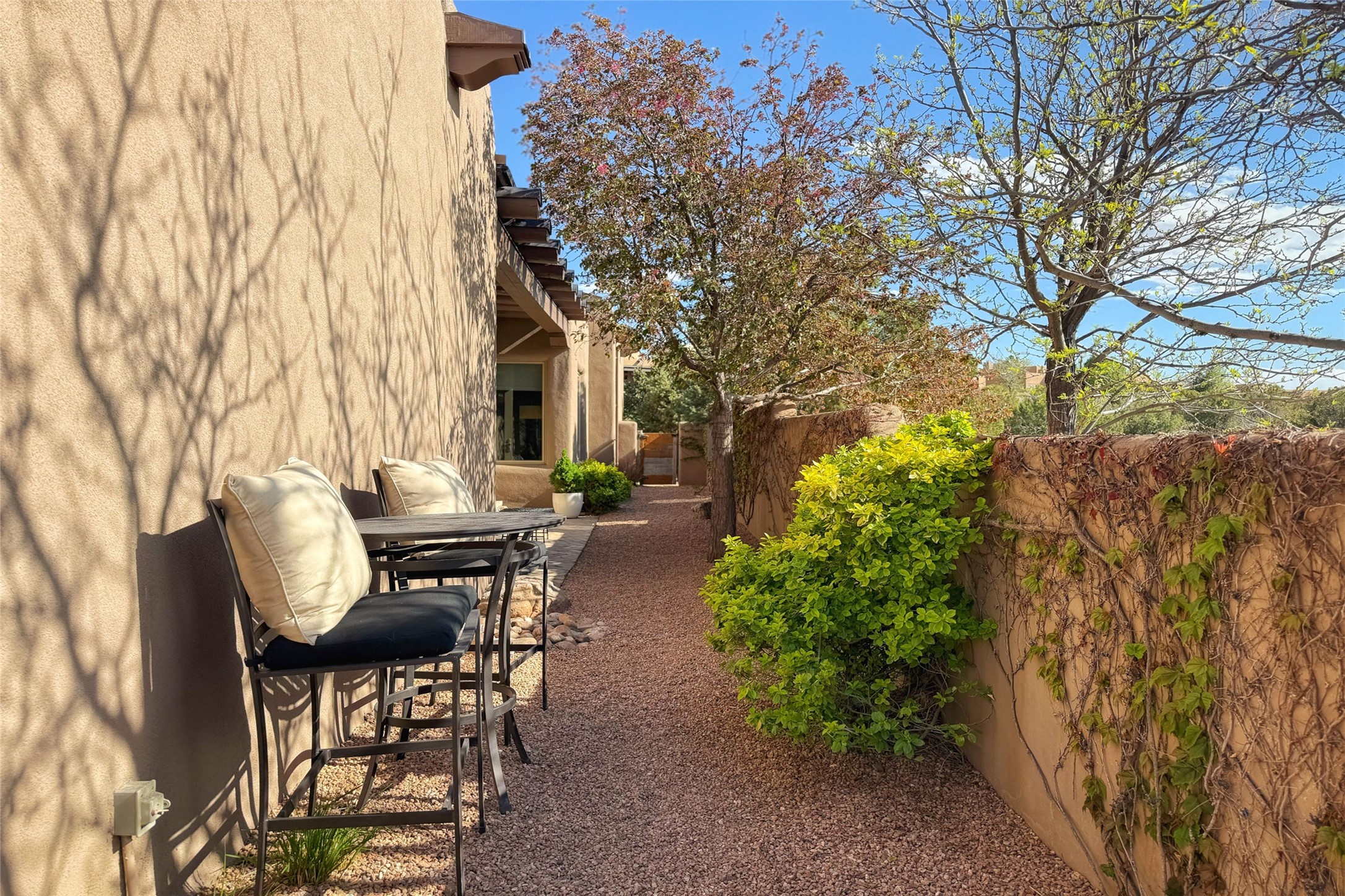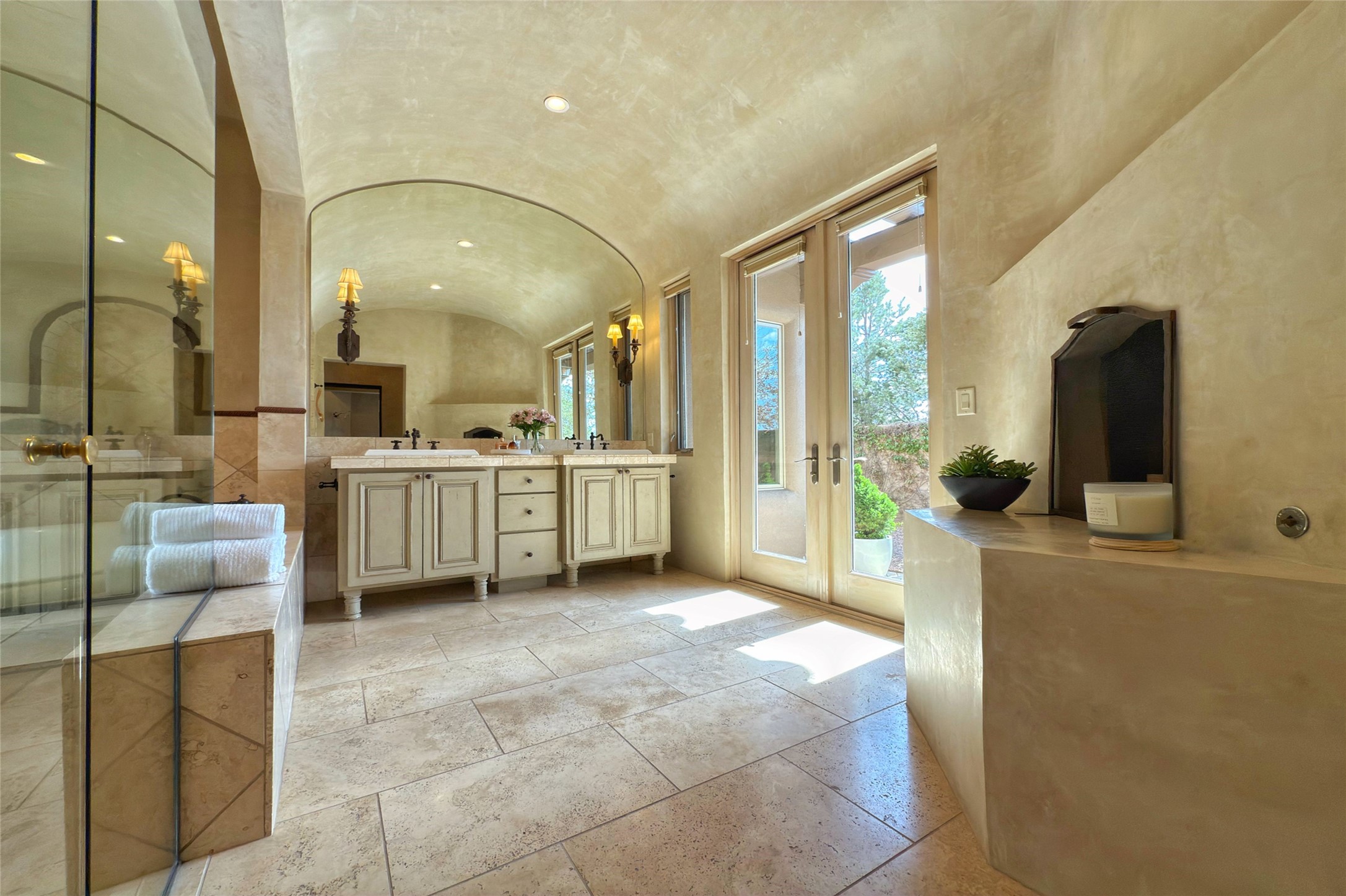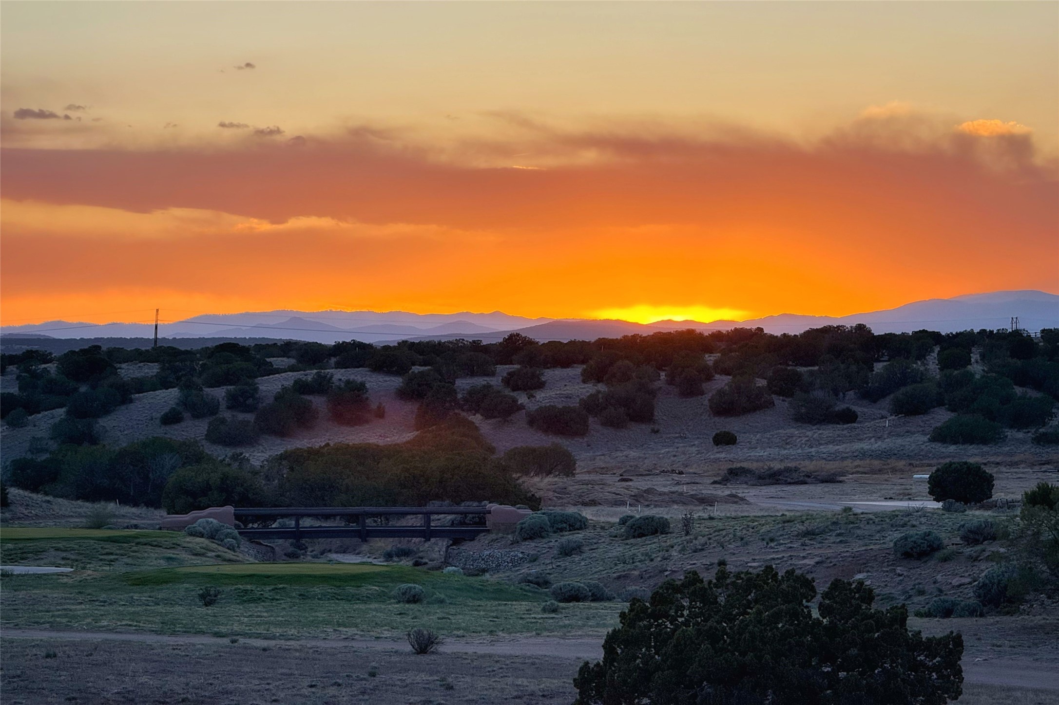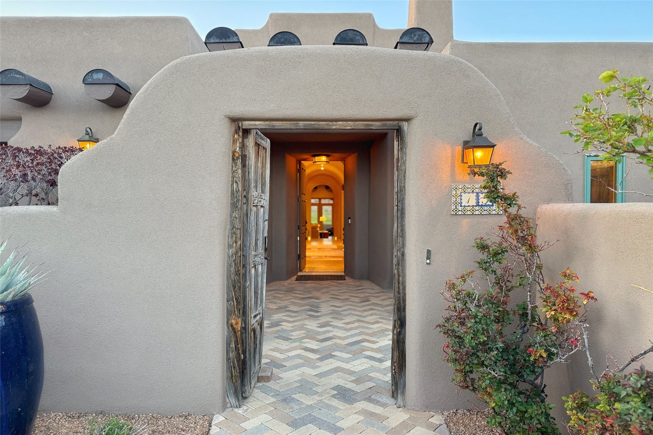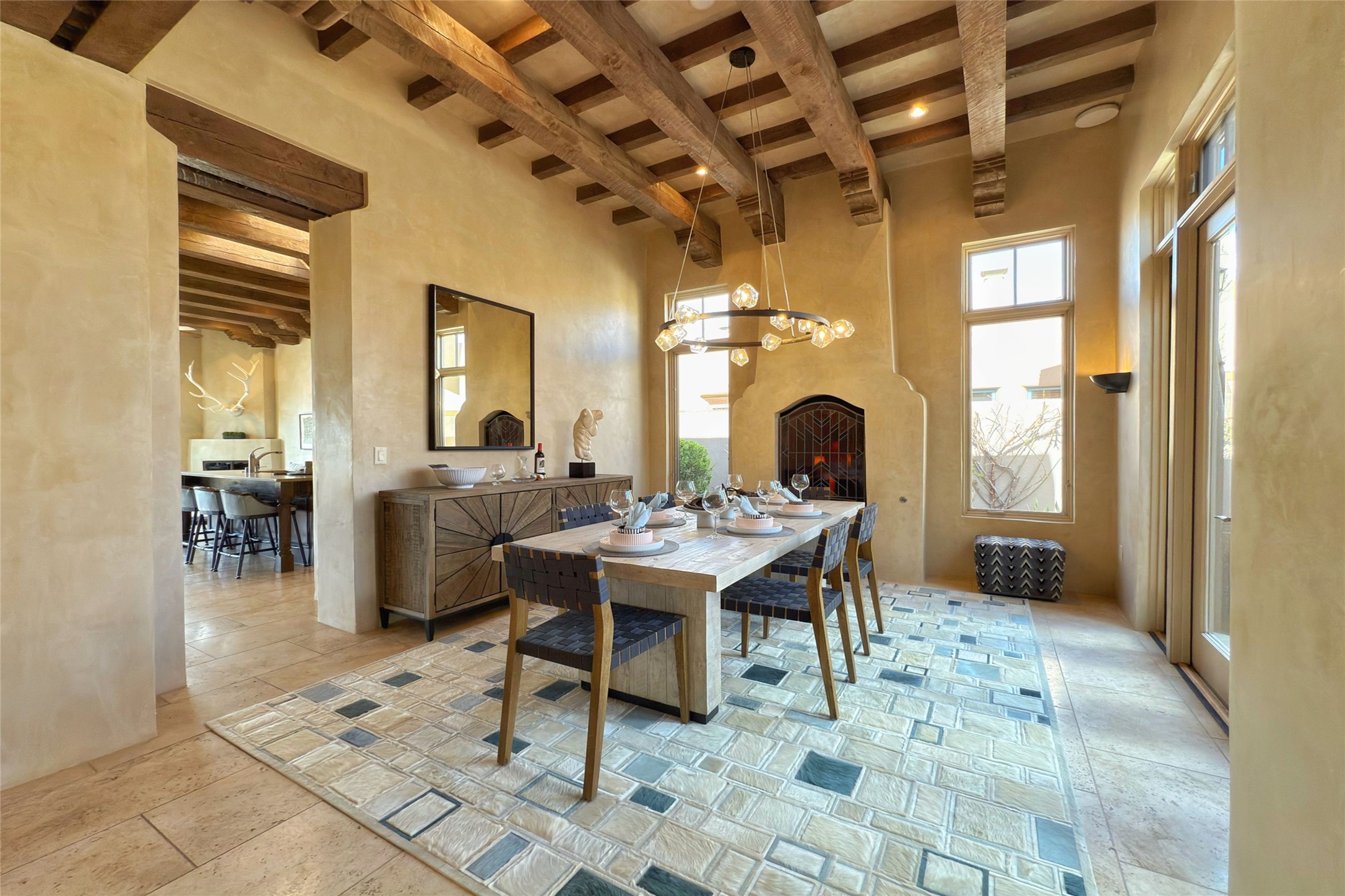 A superb location, this Las Campanas villa home provides majestic panoramic views of the Jack Nicklaus sunset golf course and Jemez / Sangre de Cristo mountain ranges. Surrounded by large open space owned by The Club at Las Campanas, affording excellent privacy. European-inspired architecture and finishes create an opulent, yet relaxed environment. Enjoy golf course views at a comfortable distance. The home sits at the end of a cul-de-sac, providing extra privacy and tranquility and ample guest parking. This home won the Parade of Homes awards for Best Floor Plan and Best Outdoor Space and features a grand arched entryway with floor lights and large Restoration Hardware mirrors to reflect the outdoors. The builder spared no expense on architectural detail and finishes: soaring 14 ft cathedral ceilings, wall wash skylights, travertine floors, handsome carved grand fireplace with custom glass doors, diamond plaster walls, granite countertops, Sub-Zero refrigerator, Wolf oven/stove, and six indoor/ two outdoor gas and wood-burning fireplaces. A sheltered interior courtyard brings the outdoors in. Choose the formal dining room that opens to the lovely courtyard or the casual eat-in nook with views. The primary bedroom suite has direct entrance to the outdoor portal overlooking the golf course and is separated from the guest bedrooms at the opposite wing of the home. Luxurious primary spa bath accesses a private enclosed side portal. Garage has large built-in cabinets for plenty of additional storage. Upgraded to entire smart home capability with high end indoor/outdoor Sonos sound system. Restoration Hardware mirrors and select indoor and all outdoor furniture pieces, as well as custom handcrafted TV cabinet and Murphy bed are included. New stucco, new roof, and tankless water heater with additional high capacity tank. Las Campanas golf membership available for purchase, subject to approval. With outstanding location, views and design, this home is truly captivating.