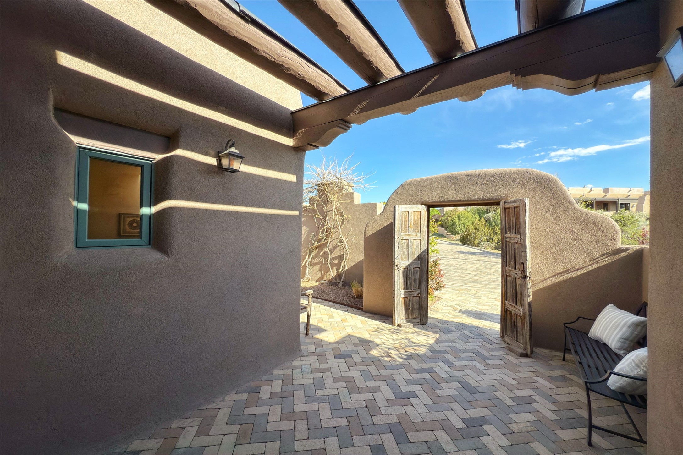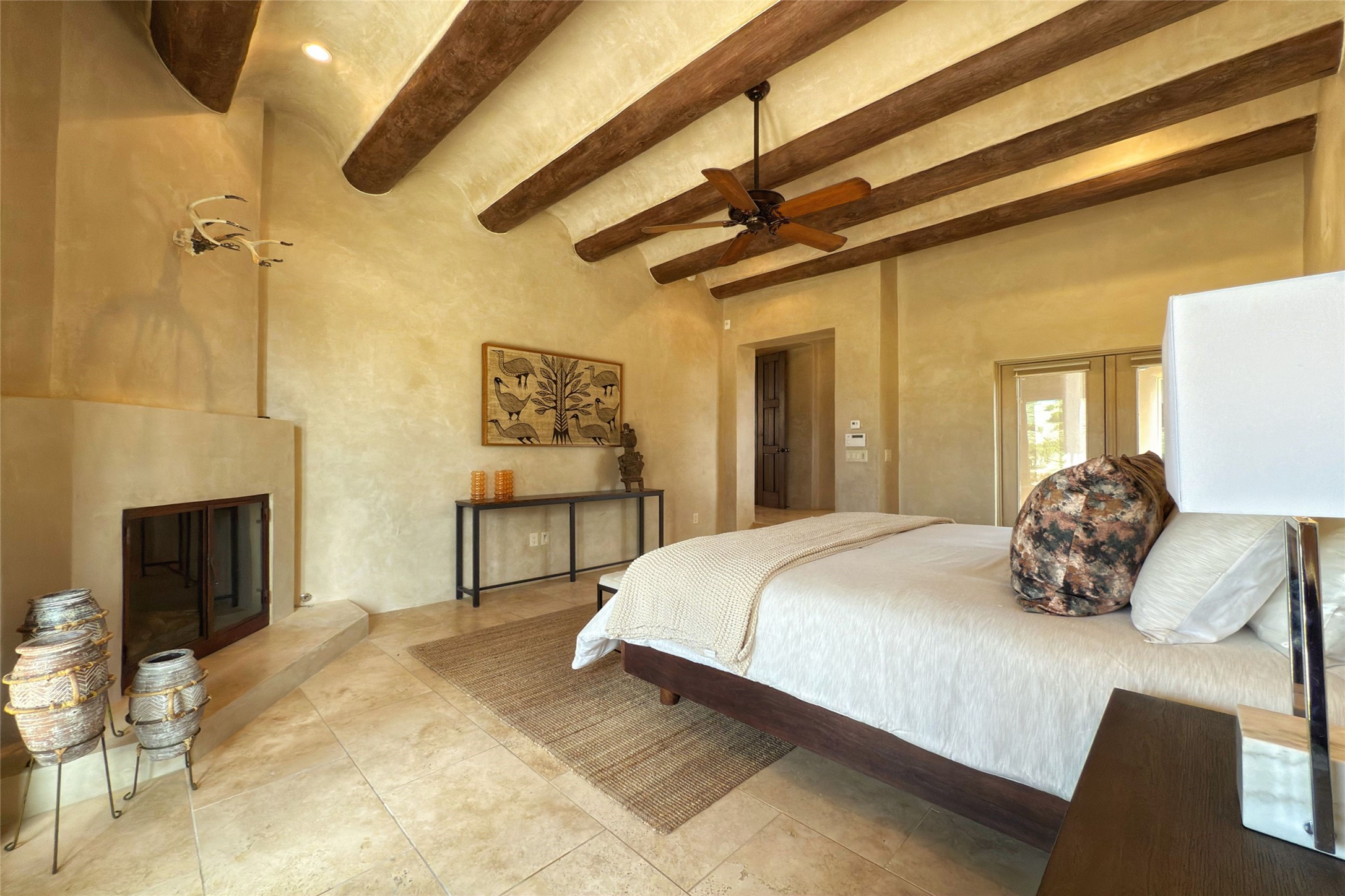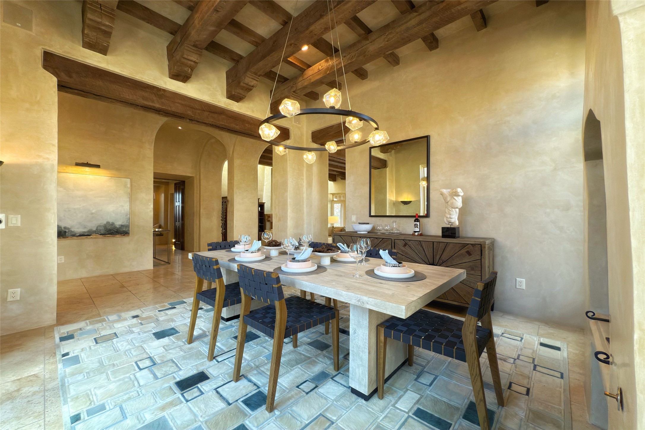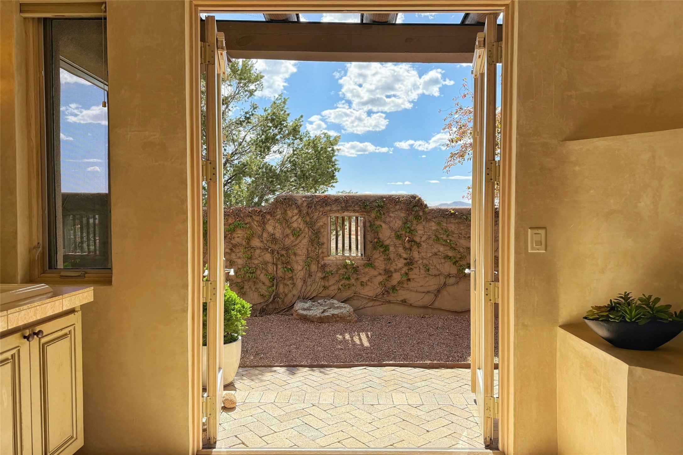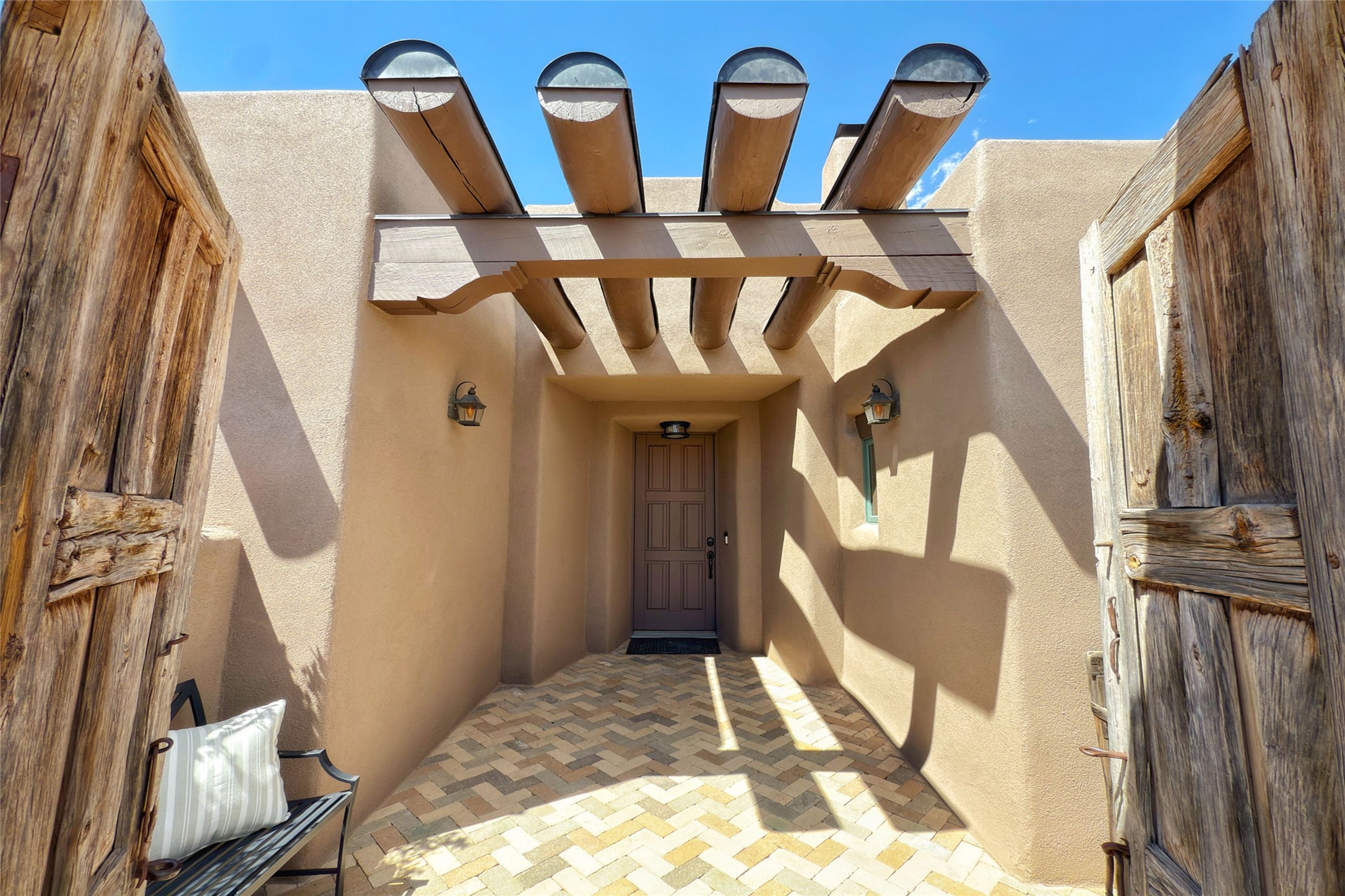 A superb location, this Las Campanas villa home provides majestic panoramic views of the Jack Nicklaus sunset golf course and Jemez / Sangre de Cristo mountain ranges. Surrounded by large open space owned by The Club at Las Campanas, affording excellent privacy. European-inspired architecture and finishes create an opulent, yet relaxed environment. Enjoy golf course views at a comfortable distance. The home sits at the end of a cul-de-sac, providing extra privacy and tranquility and ample guest parking. This home won the Parade of Homes awards for Best Floor Plan and Best Outdoor Space and features a grand arched entryway with floor lights and large Restoration Hardware mirrors to reflect the outdoors. The builder spared no expense on architectural detail and finishes: soaring 14 ft cathedral ceilings, wall wash skylights, travertine floors, handsome carved grand fireplace with custom glass doors, diamond plaster walls, granite countertops, Sub-Zero refrigerator, Wolf oven/stove, and six indoor/ two outdoor gas and wood-burning fireplaces. A sheltered interior courtyard brings the outdoors in. Choose the formal dining room that opens to the lovely courtyard or the casual eat-in nook with views. The primary bedroom suite has direct entrance to the outdoor portal overlooking the golf course and is separated from the guest bedrooms at the opposite wing of the home. Luxurious primary spa bath accesses a private enclosed side portal. Garage has large built-in cabinets for plenty of additional storage. Upgraded to entire smart home capability with high end indoor/outdoor Sonos sound system. Restoration Hardware mirrors and select indoor and all outdoor furniture pieces, as well as custom handcrafted TV cabinet and Murphy bed are included. New stucco, new roof, and tankless water heater with additional high capacity tank. Las Campanas golf membership available for purchase, subject to approval. With outstanding location, views and design, this home is truly captivating.