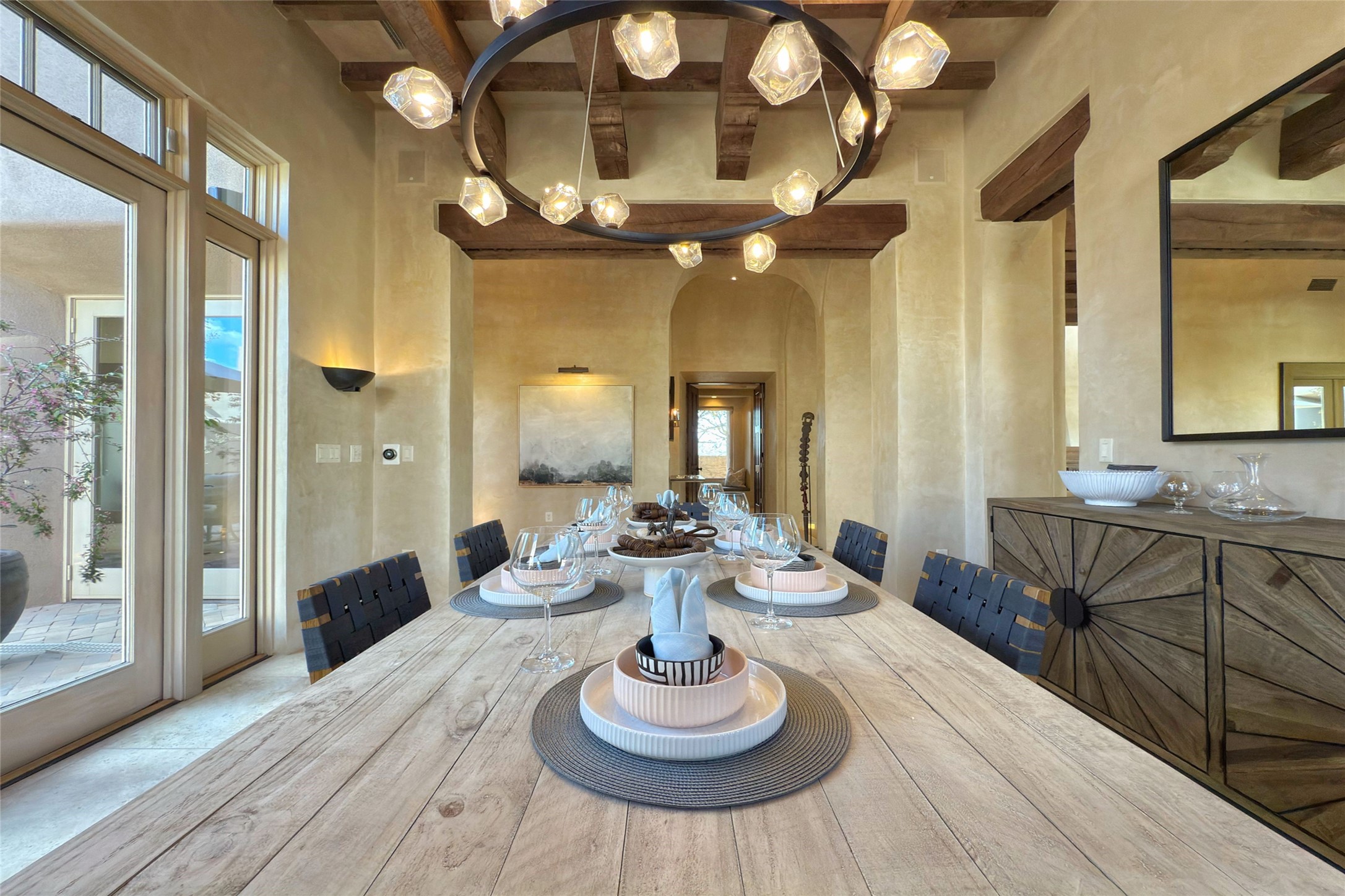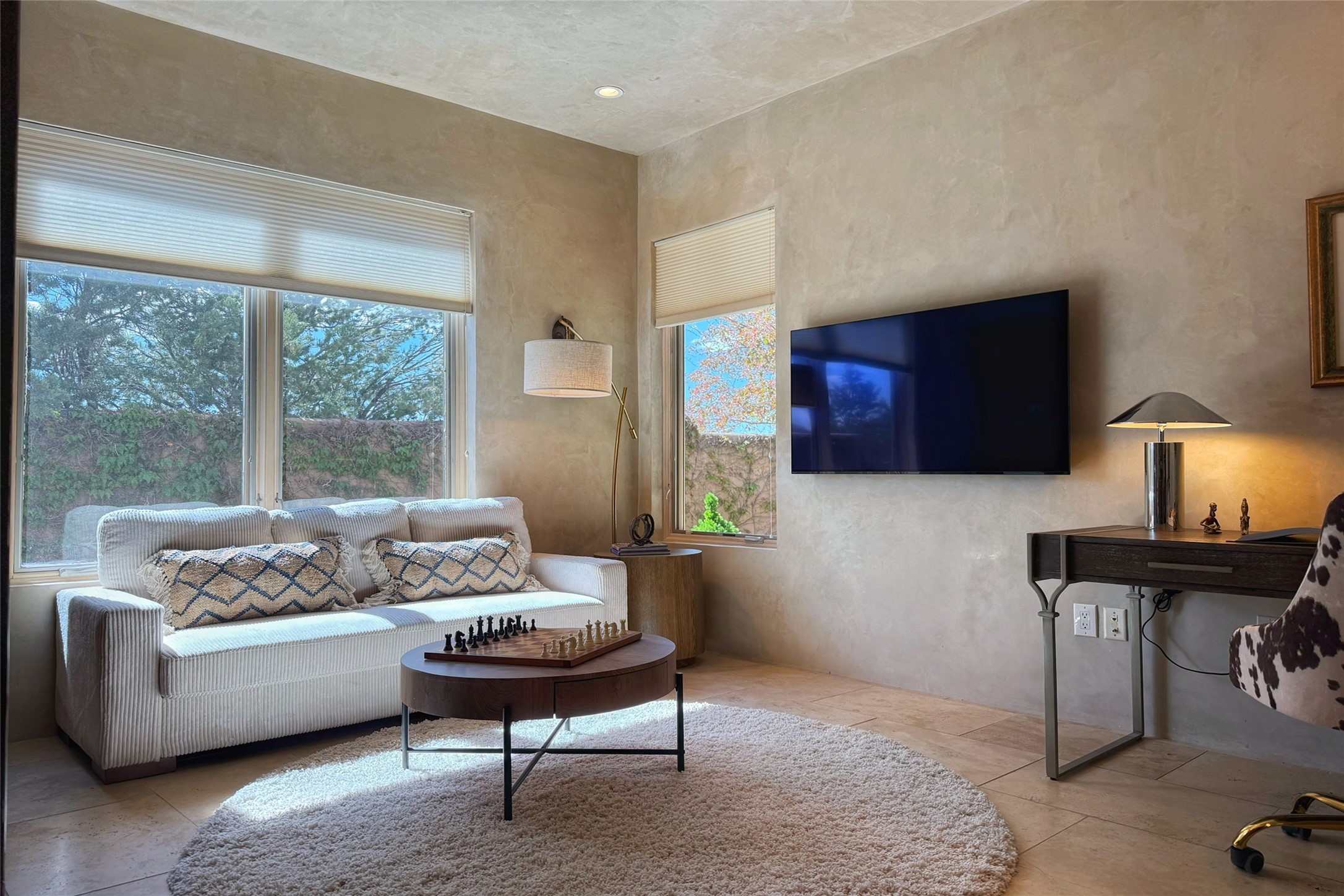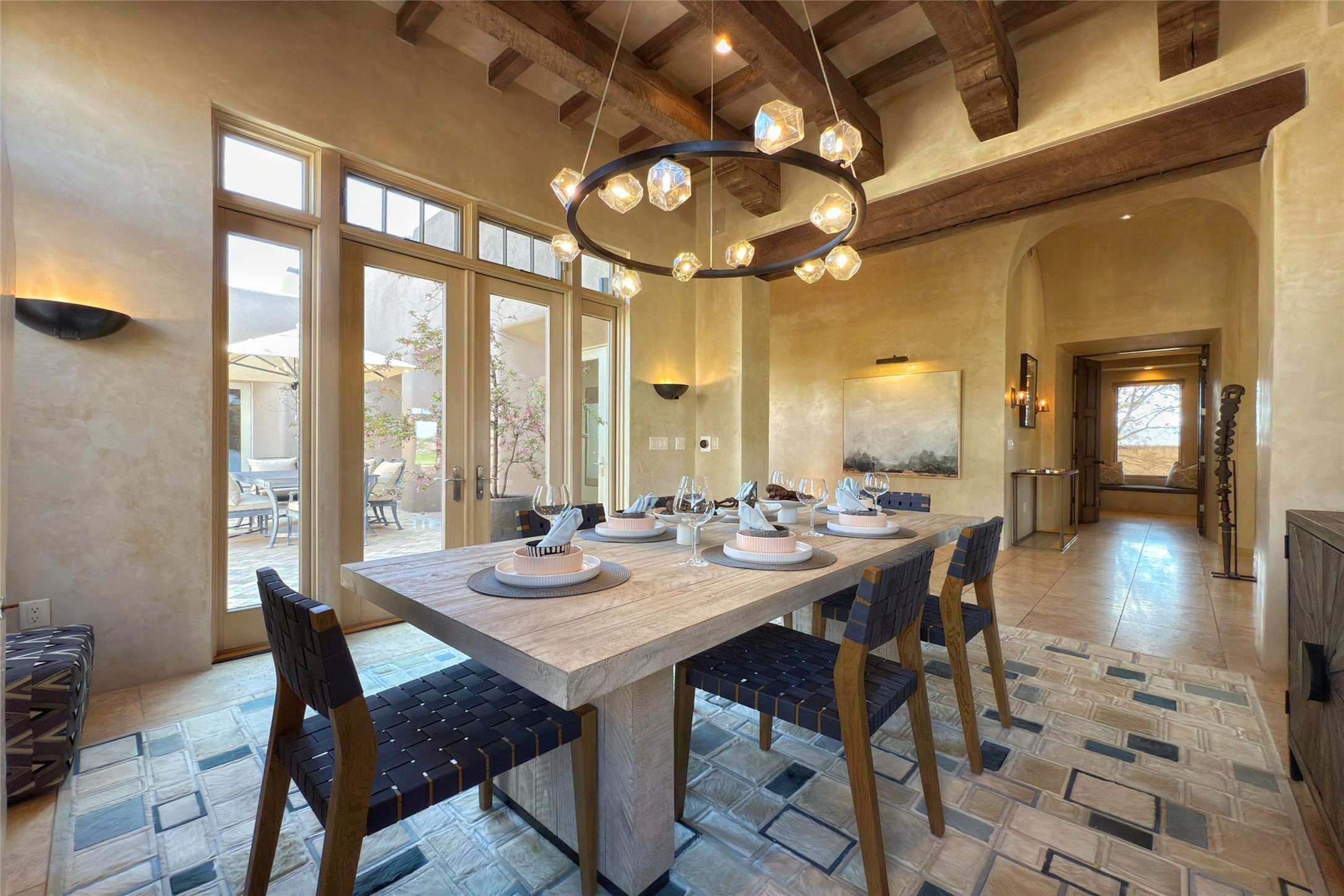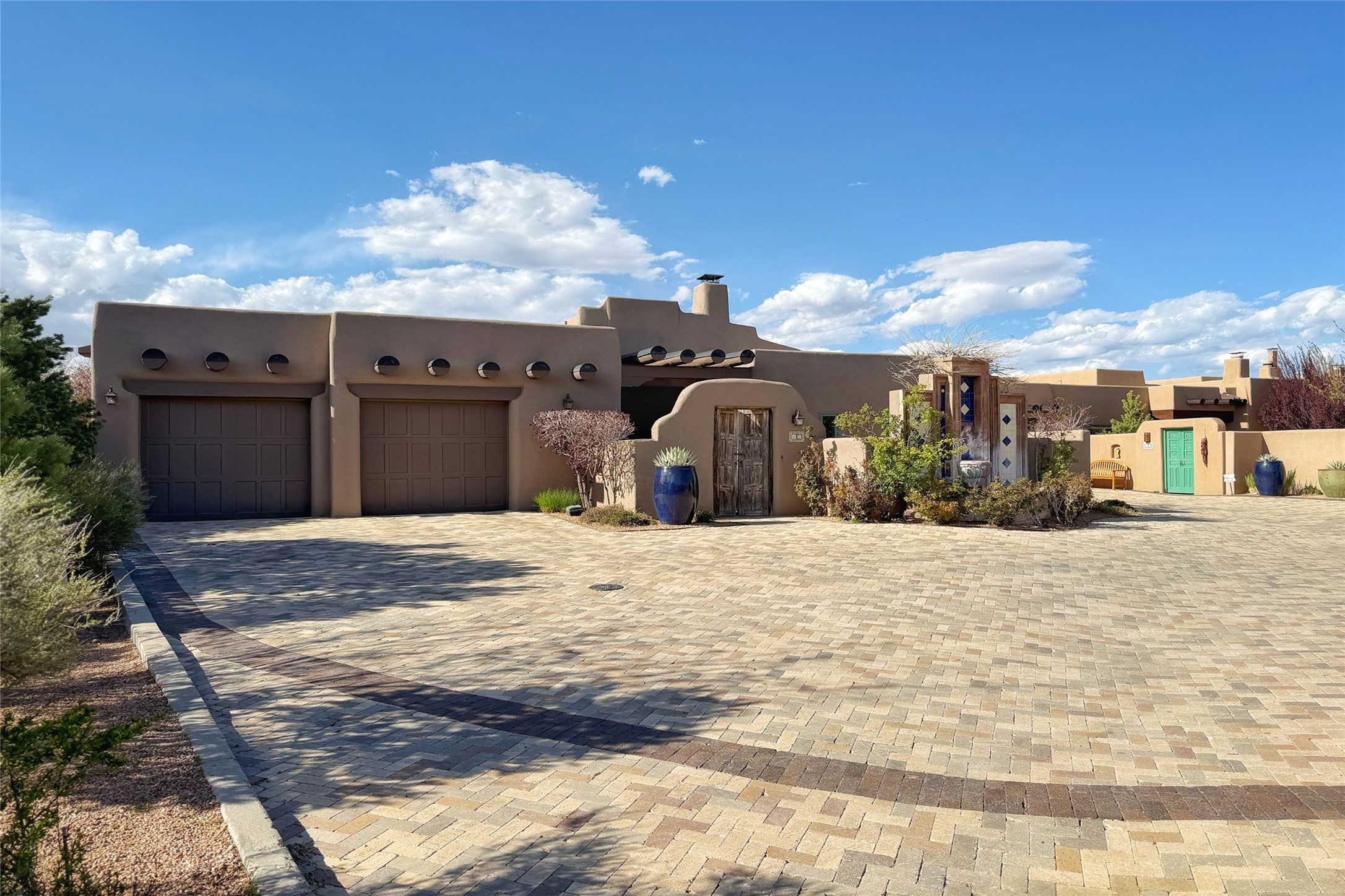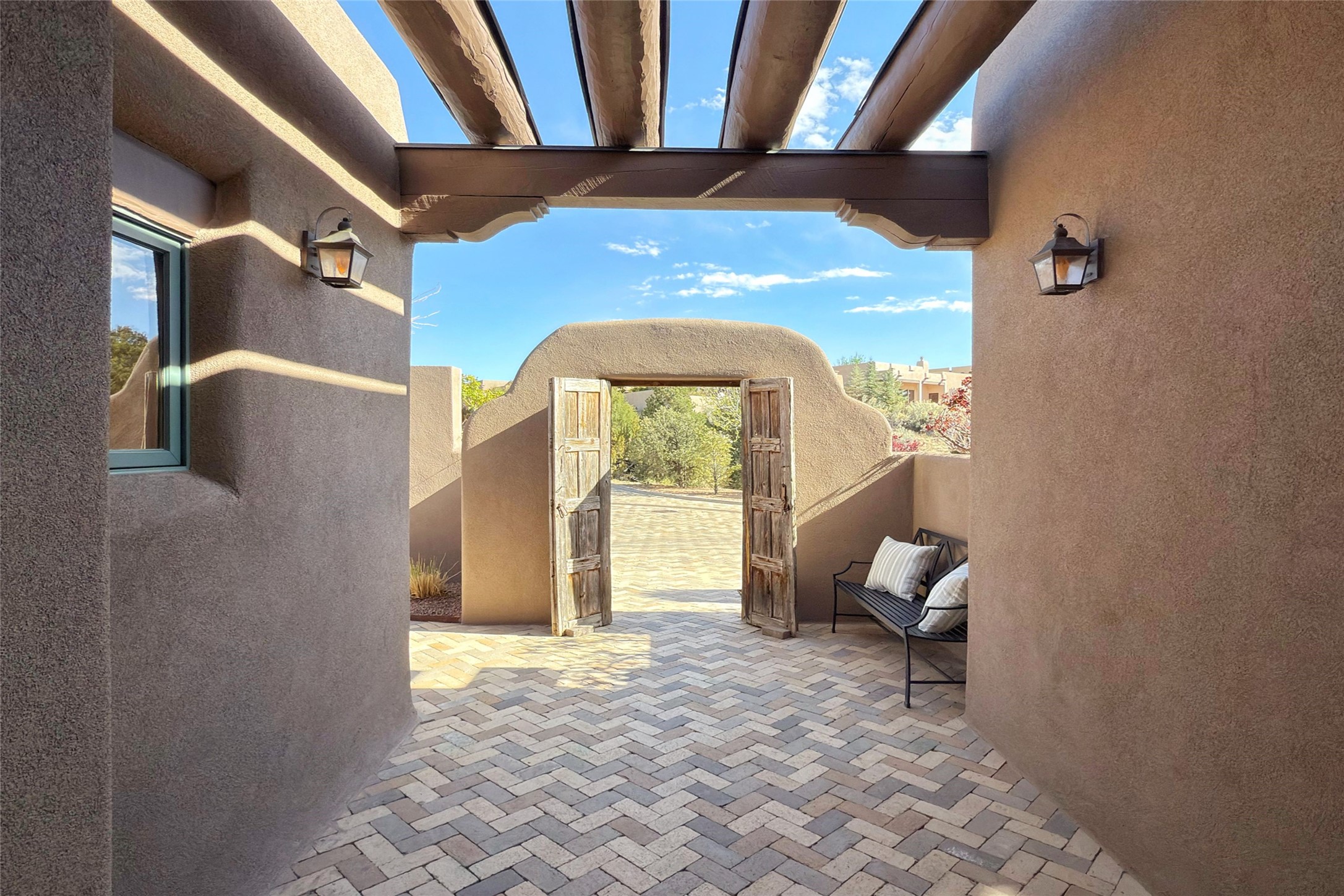 A superb location, this Las Campanas villa home provides majestic panoramic views of the Jack Nicklaus sunset golf course and Jemez / Sangre de Cristo mountain ranges. Surrounded by large open space owned by The Club at Las Campanas, affording excellent privacy. European-inspired architecture and finishes create an opulent, yet relaxed environment. Enjoy golf course views at a comfortable distance. The home sits at the end of a cul-de-sac, providing extra privacy and tranquility and ample guest parking. This home won the Parade of Homes awards for Best Floor Plan and Best Outdoor Space and features a grand arched entryway with floor lights and large Restoration Hardware mirrors to reflect the outdoors. The builder spared no expense on architectural detail and finishes: soaring 14 ft cathedral ceilings, wall wash skylights, travertine floors, handsome carved grand fireplace with custom glass doors, diamond plaster walls, granite countertops, Sub-Zero refrigerator, Wolf oven/stove, and six indoor/ two outdoor gas and wood-burning fireplaces. A sheltered interior courtyard brings the outdoors in. Choose the formal dining room that opens to the lovely courtyard or the casual eat-in nook with views. The primary bedroom suite has direct entrance to the outdoor portal overlooking the golf course and is separated from the guest bedrooms at the opposite wing of the home. Luxurious primary spa bath accesses a private enclosed side portal. Garage has large built-in cabinets for plenty of additional storage. Upgraded to entire smart home capability with high end indoor/outdoor Sonos sound system. Restoration Hardware mirrors and select indoor and all outdoor furniture pieces, as well as custom handcrafted TV cabinet and Murphy bed are included. New stucco, new roof, and tankless water heater with additional high capacity tank. Las Campanas golf membership available for purchase, subject to approval. With outstanding location, views and design, this home is truly captivating.