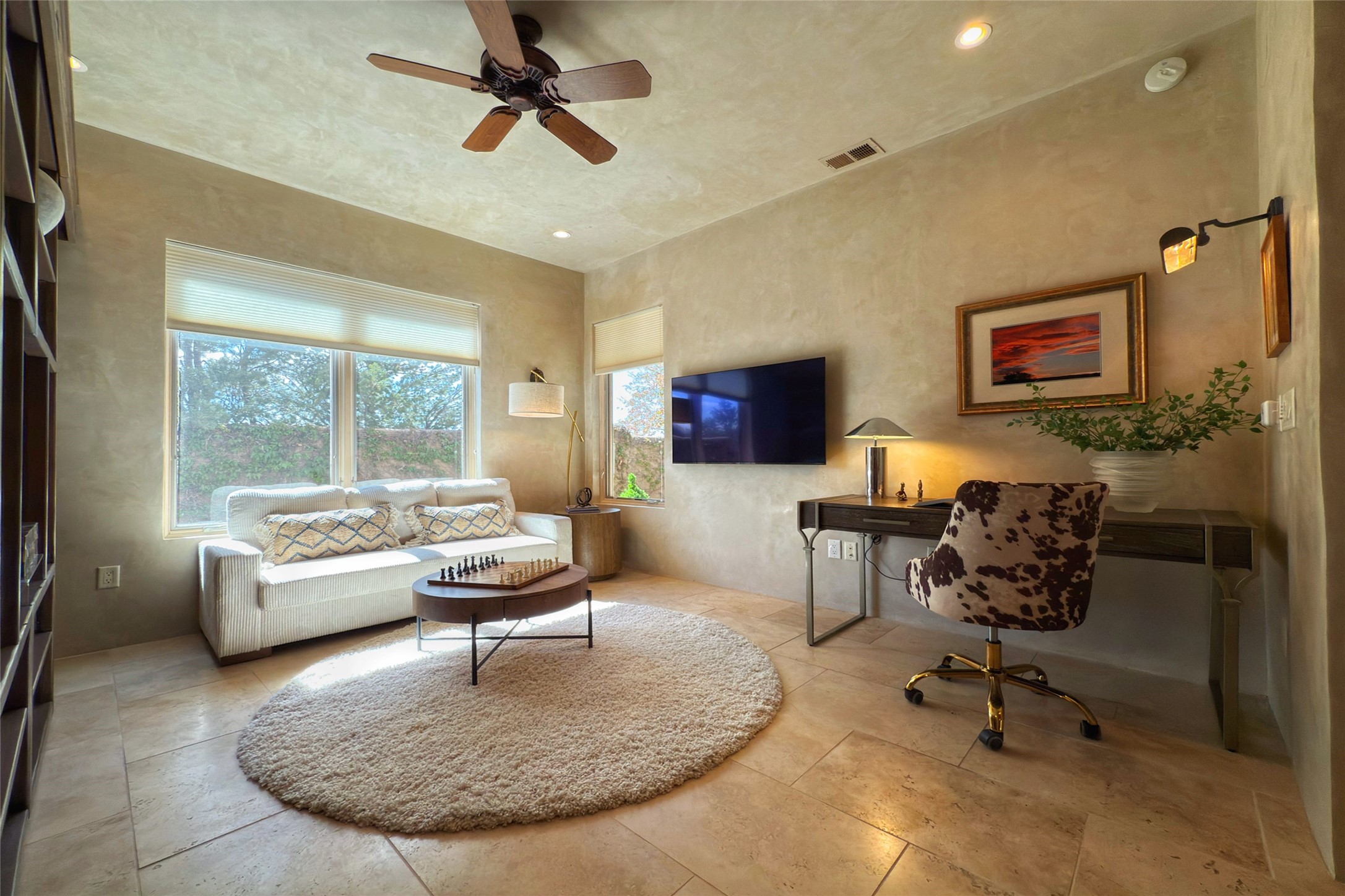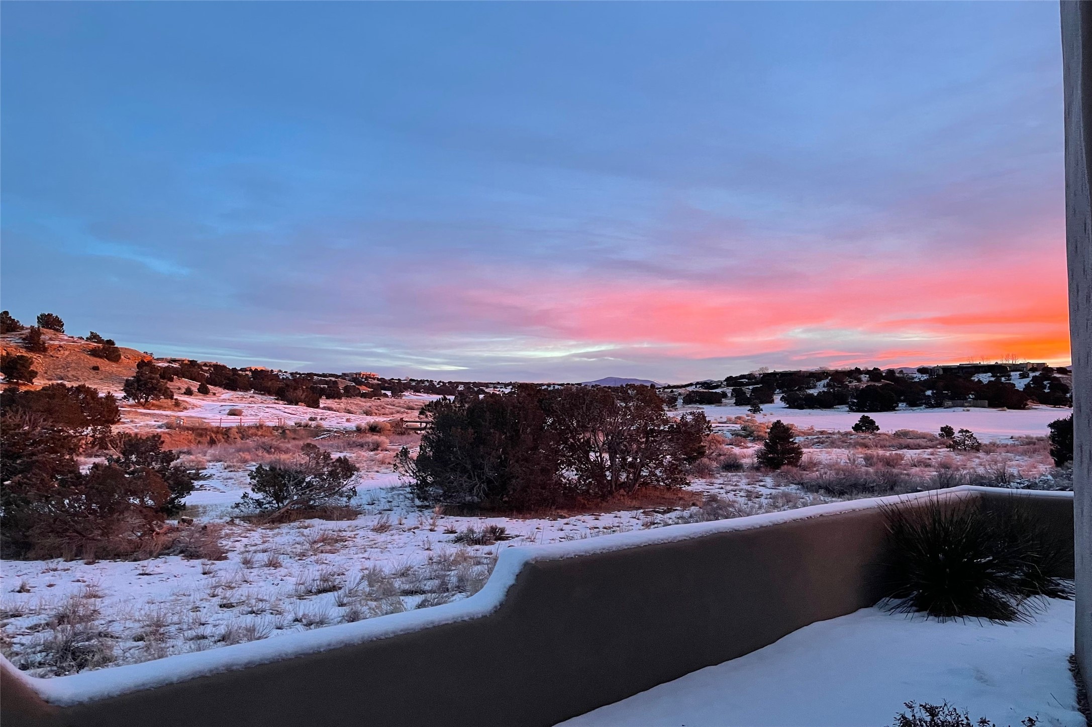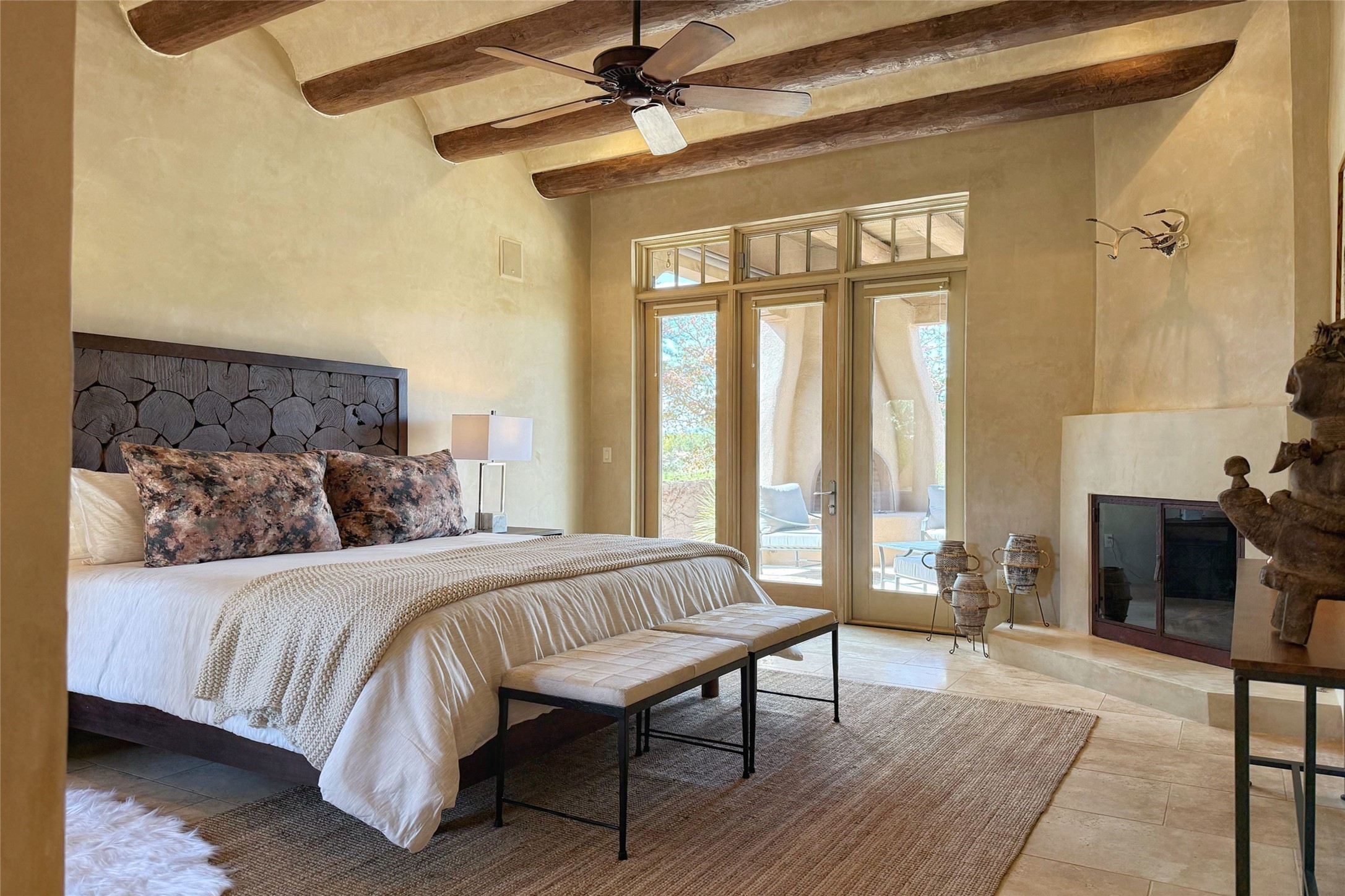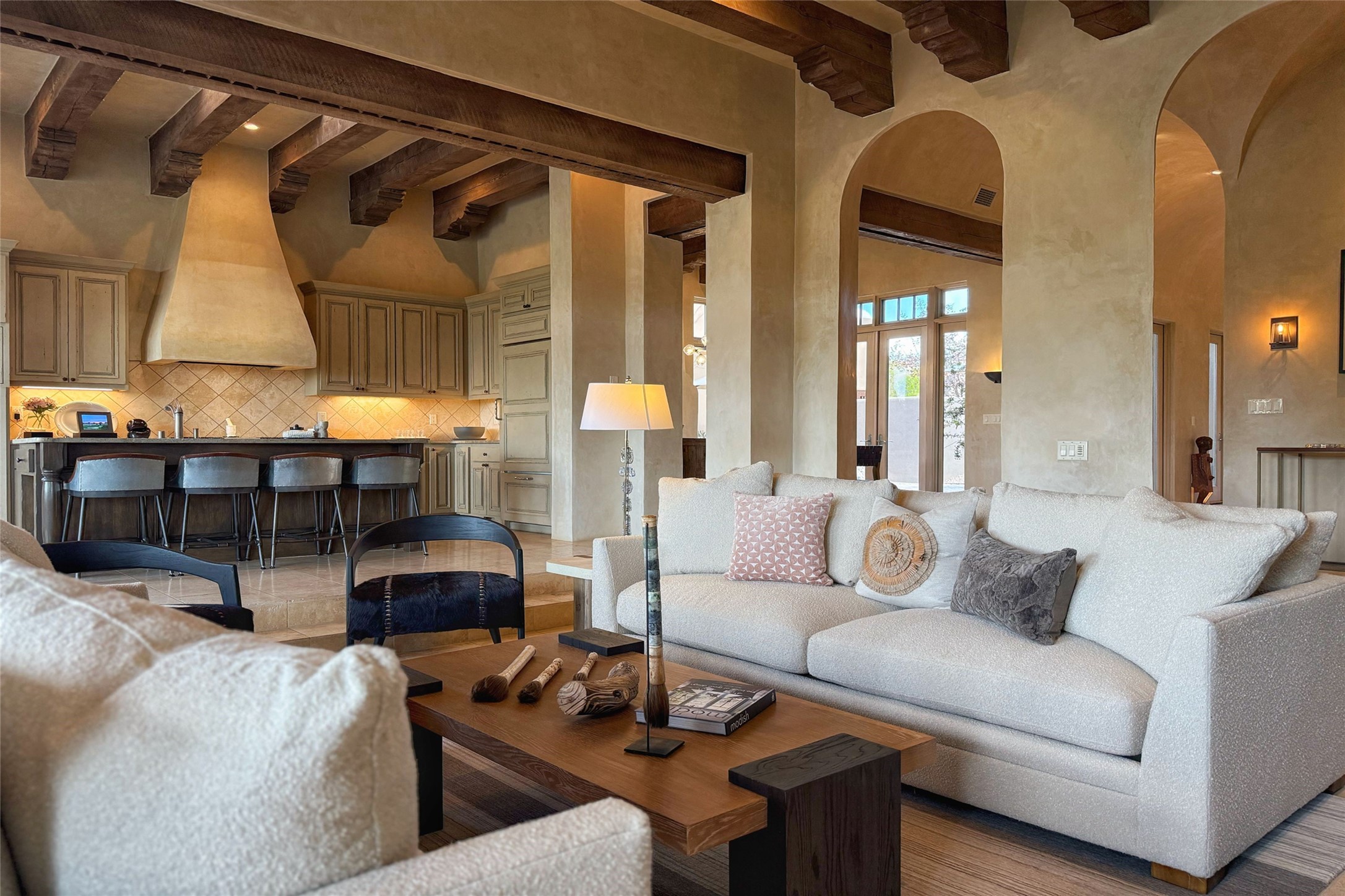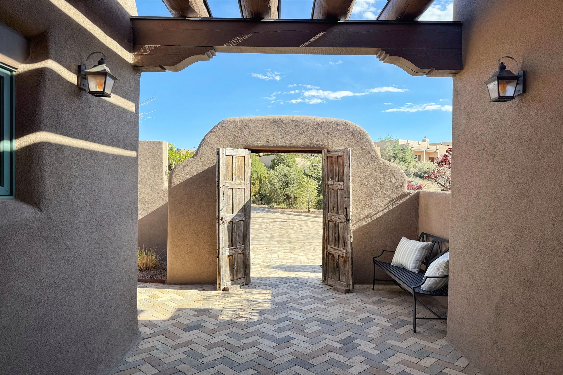 A superb location, this Las Campanas villa home provides majestic panoramic views of the Jack Nicklaus sunset golf course and Jemez / Sangre de Cristo mountain ranges. Surrounded by large open space owned by The Club at Las Campanas, affording excellent privacy. European-inspired architecture and finishes create an opulent, yet relaxed environment. Enjoy golf course views at a comfortable distance. The home sits at the end of a cul-de-sac, providing extra privacy and tranquility and ample guest parking. This home won the Parade of Homes awards for Best Floor Plan and Best Outdoor Space and features a grand arched entryway with floor lights and large Restoration Hardware mirrors to reflect the outdoors. The builder spared no expense on architectural detail and finishes: soaring 14 ft cathedral ceilings, wall wash skylights, travertine floors, handsome carved grand fireplace with custom glass doors, diamond plaster walls, granite countertops, Sub-Zero refrigerator, Wolf oven/stove, and six indoor/ two outdoor gas and wood-burning fireplaces. A sheltered interior courtyard brings the outdoors in. Choose the formal dining room that opens to the lovely courtyard or the casual eat-in nook with views. The primary bedroom suite has direct entrance to the outdoor portal overlooking the golf course and is separated from the guest bedrooms at the opposite wing of the home. Luxurious primary spa bath accesses a private enclosed side portal. Garage has large built-in cabinets for plenty of additional storage. Upgraded to entire smart home capability with high end indoor/outdoor Sonos sound system. Restoration Hardware mirrors and select indoor and all outdoor furniture pieces, as well as custom handcrafted TV cabinet and Murphy bed are included. New stucco, new roof, and tankless water heater with additional high capacity tank. Las Campanas golf membership available for purchase, subject to approval. With outstanding location, views and design, this home is truly captivating.