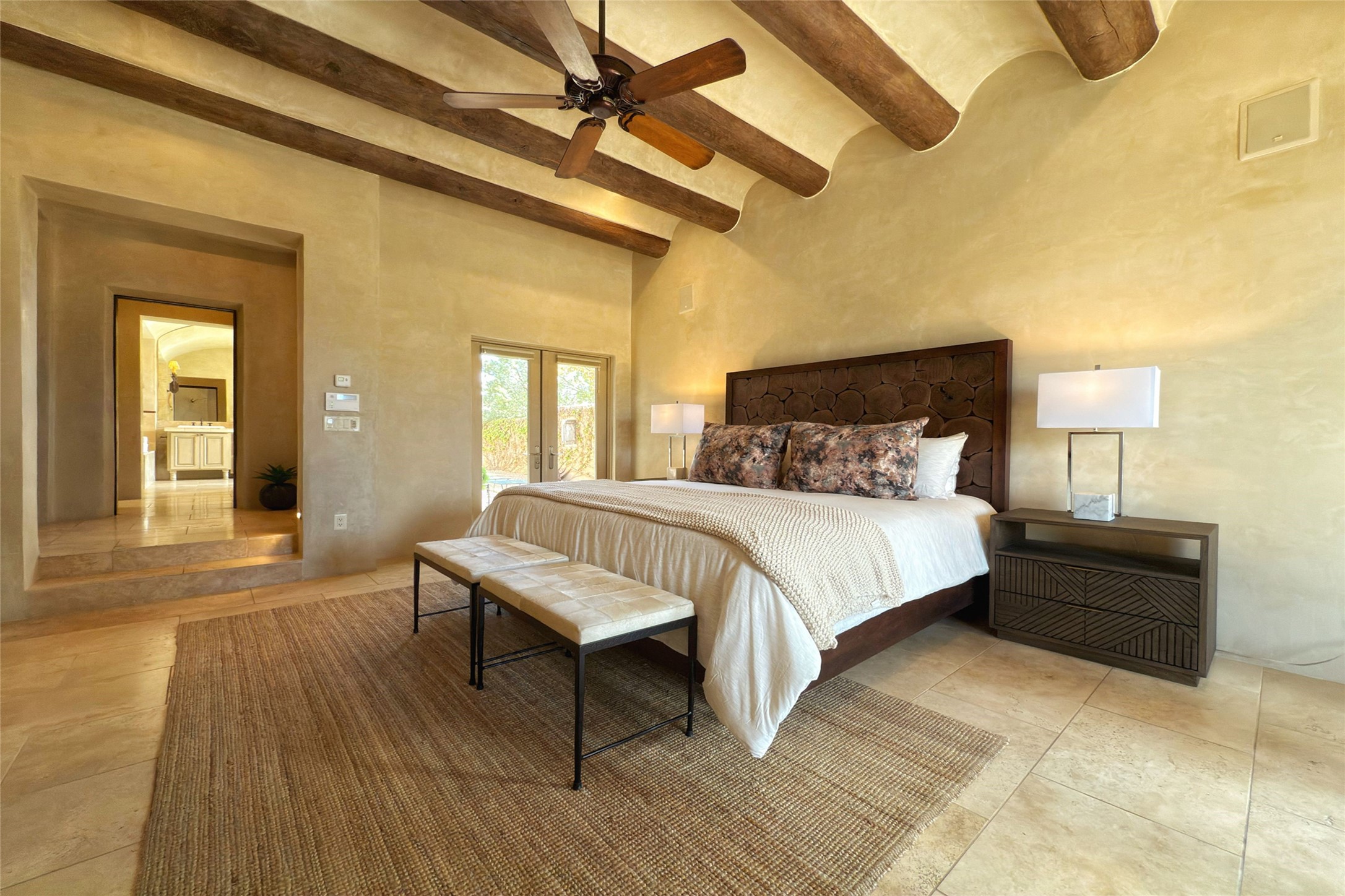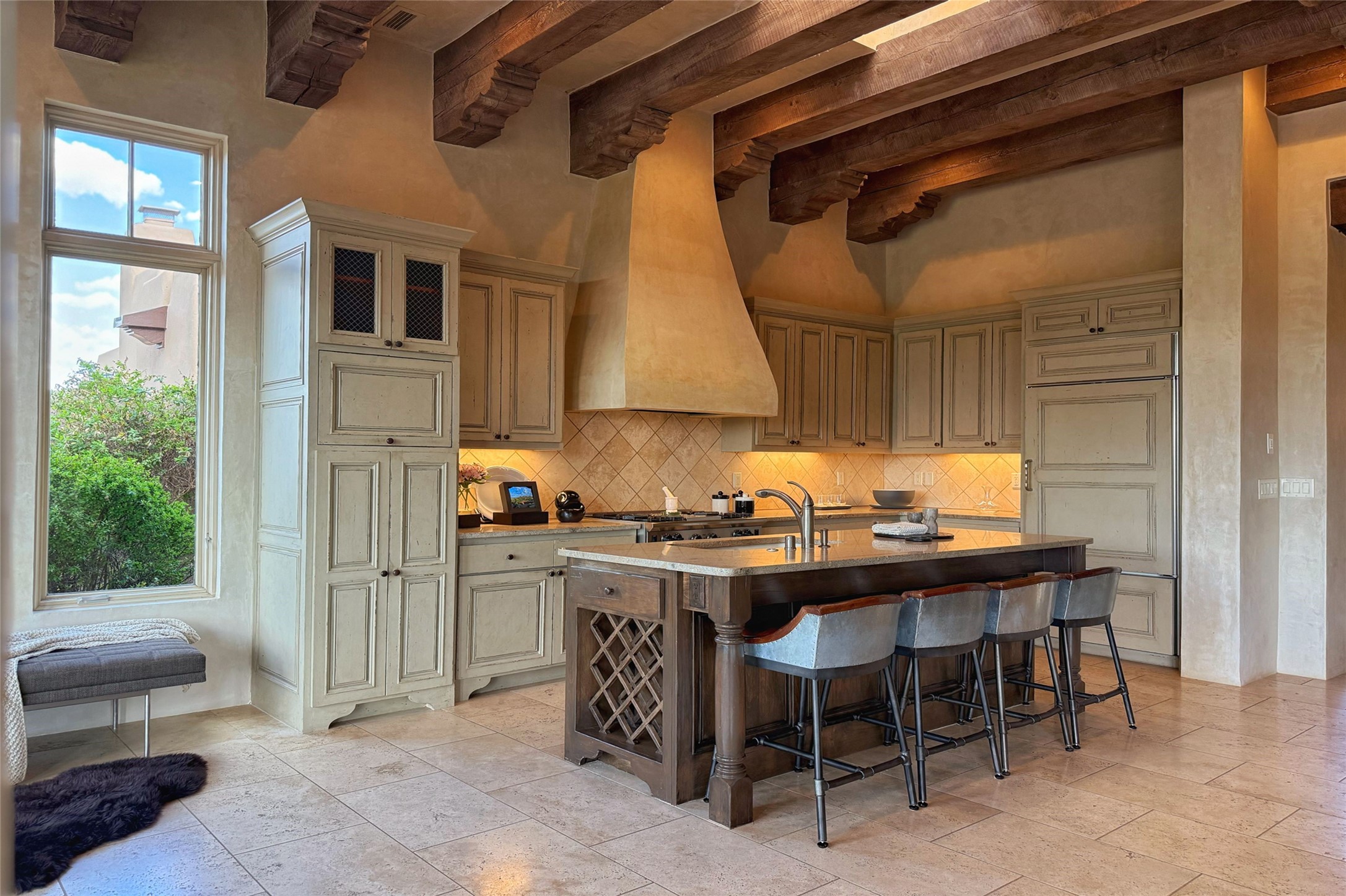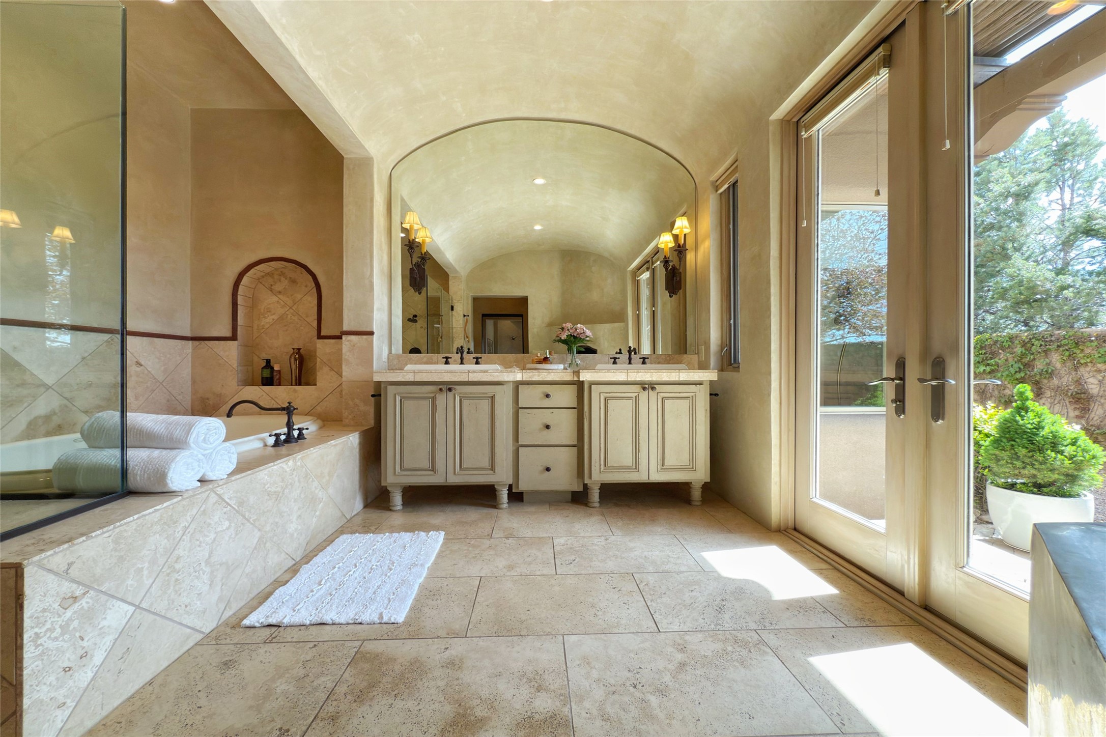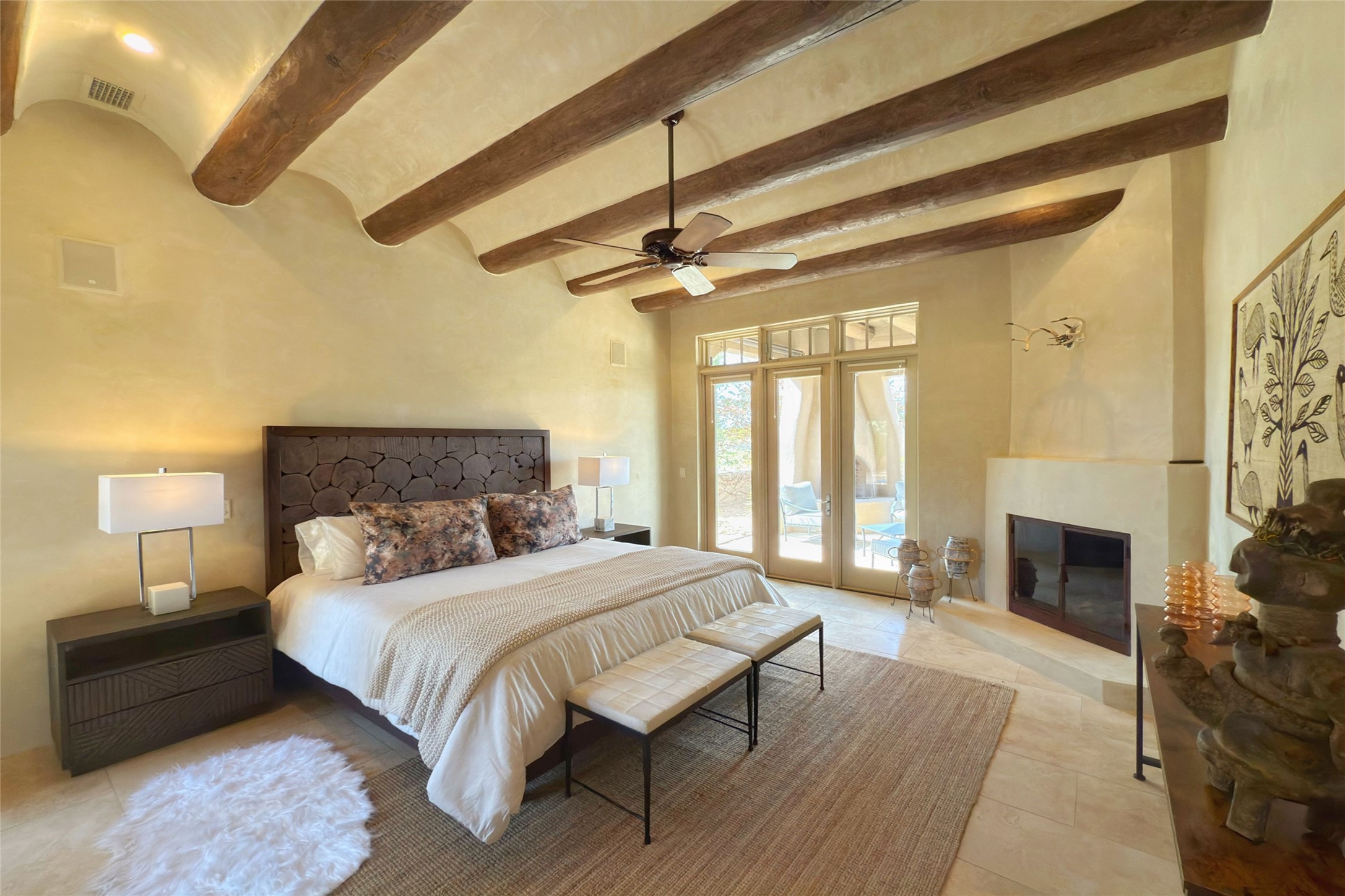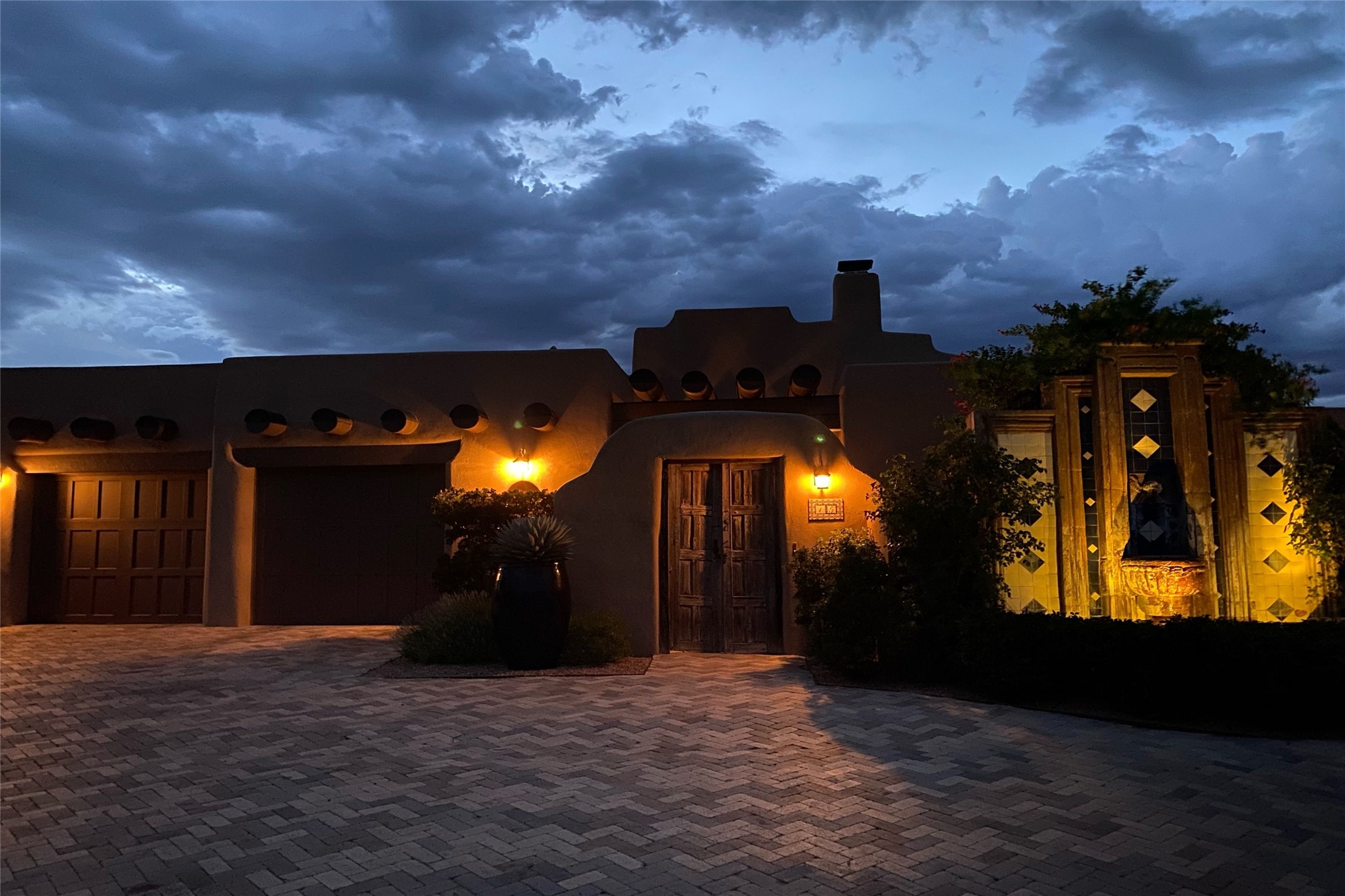A superb location, this Las Campanas villa home provides majestic panoramic views of the Jack Nicklaus sunset golf course and Jemez / Sangre de Cristo mountain ranges. Surrounded by large open space owned by The Club at Las Campanas, affording excellent privacy. European-inspired architecture and finishes create an opulent, yet relaxed environment. Enjoy golf course views at a comfortable distance. The home sits at the end of a cul-de-sac, providing extra privacy and tranquility and ample guest parking. This home won the Parade of Homes awards for Best Floor Plan and Best Outdoor Space and features a grand arched entryway with floor lights and large Restoration Hardware mirrors to reflect the outdoors. The builder spared no expense on architectural detail and finishes: soaring 14 ft cathedral ceilings, wall wash skylights, travertine floors, handsome carved grand fireplace with custom glass doors, diamond plaster walls, granite countertops, Sub-Zero refrigerator, Wolf oven/stove, and six indoor/ two outdoor gas and wood-burning fireplaces. A sheltered interior courtyard brings the outdoors in. Choose the formal dining room that opens to the lovely courtyard or the casual eat-in nook with views. The primary bedroom suite has direct entrance to the outdoor portal overlooking the golf course and is separated from the guest bedrooms at the opposite wing of the home. Luxurious primary spa bath accesses a private enclosed side portal. Garage has large built-in cabinets for plenty of additional storage. Upgraded to entire smart home capability with high end indoor/outdoor Sonos sound system. Restoration Hardware mirrors and select indoor and all outdoor furniture pieces, as well as custom handcrafted TV cabinet and Murphy bed are included. New stucco, new roof, and tankless water heater with additional high capacity tank. Las Campanas golf membership available for purchase, subject to approval. With outstanding location, views and design, this home is truly captivating.