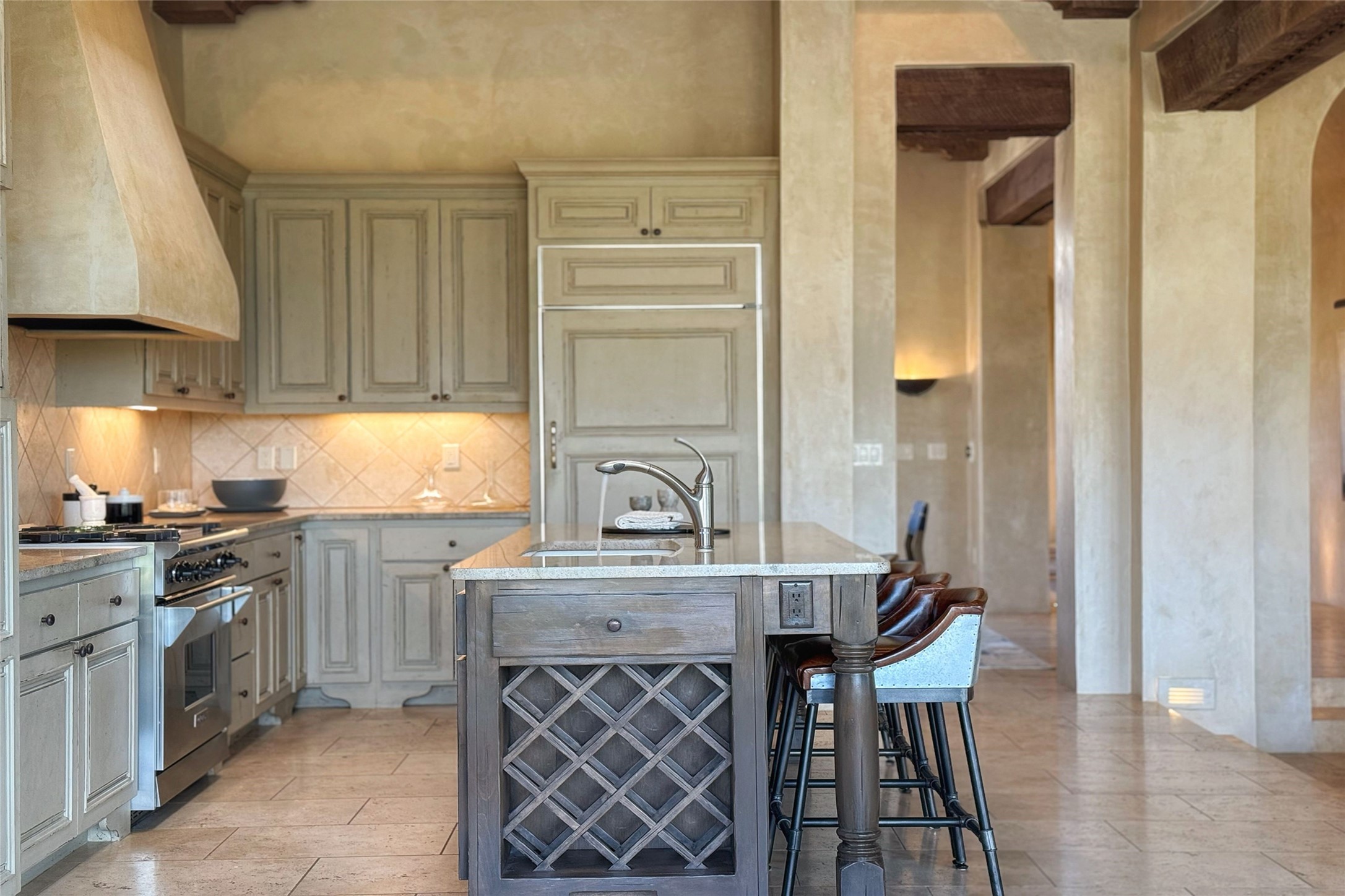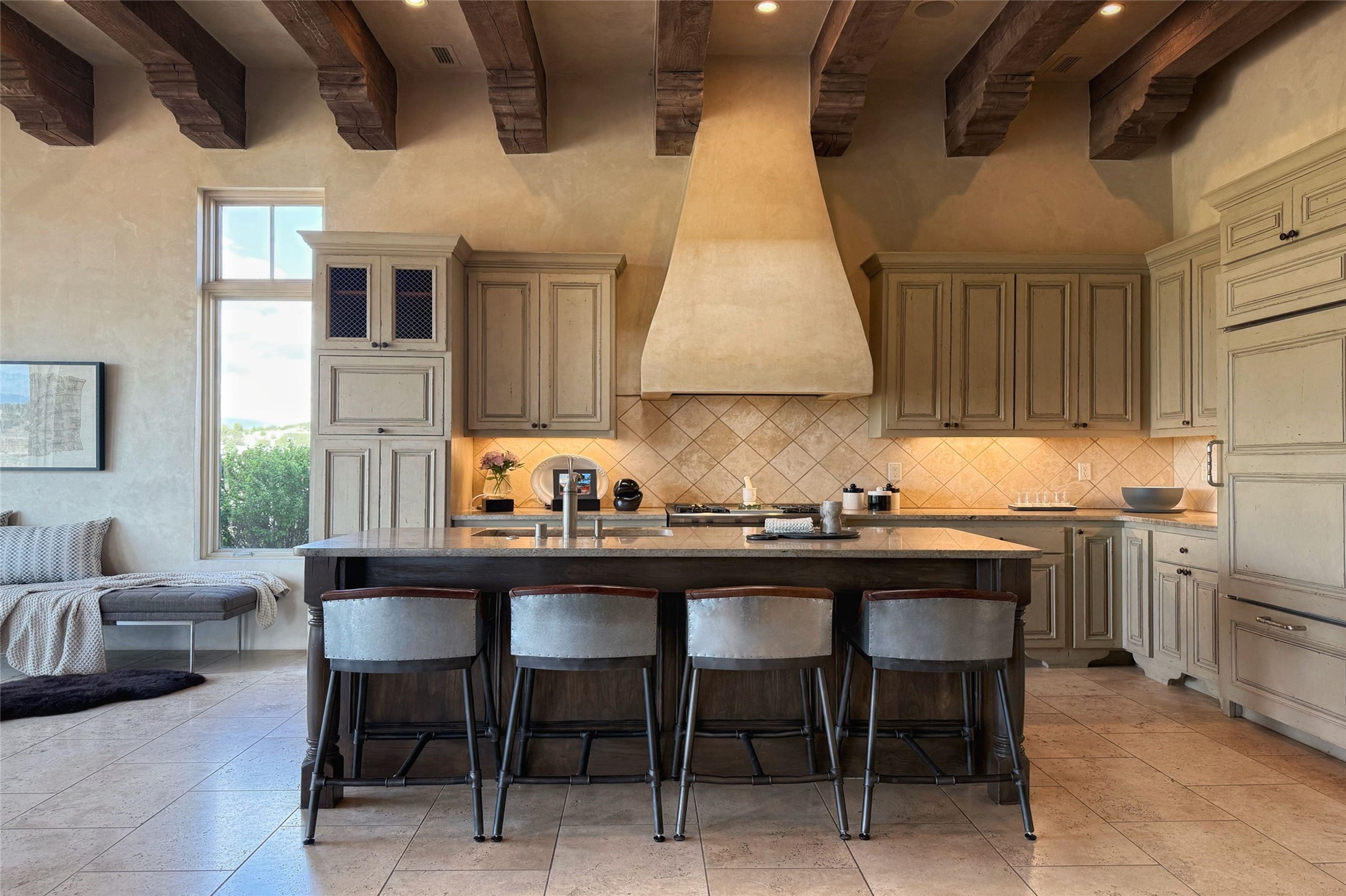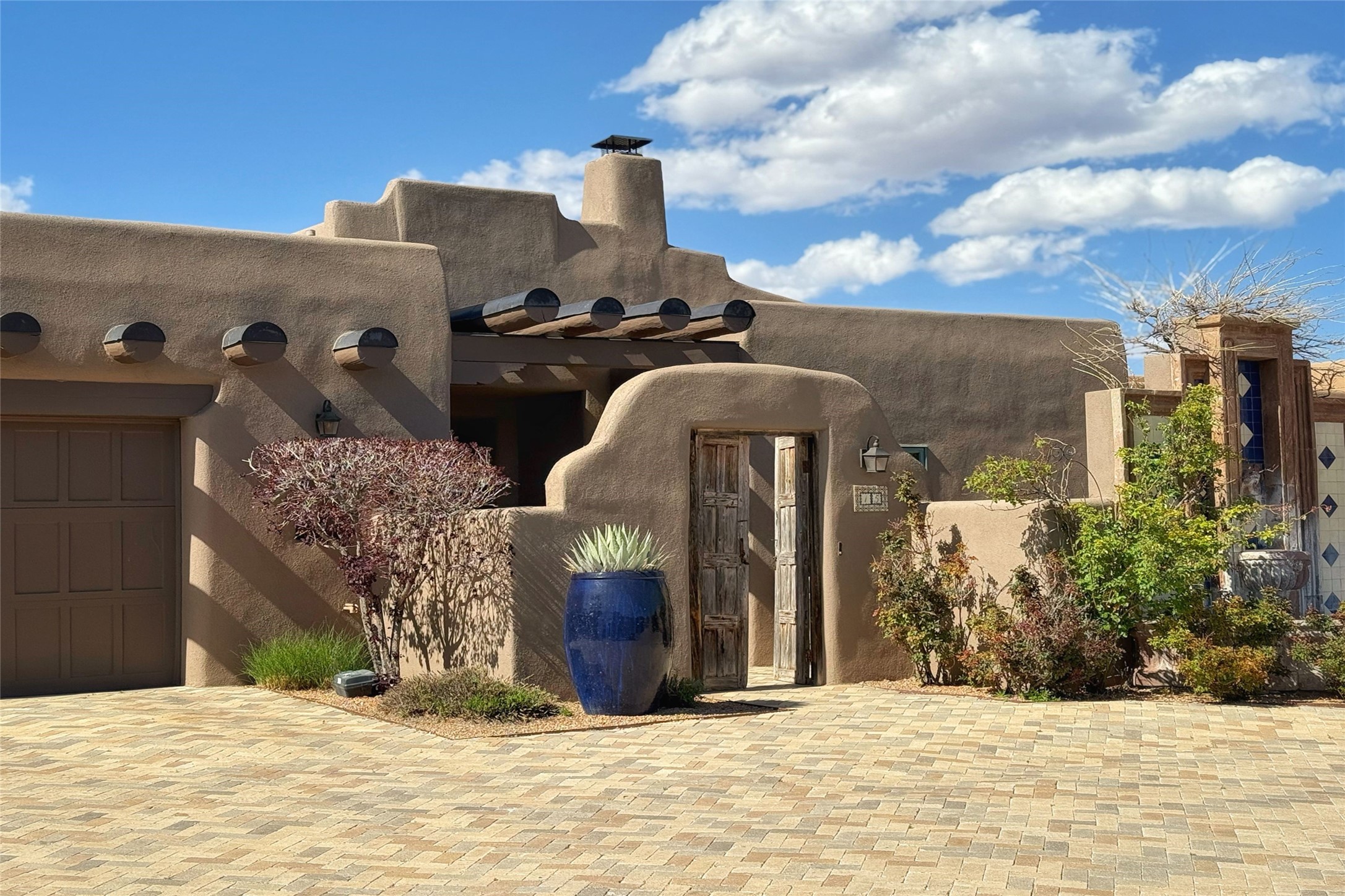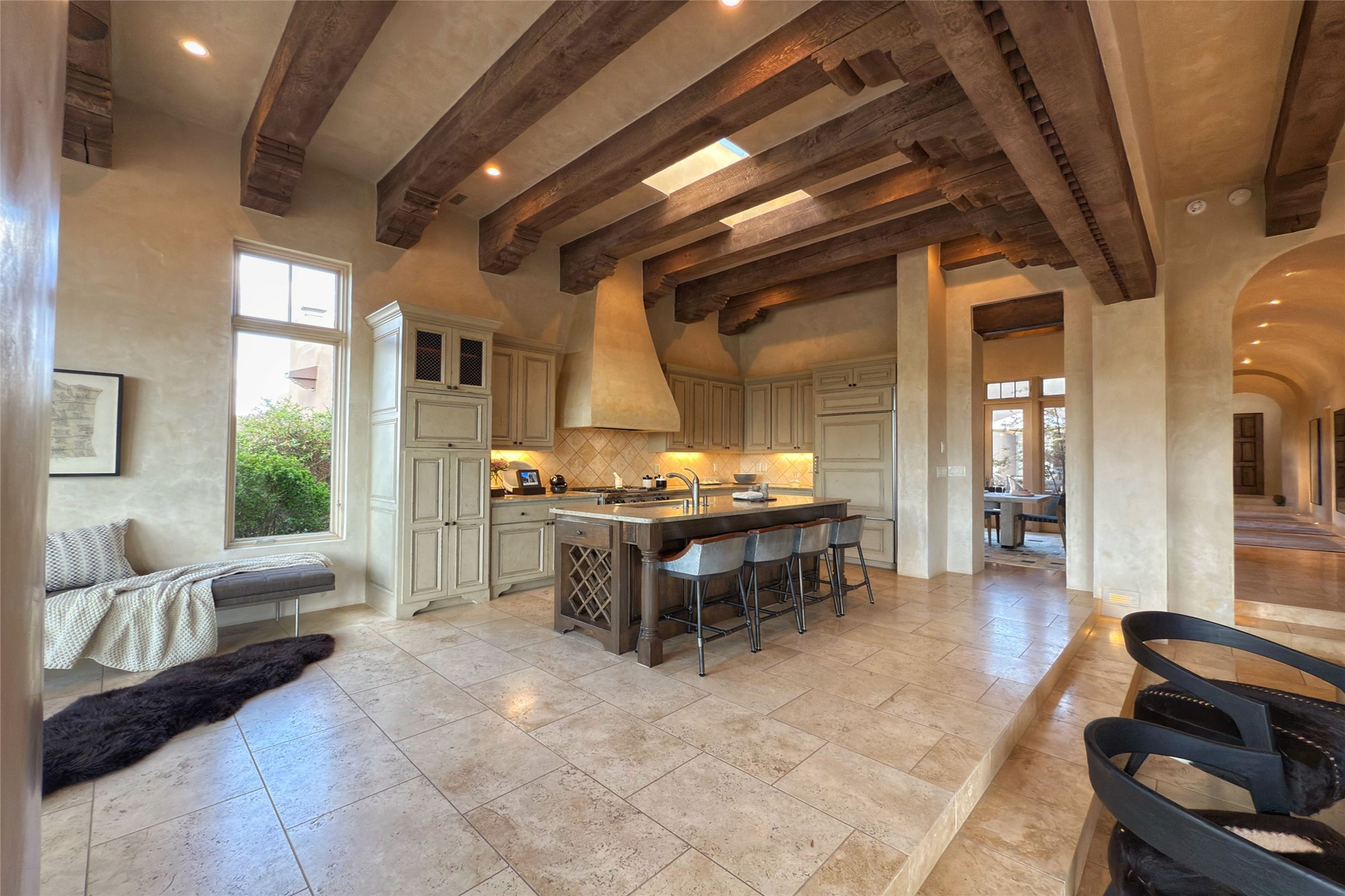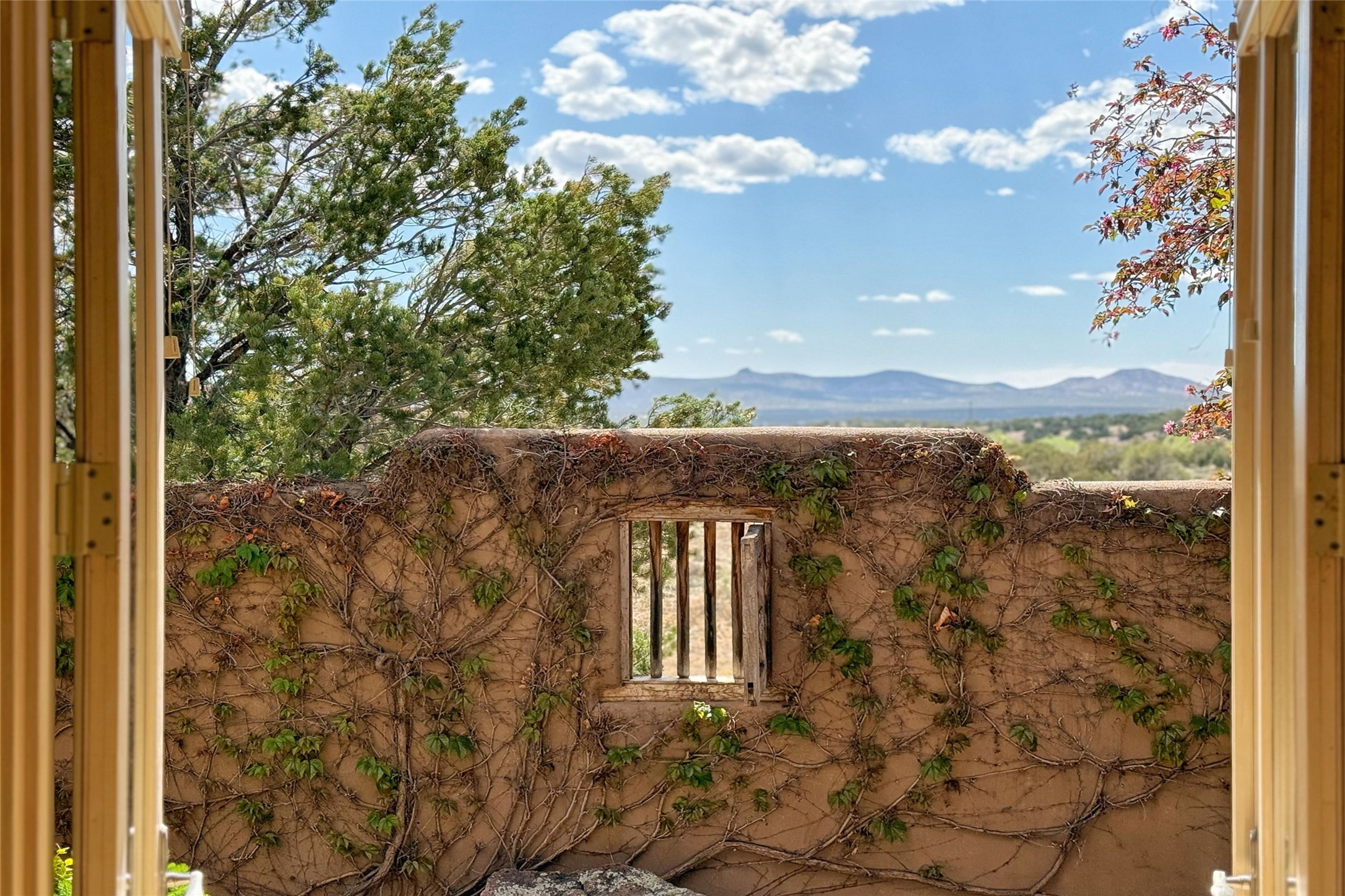 A superb location, this Las Campanas villa home provides majestic panoramic views of the Jack Nicklaus sunset golf course and Jemez / Sangre de Cristo mountain ranges. Surrounded by large open space owned by The Club at Las Campanas, affording excellent privacy. European-inspired architecture and finishes create an opulent, yet relaxed environment. Enjoy golf course views at a comfortable distance. The home sits at the end of a cul-de-sac, providing extra privacy and tranquility and ample guest parking. This home won the Parade of Homes awards for Best Floor Plan and Best Outdoor Space and features a grand arched entryway with floor lights and large Restoration Hardware mirrors to reflect the outdoors. The builder spared no expense on architectural detail and finishes: soaring 14 ft cathedral ceilings, wall wash skylights, travertine floors, handsome carved grand fireplace with custom glass doors, diamond plaster walls, granite countertops, Sub-Zero refrigerator, Wolf oven/stove, and six indoor/ two outdoor gas and wood-burning fireplaces. A sheltered interior courtyard brings the outdoors in. Choose the formal dining room that opens to the lovely courtyard or the casual eat-in nook with views. The primary bedroom suite has direct entrance to the outdoor portal overlooking the golf course and is separated from the guest bedrooms at the opposite wing of the home. Luxurious primary spa bath accesses a private enclosed side portal. Garage has large built-in cabinets for plenty of additional storage. Upgraded to entire smart home capability with high end indoor/outdoor Sonos sound system. Restoration Hardware mirrors and select indoor and all outdoor furniture pieces, as well as custom handcrafted TV cabinet and Murphy bed are included. New stucco, new roof, and tankless water heater with additional high capacity tank. Las Campanas golf membership available for purchase, subject to approval. With outstanding location, views and design, this home is truly captivating.