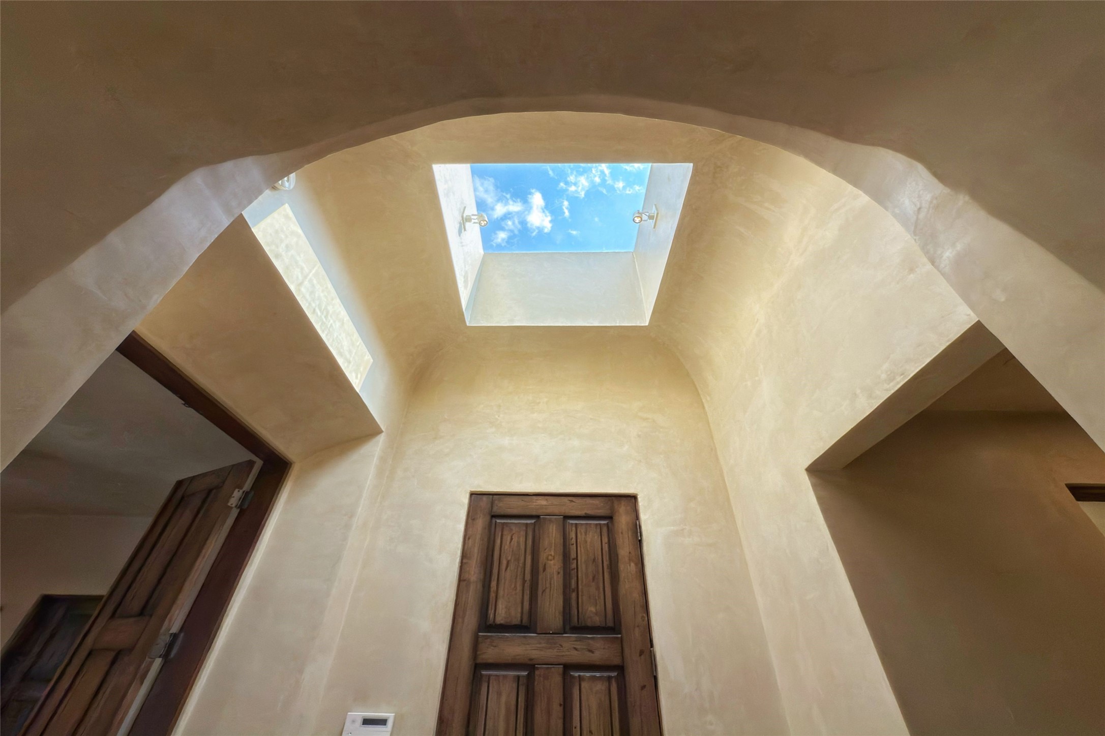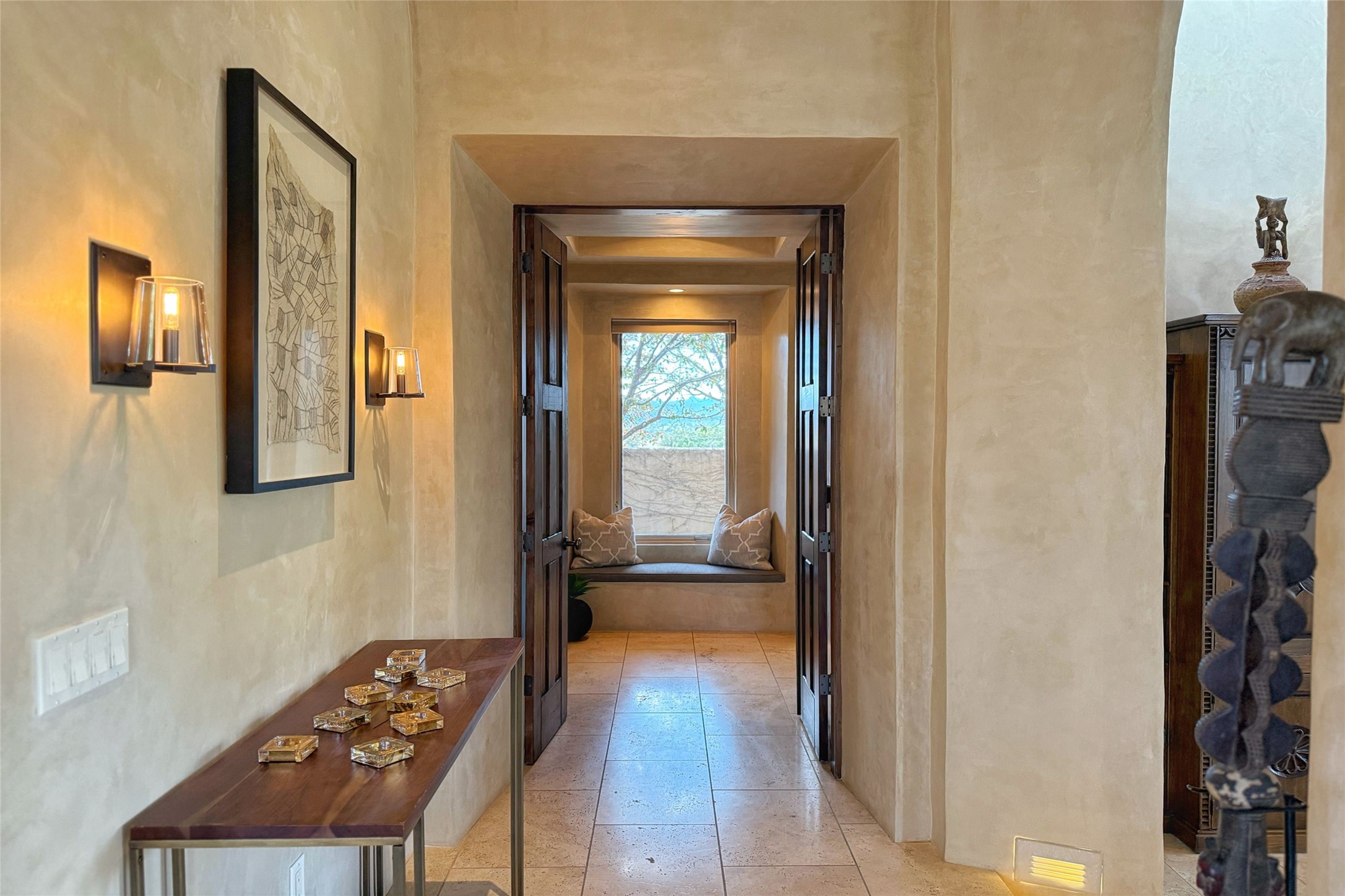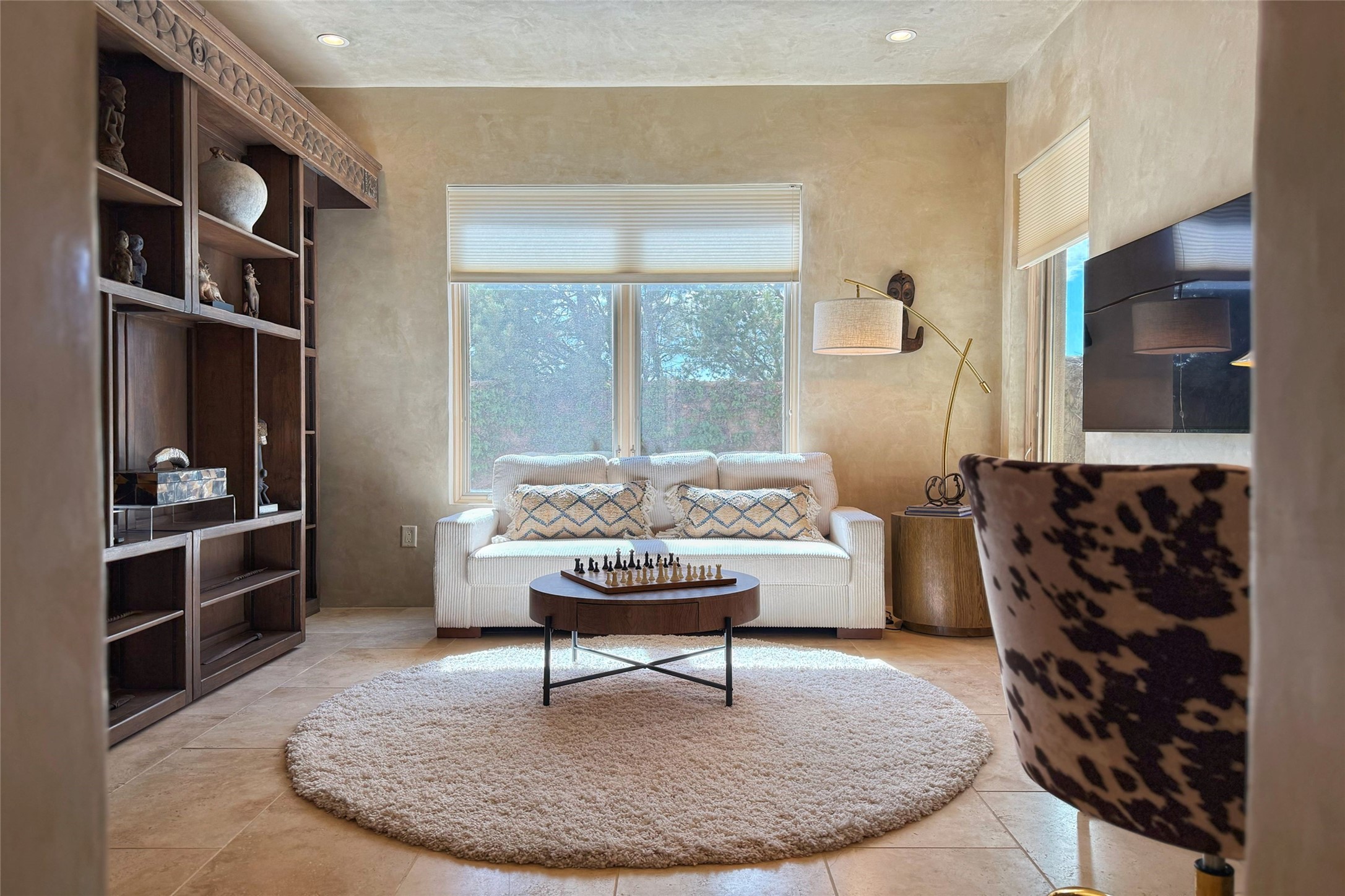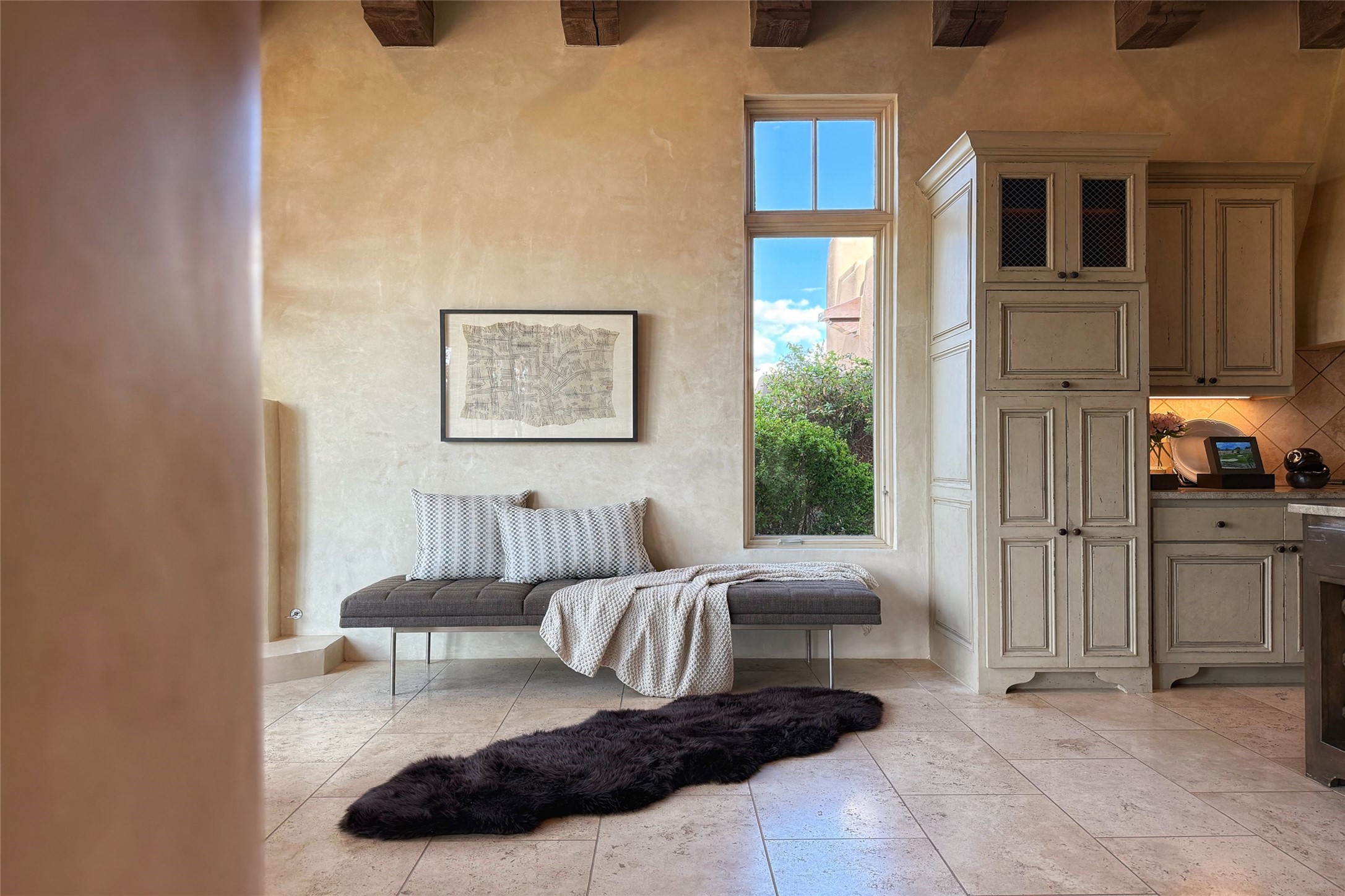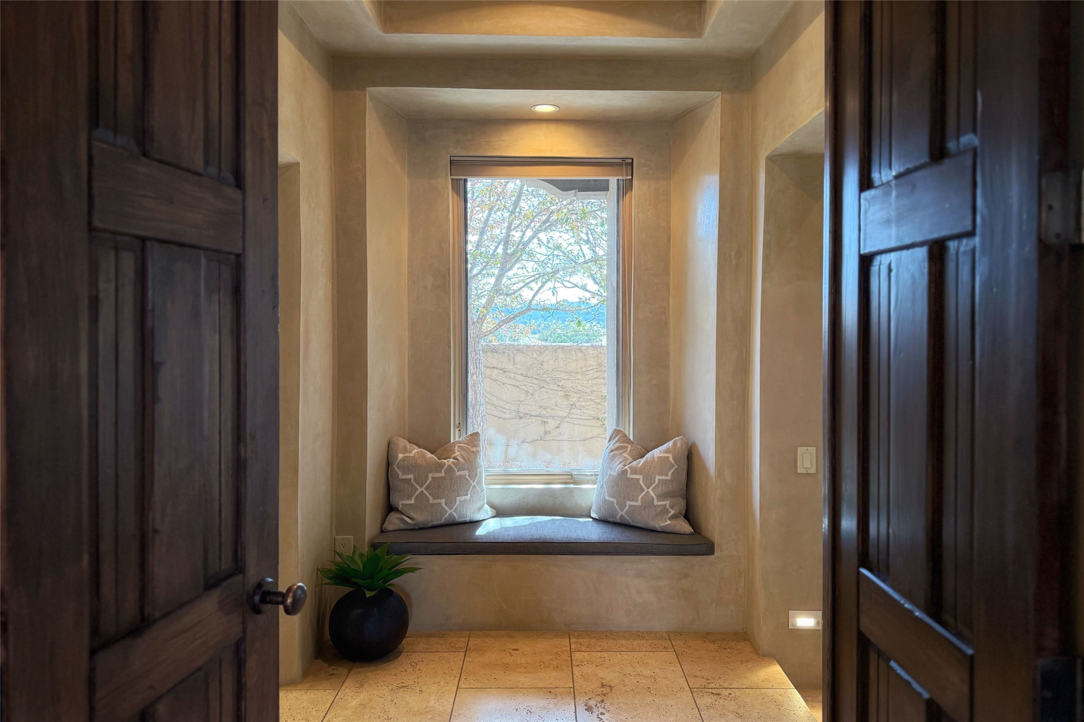 A superb location, this Las Campanas villa home provides majestic panoramic views of the Jack Nicklaus sunset golf course and Jemez / Sangre de Cristo mountain ranges. Surrounded by large open space owned by The Club at Las Campanas, affording excellent privacy. European-inspired architecture and finishes create an opulent, yet relaxed environment. Enjoy golf course views at a comfortable distance. The home sits at the end of a cul-de-sac, providing extra privacy and tranquility and ample guest parking. This home won the Parade of Homes awards for Best Floor Plan and Best Outdoor Space and features a grand arched entryway with floor lights and large Restoration Hardware mirrors to reflect the outdoors. The builder spared no expense on architectural detail and finishes: soaring 14 ft cathedral ceilings, wall wash skylights, travertine floors, handsome carved grand fireplace with custom glass doors, diamond plaster walls, granite countertops, Sub-Zero refrigerator, Wolf oven/stove, and six indoor/ two outdoor gas and wood-burning fireplaces. A sheltered interior courtyard brings the outdoors in. Choose the formal dining room that opens to the lovely courtyard or the casual eat-in nook with views. The primary bedroom suite has direct entrance to the outdoor portal overlooking the golf course and is separated from the guest bedrooms at the opposite wing of the home. Luxurious primary spa bath accesses a private enclosed side portal. Garage has large built-in cabinets for plenty of additional storage. Upgraded to entire smart home capability with high end indoor/outdoor Sonos sound system. Restoration Hardware mirrors and select indoor and all outdoor furniture pieces, as well as custom handcrafted TV cabinet and Murphy bed are included. New stucco, new roof, and tankless water heater with additional high capacity tank. Las Campanas golf membership available for purchase, subject to approval. With outstanding location, views and design, this home is truly captivating.