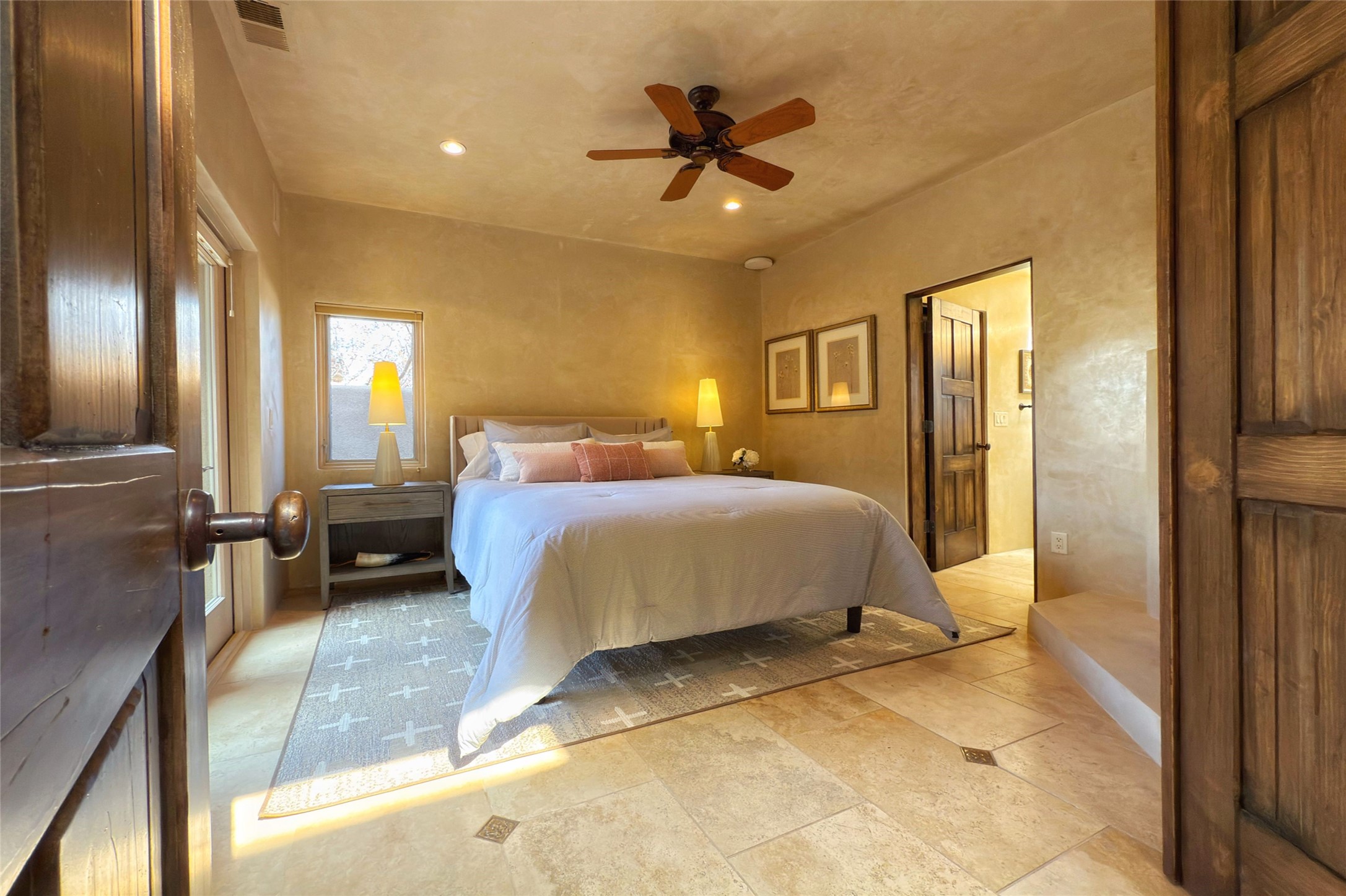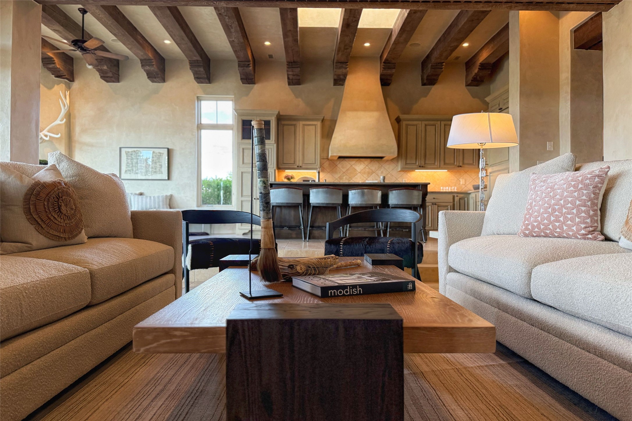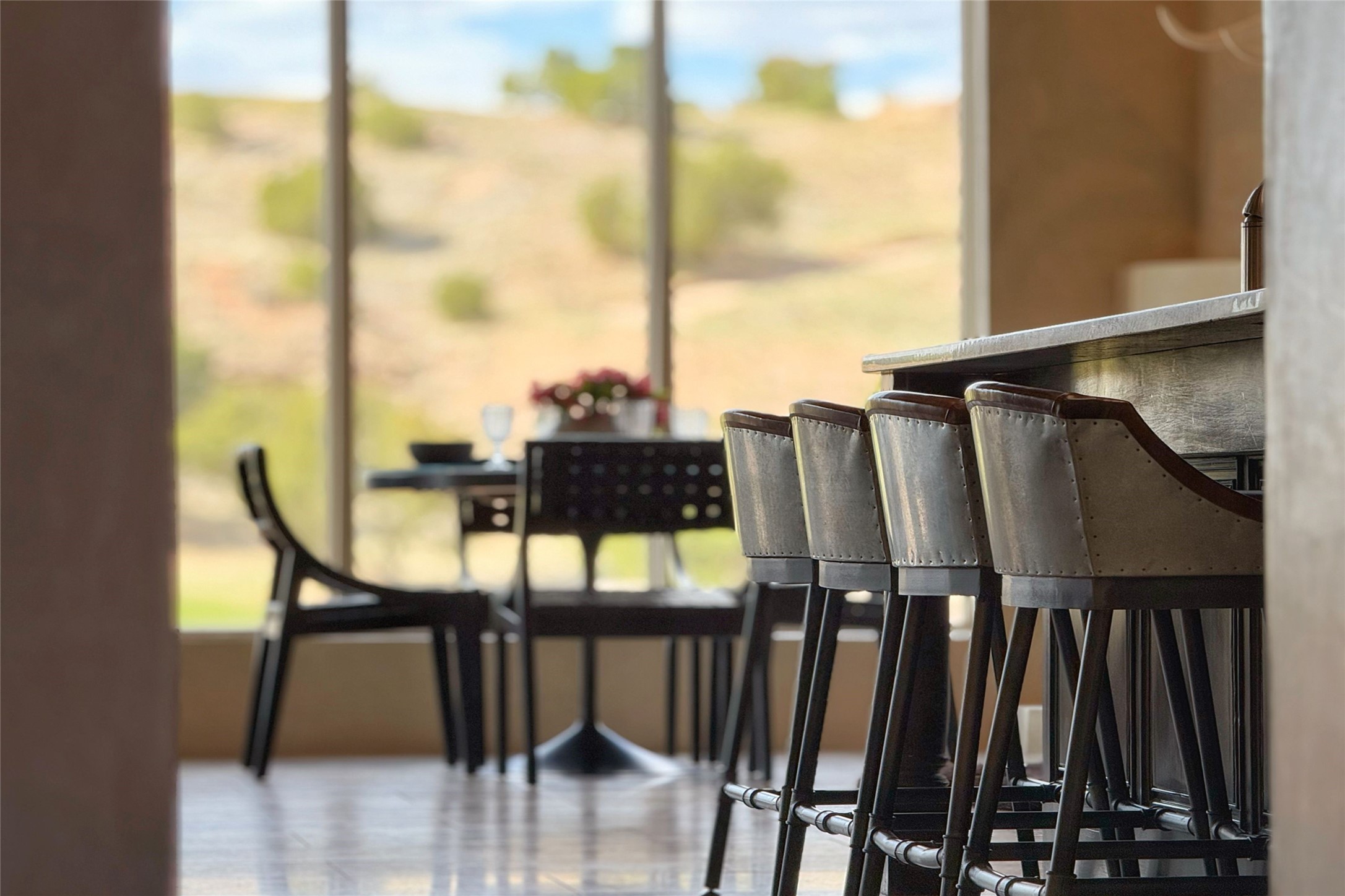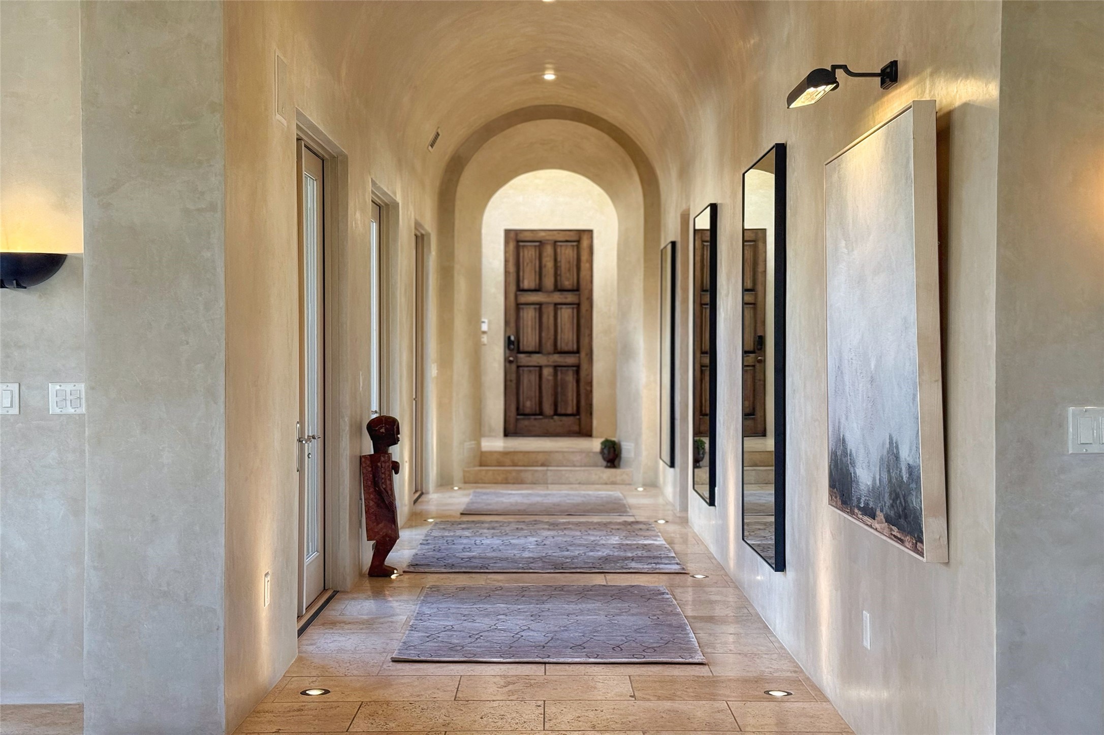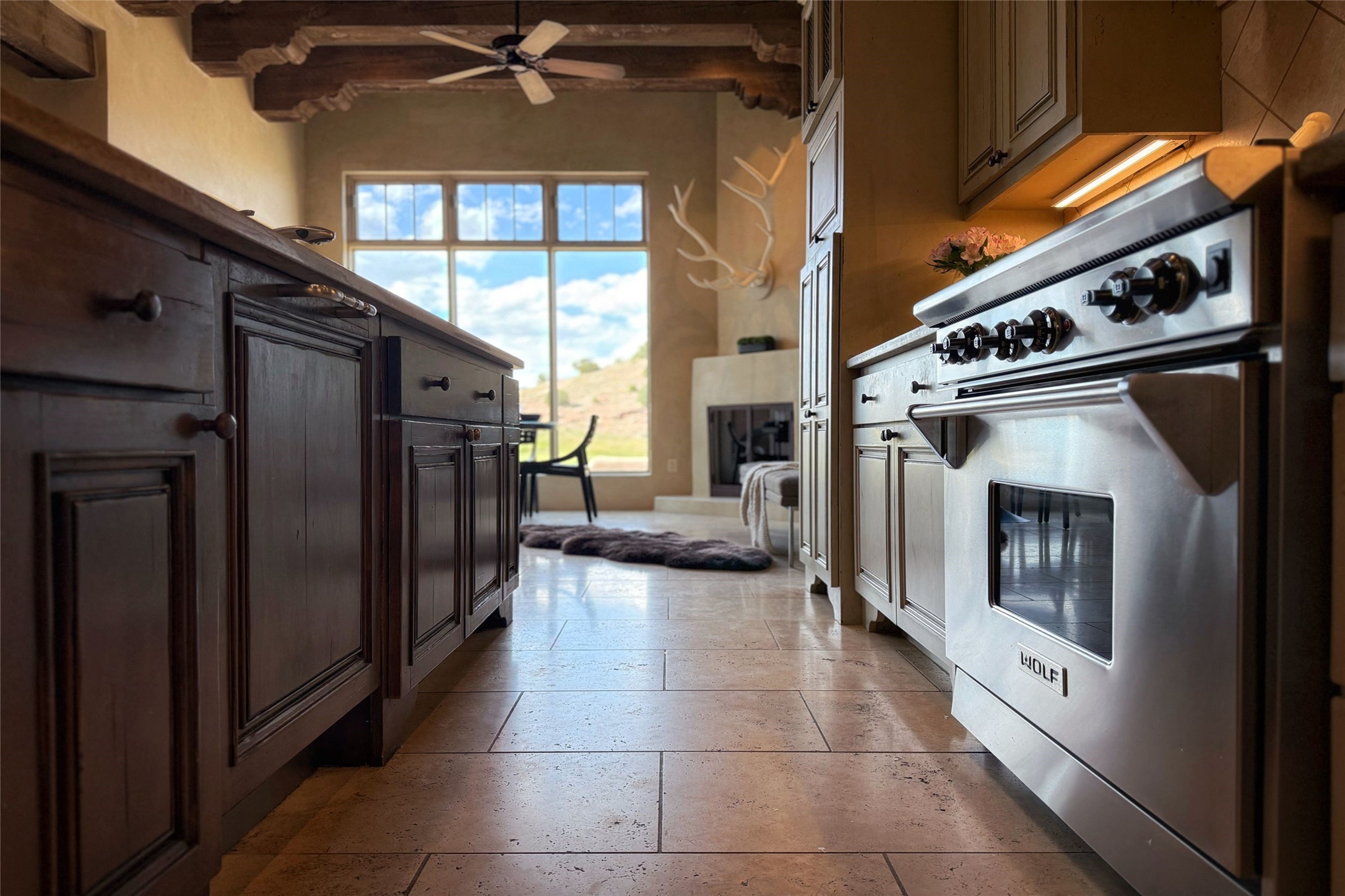 A superb location, this Las Campanas villa home provides majestic panoramic views of the Jack Nicklaus sunset golf course and Jemez / Sangre de Cristo mountain ranges. Surrounded by large open space owned by The Club at Las Campanas, affording excellent privacy. European-inspired architecture and finishes create an opulent, yet relaxed environment. Enjoy golf course views at a comfortable distance. The home sits at the end of a cul-de-sac, providing extra privacy and tranquility and ample guest parking. This home won the Parade of Homes awards for Best Floor Plan and Best Outdoor Space and features a grand arched entryway with floor lights and large Restoration Hardware mirrors to reflect the outdoors. The builder spared no expense on architectural detail and finishes: soaring 14 ft cathedral ceilings, wall wash skylights, travertine floors, handsome carved grand fireplace with custom glass doors, diamond plaster walls, granite countertops, Sub-Zero refrigerator, Wolf oven/stove, and six indoor/ two outdoor gas and wood-burning fireplaces. A sheltered interior courtyard brings the outdoors in. Choose the formal dining room that opens to the lovely courtyard or the casual eat-in nook with views. The primary bedroom suite has direct entrance to the outdoor portal overlooking the golf course and is separated from the guest bedrooms at the opposite wing of the home. Luxurious primary spa bath accesses a private enclosed side portal. Garage has large built-in cabinets for plenty of additional storage. Upgraded to entire smart home capability with high end indoor/outdoor Sonos sound system. Restoration Hardware mirrors and select indoor and all outdoor furniture pieces, as well as custom handcrafted TV cabinet and Murphy bed are included. New stucco, new roof, and tankless water heater with additional high capacity tank. Las Campanas golf membership available for purchase, subject to approval. With outstanding location, views and design, this home is truly captivating.