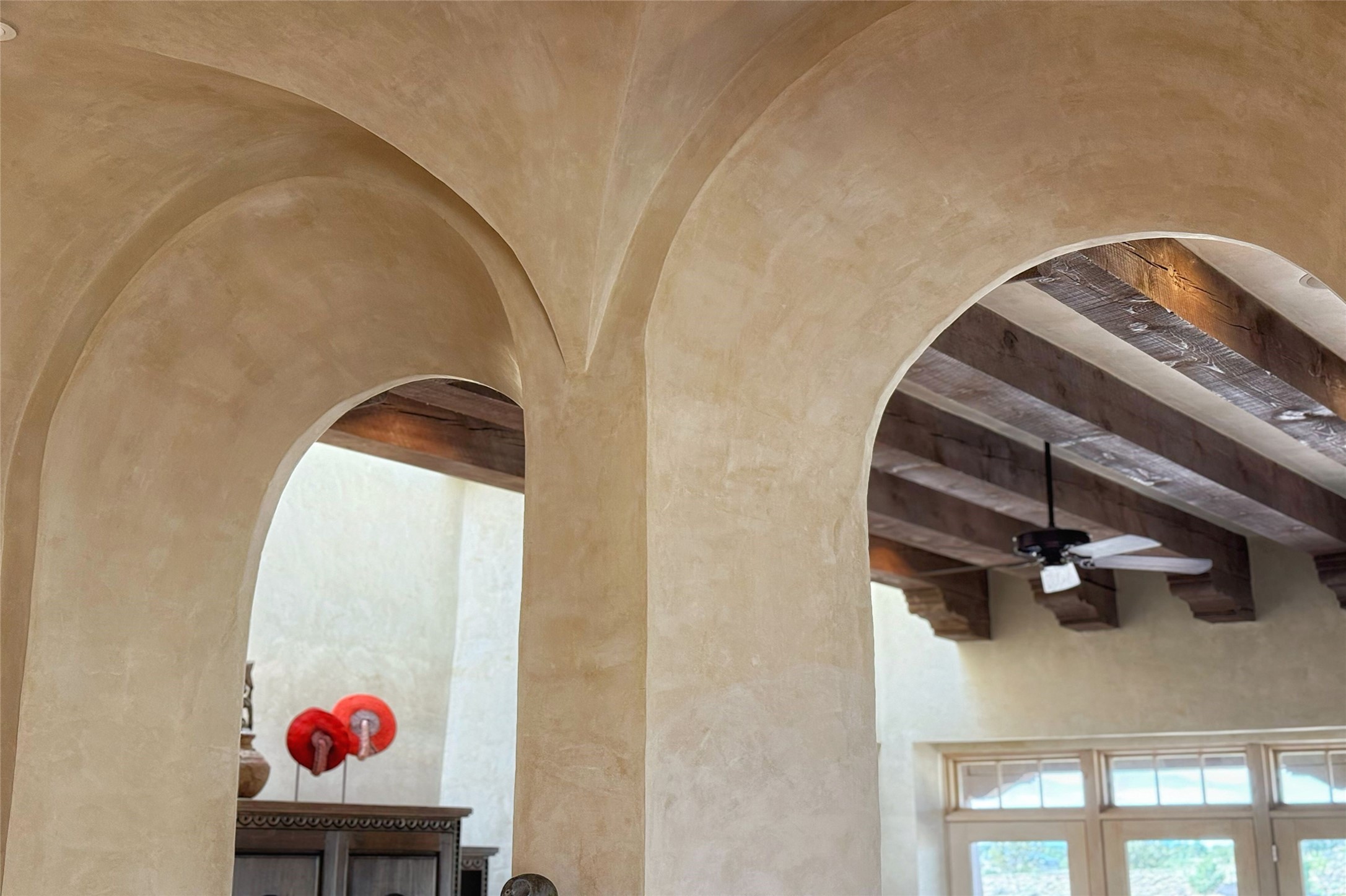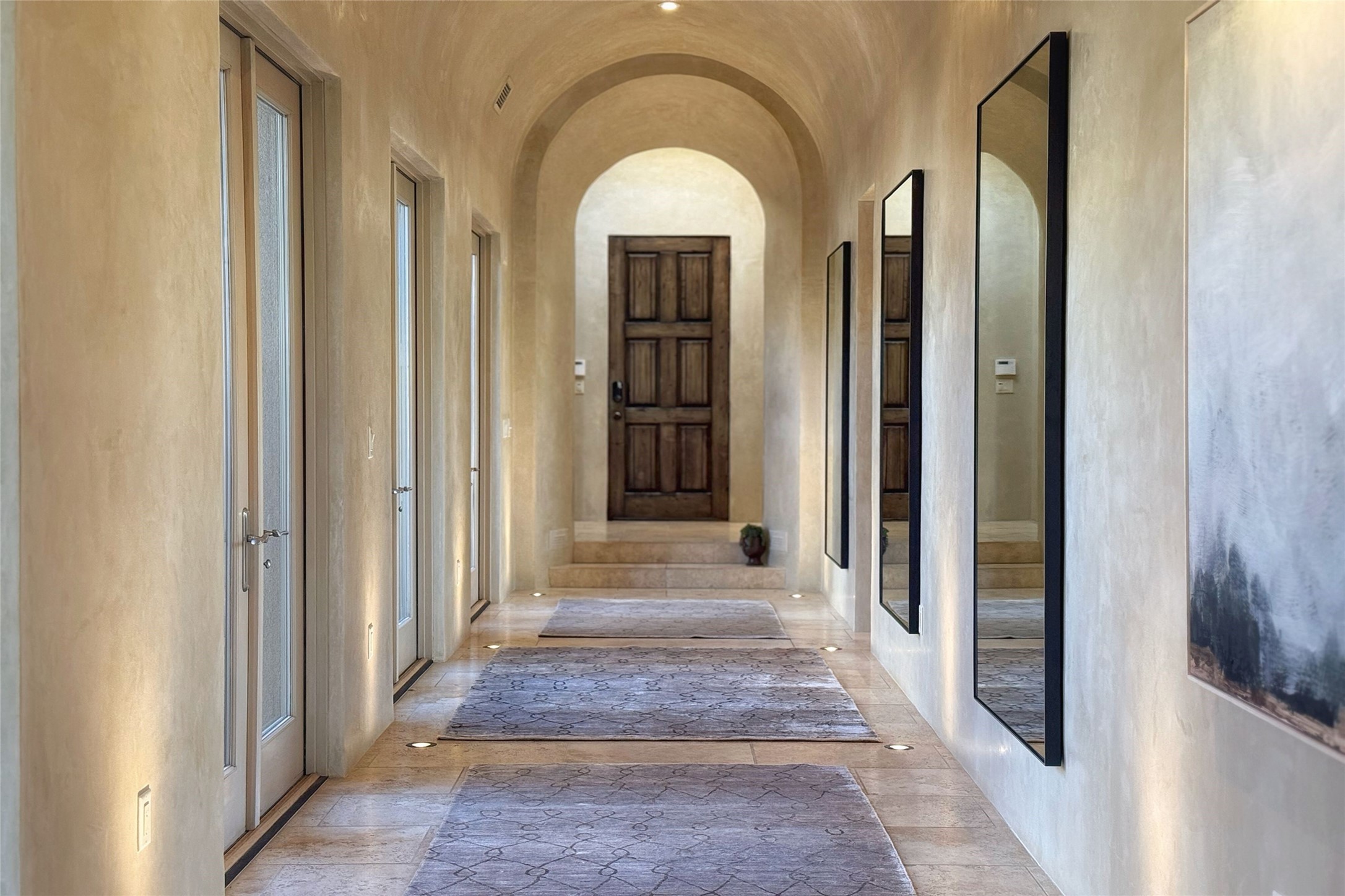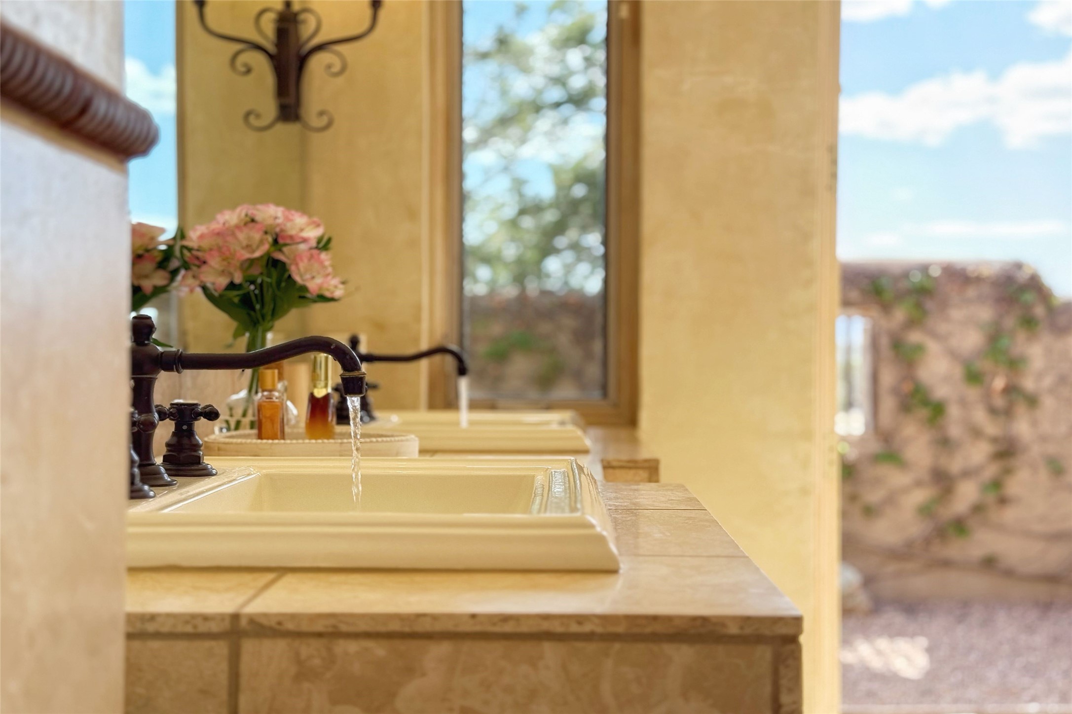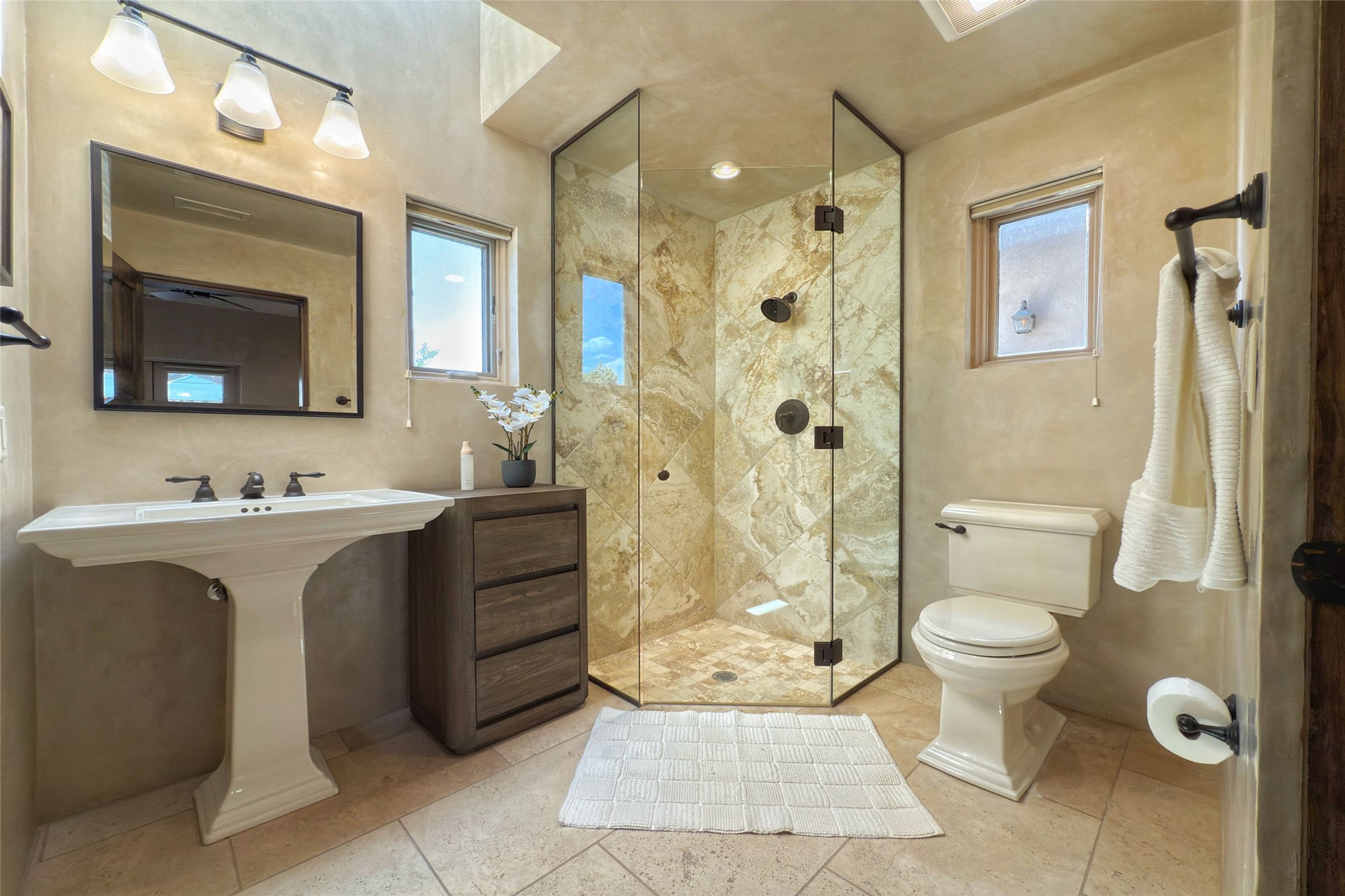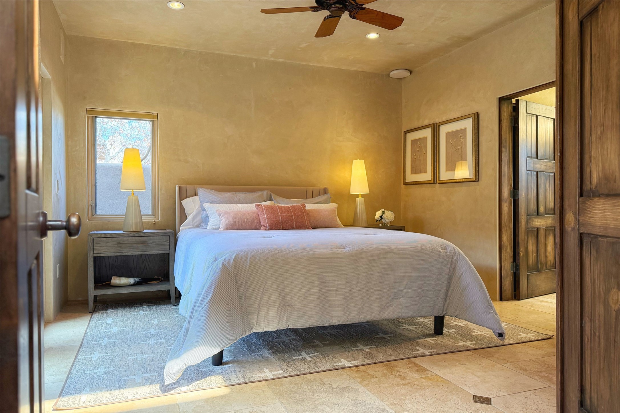 A superb location, this Las Campanas villa home provides majestic panoramic views of the Jack Nicklaus sunset golf course and Jemez / Sangre de Cristo mountain ranges. Surrounded by large open space owned by The Club at Las Campanas, affording excellent privacy. European-inspired architecture and finishes create an opulent, yet relaxed environment. Enjoy golf course views at a comfortable distance. The home sits at the end of a cul-de-sac, providing extra privacy and tranquility and ample guest parking. This home won the Parade of Homes awards for Best Floor Plan and Best Outdoor Space and features a grand arched entryway with floor lights and large Restoration Hardware mirrors to reflect the outdoors. The builder spared no expense on architectural detail and finishes: soaring 14 ft cathedral ceilings, wall wash skylights, travertine floors, handsome carved grand fireplace with custom glass doors, diamond plaster walls, granite countertops, Sub-Zero refrigerator, Wolf oven/stove, and six indoor/ two outdoor gas and wood-burning fireplaces. A sheltered interior courtyard brings the outdoors in. Choose the formal dining room that opens to the lovely courtyard or the casual eat-in nook with views. The primary bedroom suite has direct entrance to the outdoor portal overlooking the golf course and is separated from the guest bedrooms at the opposite wing of the home. Luxurious primary spa bath accesses a private enclosed side portal. Garage has large built-in cabinets for plenty of additional storage. Upgraded to entire smart home capability with high end indoor/outdoor Sonos sound system. Restoration Hardware mirrors and select indoor and all outdoor furniture pieces, as well as custom handcrafted TV cabinet and Murphy bed are included. New stucco, new roof, and tankless water heater with additional high capacity tank. Las Campanas golf membership available for purchase, subject to approval. With outstanding location, views and design, this home is truly captivating.