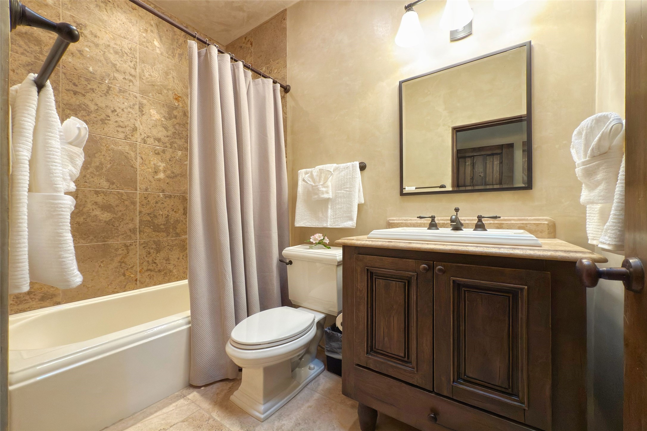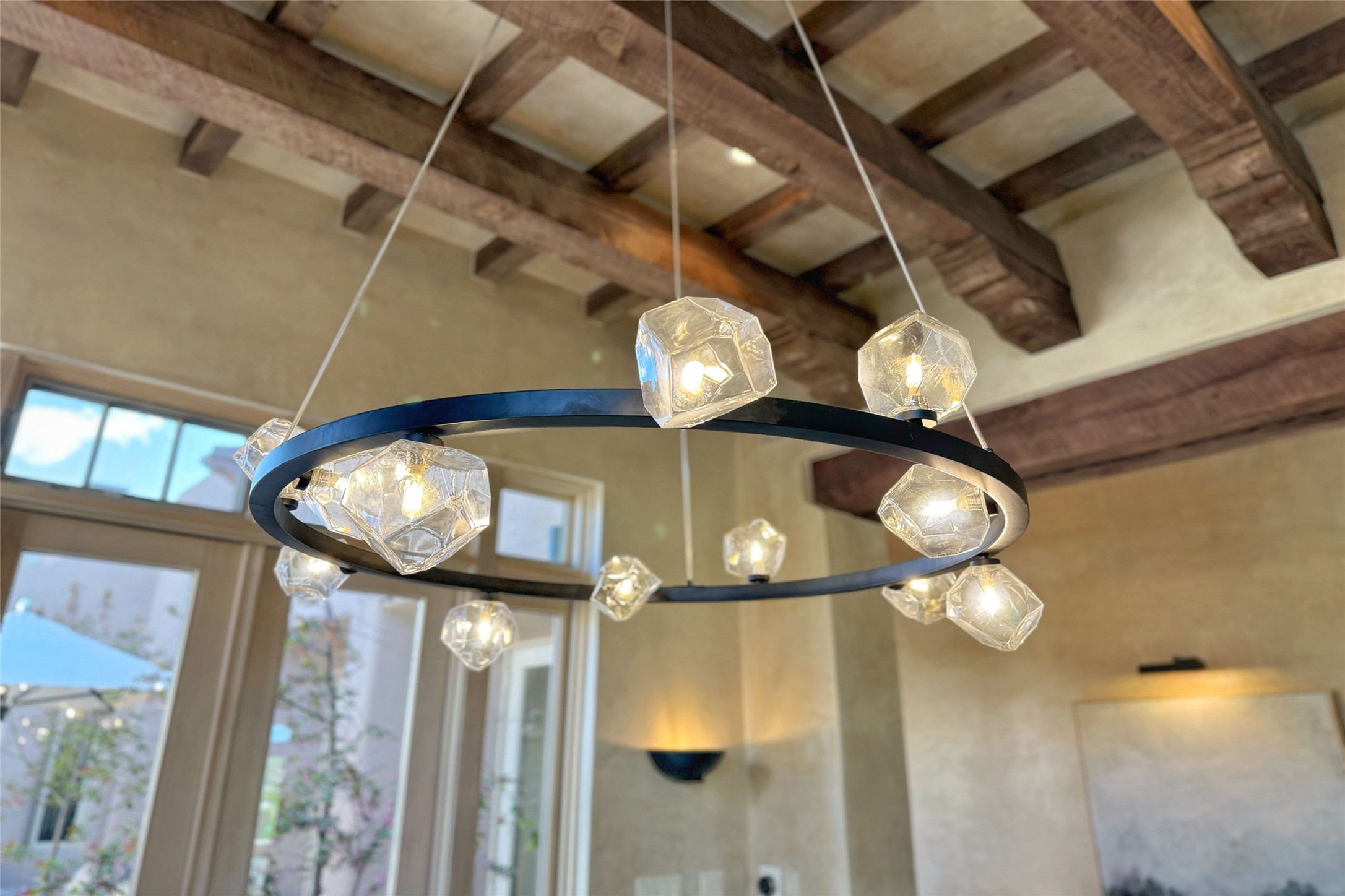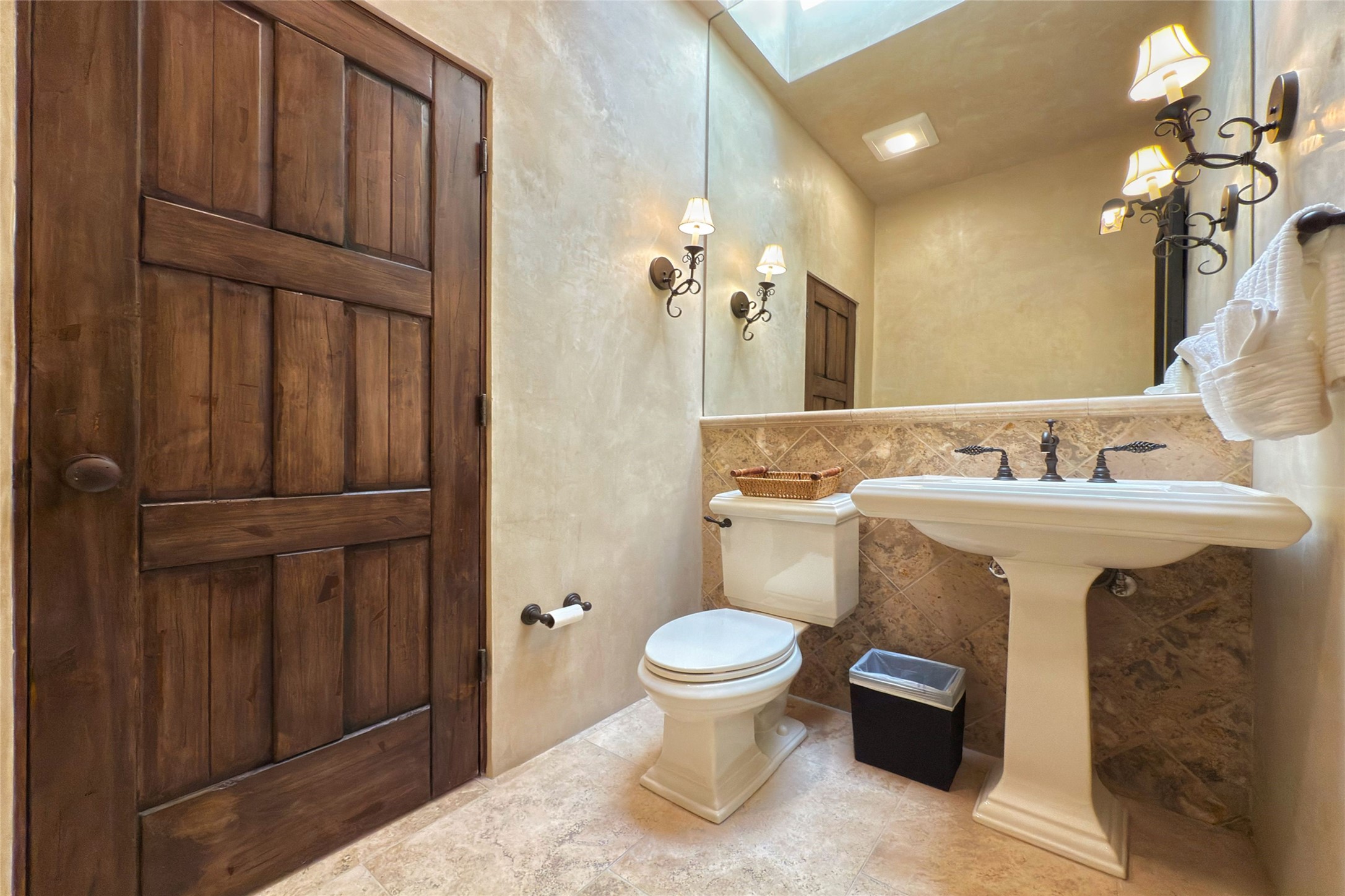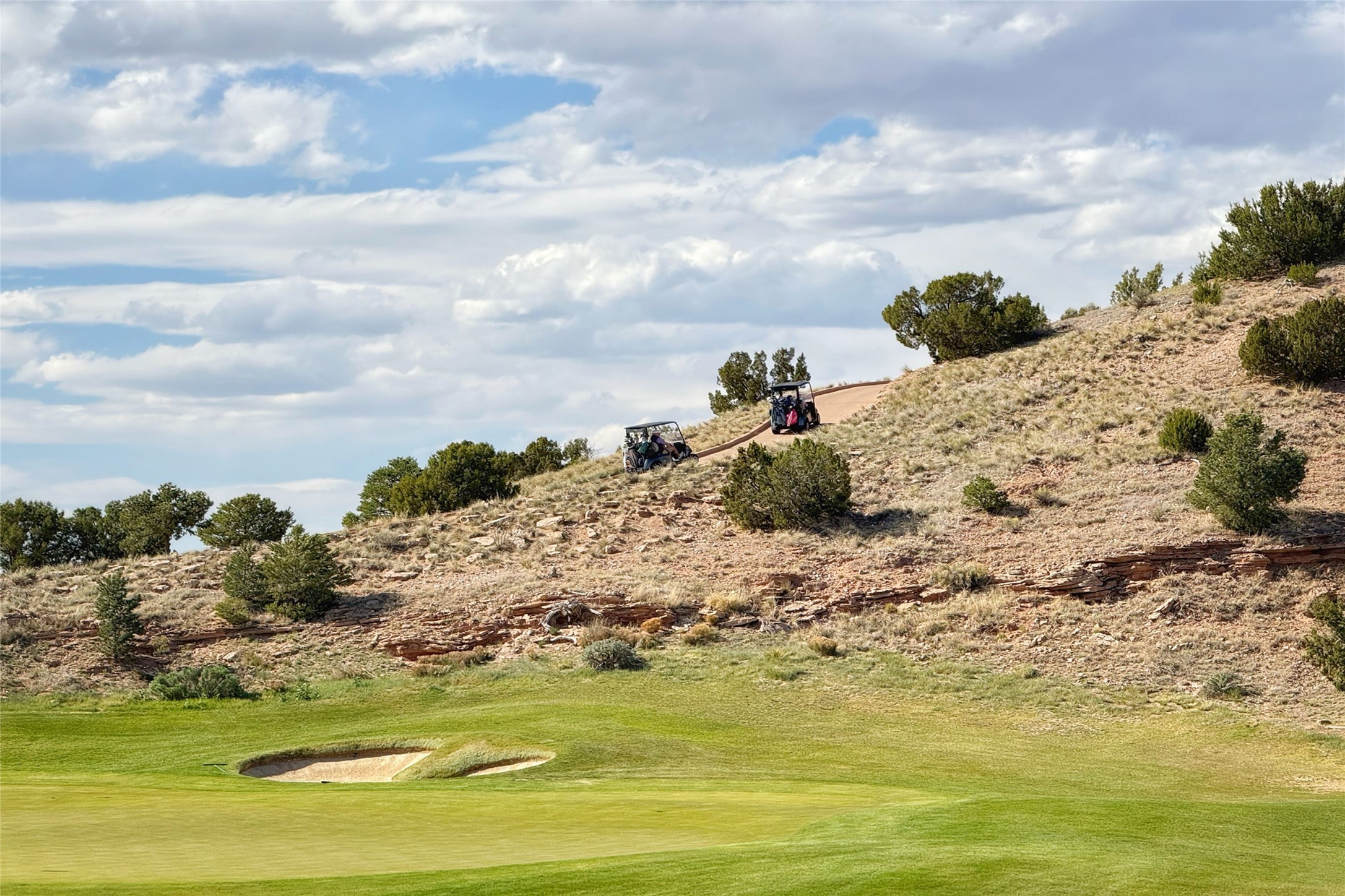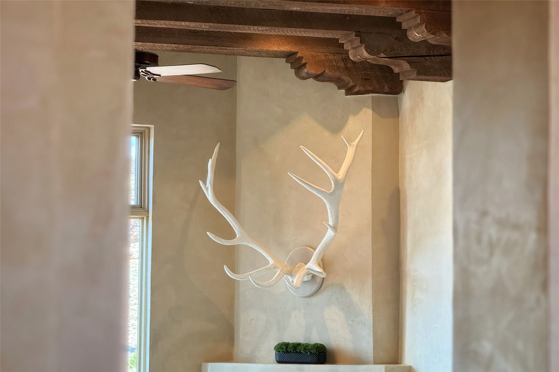 A superb location, this Las Campanas villa home provides majestic panoramic views of the Jack Nicklaus sunset golf course and Jemez / Sangre de Cristo mountain ranges. Surrounded by large open space owned by The Club at Las Campanas, affording excellent privacy. European-inspired architecture and finishes create an opulent, yet relaxed environment. Enjoy golf course views at a comfortable distance. The home sits at the end of a cul-de-sac, providing extra privacy and tranquility and ample guest parking. This home won the Parade of Homes awards for Best Floor Plan and Best Outdoor Space and features a grand arched entryway with floor lights and large Restoration Hardware mirrors to reflect the outdoors. The builder spared no expense on architectural detail and finishes: soaring 14 ft cathedral ceilings, wall wash skylights, travertine floors, handsome carved grand fireplace with custom glass doors, diamond plaster walls, granite countertops, Sub-Zero refrigerator, Wolf oven/stove, and six indoor/ two outdoor gas and wood-burning fireplaces. A sheltered interior courtyard brings the outdoors in. Choose the formal dining room that opens to the lovely courtyard or the casual eat-in nook with views. The primary bedroom suite has direct entrance to the outdoor portal overlooking the golf course and is separated from the guest bedrooms at the opposite wing of the home. Luxurious primary spa bath accesses a private enclosed side portal. Garage has large built-in cabinets for plenty of additional storage. Upgraded to entire smart home capability with high end indoor/outdoor Sonos sound system. Restoration Hardware mirrors and select indoor and all outdoor furniture pieces, as well as custom handcrafted TV cabinet and Murphy bed are included. New stucco, new roof, and tankless water heater with additional high capacity tank. Las Campanas golf membership available for purchase, subject to approval. With outstanding location, views and design, this home is truly captivating.