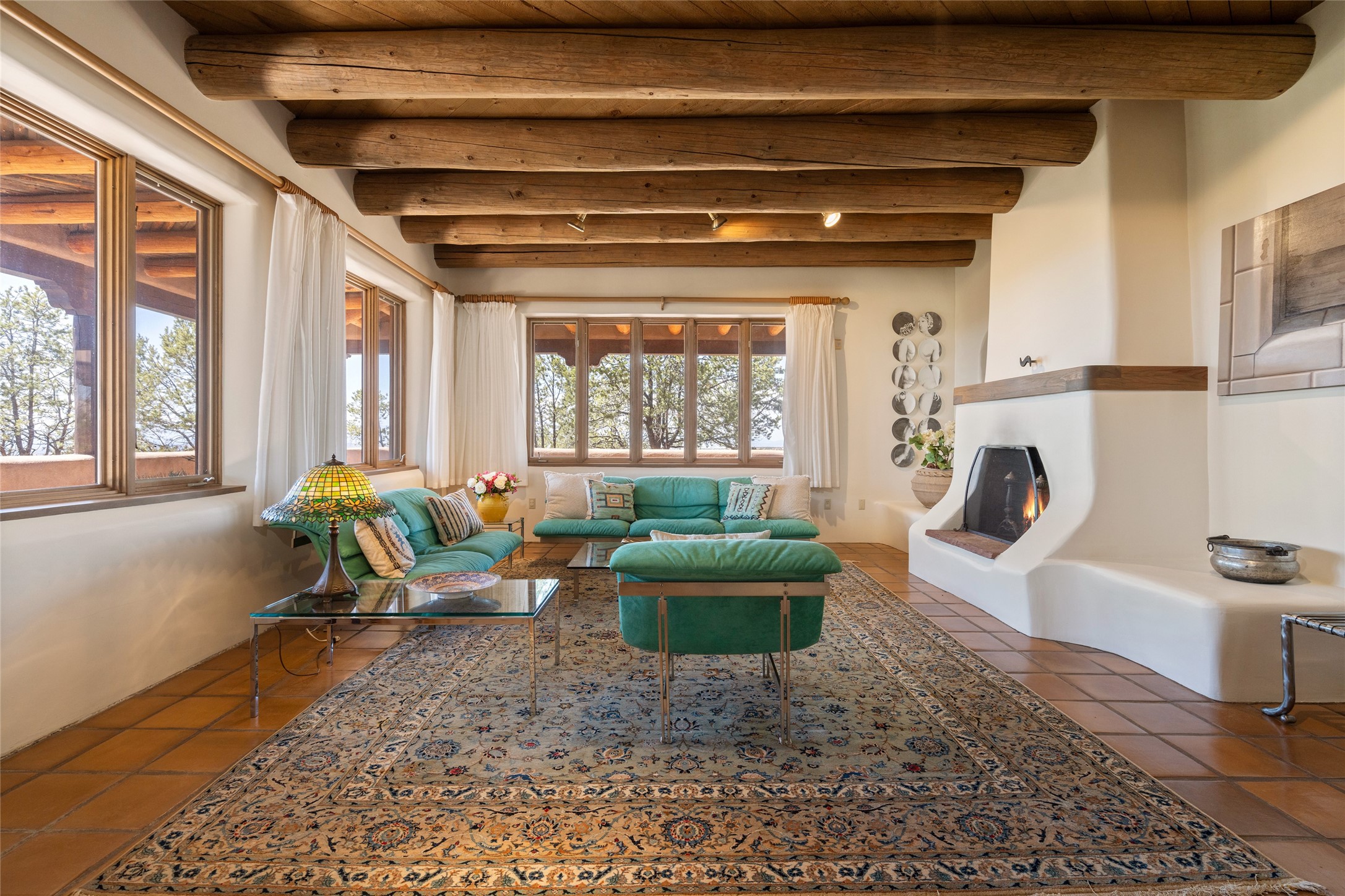 Located in the prestigious gated community of Los Caminitos in Tesuque, New Mexico, 61 Calle Encanto is a spacious residence that offers both comfort and tranquility sited on 8+ acres of scenic land. Traditional Santa Fe features are abundant. The property boasts panoramic views of the Jemez and distant mountain ranges, as well as the Santa Fe Opera house, providing a backdrop of natural beauty that enhances its peaceful, private setting. Sunrises, sunsets, and starry nights will delight. This gracious four-bedroom, five bath home features two primary suites and a private guest wing - thoughtfully separated from the main living areas. The floor plan offers privacy for all and generous living spaces. Additionally, there is an inviting den/library with ample shelves and a cozy fireplace. Another of the home's highlights is its large wrap-around portal, offering shaded spaces for enjoying the serene environment and views or hosting gatherings. The mature landscaping complements the property's natural surroundings. In addition to the property's private amenities, residents of Los Caminitos have access to an inviting clubhouse, with a pool, tennis court, and pickleball court - adding to the lifestyle appeal.