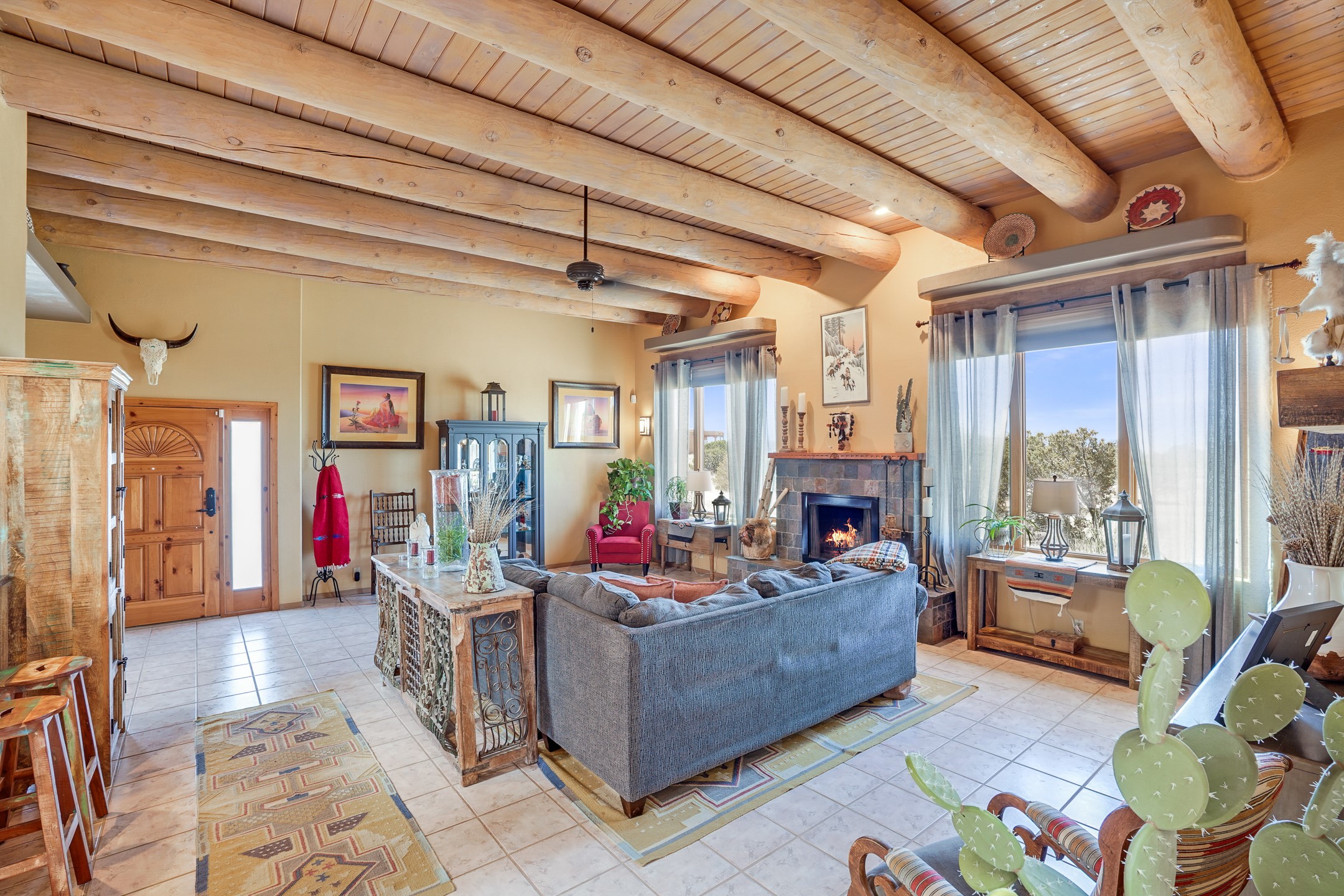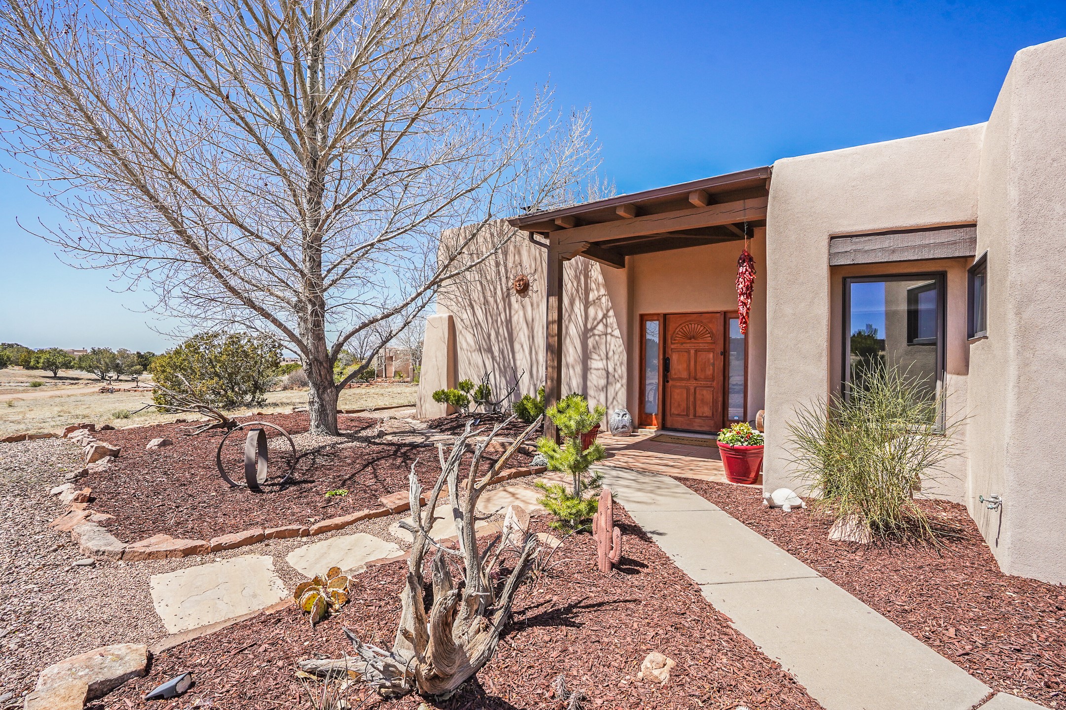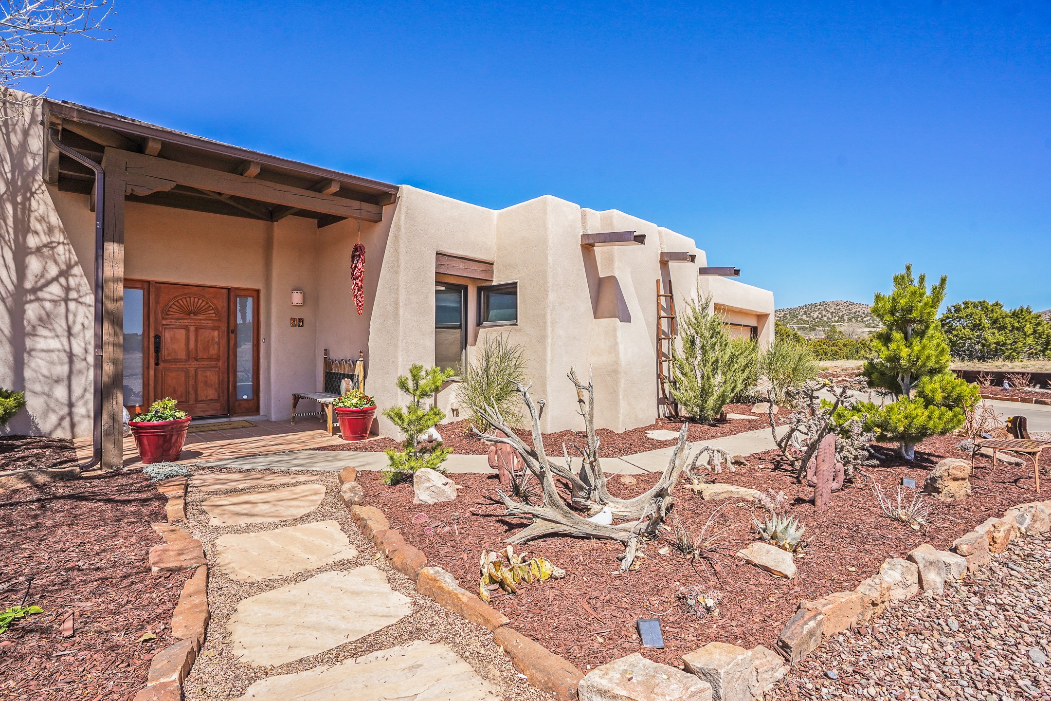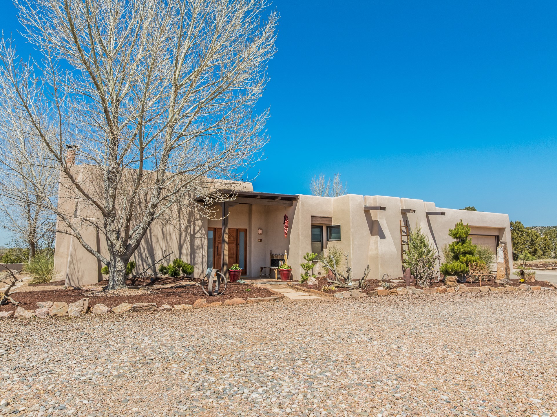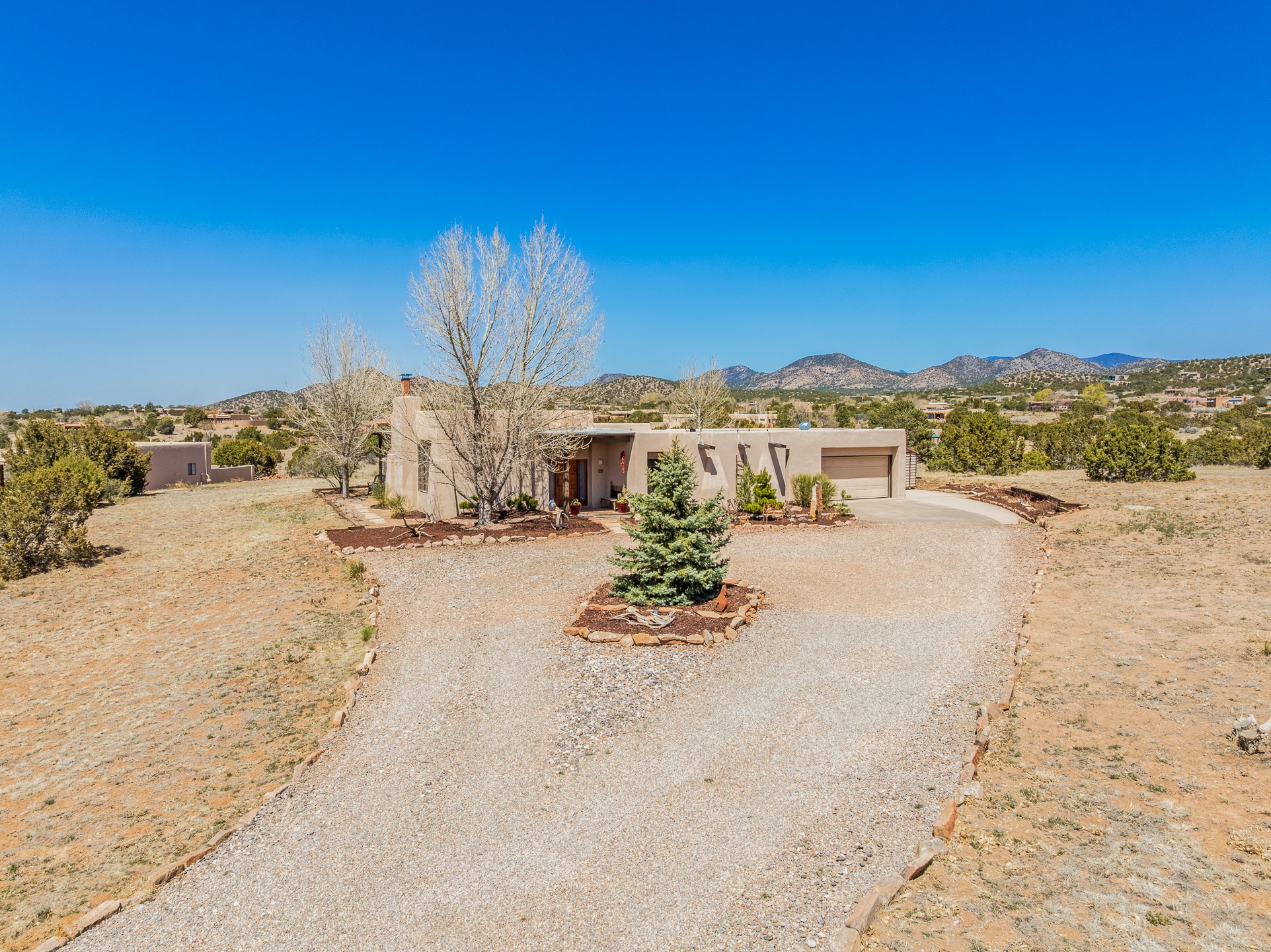 Stunning Southwestern Eldorado Gem with Views, Views, Views!Welcome to this beautifully updated and maintained 3-bedroom, 2.5-bath home with zero steps plus office on 1.38 acres of landscaped serenity. Offering incredible sunset and eastern views, this single level 2,281 sq ft property blends traditional charm with modern comfort.Enjoy outdoor living at its finest with covered portals, a walled backyard with gorgeous landscaping with views and a fenced dog run, perfect for relaxing, dining or entertaining.Step inside to a spacious living/dining area featuring tall ceilings with striking vigas, a cozy wood-burning fireplace, and view windows that bathe the home in natural light. The eat-in kitchen boasts refaced cabinets with new hardware, granite counters, gas stove, stainless steel appliances, a large pantry, and plenty of space to cook and gather!The primary suite offers a luxurious escape with Corian counters, copper sinks, extra closet storage, and a spa-like feel with access to its own outdoor sitting area to watch the brilliant Santa Fe sunsets. Comfort is ensured year-round with five mini-splits and in-floor radiant heating along with skylights throughout the home. Located just minutes from the Eldorado Community Center, local restaurants, bank, grocery store and shopping, this peaceful lot with circular driveway combines privacy, style, and comfort in a breathtaking setting--truly a must-see!