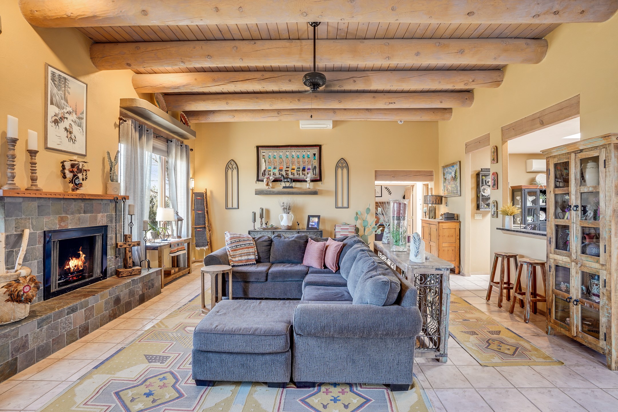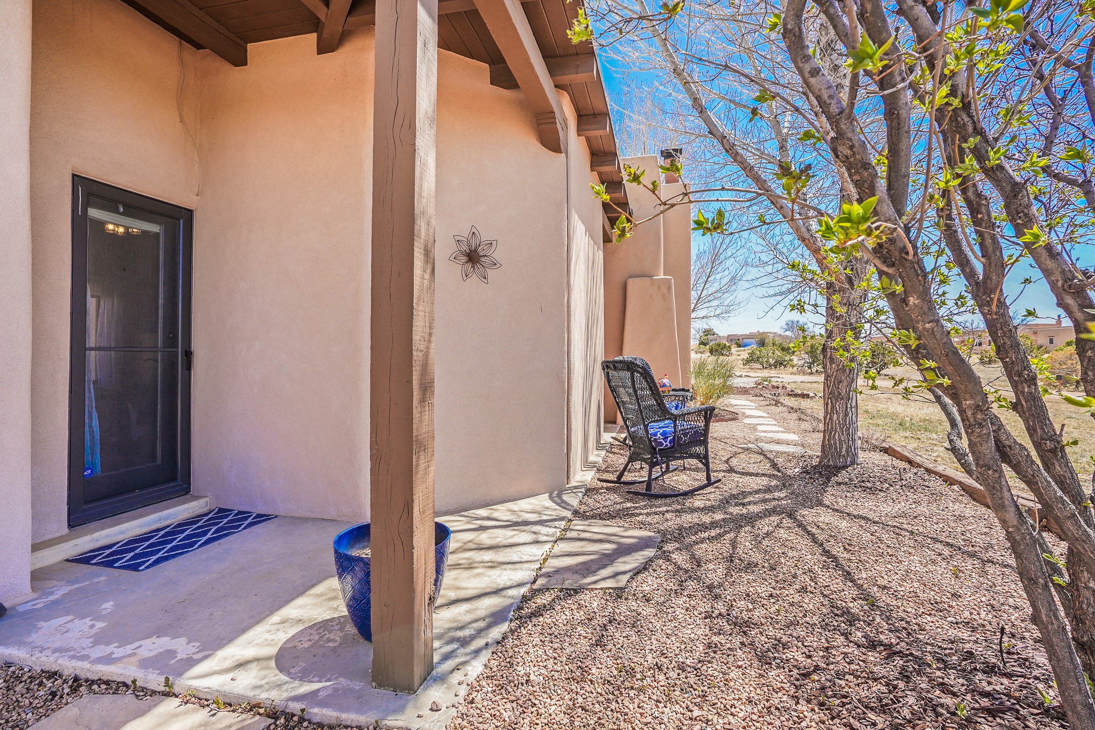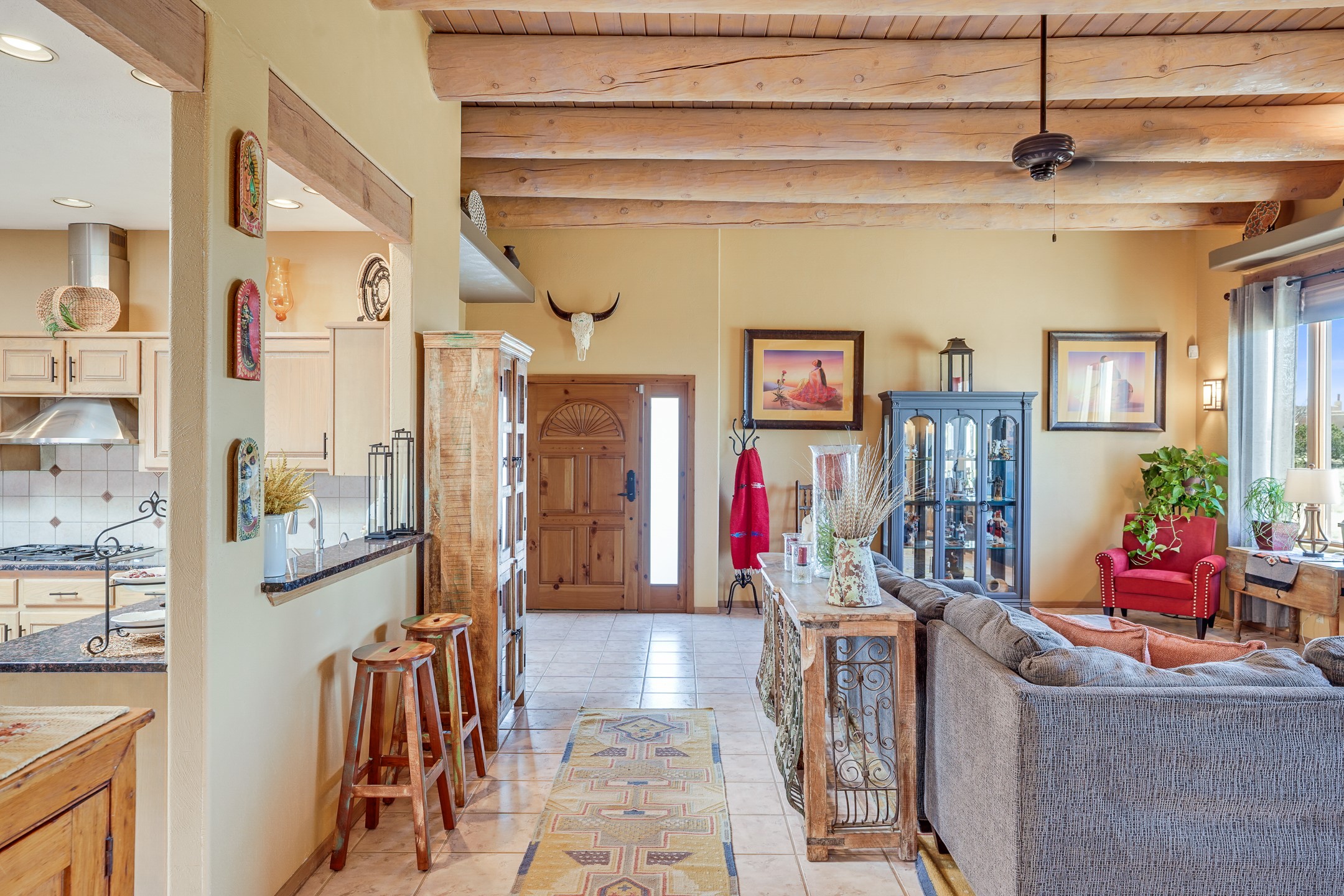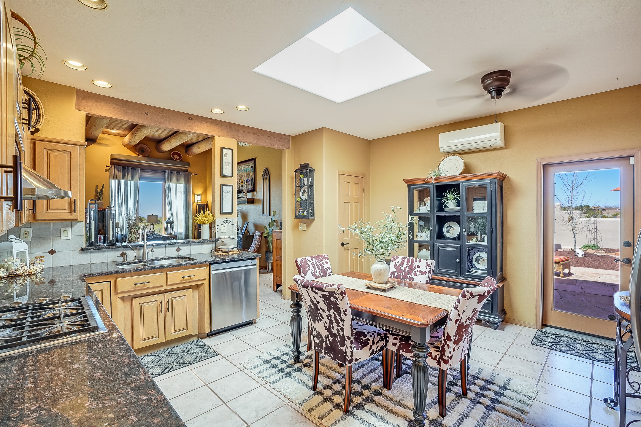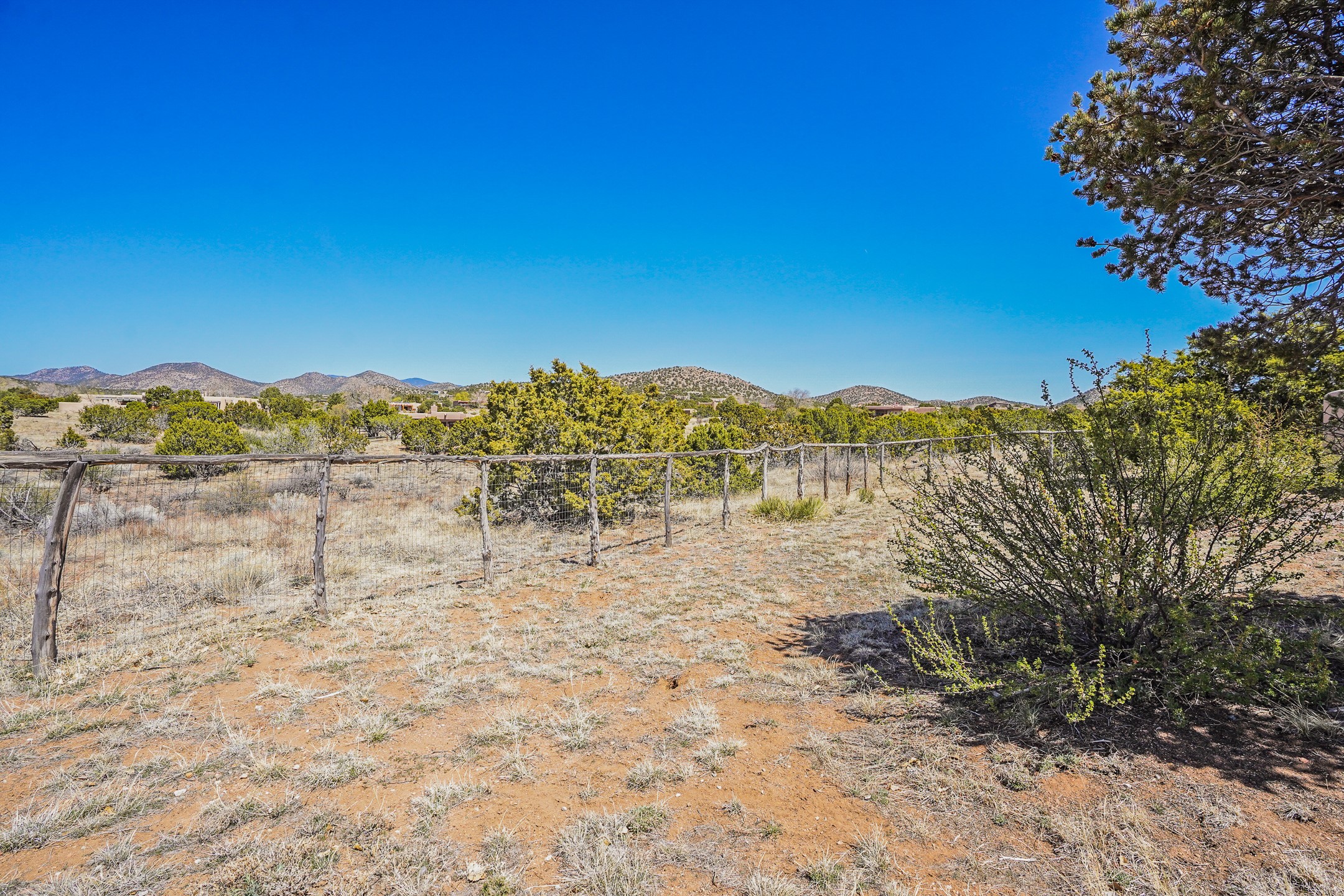 Stunning Southwestern Eldorado Gem with Views, Views, Views!Welcome to this beautifully updated and maintained 3-bedroom, 2.5-bath home with zero steps plus office on 1.38 acres of landscaped serenity. Offering incredible sunset and eastern views, this single level 2,281 sq ft property blends traditional charm with modern comfort.Enjoy outdoor living at its finest with covered portals, a walled backyard with gorgeous landscaping with views and a fenced dog run, perfect for relaxing, dining or entertaining.Step inside to a spacious living/dining area featuring tall ceilings with striking vigas, a cozy wood-burning fireplace, and view windows that bathe the home in natural light. The eat-in kitchen boasts refaced cabinets with new hardware, granite counters, gas stove, stainless steel appliances, a large pantry, and plenty of space to cook and gather!The primary suite offers a luxurious escape with Corian counters, copper sinks, extra closet storage, and a spa-like feel with access to its own outdoor sitting area to watch the brilliant Santa Fe sunsets. Comfort is ensured year-round with five mini-splits and in-floor radiant heating along with skylights throughout the home. Located just minutes from the Eldorado Community Center, local restaurants, bank, grocery store and shopping, this peaceful lot with circular driveway combines privacy, style, and comfort in a breathtaking setting--truly a must-see!
