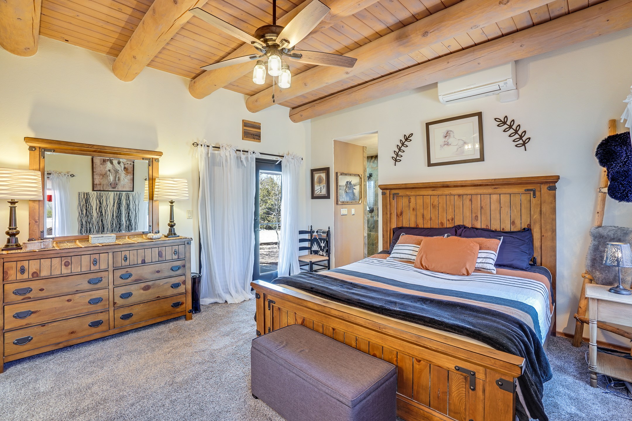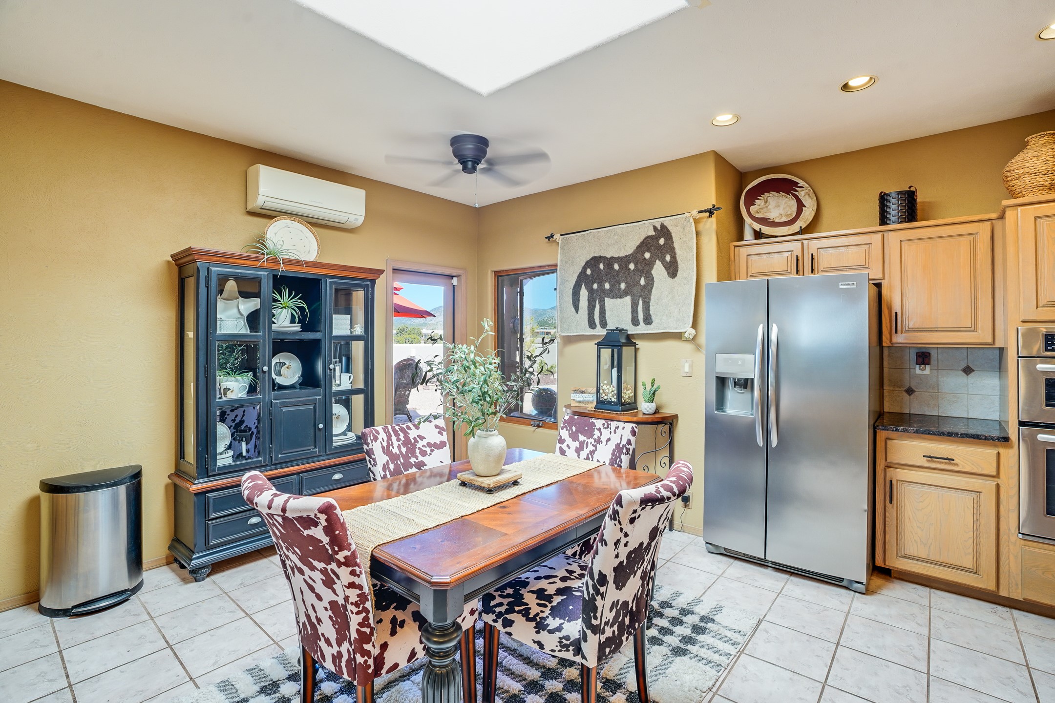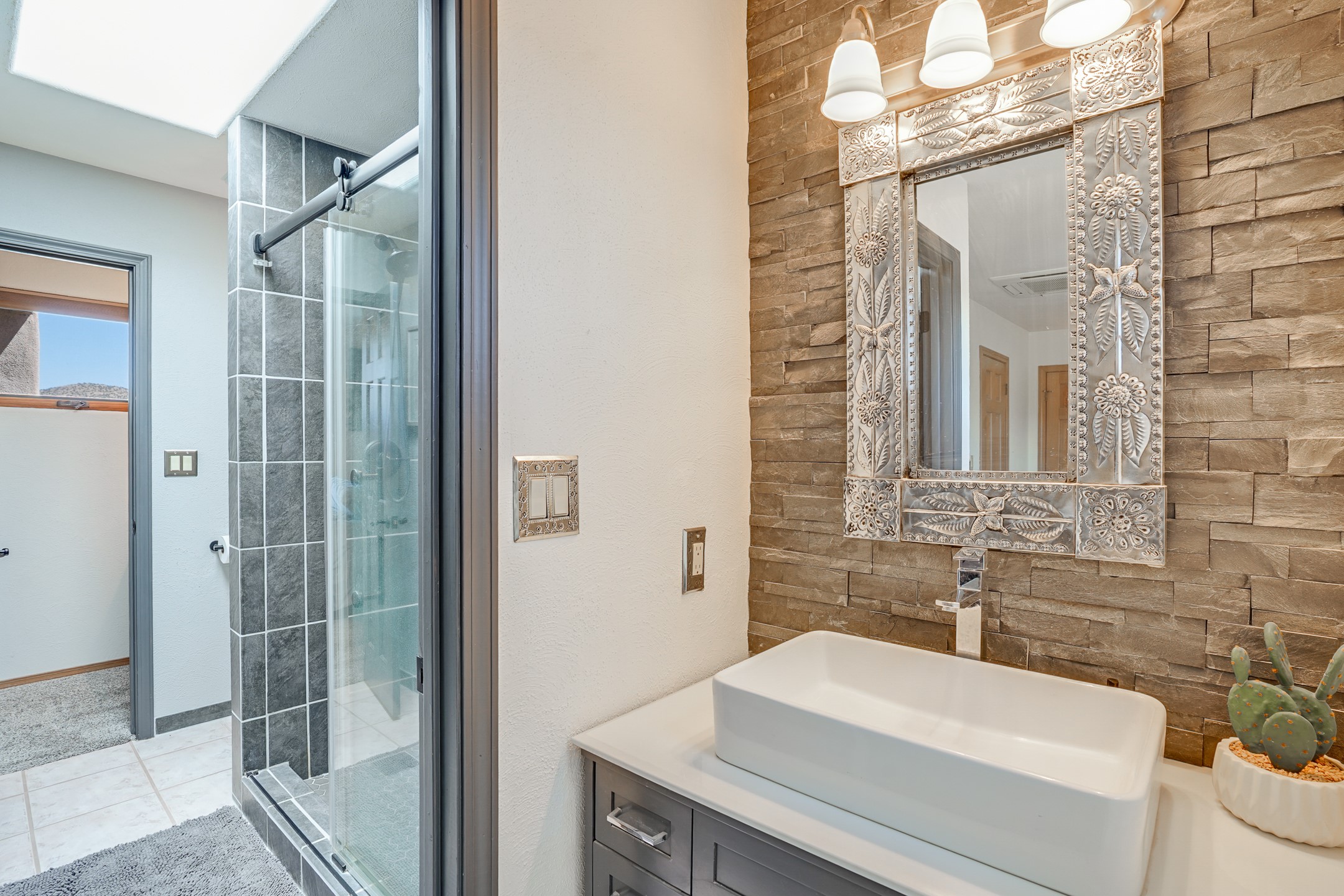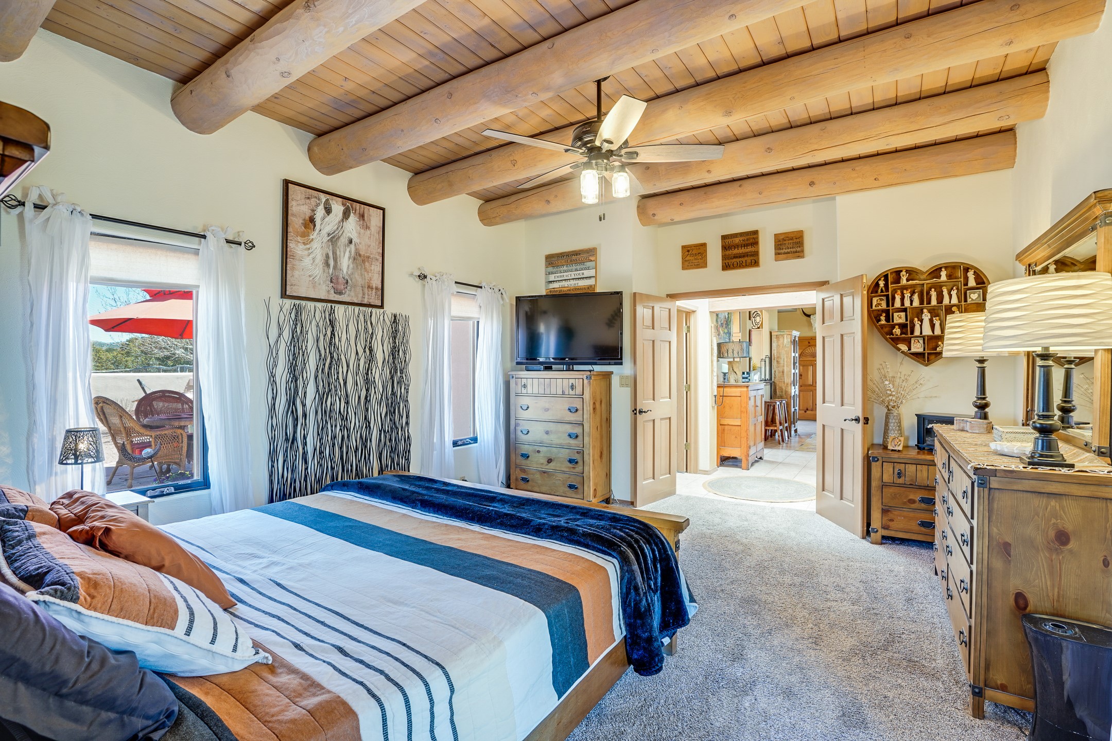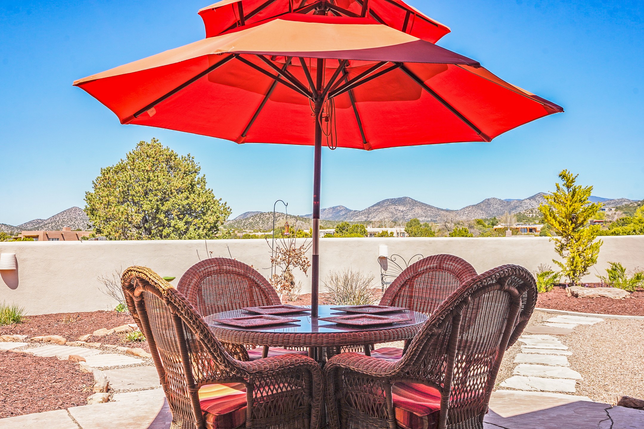 Stunning Southwestern Eldorado Gem with Views, Views, Views!Welcome to this beautifully updated and maintained 3-bedroom, 2.5-bath home with zero steps plus office on 1.38 acres of landscaped serenity. Offering incredible sunset and eastern views, this single level 2,281 sq ft property blends traditional charm with modern comfort.Enjoy outdoor living at its finest with covered portals, a walled backyard with gorgeous landscaping with views and a fenced dog run, perfect for relaxing, dining or entertaining.Step inside to a spacious living/dining area featuring tall ceilings with striking vigas, a cozy wood-burning fireplace, and view windows that bathe the home in natural light. The eat-in kitchen boasts refaced cabinets with new hardware, granite counters, gas stove, stainless steel appliances, a large pantry, and plenty of space to cook and gather!The primary suite offers a luxurious escape with Corian counters, copper sinks, extra closet storage, and a spa-like feel with access to its own outdoor sitting area to watch the brilliant Santa Fe sunsets. Comfort is ensured year-round with five mini-splits and in-floor radiant heating along with skylights throughout the home. Located just minutes from the Eldorado Community Center, local restaurants, bank, grocery store and shopping, this peaceful lot with circular driveway combines privacy, style, and comfort in a breathtaking setting--truly a must-see!