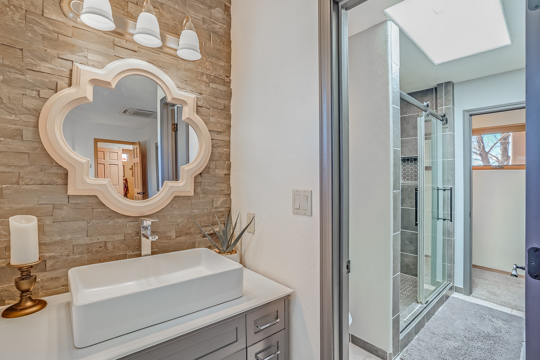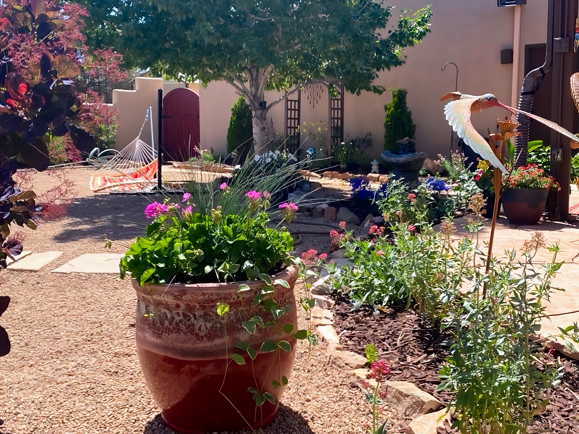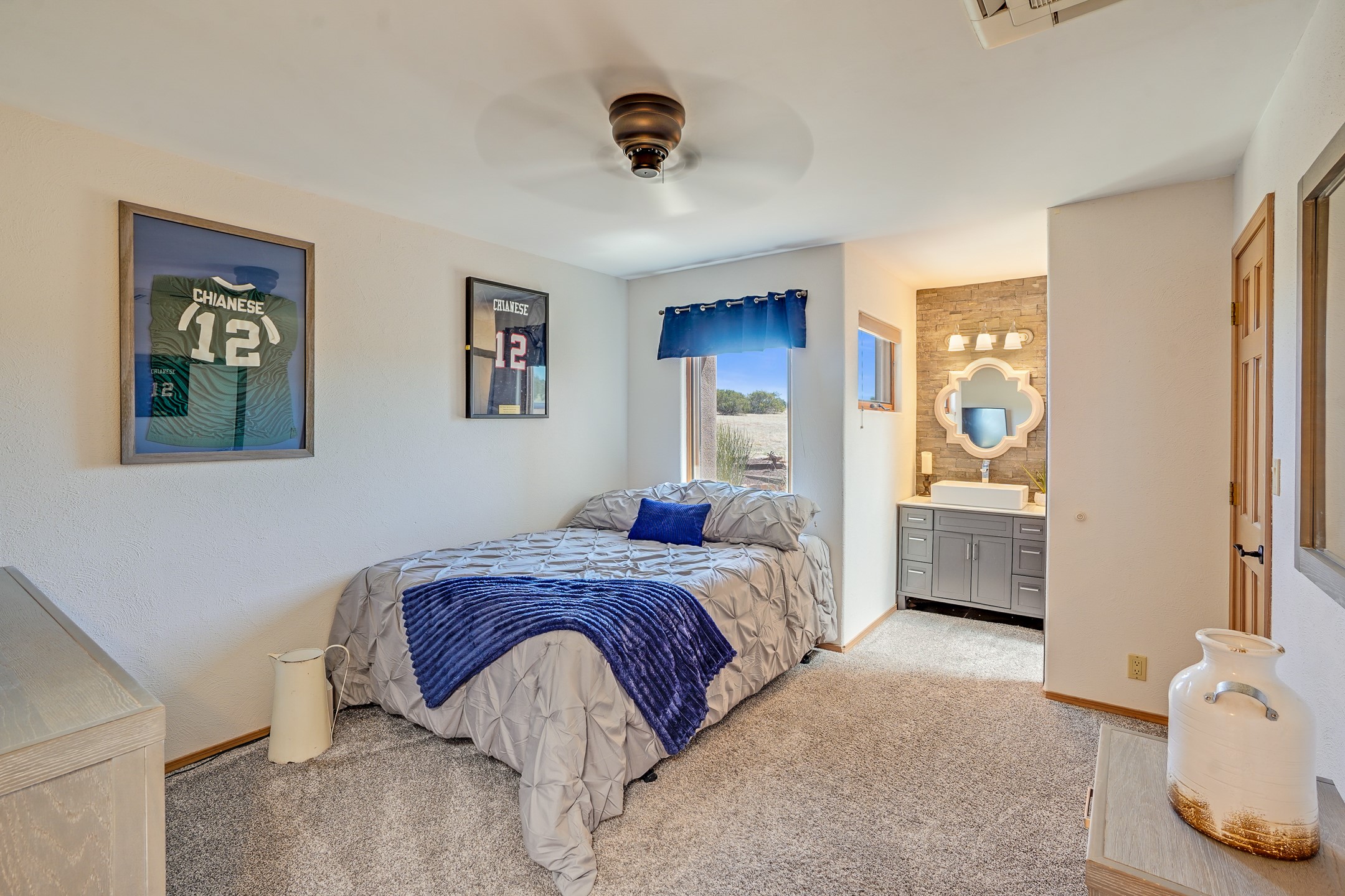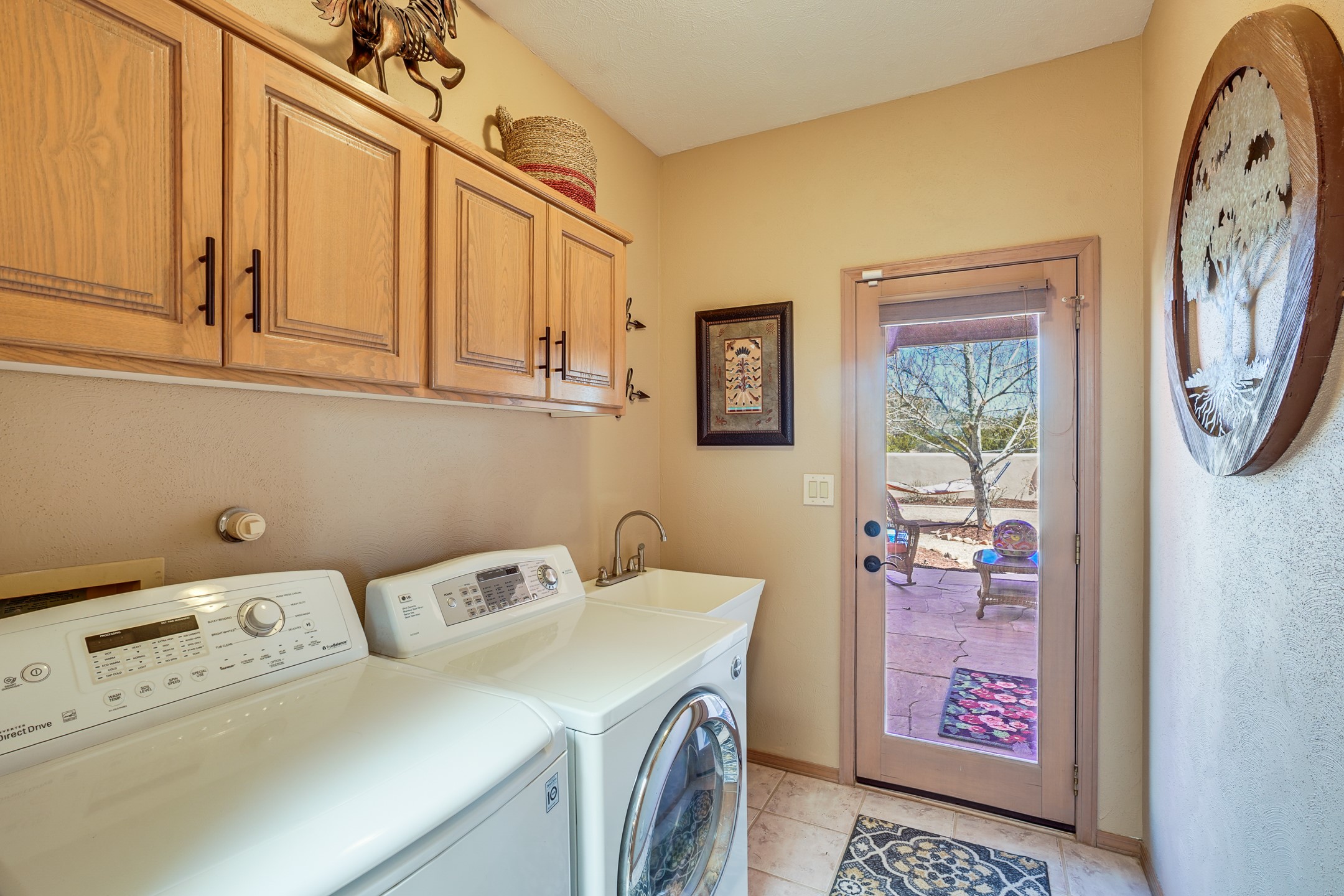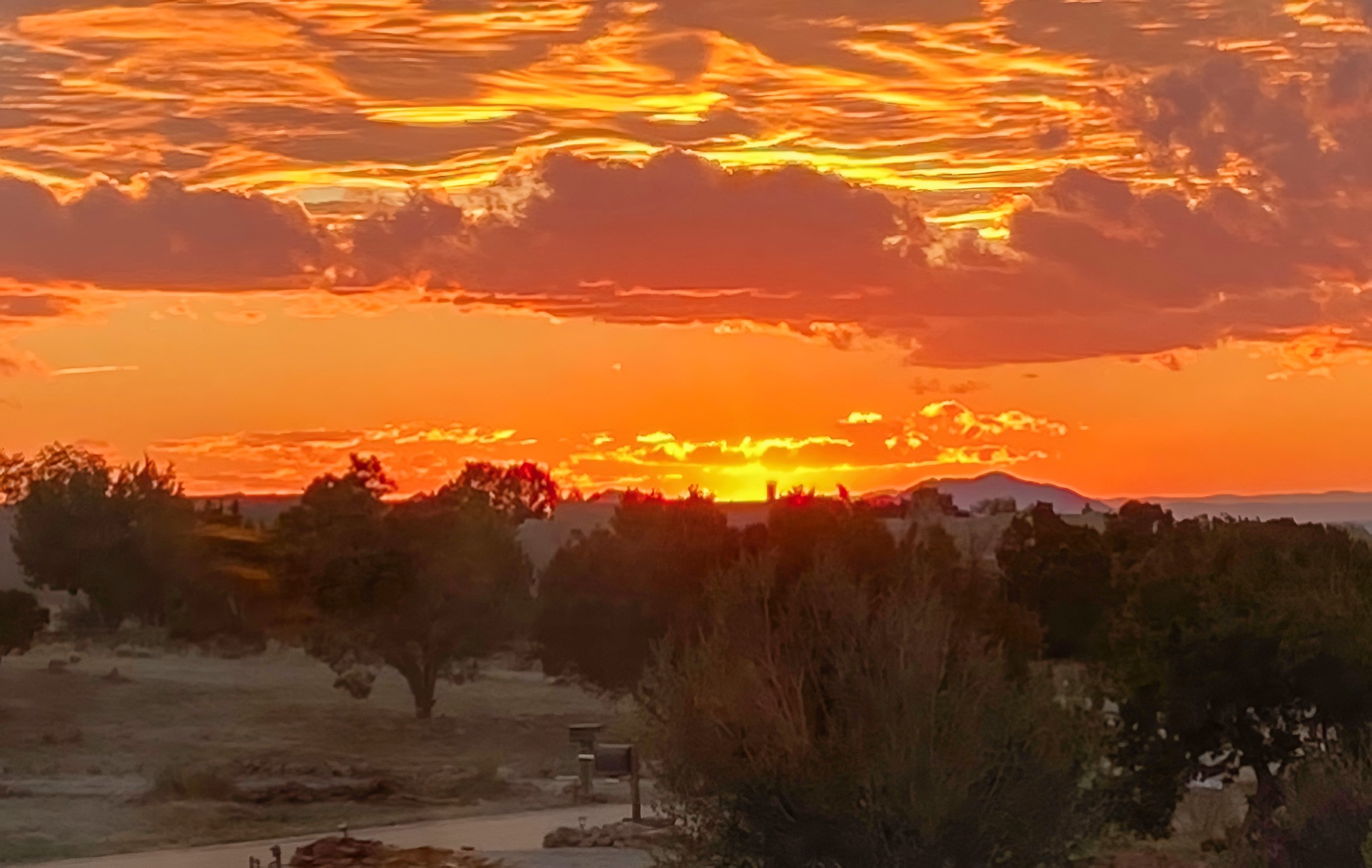 Stunning Southwestern Eldorado Gem with Views, Views, Views!Welcome to this beautifully updated and maintained 3-bedroom, 2.5-bath home with zero steps plus office on 1.38 acres of landscaped serenity. Offering incredible sunset and eastern views, this single level 2,281 sq ft property blends traditional charm with modern comfort.Enjoy outdoor living at its finest with covered portals, a walled backyard with gorgeous landscaping with views and a fenced dog run, perfect for relaxing, dining or entertaining.Step inside to a spacious living/dining area featuring tall ceilings with striking vigas, a cozy wood-burning fireplace, and view windows that bathe the home in natural light. The eat-in kitchen boasts refaced cabinets with new hardware, granite counters, gas stove, stainless steel appliances, a large pantry, and plenty of space to cook and gather!The primary suite offers a luxurious escape with Corian counters, copper sinks, extra closet storage, and a spa-like feel with access to its own outdoor sitting area to watch the brilliant Santa Fe sunsets. Comfort is ensured year-round with five mini-splits and in-floor radiant heating along with skylights throughout the home. Located just minutes from the Eldorado Community Center, local restaurants, bank, grocery store and shopping, this peaceful lot with circular driveway combines privacy, style, and comfort in a breathtaking setting--truly a must-see!