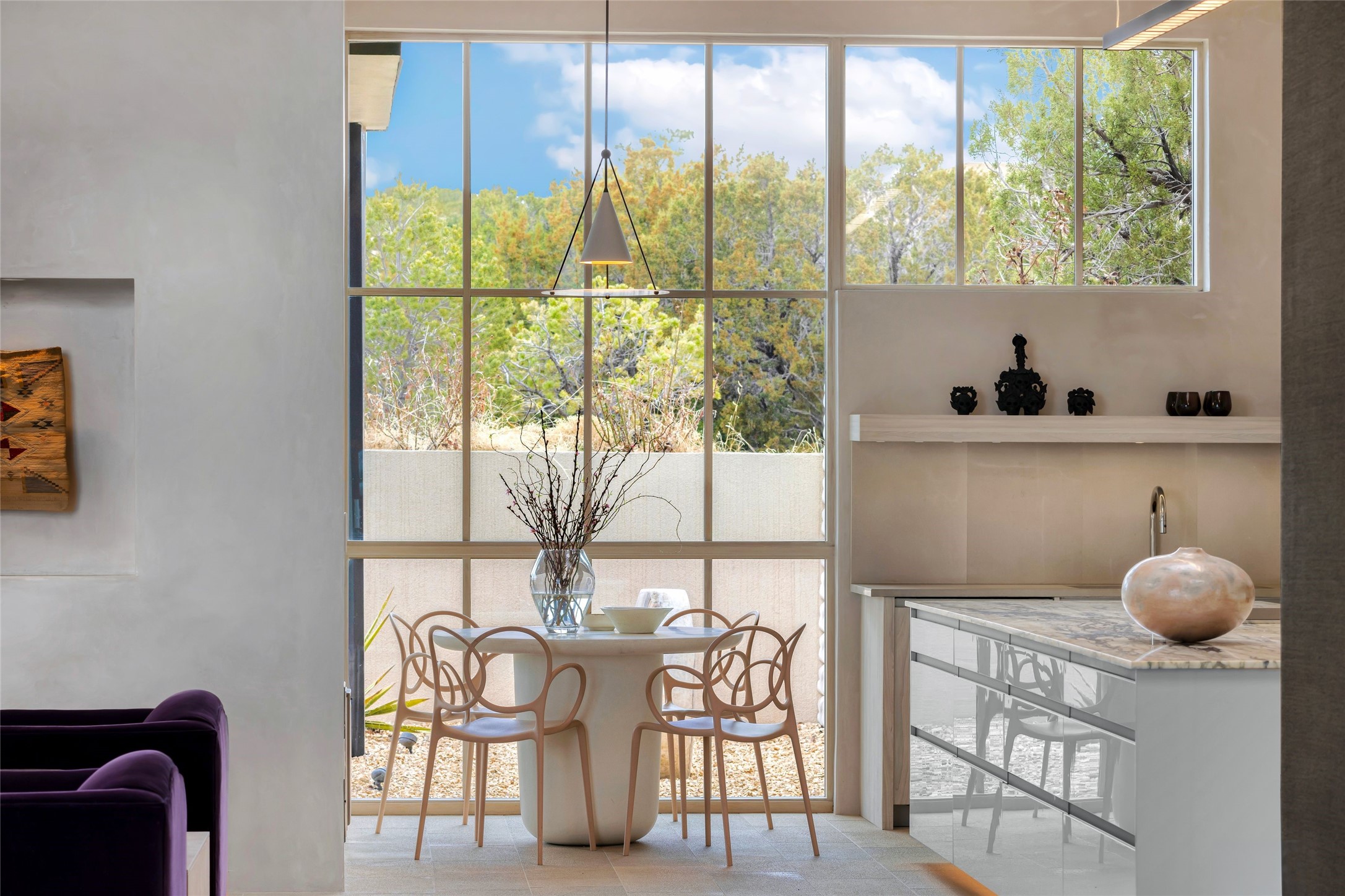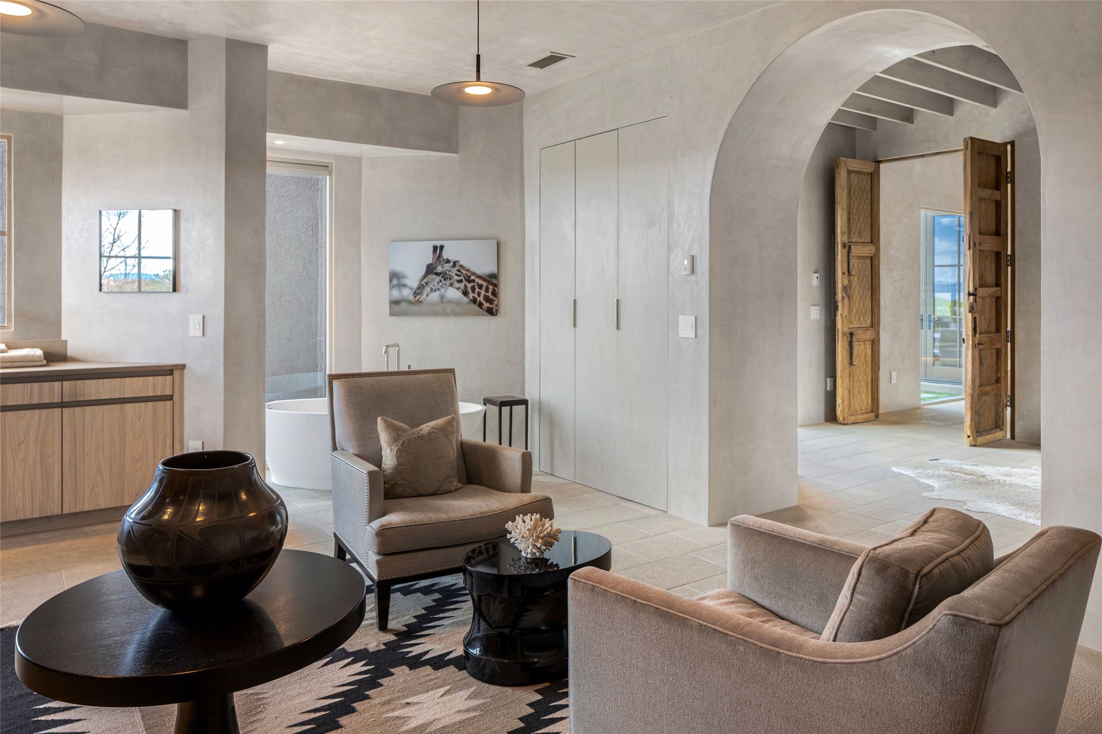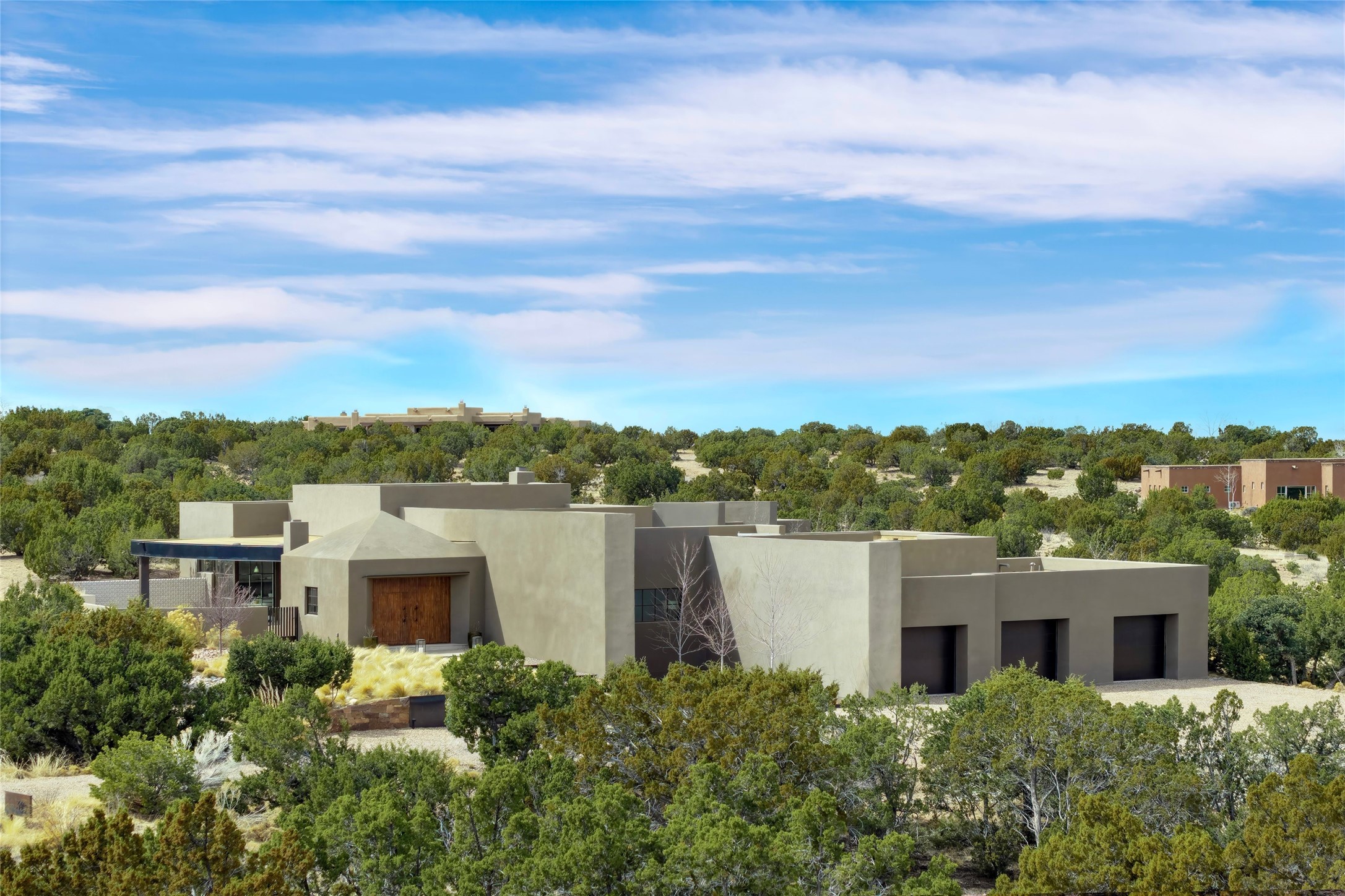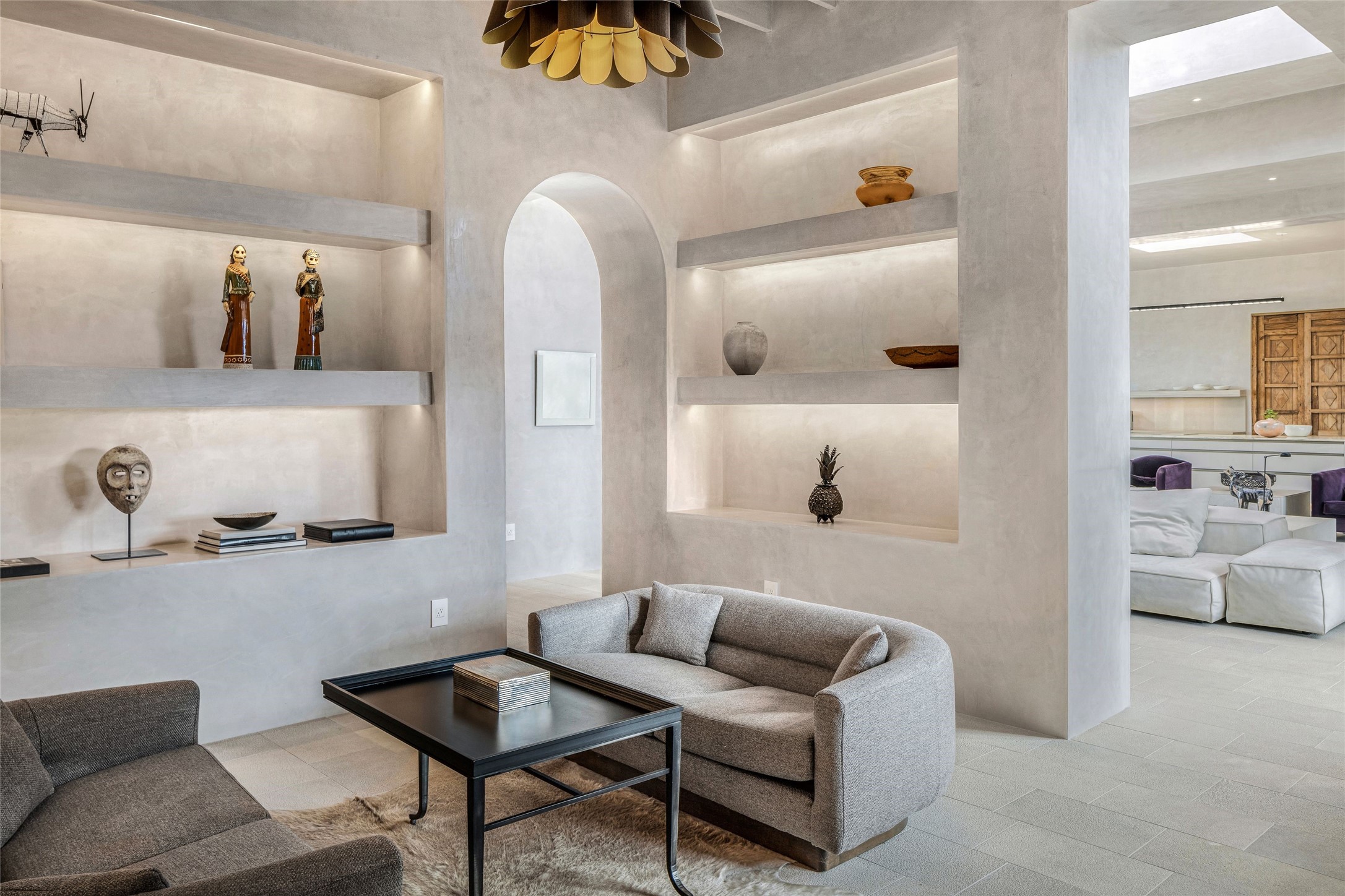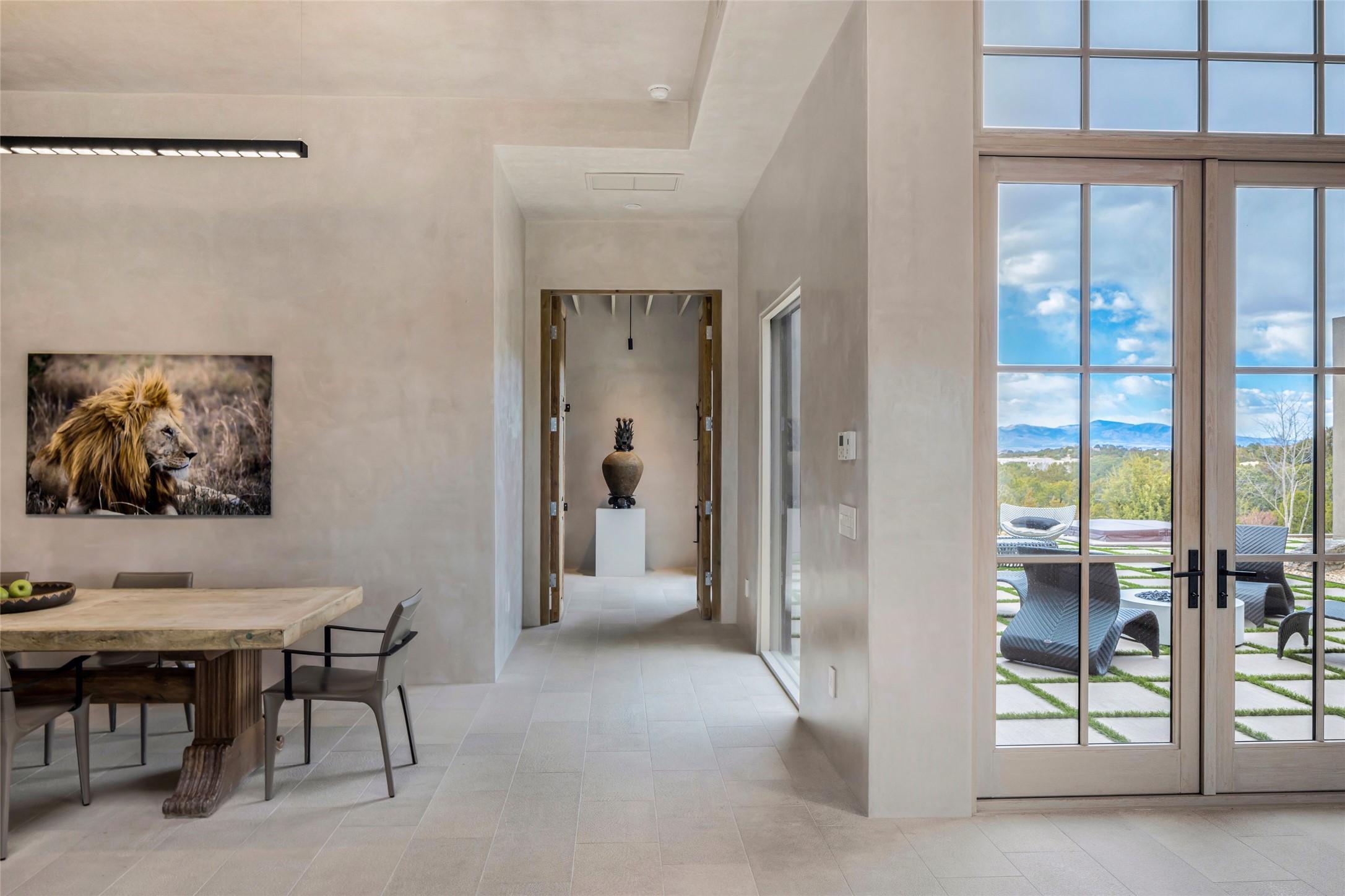 It's rare for a home to be art itself, but that is exactly what renowned builder Seth Anderson has created at 32 Sunflower. The dimensions and lines are sculptural, reflecting a thoughtful approach to modern architecture. The juxtaposition of light and shadow playing off the textured plaster walls create a dynamic yet warm and comforting environment. Smartly positioned on 2.32 acres within Las Campanas, the house takes in sweeping western sunset and mountain views on one side and the Sangre de Cristo Mountains on the other. From east to west, the outdoor spaces flow into and out of the interior living areas. An impressive entry framed by a 10-foot Mexican Zaguan-style door welcomes guests into an entry rich in detail with a black steel accent wall behind sits the powder room. From there, arched passageways define the flow of the home, leading to the open living, dining and kitchen area and beyond to the library on one end and the exquisite primary suite on the other. The kitchen is designed for both cooking and entertaining, with a large marble island marble, a walk-in pantry, and Subzero/Wolf appliances. The primary bathroom is truly special, serving as a private living space with an incredible shower of chiseled Italian limestone. The vanities and bathtub overlook views of the Jemez Mountains. A separate wing offers two guest bedrooms with a shared sitting room and bathroom. The home also features a large private office and a laundry room. In a world of facsimile, 32 Sunflower is unique not only in design concept but in the superior rendering of both its form and finishes.