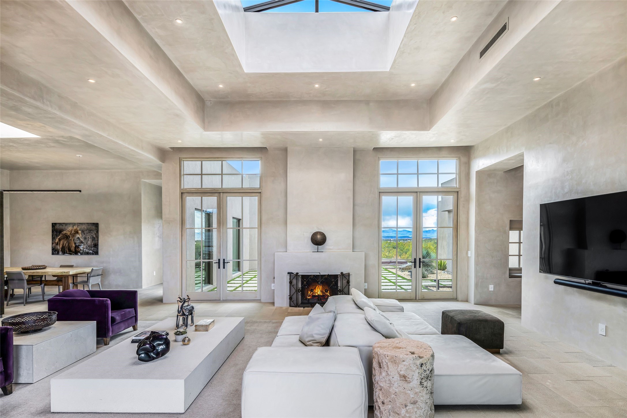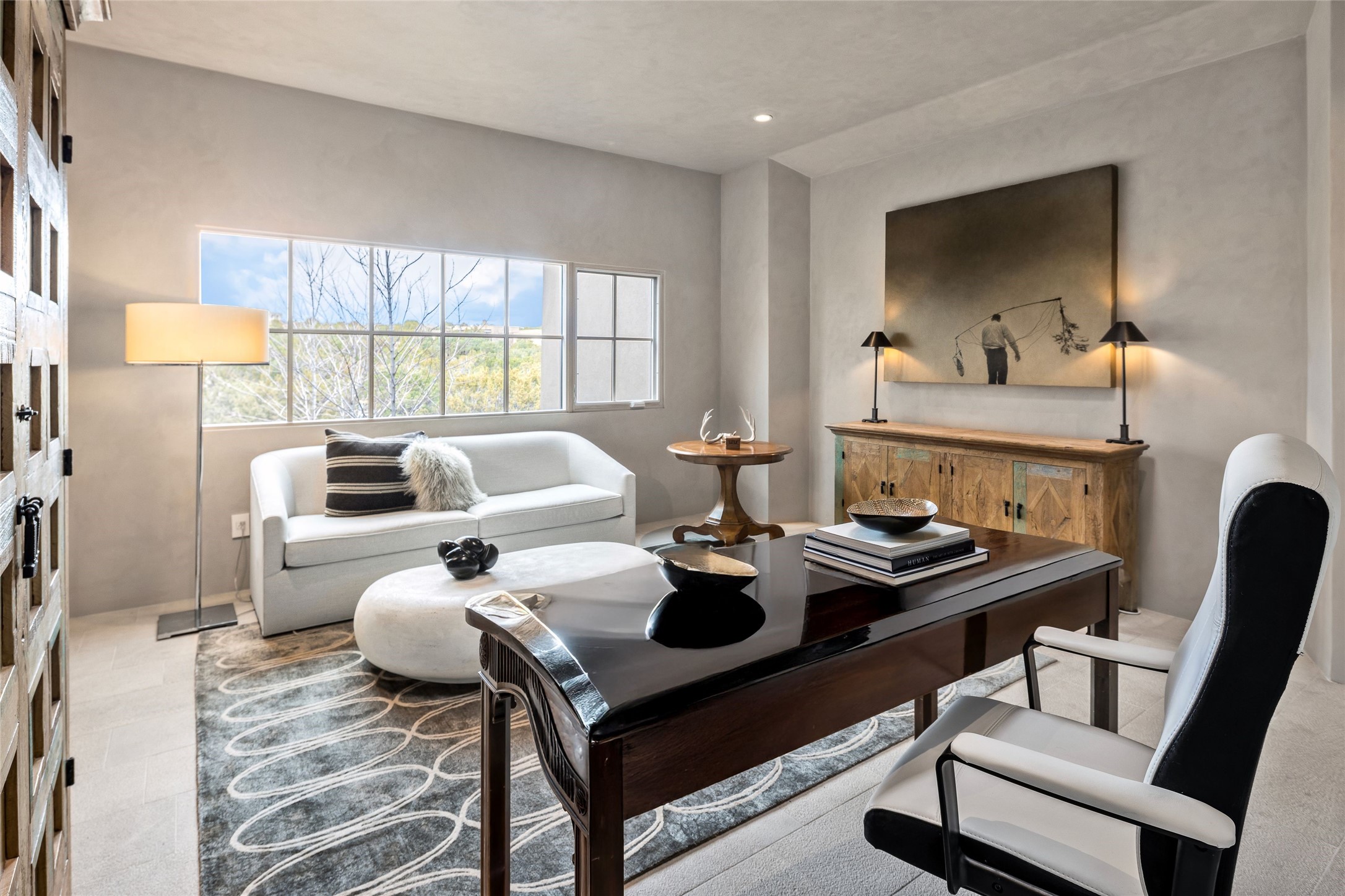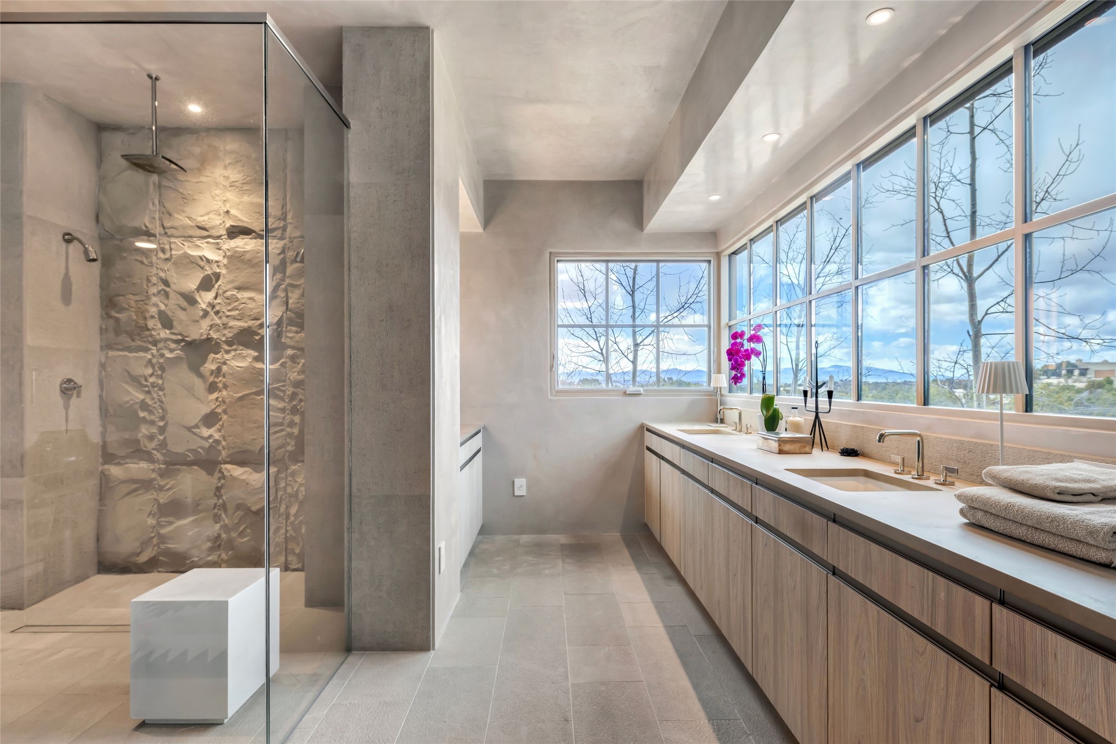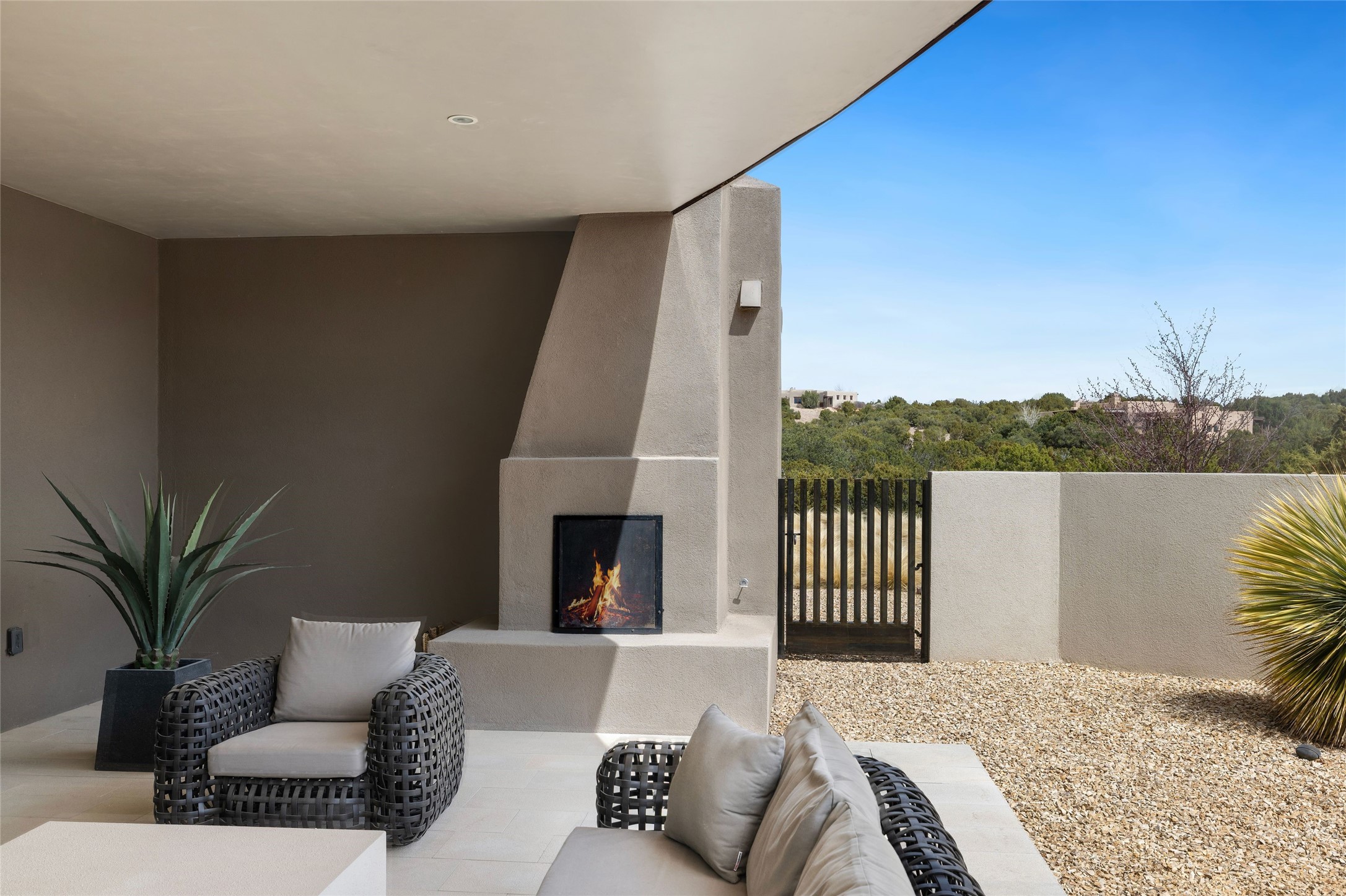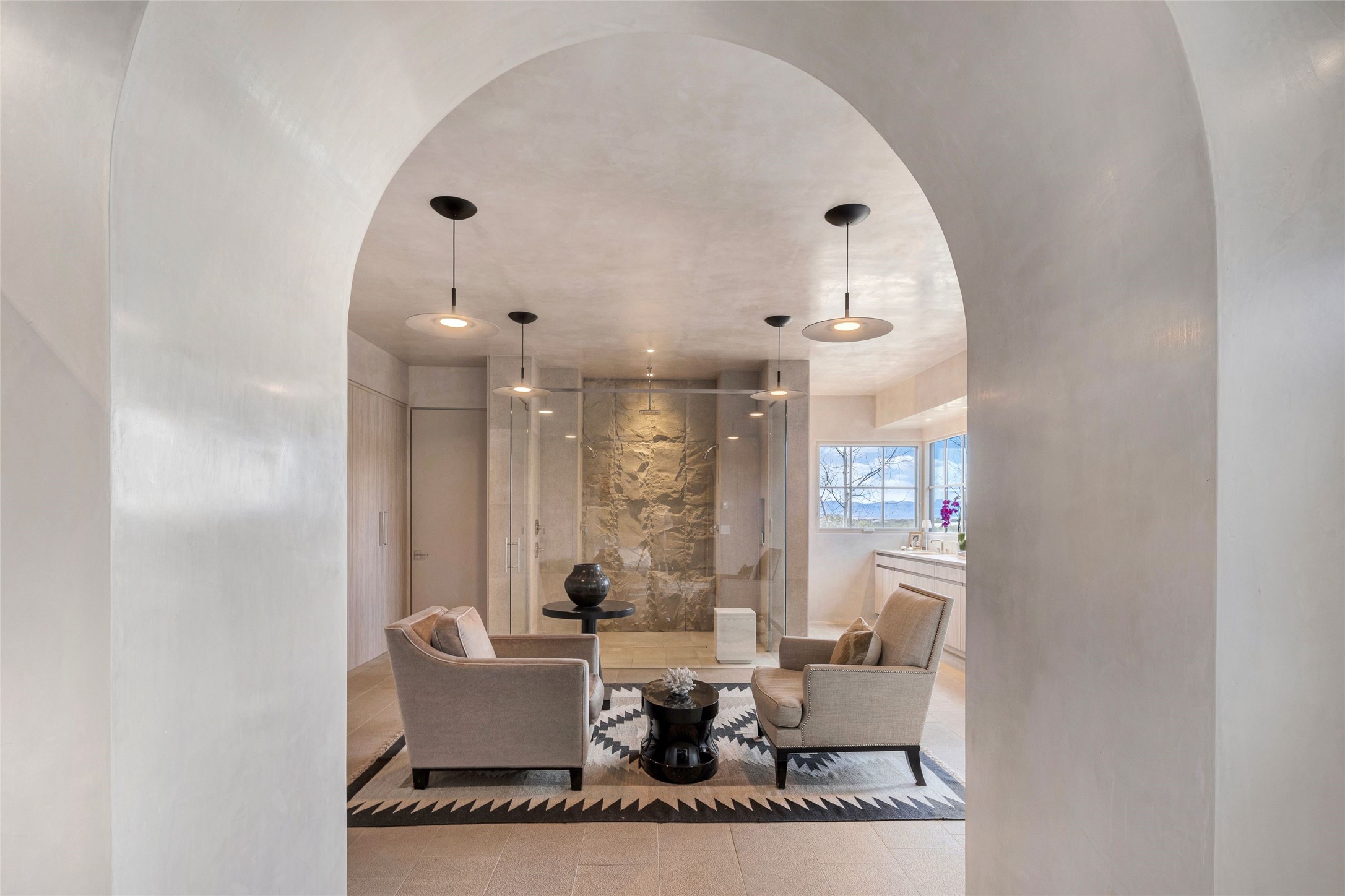 It's rare for a home to be art itself, but that is exactly what renowned builder Seth Anderson has created at 32 Sunflower. The dimensions and lines are sculptural, reflecting a thoughtful approach to modern architecture. The juxtaposition of light and shadow playing off the textured plaster walls create a dynamic yet warm and comforting environment. Smartly positioned on 2.32 acres within Las Campanas, the house takes in sweeping western sunset and mountain views on one side and the Sangre de Cristo Mountains on the other. From east to west, the outdoor spaces flow into and out of the interior living areas. An impressive entry framed by a 10-foot Mexican Zaguan-style door welcomes guests into an entry rich in detail with a black steel accent wall behind sits the powder room. From there, arched passageways define the flow of the home, leading to the open living, dining and kitchen area and beyond to the library on one end and the exquisite primary suite on the other. The kitchen is designed for both cooking and entertaining, with a large marble island marble, a walk-in pantry, and Subzero/Wolf appliances. The primary bathroom is truly special, serving as a private living space with an incredible shower of chiseled Italian limestone. The vanities and bathtub overlook views of the Jemez Mountains. A separate wing offers two guest bedrooms with a shared sitting room and bathroom. The home also features a large private office and a laundry room. In a world of facsimile, 32 Sunflower is unique not only in design concept but in the superior rendering of both its form and finishes.