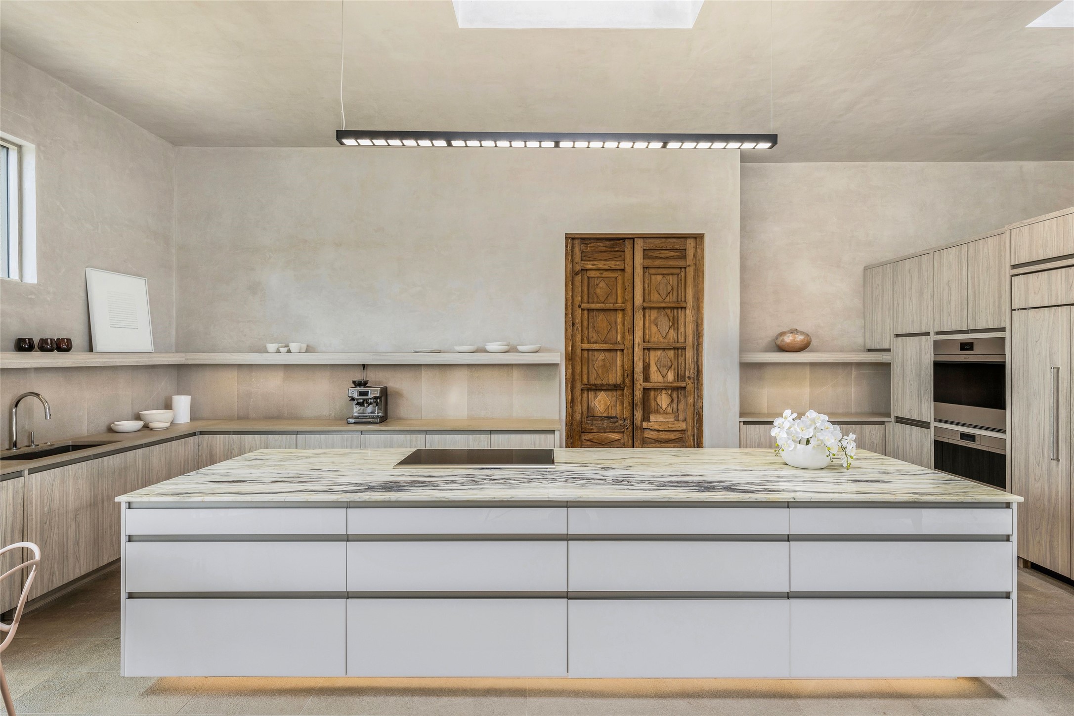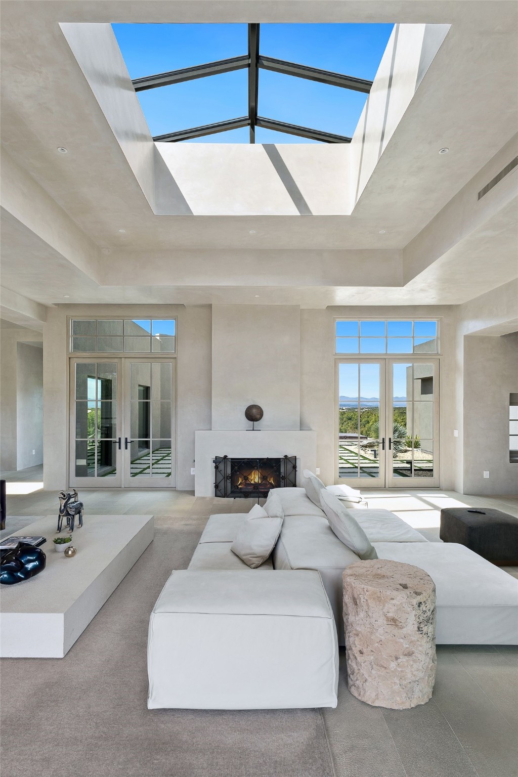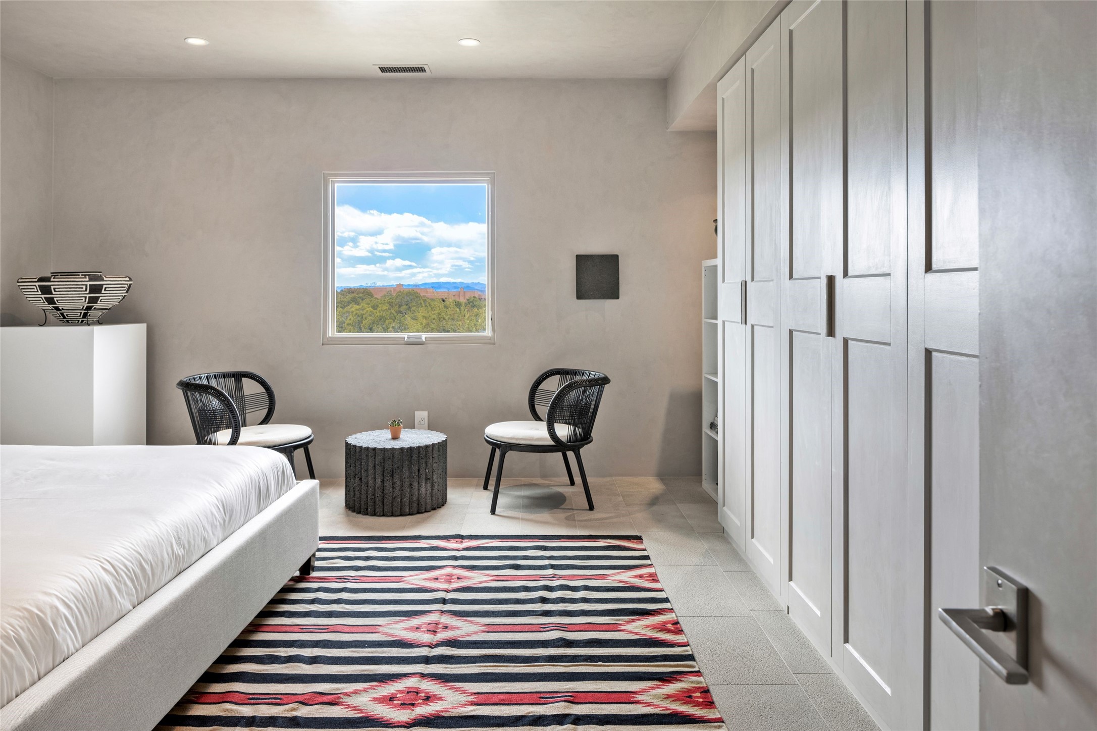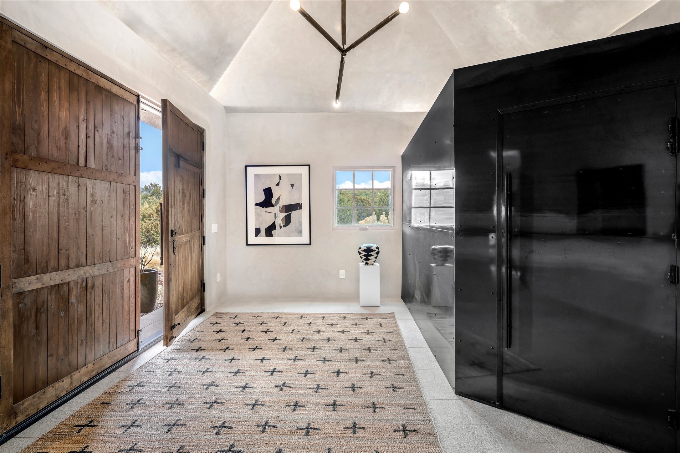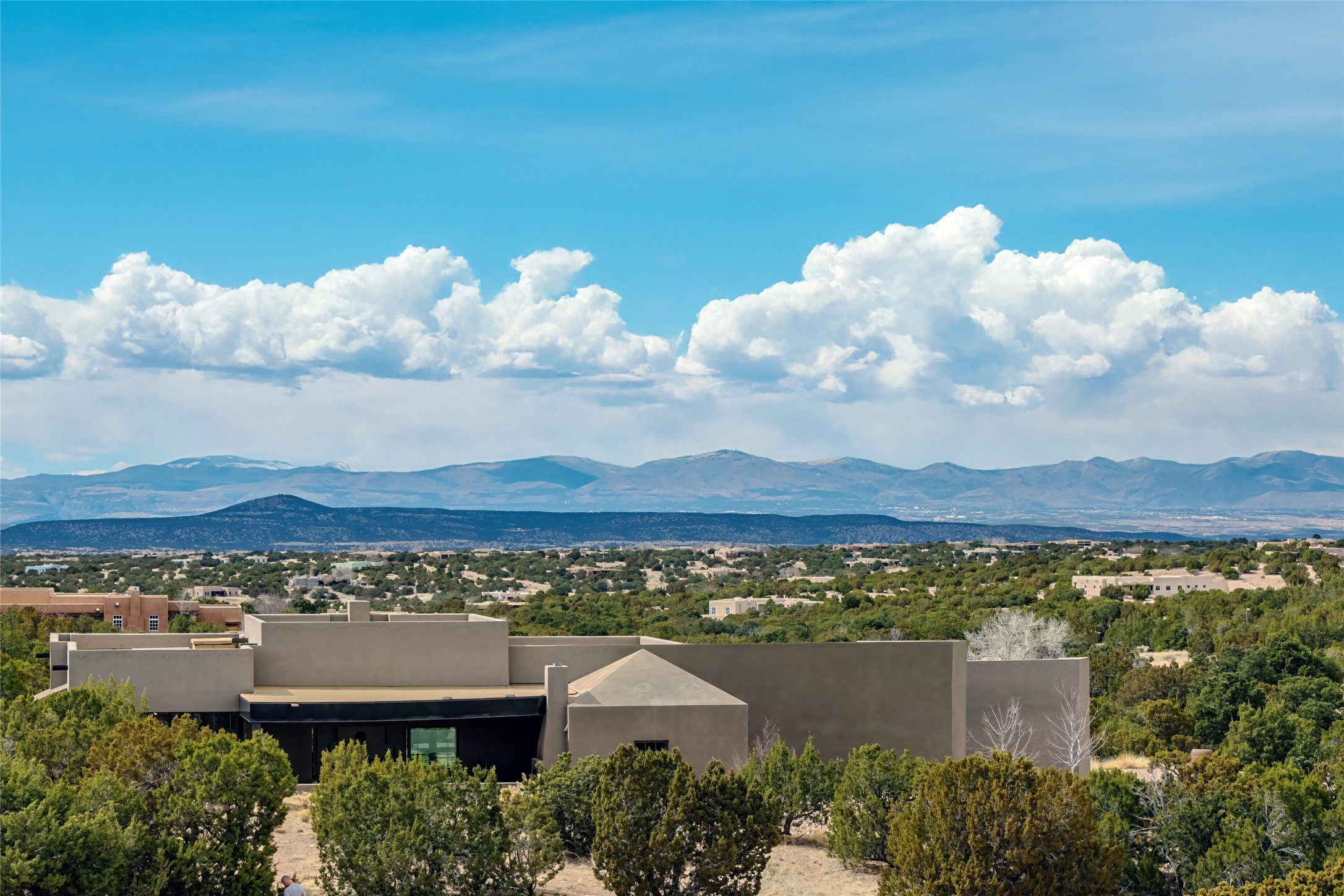 It's rare for a home to be art itself, but that is exactly what renowned builder Seth Anderson has created at 32 Sunflower. The dimensions and lines are sculptural, reflecting a thoughtful approach to modern architecture. The juxtaposition of light and shadow playing off the textured plaster walls create a dynamic yet warm and comforting environment. Smartly positioned on 2.32 acres within Las Campanas, the house takes in sweeping western sunset and mountain views on one side and the Sangre de Cristo Mountains on the other. From east to west, the outdoor spaces flow into and out of the interior living areas. An impressive entry framed by a 10-foot Mexican Zaguan-style door welcomes guests into an entry rich in detail with a black steel accent wall behind sits the powder room. From there, arched passageways define the flow of the home, leading to the open living, dining and kitchen area and beyond to the library on one end and the exquisite primary suite on the other. The kitchen is designed for both cooking and entertaining, with a large marble island marble, a walk-in pantry, and Subzero/Wolf appliances. The primary bathroom is truly special, serving as a private living space with an incredible shower of chiseled Italian limestone. The vanities and bathtub overlook views of the Jemez Mountains. A separate wing offers two guest bedrooms with a shared sitting room and bathroom. The home also features a large private office and a laundry room. In a world of facsimile, 32 Sunflower is unique not only in design concept but in the superior rendering of both its form and finishes.