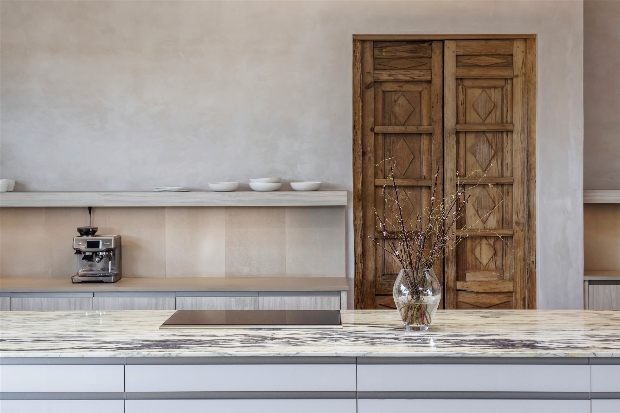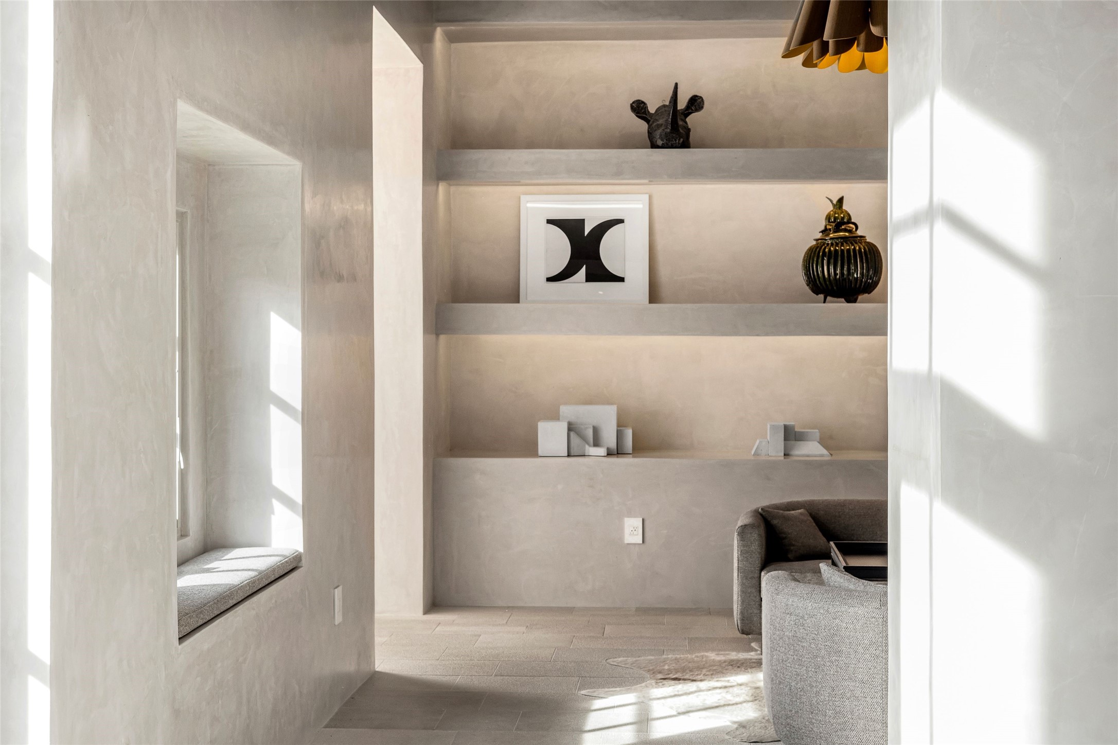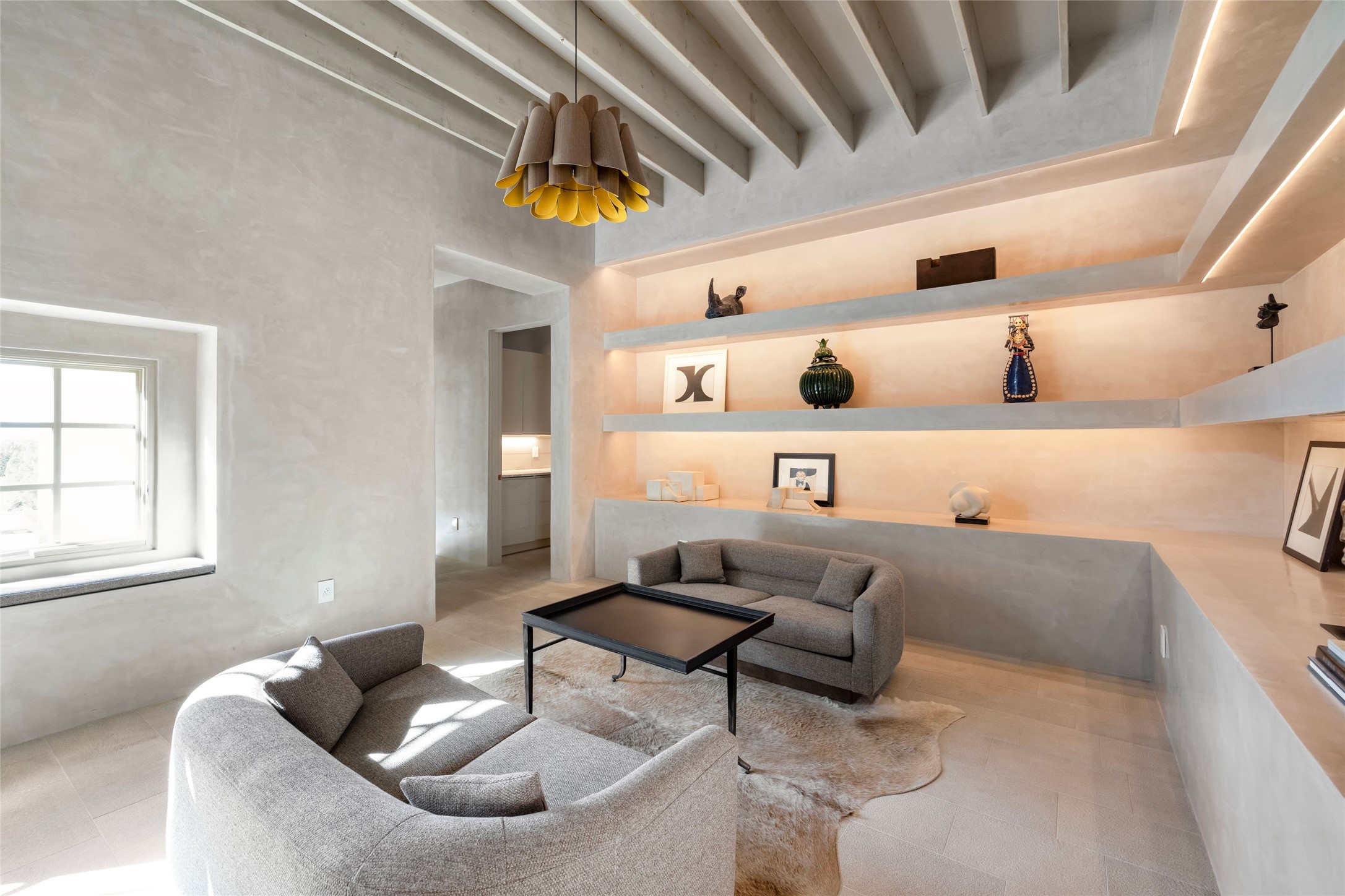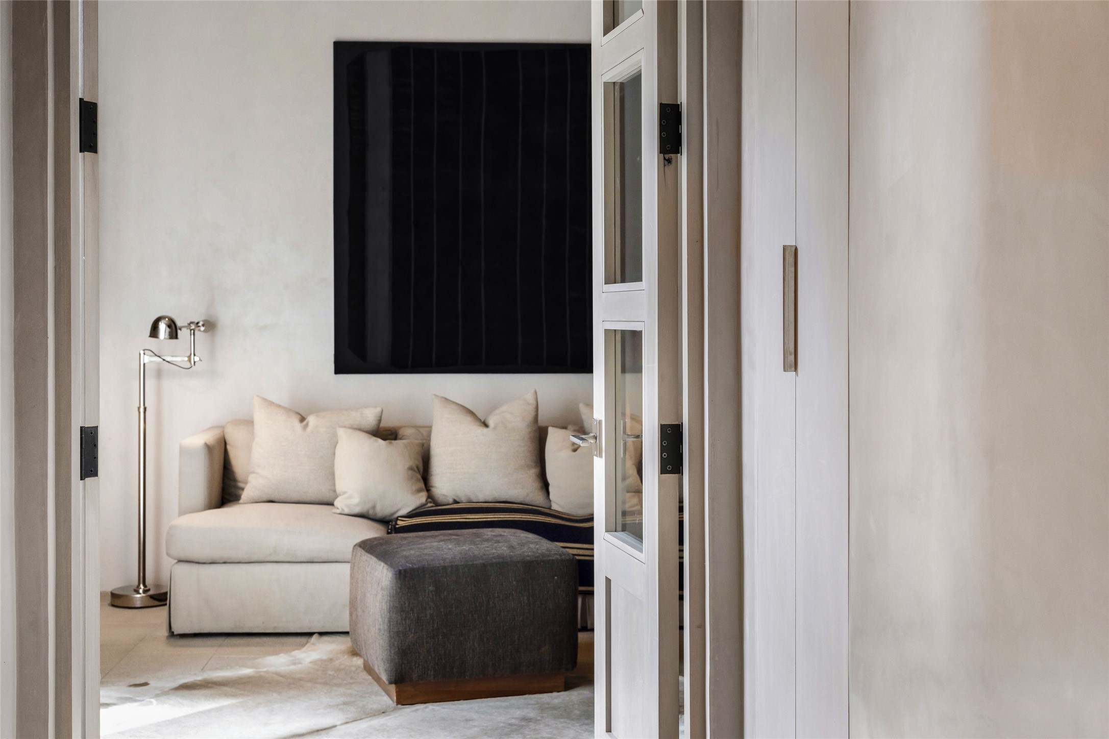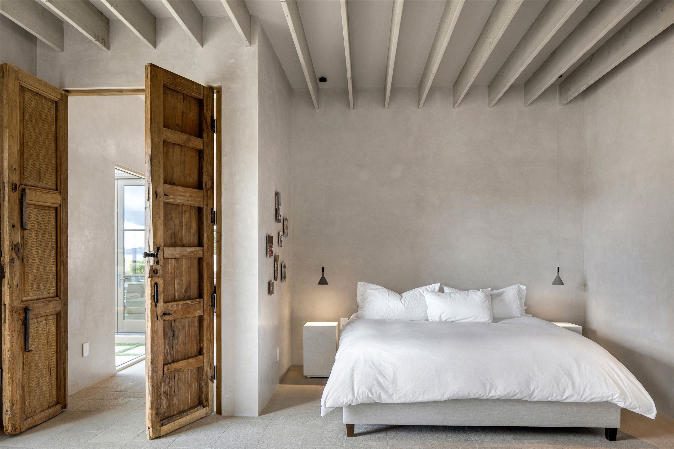 It's rare for a home to be art itself, but that is exactly what renowned builder Seth Anderson has created at 32 Sunflower. The dimensions and lines are sculptural, reflecting a thoughtful approach to modern architecture. The juxtaposition of light and shadow playing off the textured plaster walls create a dynamic yet warm and comforting environment. Smartly positioned on 2.32 acres within Las Campanas, the house takes in sweeping western sunset and mountain views on one side and the Sangre de Cristo Mountains on the other. From east to west, the outdoor spaces flow into and out of the interior living areas. An impressive entry framed by a 10-foot Mexican Zaguan-style door welcomes guests into an entry rich in detail with a black steel accent wall behind sits the powder room. From there, arched passageways define the flow of the home, leading to the open living, dining and kitchen area and beyond to the library on one end and the exquisite primary suite on the other. The kitchen is designed for both cooking and entertaining, with a large marble island marble, a walk-in pantry, and Subzero/Wolf appliances. The primary bathroom is truly special, serving as a private living space with an incredible shower of chiseled Italian limestone. The vanities and bathtub overlook views of the Jemez Mountains. A separate wing offers two guest bedrooms with a shared sitting room and bathroom. The home also features a large private office and a laundry room. In a world of facsimile, 32 Sunflower is unique not only in design concept but in the superior rendering of both its form and finishes.