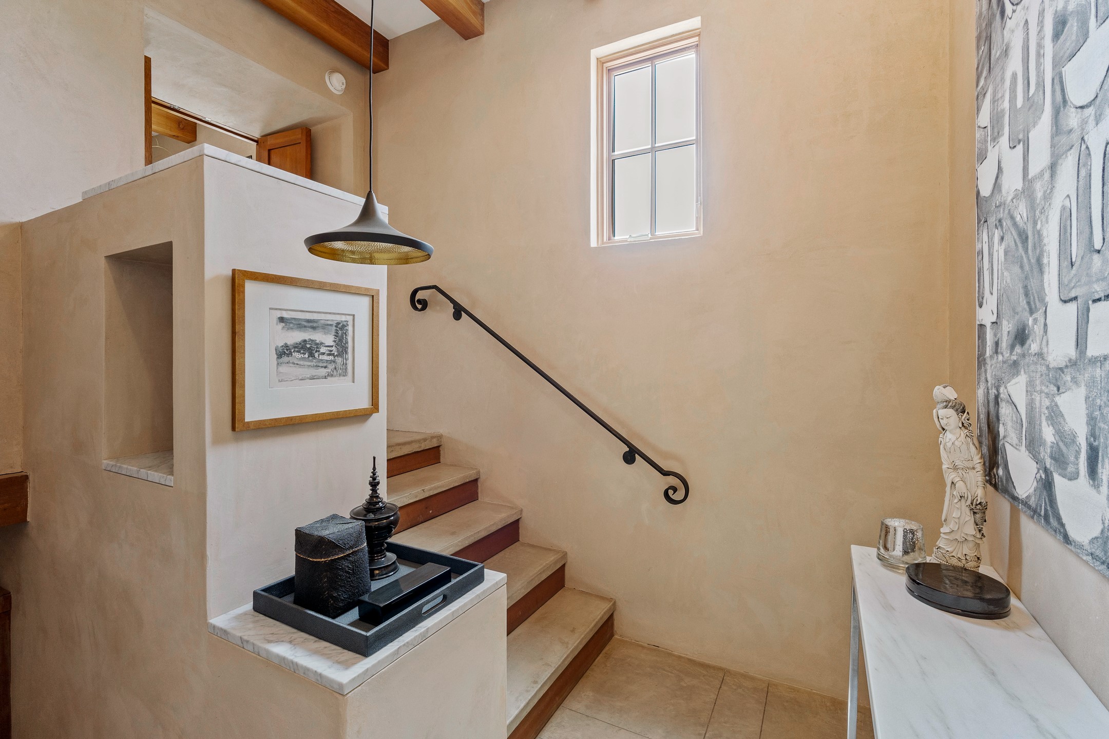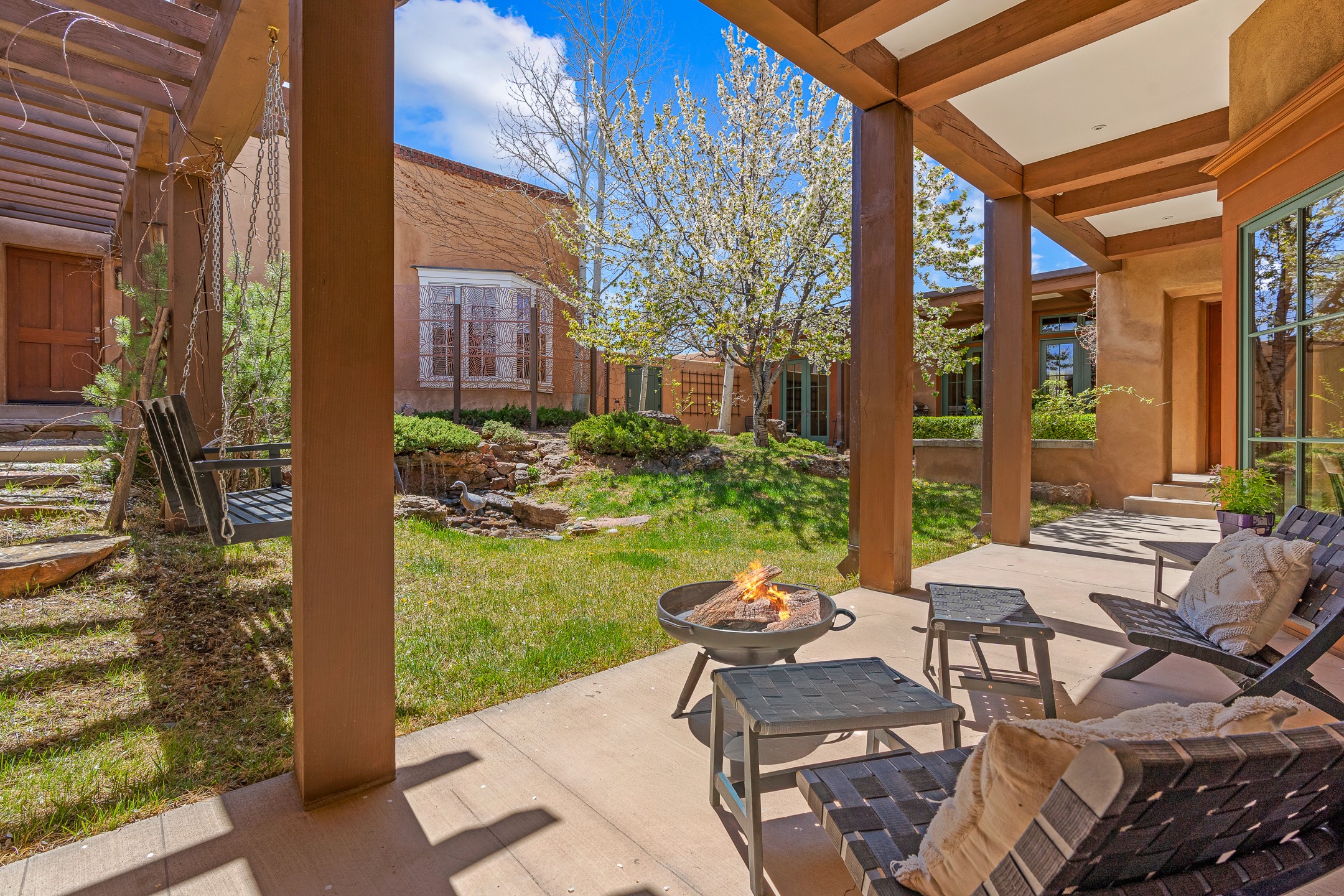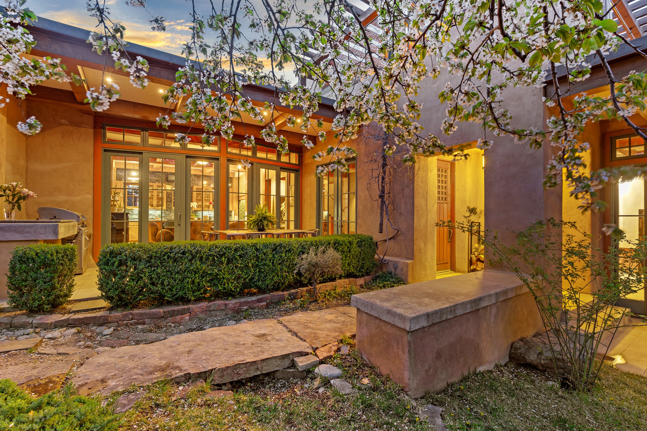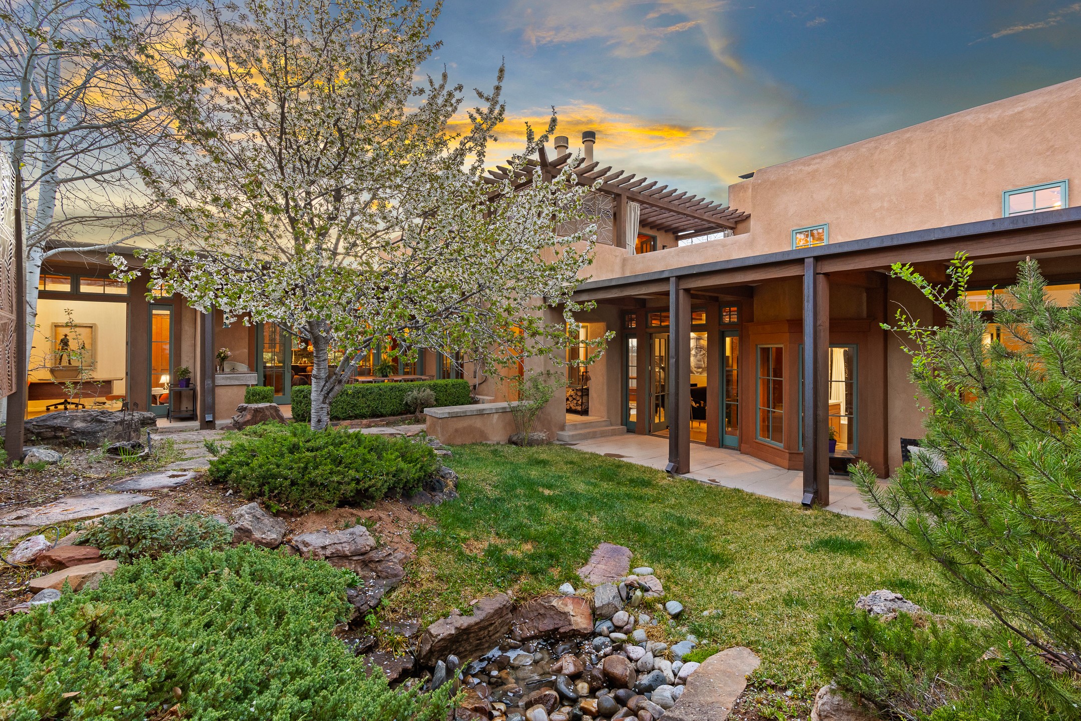 An Architectural & Design Masterpiece.A brilliant collaboration between renowned architect and designer has produced a serene, sophisticated sanctuary in one of Santa Fe's most desirable neighborhoods. This private, gated, 4-bedroom, 4-bath compound is located in the coveted Eastside along the Old Santa Fe trail just moments from the Plaza, Canyon Road, museums, shopping, and world-class dining. Recently elevated with extensive high-end upgrades, the property seamlessly blends quality craftsmanship with timeless elegance. Architectural highlights include soaring ceilings, natural American Clay plaster walls, Douglas Fir coffered wood beam ceilings, and dramatic floor-to-ceiling transom windows. Expertly curated lighting creates a warm and refined ambiance throughout. At the heart of the home is a stunning chef's kitchen--outfitted with a Subzero refrigerator and new Viking appliances--overlooking a beautifully landscaped central courtyard designed for effortless indoor/outdoor living. Each room opens to this verdant garden oasis featuring a tranquil waterfall fountain, lush greenery, alfresco dining, and multiple verandas for entertaining. The grand living and dining rooms are anchored by a natural stone fireplace and expansive glass doors that frame a courtyard garden with mature Wisteria, Aspen, and a stately Cherry tree. Upstairs, the luxurious primary suite offers breathtaking views of Picacho Peak and includes a spa-like bath with Jacuzzi tub, steam shower, dual vanities, and walk-in closet. The crown jewel: a private rooftop terrace with fireplace, cedar hot tub, sauna, and wrap-around deck--perfect for starry Santa Fe nights. Additional amenities include a 2.5-car garage, new mini splits, recessed lighting, designer tile work, and custom draperies. This property is currently part of a rare compound opportunity with 994 Old Pecos Trail next door. While both homes are offered individually, a buyer also has the unique opportunity to purchase them together and create an extraordinary multi-residence estate. (See listing #202501401.)