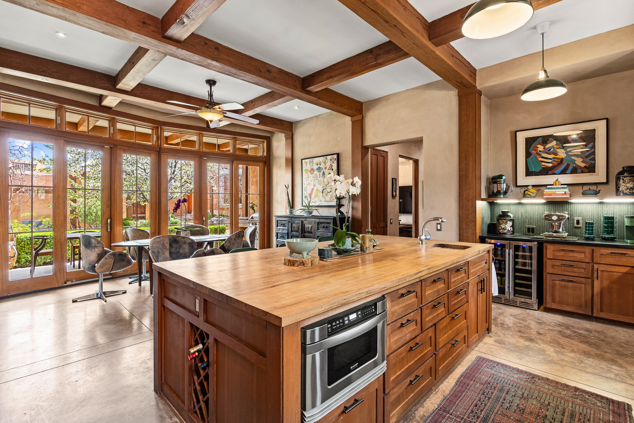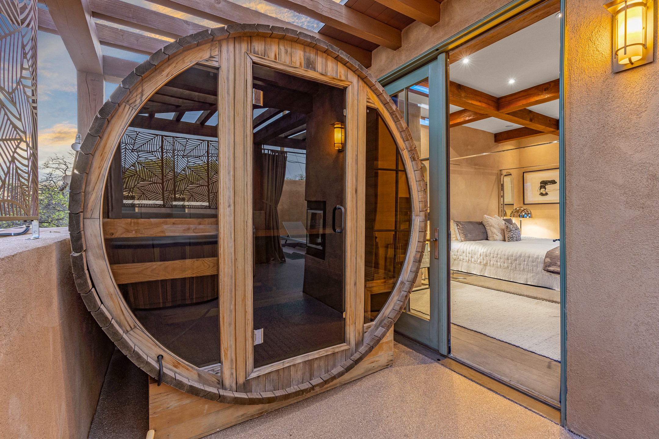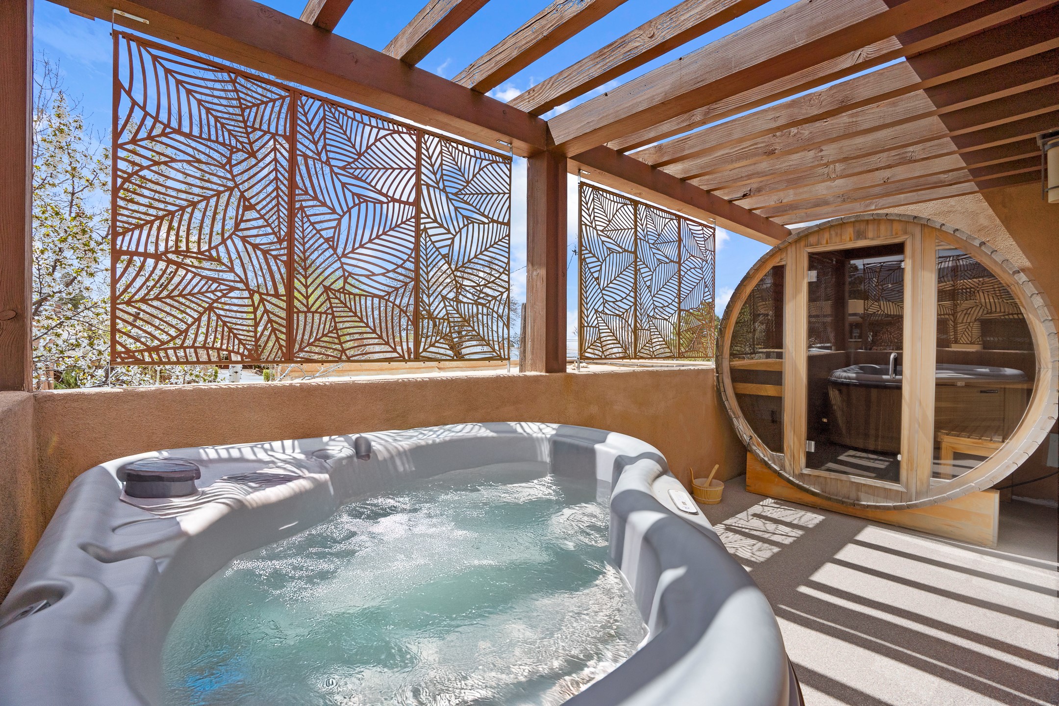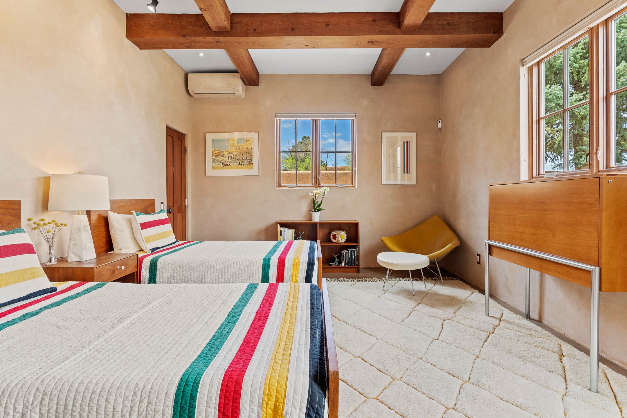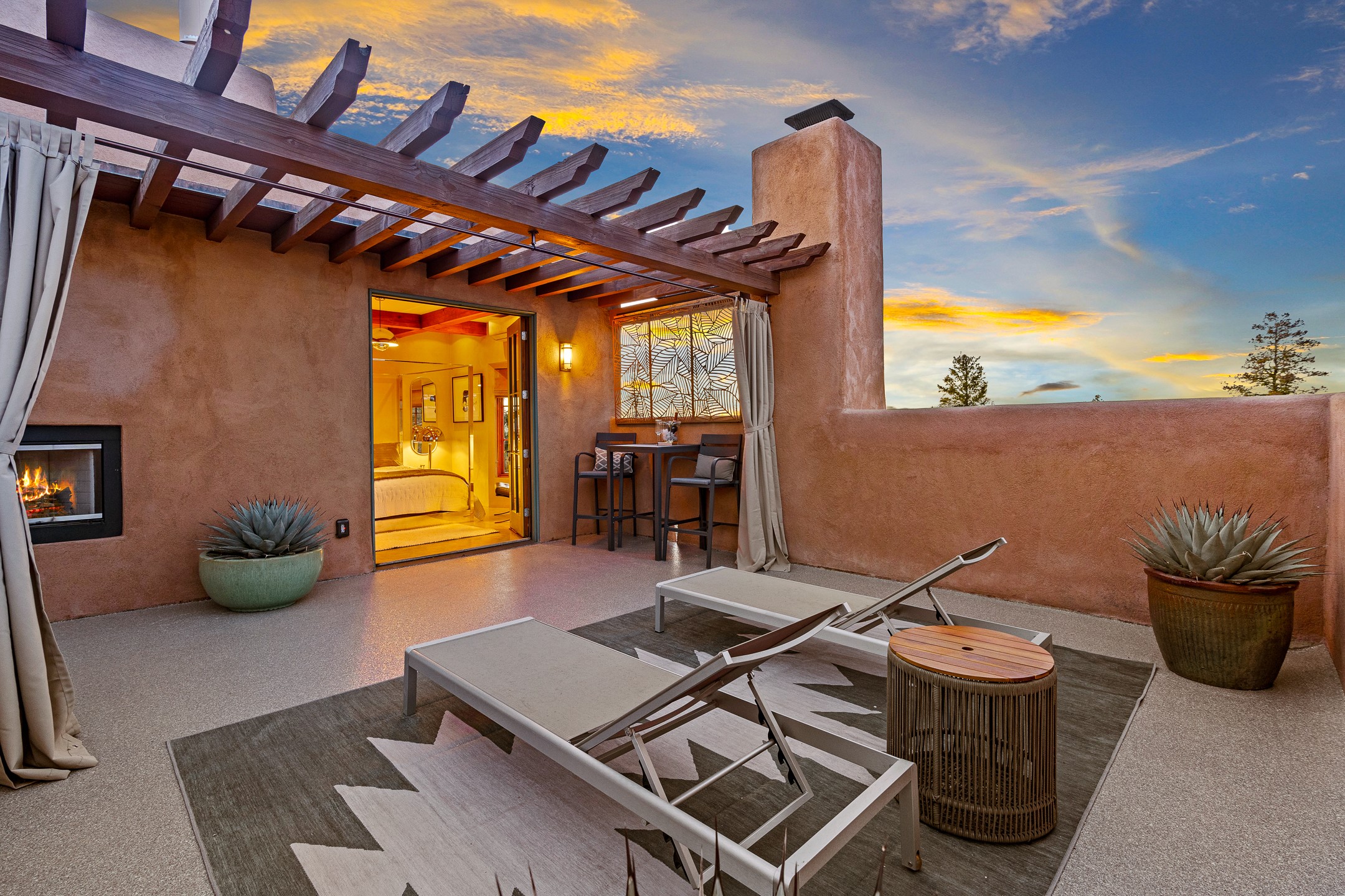 An Architectural & Design Masterpiece.A brilliant collaboration between renowned architect and designer has produced a serene, sophisticated sanctuary in one of Santa Fe's most desirable neighborhoods. This private, gated, 4-bedroom, 4-bath compound is located in the coveted Eastside along the Old Santa Fe trail just moments from the Plaza, Canyon Road, museums, shopping, and world-class dining. Recently elevated with extensive high-end upgrades, the property seamlessly blends quality craftsmanship with timeless elegance. Architectural highlights include soaring ceilings, natural American Clay plaster walls, Douglas Fir coffered wood beam ceilings, and dramatic floor-to-ceiling transom windows. Expertly curated lighting creates a warm and refined ambiance throughout. At the heart of the home is a stunning chef's kitchen--outfitted with a Subzero refrigerator and new Viking appliances--overlooking a beautifully landscaped central courtyard designed for effortless indoor/outdoor living. Each room opens to this verdant garden oasis featuring a tranquil waterfall fountain, lush greenery, alfresco dining, and multiple verandas for entertaining. The grand living and dining rooms are anchored by a natural stone fireplace and expansive glass doors that frame a courtyard garden with mature Wisteria, Aspen, and a stately Cherry tree. Upstairs, the luxurious primary suite offers breathtaking views of Picacho Peak and includes a spa-like bath with Jacuzzi tub, steam shower, dual vanities, and walk-in closet. The crown jewel: a private rooftop terrace with fireplace, cedar hot tub, sauna, and wrap-around deck--perfect for starry Santa Fe nights. Additional amenities include a 2.5-car garage, new mini splits, recessed lighting, designer tile work, and custom draperies. This property is currently part of a rare compound opportunity with 994 Old Pecos Trail next door. While both homes are offered individually, a buyer also has the unique opportunity to purchase them together and create an extraordinary multi-residence estate. (See listing #202501401.)