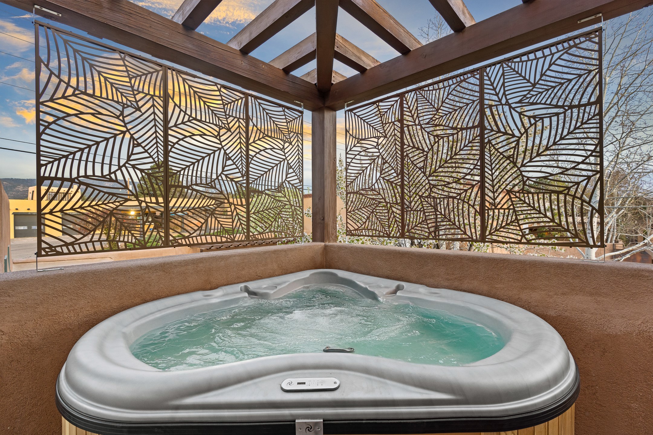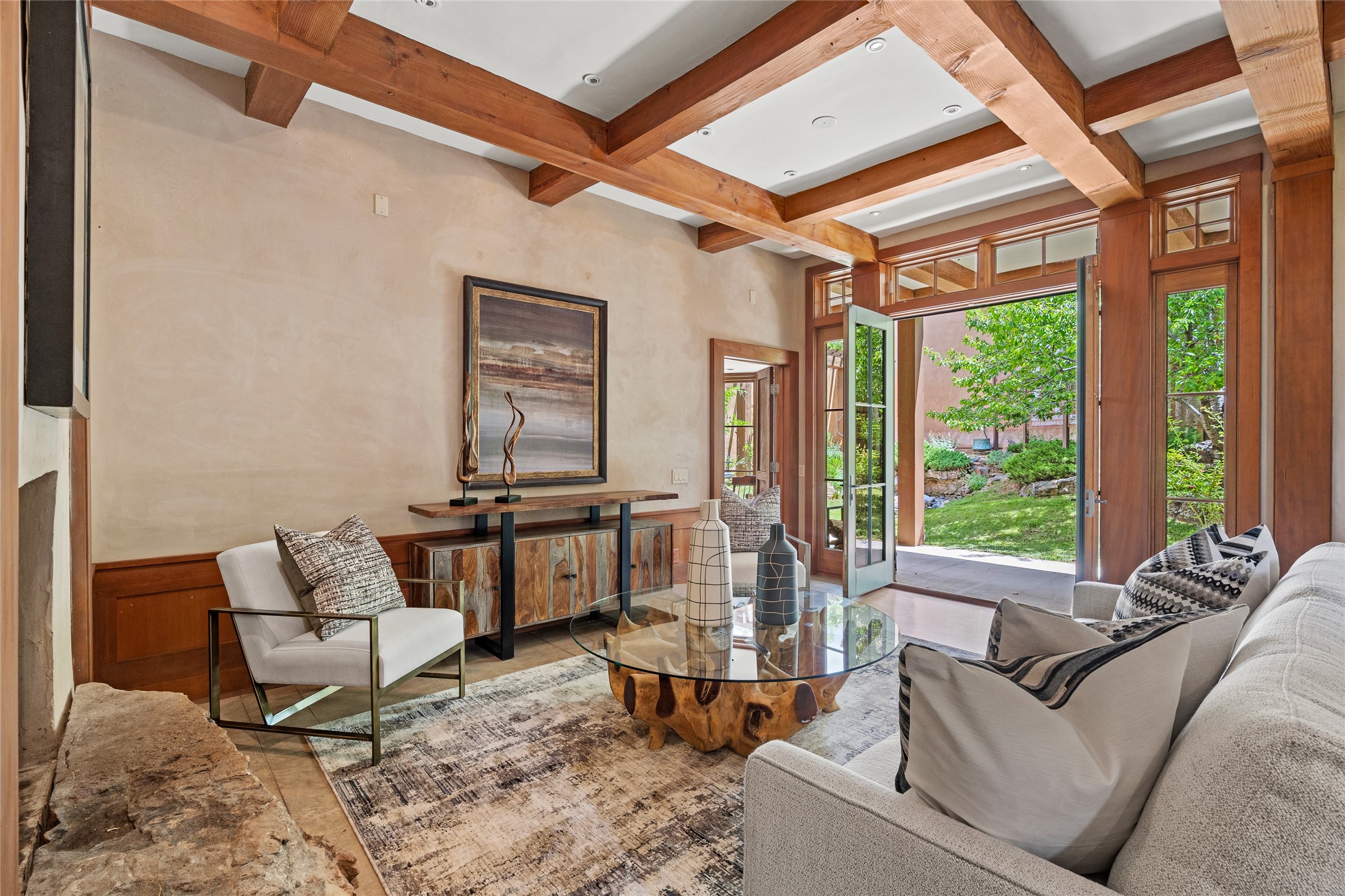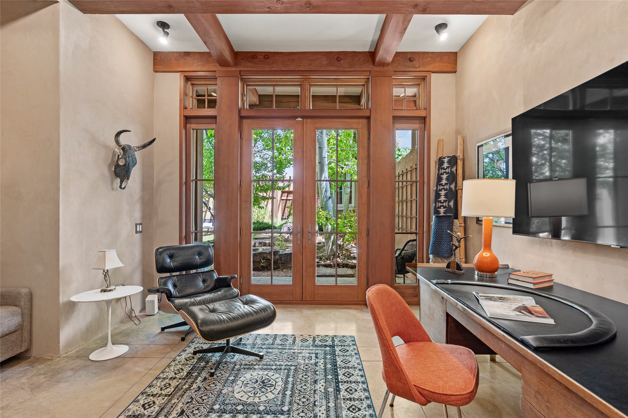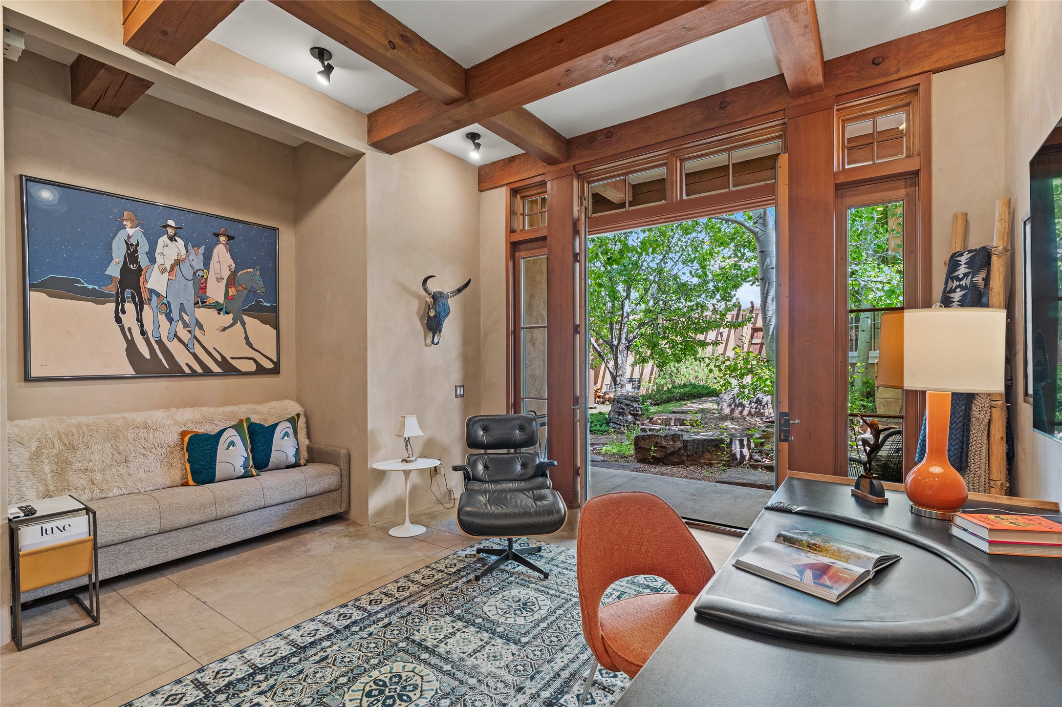 An Architectural & Design Masterpiece.A brilliant collaboration between renowned architect and designer has produced a serene, sophisticated sanctuary in one of Santa Fe's most desirable neighborhoods. This private, gated, 4-bedroom, 4-bath compound is located in the coveted Eastside along the Old Santa Fe trail just moments from the Plaza, Canyon Road, museums, shopping, and world-class dining. Recently elevated with extensive high-end upgrades, the property seamlessly blends quality craftsmanship with timeless elegance. Architectural highlights include soaring ceilings, natural American Clay plaster walls, Douglas Fir coffered wood beam ceilings, and dramatic floor-to-ceiling transom windows. Expertly curated lighting creates a warm and refined ambiance throughout. At the heart of the home is a stunning chef's kitchen--outfitted with a Subzero refrigerator and new Viking appliances--overlooking a beautifully landscaped central courtyard designed for effortless indoor/outdoor living. Each room opens to this verdant garden oasis featuring a tranquil waterfall fountain, lush greenery, alfresco dining, and multiple verandas for entertaining. The grand living and dining rooms are anchored by a natural stone fireplace and expansive glass doors that frame a courtyard garden with mature Wisteria, Aspen, and a stately Cherry tree. Upstairs, the luxurious primary suite offers breathtaking views of Picacho Peak and includes a spa-like bath with Jacuzzi tub, steam shower, dual vanities, and walk-in closet. The crown jewel: a private rooftop terrace with fireplace, cedar hot tub, sauna, and wrap-around deck--perfect for starry Santa Fe nights. Additional amenities include a 2.5-car garage, new mini splits, recessed lighting, designer tile work, and custom draperies. This property is currently part of a rare compound opportunity with 994 Old Pecos Trail next door. While both homes are offered individually, a buyer also has the unique opportunity to purchase them together and create an extraordinary multi-residence estate. (See listing #202501401.)