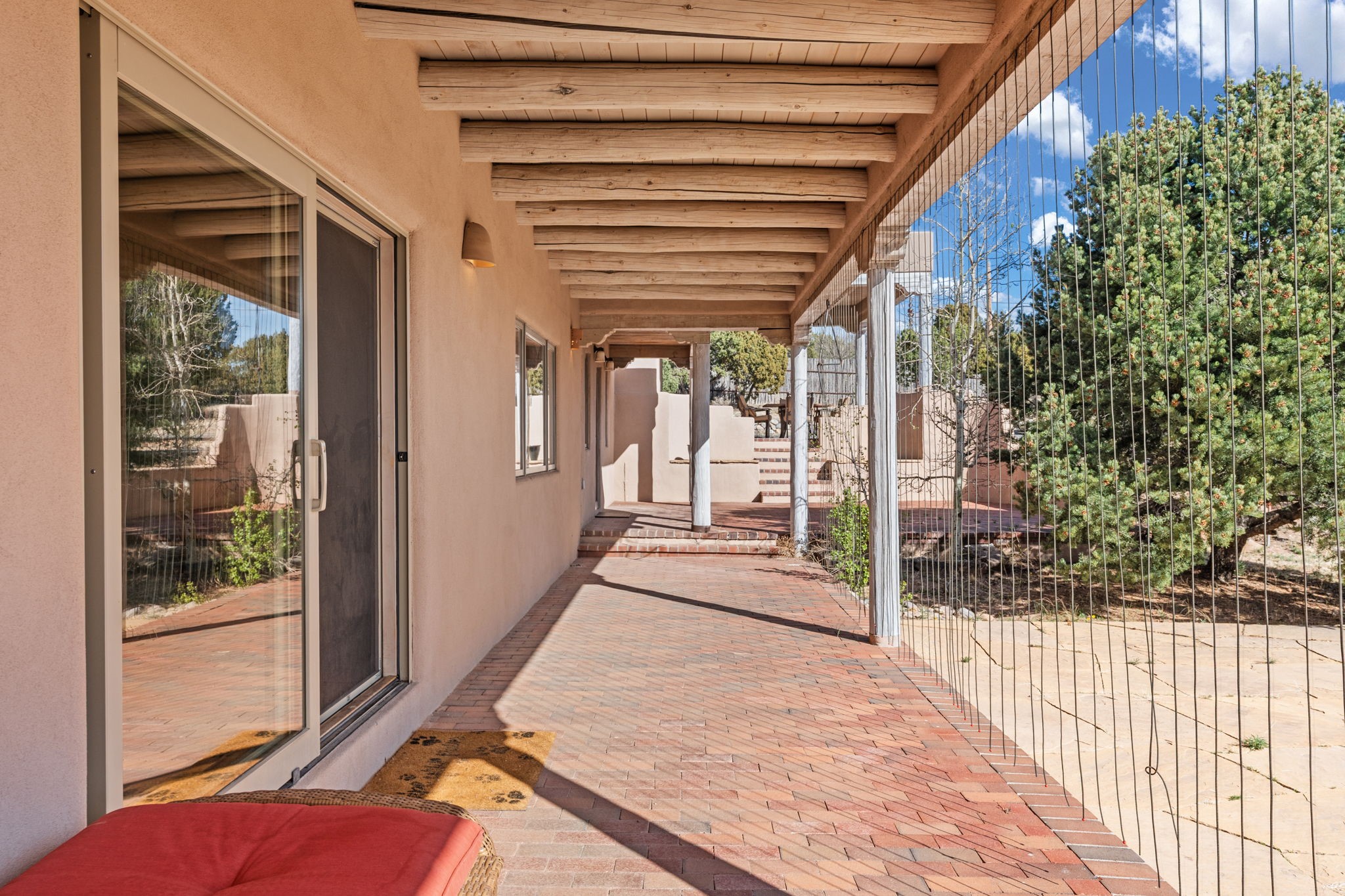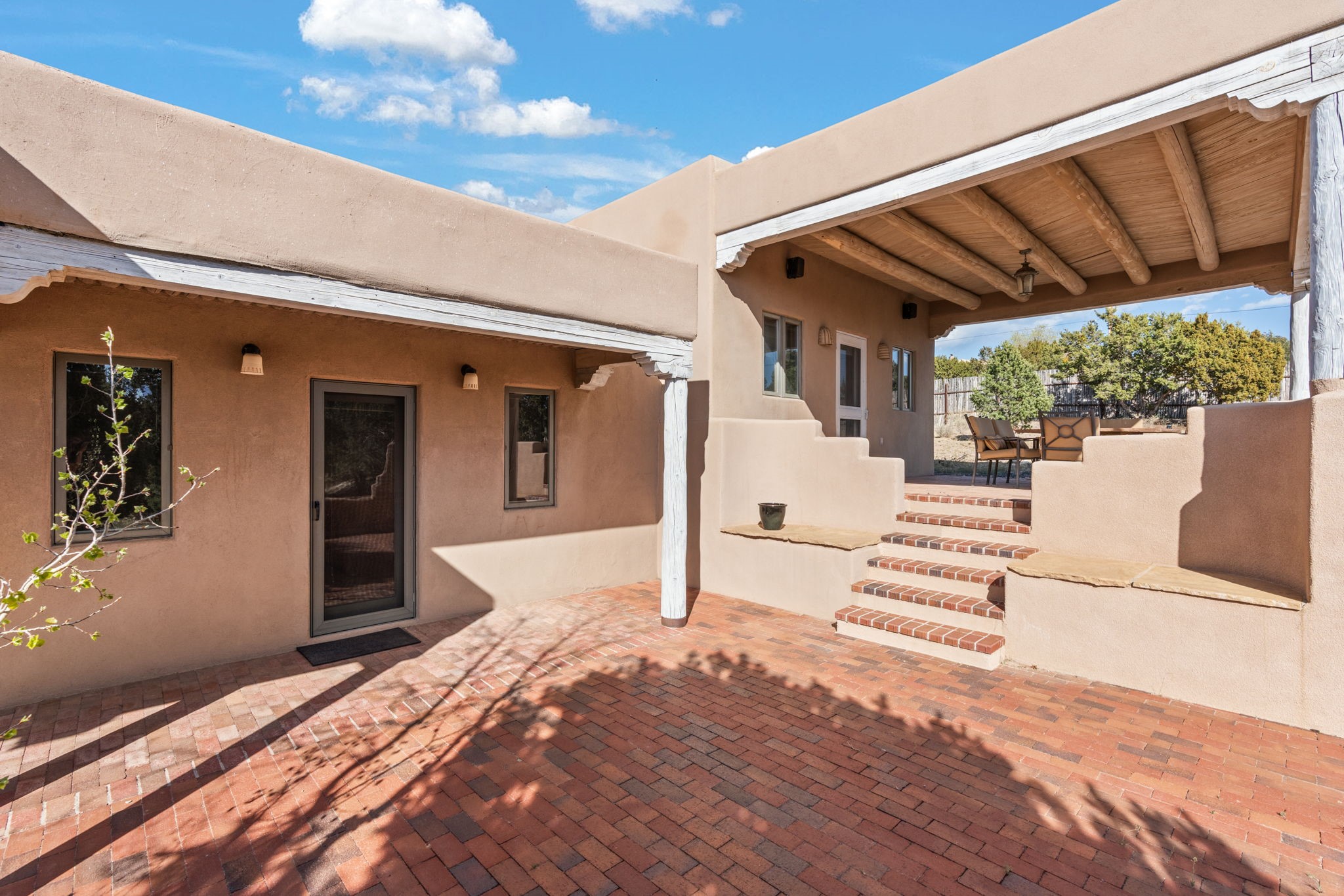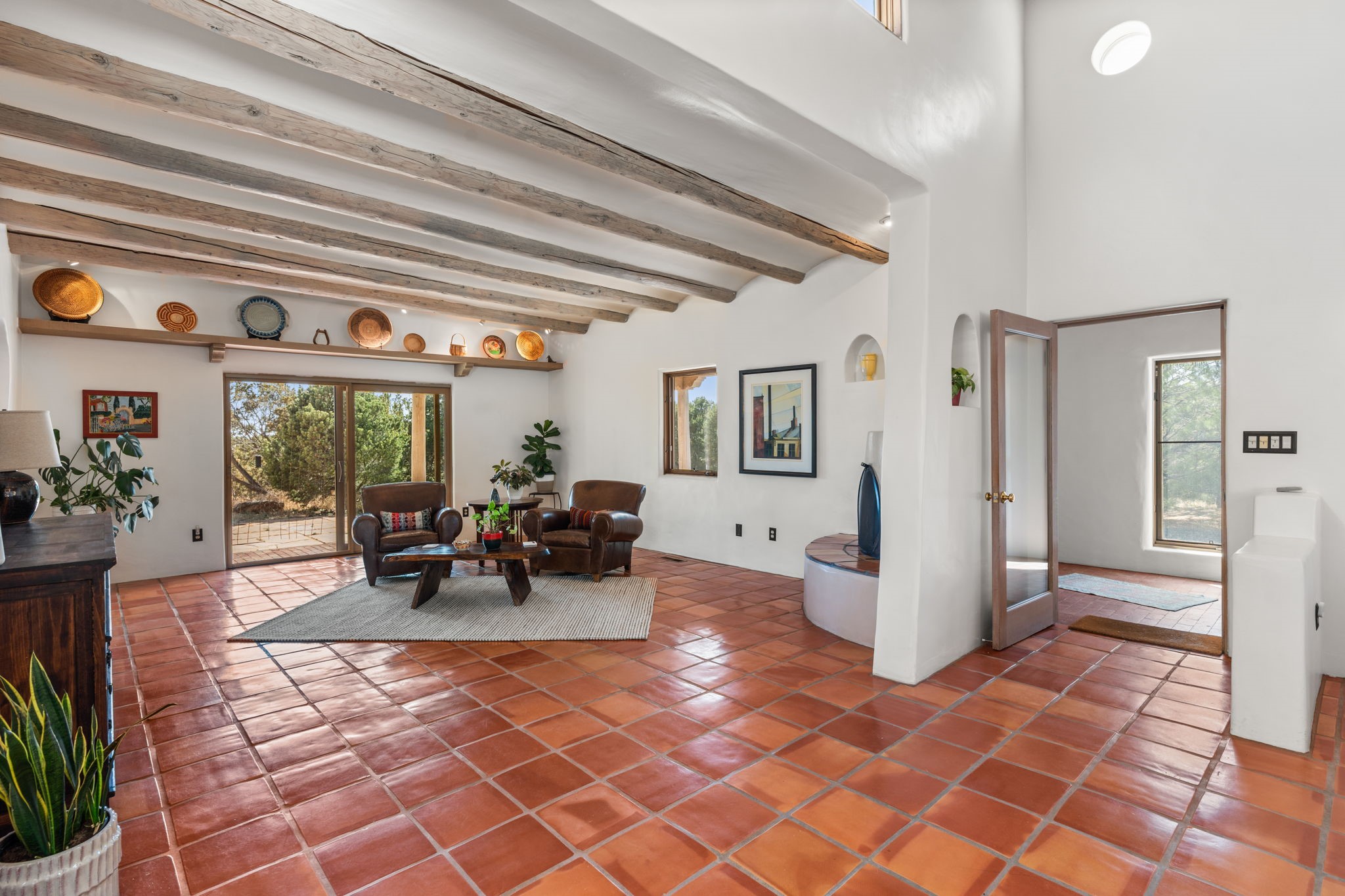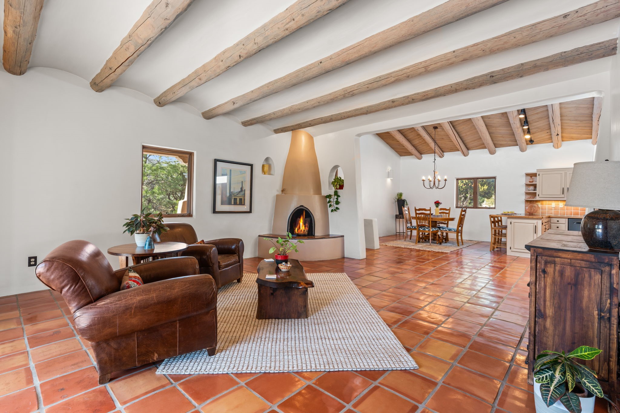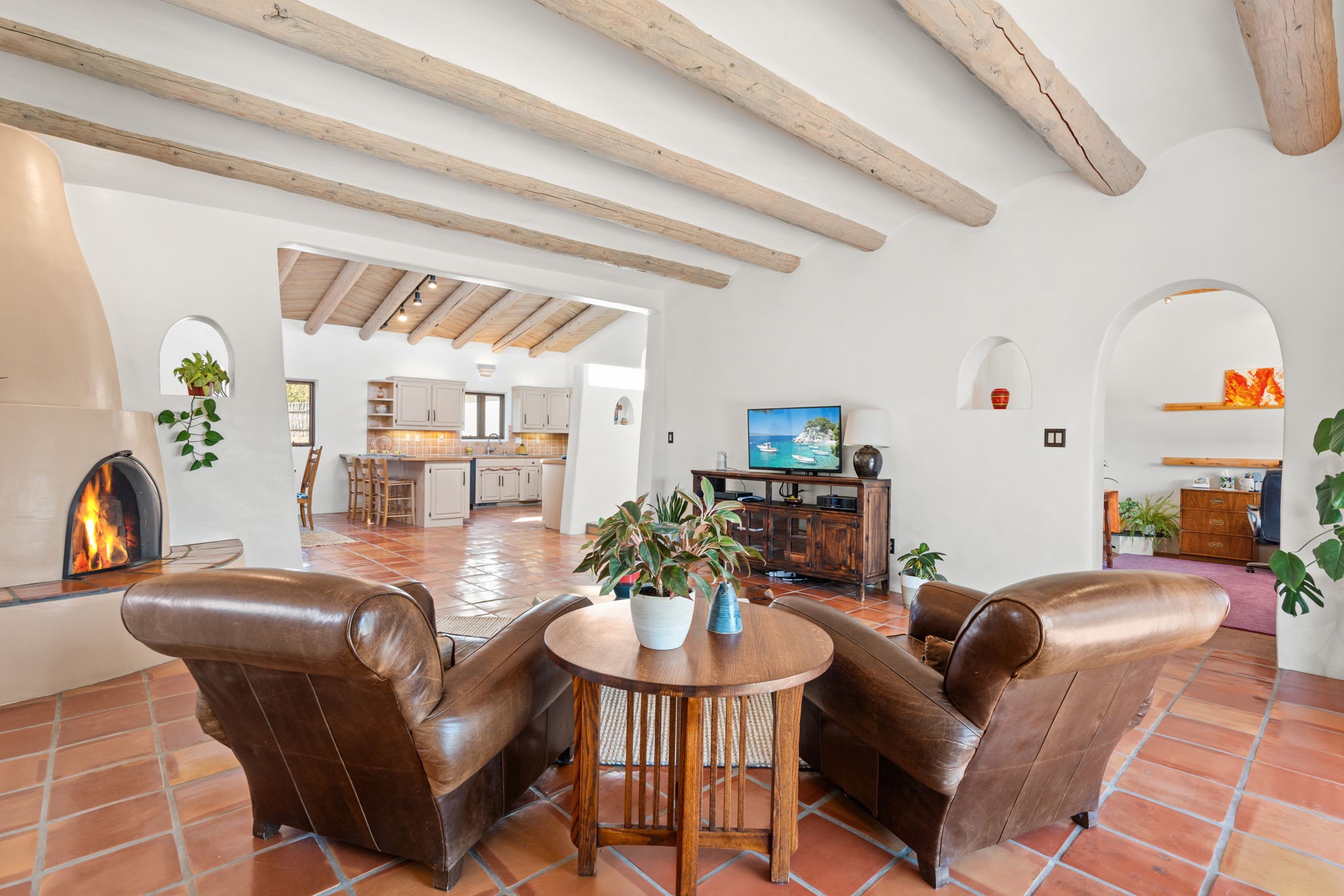 Welcome to your dream retreat: a 3,956-square-foot haven where classic Southwestern charm meets modern comfort. Located just minutes from downtown, this thoughtfully designed 3-bedroom, 3-bath home sits on 1.08 private acres with no HOA.Inside, you'll find Saltillo tile floors, hand-troweled plaster walls, and a generous living room with coved ceilings and abundant natural light. Clerestory windows and skylights fill the home with sunshine, and a sliding door opens to a stunning wraparound portal--perfect for year-round entertaining or quiet evenings under the stars.The kitchen is a chef's delight with newer appliances, ample cabinetry, and a spacious walk-in pantry. A charming office features traditional vigas and a latilla ceiling, ideal as a serene workspace or studio.The primary suite offers a corner kiva fireplace, two walk-in closets, and a private portal entrance. The updated en-suite bath includes a deep jetted tub and custom tile. The guest bath features a colorful Mexican tile arch over the tub for added charm.A lovely newer addition expands the living space with hickory wood floors, two bright bedrooms, a stylish bath with sun shower, and a large den with a fireplace, wood stove insert, built-ins, kitchenette, and wet bar. One bedroom has its own portal entrance for added privacy.Modern comforts include forced air heat, refrigerated air, and in-floor radiant heat in the newer section. Outside, you'll find a one-car garage, two-car carport, and a versatile studio once used for pottery--now a great workout space or creative workshop.This special home blends timeless Santa Fe architecture with thoughtful updates and artistic flair. More than a home--it's a lifestyle.