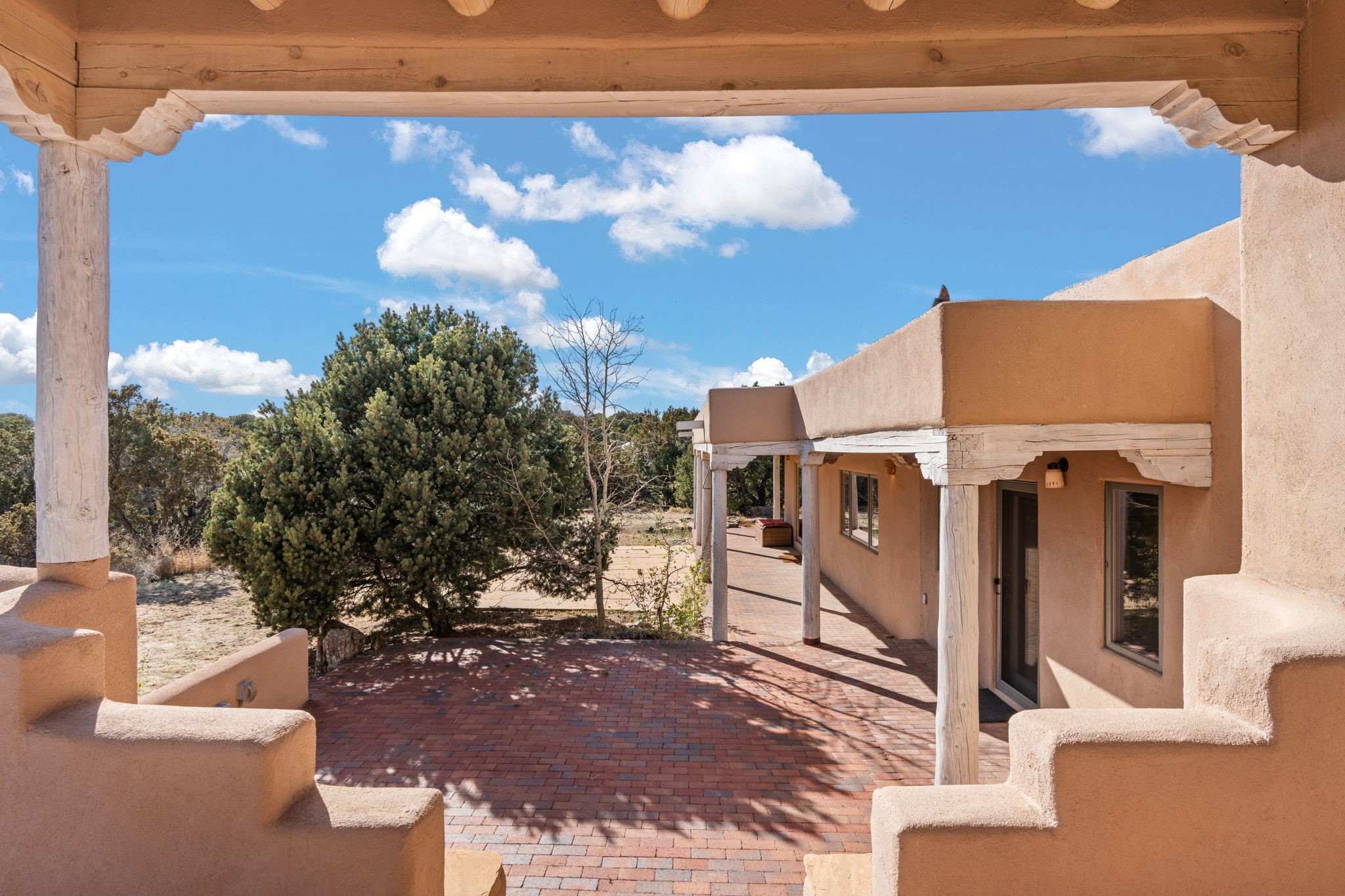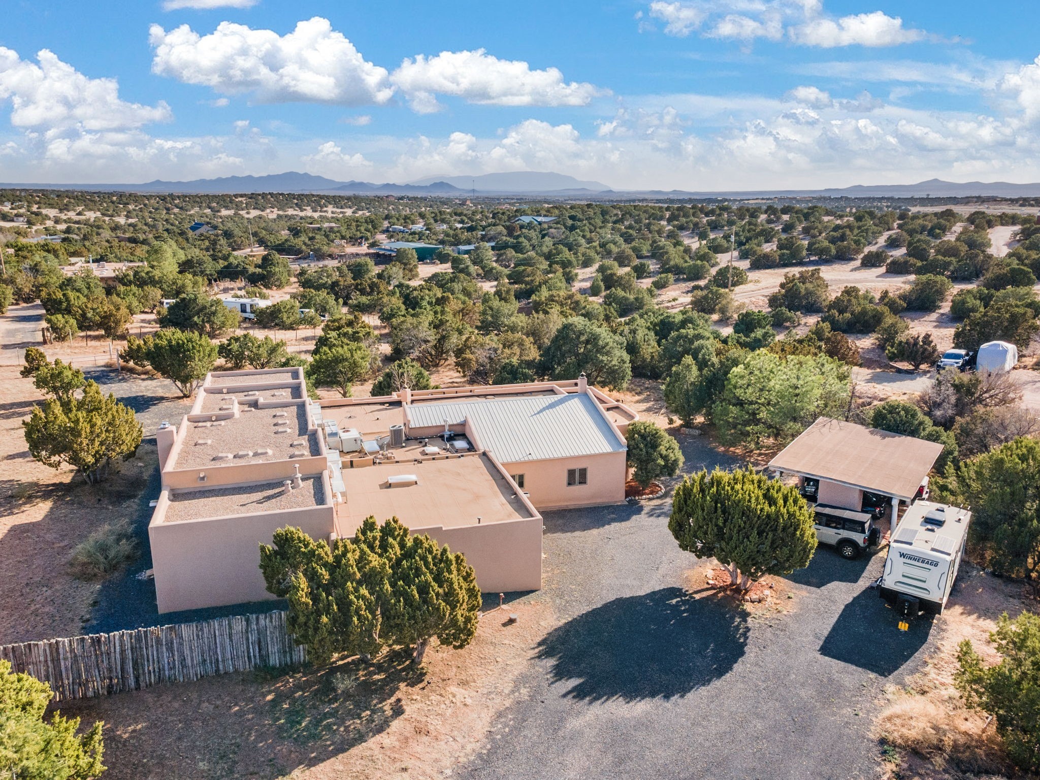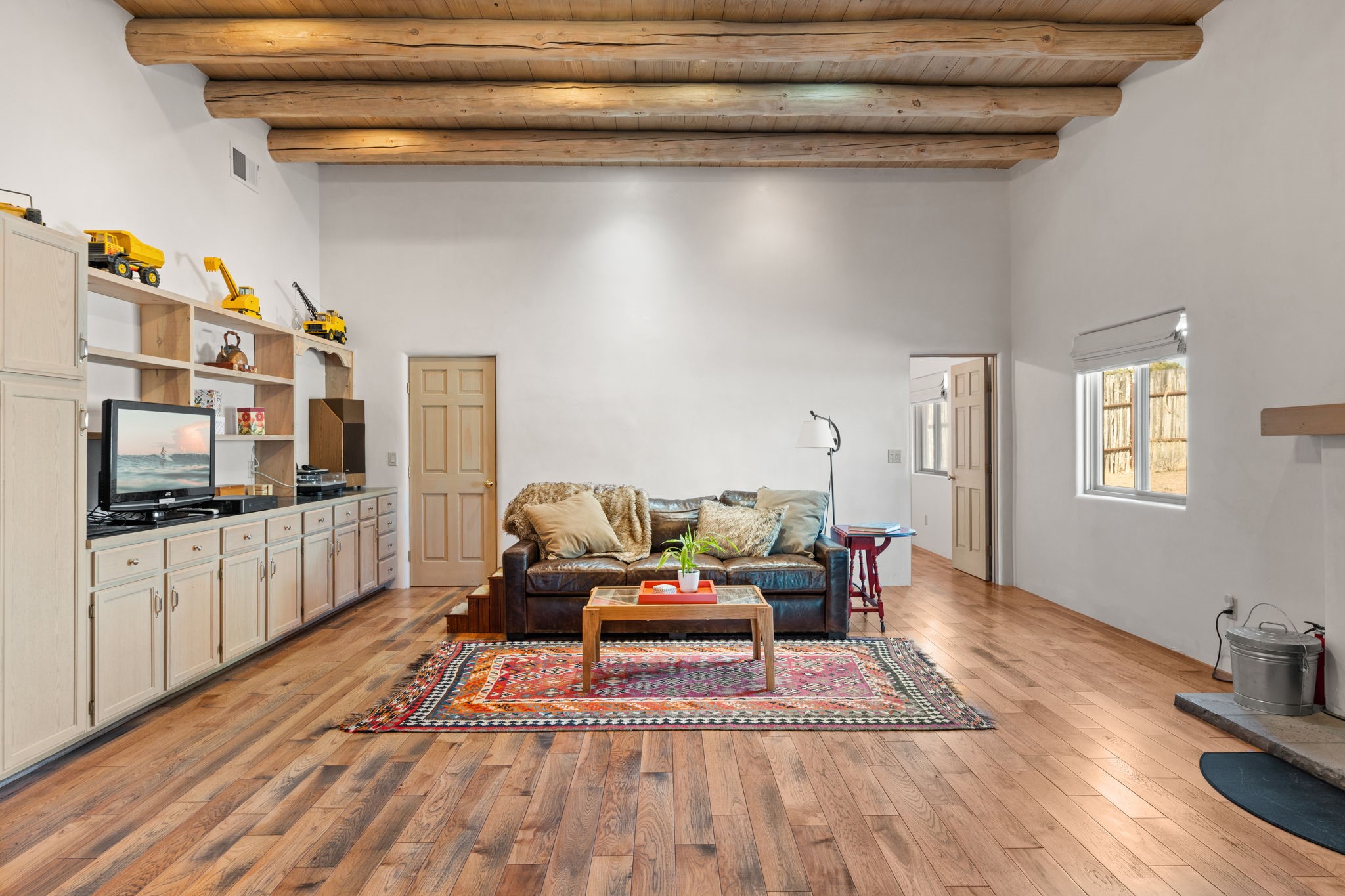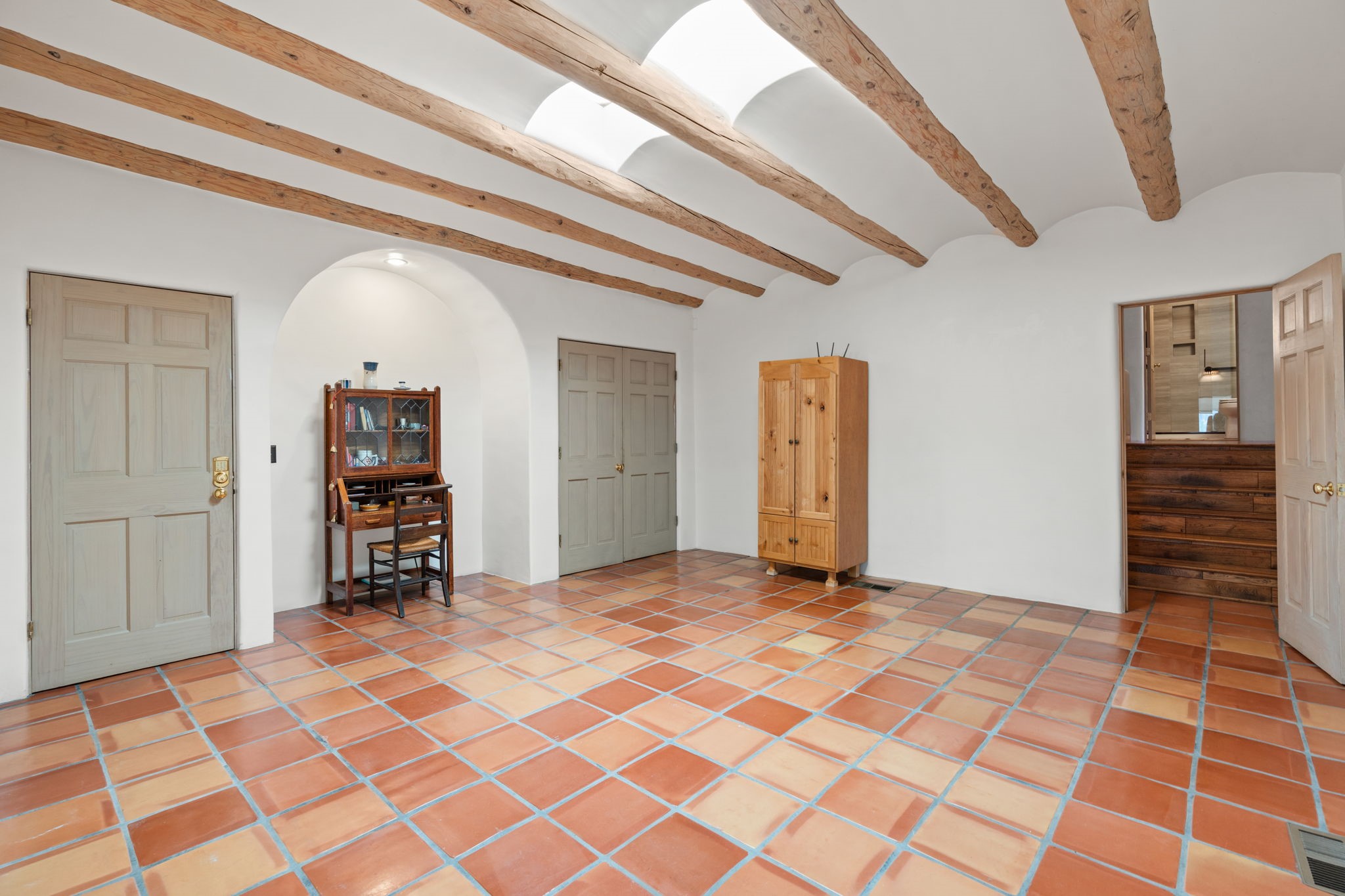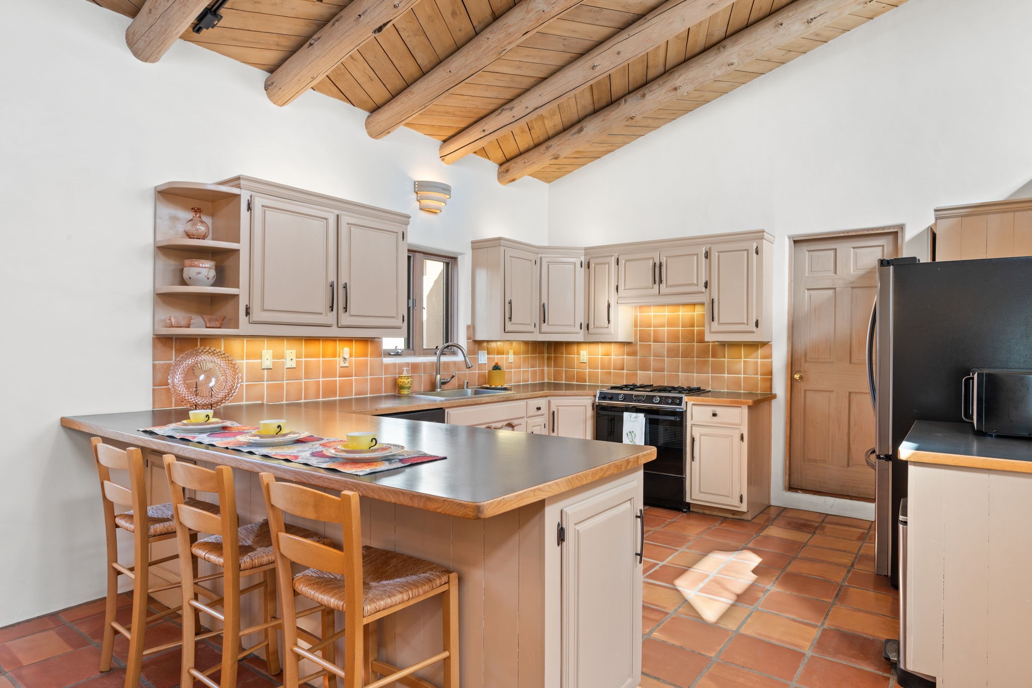 Welcome to your dream retreat: a 3,956-square-foot haven where classic Southwestern charm meets modern comfort. Located just minutes from downtown, this thoughtfully designed 3-bedroom, 3-bath home sits on 1.08 private acres with no HOA.Inside, you'll find Saltillo tile floors, hand-troweled plaster walls, and a generous living room with coved ceilings and abundant natural light. Clerestory windows and skylights fill the home with sunshine, and a sliding door opens to a stunning wraparound portal--perfect for year-round entertaining or quiet evenings under the stars.The kitchen is a chef's delight with newer appliances, ample cabinetry, and a spacious walk-in pantry. A charming office features traditional vigas and a latilla ceiling, ideal as a serene workspace or studio.The primary suite offers a corner kiva fireplace, two walk-in closets, and a private portal entrance. The updated en-suite bath includes a deep jetted tub and custom tile. The guest bath features a colorful Mexican tile arch over the tub for added charm.A lovely newer addition expands the living space with hickory wood floors, two bright bedrooms, a stylish bath with sun shower, and a large den with a fireplace, wood stove insert, built-ins, kitchenette, and wet bar. One bedroom has its own portal entrance for added privacy.Modern comforts include forced air heat, refrigerated air, and in-floor radiant heat in the newer section. Outside, you'll find a one-car garage, two-car carport, and a versatile studio once used for pottery--now a great workout space or creative workshop.This special home blends timeless Santa Fe architecture with thoughtful updates and artistic flair. More than a home--it's a lifestyle.