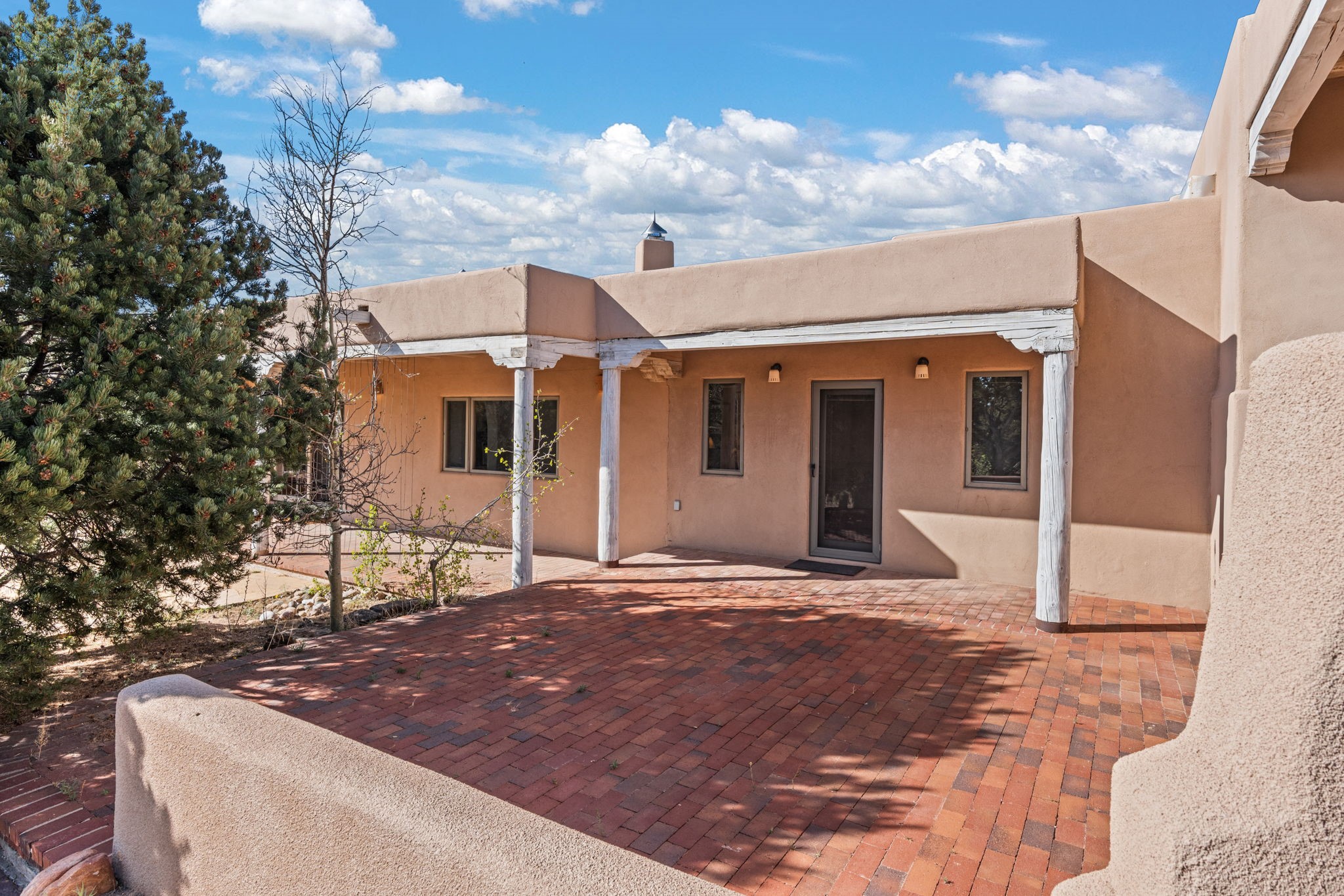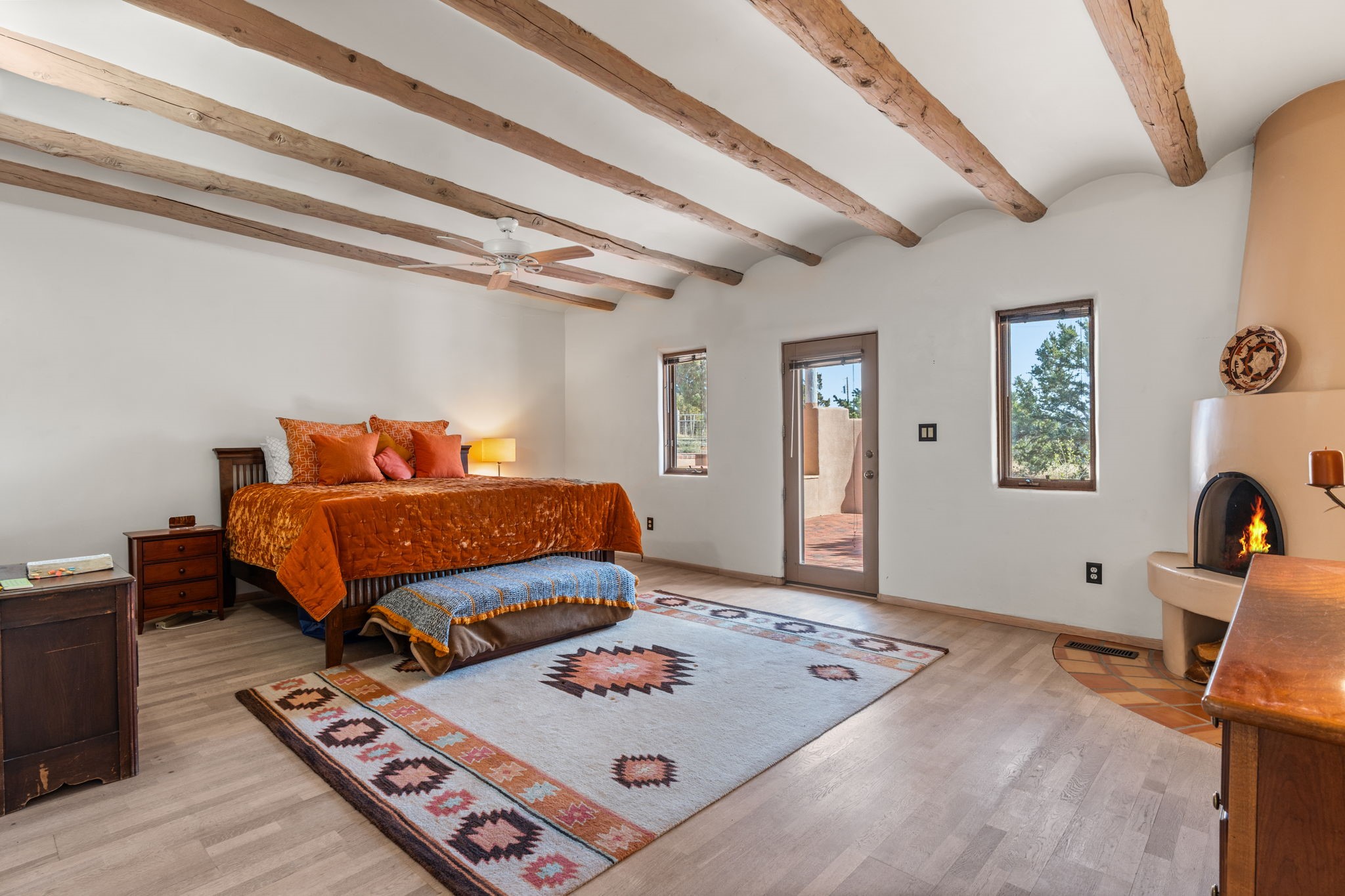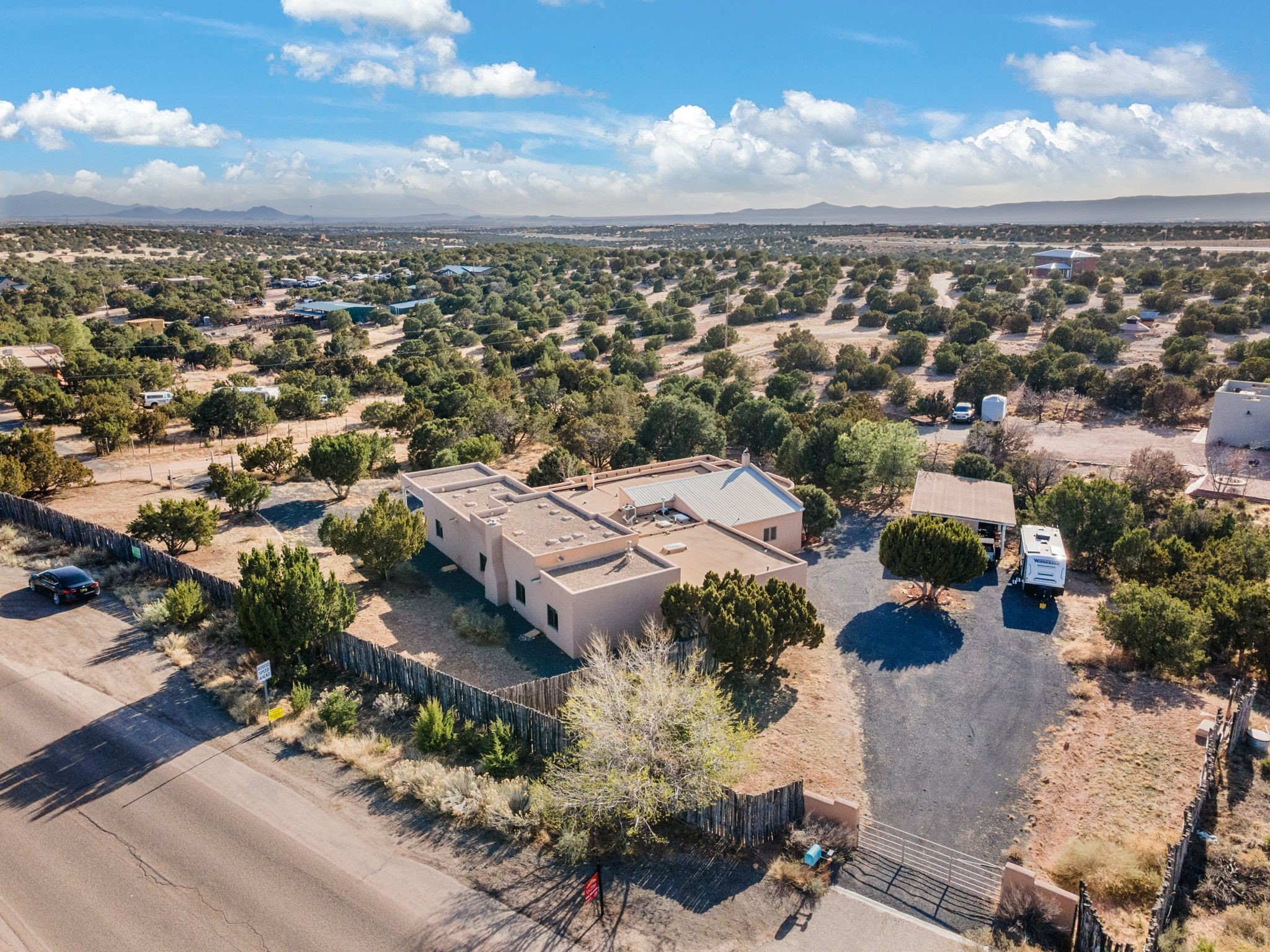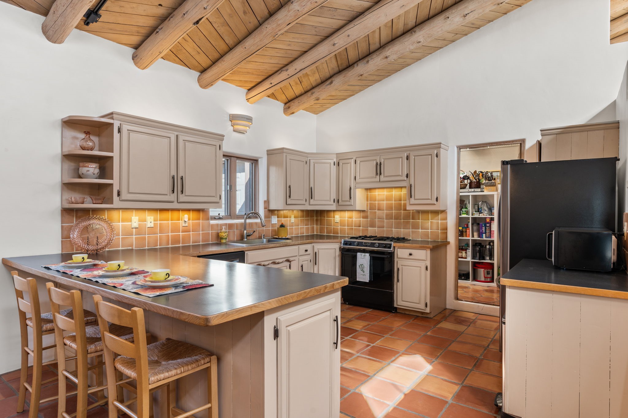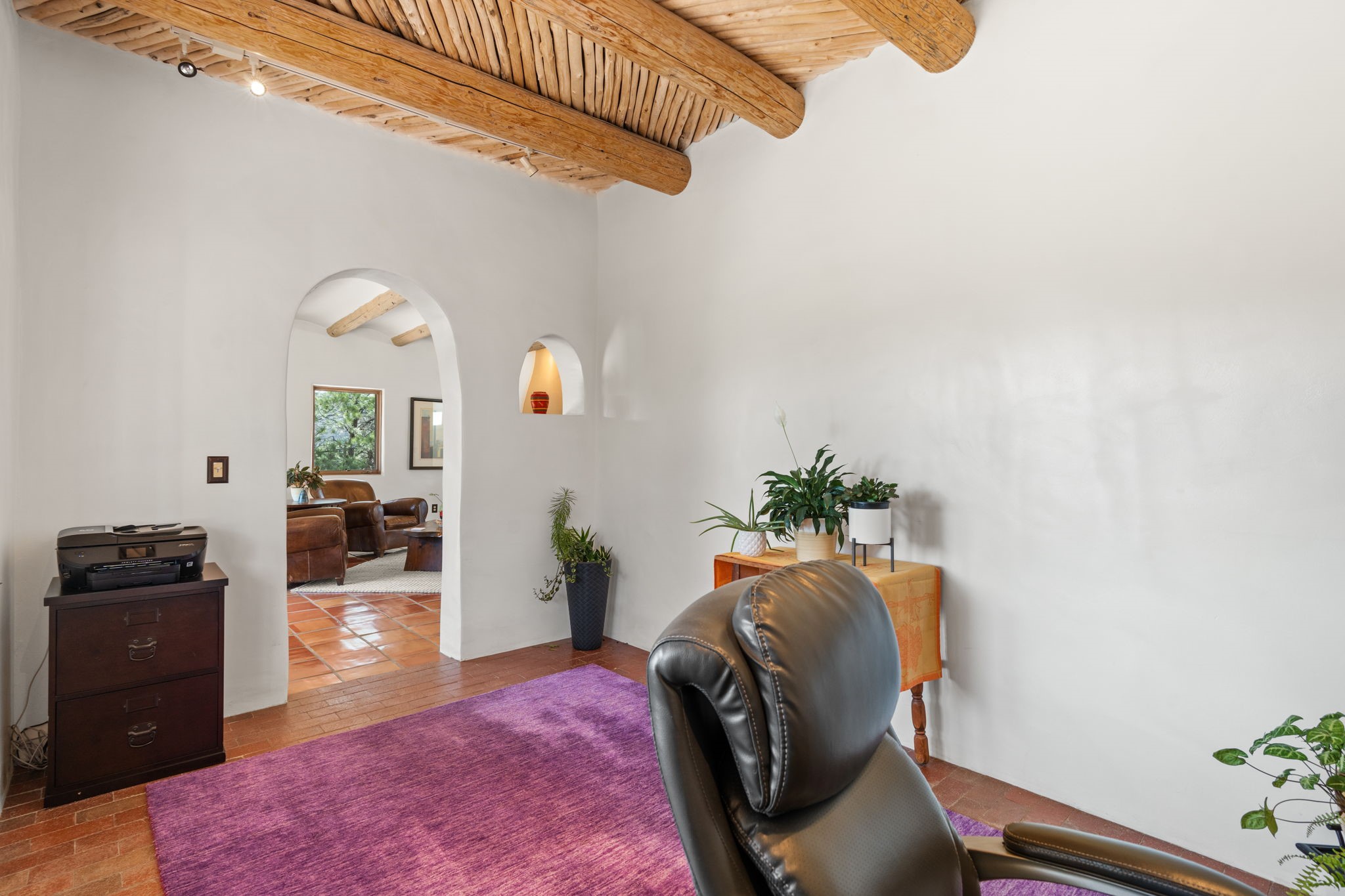 Welcome to your dream retreat: a 3,956-square-foot haven where classic Southwestern charm meets modern comfort. Located just minutes from downtown, this thoughtfully designed 3-bedroom, 3-bath home sits on 1.08 private acres with no HOA.Inside, you'll find Saltillo tile floors, hand-troweled plaster walls, and a generous living room with coved ceilings and abundant natural light. Clerestory windows and skylights fill the home with sunshine, and a sliding door opens to a stunning wraparound portal--perfect for year-round entertaining or quiet evenings under the stars.The kitchen is a chef's delight with newer appliances, ample cabinetry, and a spacious walk-in pantry. A charming office features traditional vigas and a latilla ceiling, ideal as a serene workspace or studio.The primary suite offers a corner kiva fireplace, two walk-in closets, and a private portal entrance. The updated en-suite bath includes a deep jetted tub and custom tile. The guest bath features a colorful Mexican tile arch over the tub for added charm.A lovely newer addition expands the living space with hickory wood floors, two bright bedrooms, a stylish bath with sun shower, and a large den with a fireplace, wood stove insert, built-ins, kitchenette, and wet bar. One bedroom has its own portal entrance for added privacy.Modern comforts include forced air heat, refrigerated air, and in-floor radiant heat in the newer section. Outside, you'll find a one-car garage, two-car carport, and a versatile studio once used for pottery--now a great workout space or creative workshop.This special home blends timeless Santa Fe architecture with thoughtful updates and artistic flair. More than a home--it's a lifestyle.