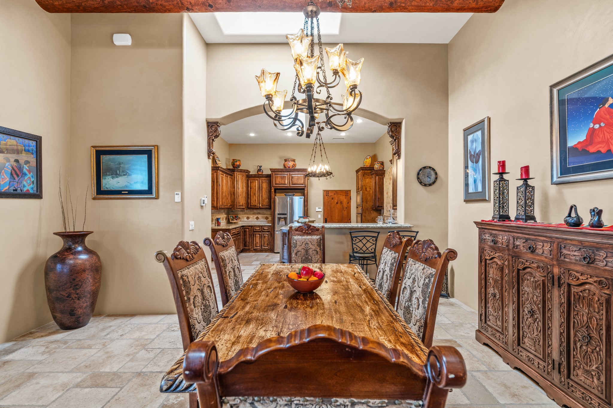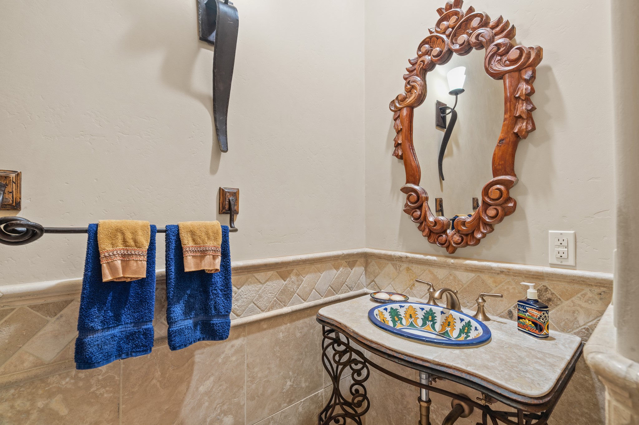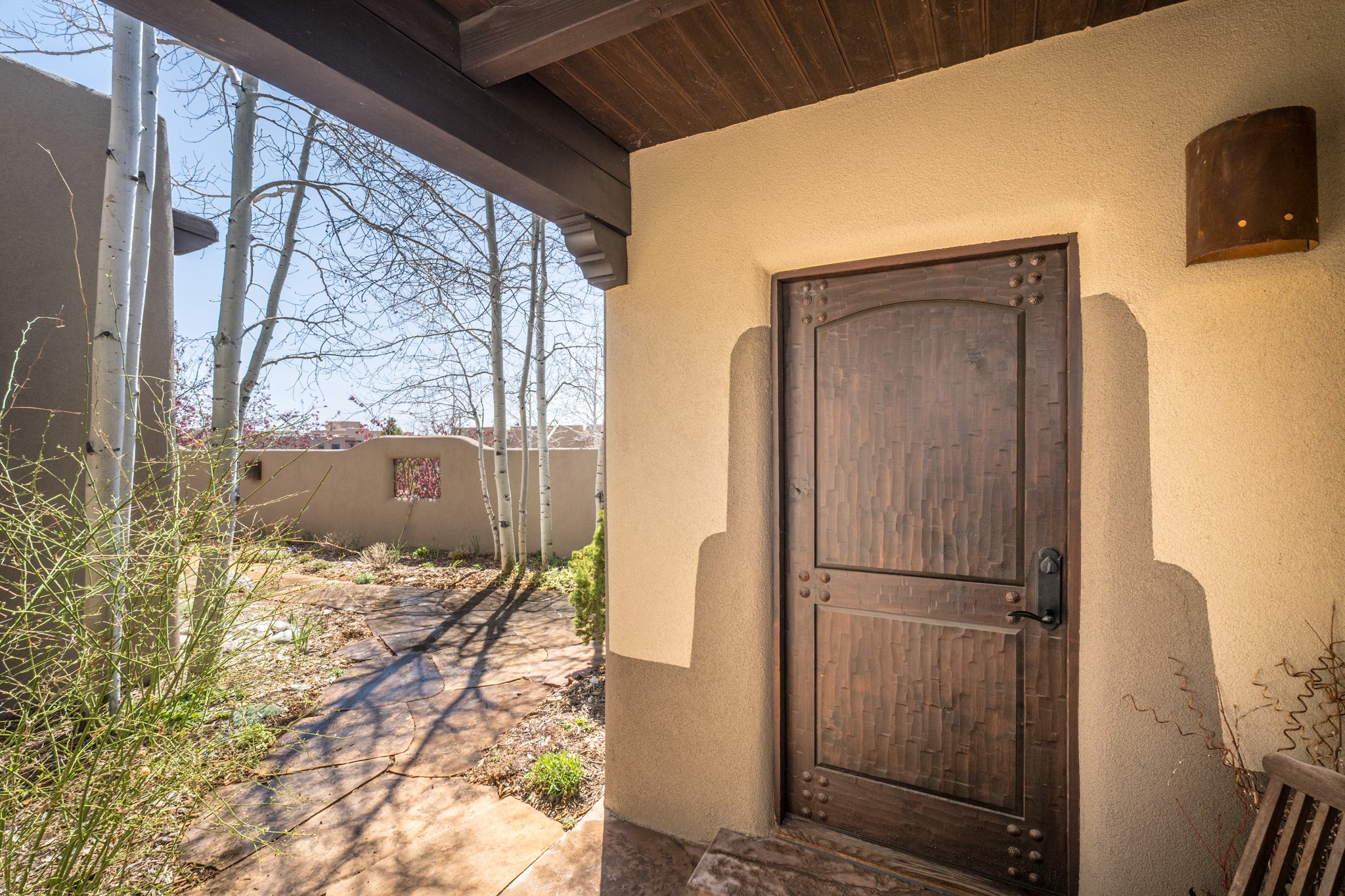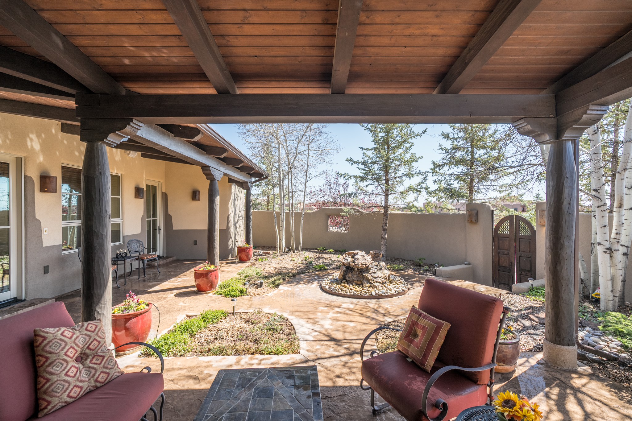 Discover this amazing single-level home with a detached guest house nestled in the serene community of Aldea. Located on a quiet cul-de-sac, this property welcomes you home with a charming enclosed courtyard and fountain, leading into a light-filled, open-concept floor plan that's perfect for both relaxing and entertaining. Enjoy breathtaking sunset views from the covered portals, or cozy up by one of the two gas fireplaces. The home features vaulted ceilings, beautiful travertine tile, and handcrafted wood doors and cabinetry imported from Mexico. The chef's kitchen is a dream, complete with a pantry, wine cooler, and plenty of space for culinary creativity. Each bedroom is ensuite with its own bathroom and walk-in closet, offering great separation and privacy. Just minutes from downtown, the neighborhood offers quiet charm, walking and hiking paths, a tennis court, a basketball court, and regular HOA-hosted events. With peaceful open spaces, wildlife, and a strong sense of community, this home truly has it all.
