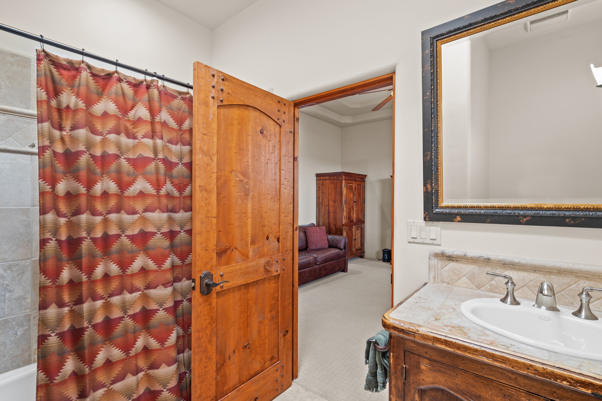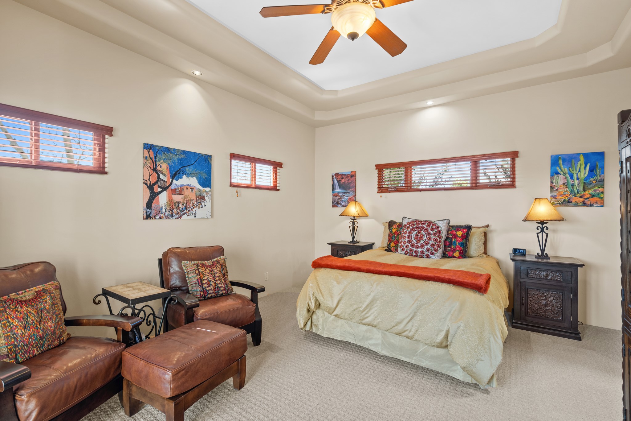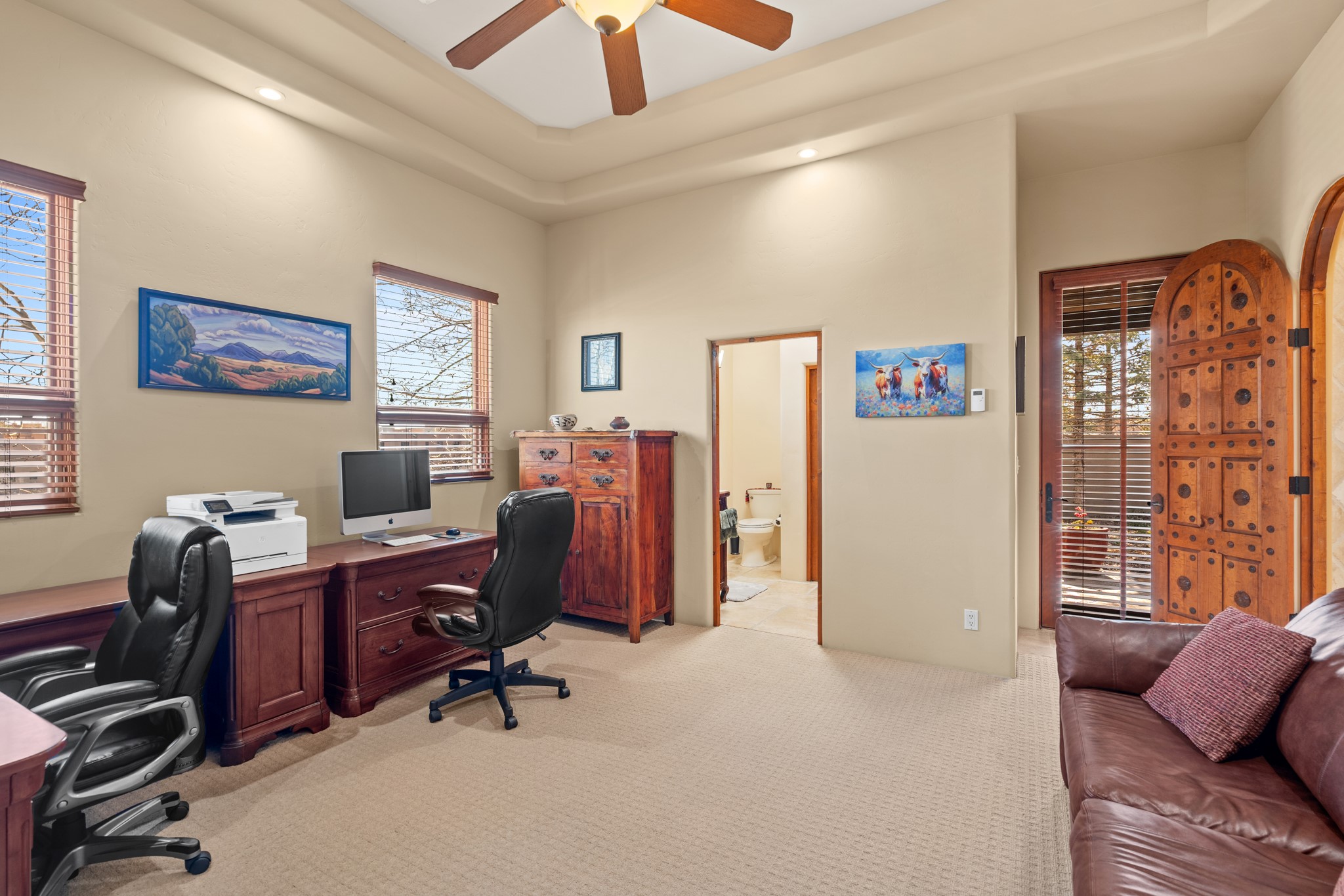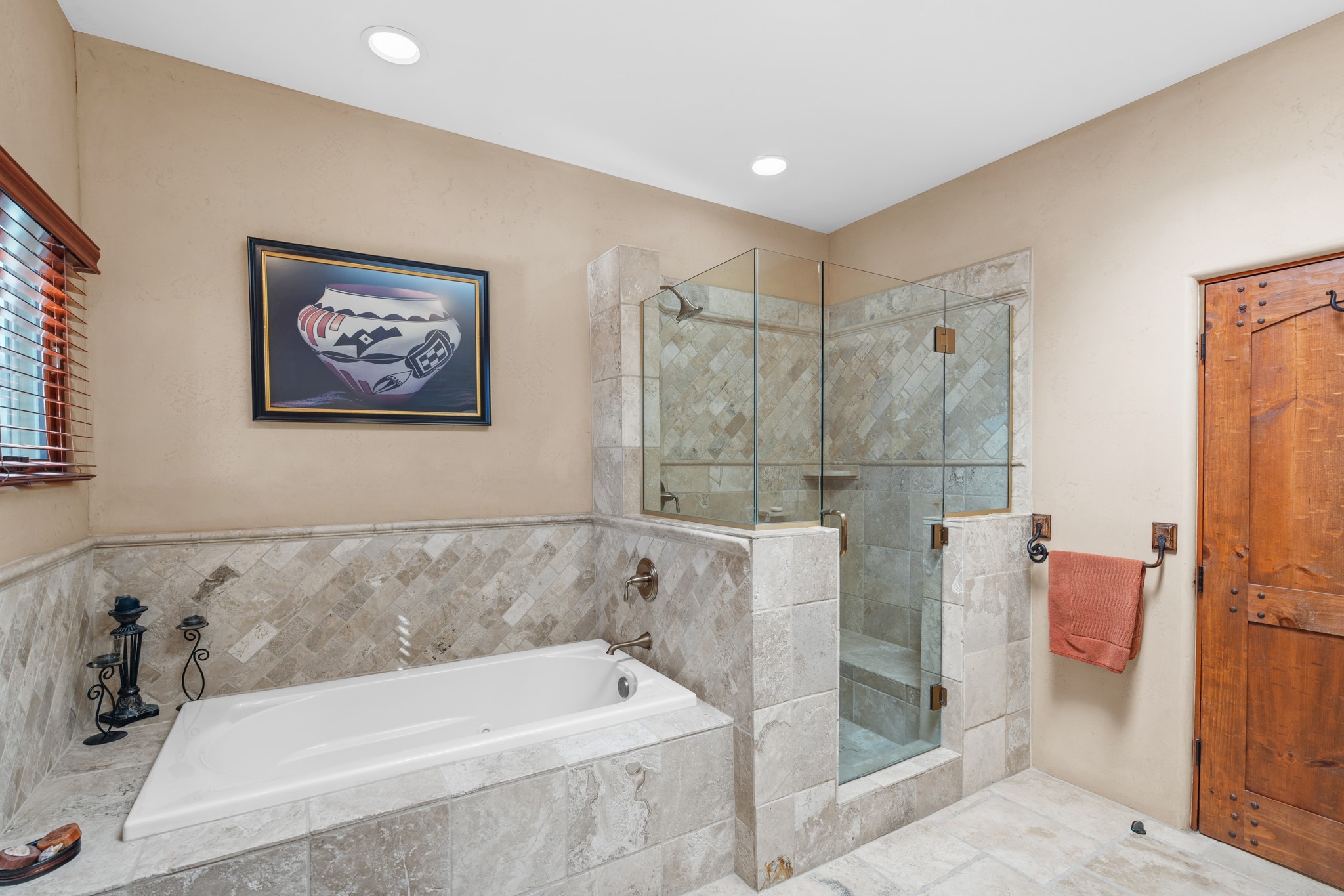 Discover this amazing single-level home with a detached guest house nestled in the serene community of Aldea. Located on a quiet cul-de-sac, this property welcomes you home with a charming enclosed courtyard and fountain, leading into a light-filled, open-concept floor plan that's perfect for both relaxing and entertaining. Enjoy breathtaking sunset views from the covered portals, or cozy up by one of the two gas fireplaces. The home features vaulted ceilings, beautiful travertine tile, and handcrafted wood doors and cabinetry imported from Mexico. The chef's kitchen is a dream, complete with a pantry, wine cooler, and plenty of space for culinary creativity. Each bedroom is ensuite with its own bathroom and walk-in closet, offering great separation and privacy. Just minutes from downtown, the neighborhood offers quiet charm, walking and hiking paths, a tennis court, a basketball court, and regular HOA-hosted events. With peaceful open spaces, wildlife, and a strong sense of community, this home truly has it all.