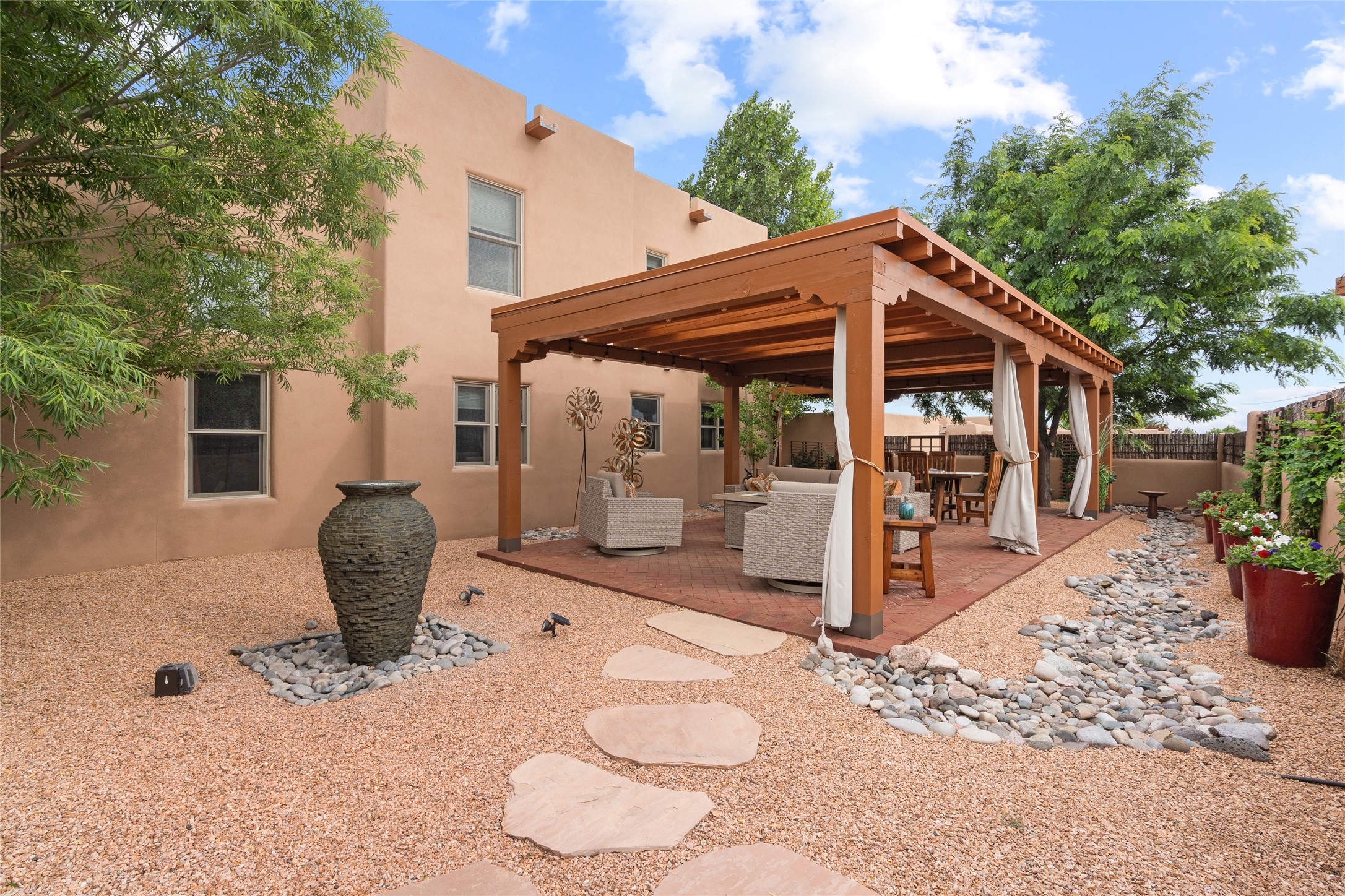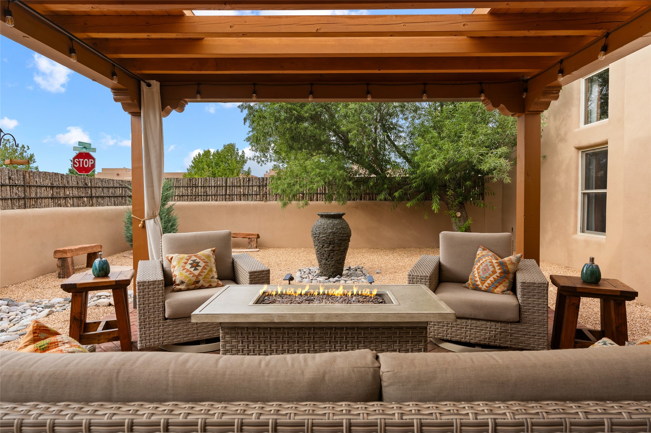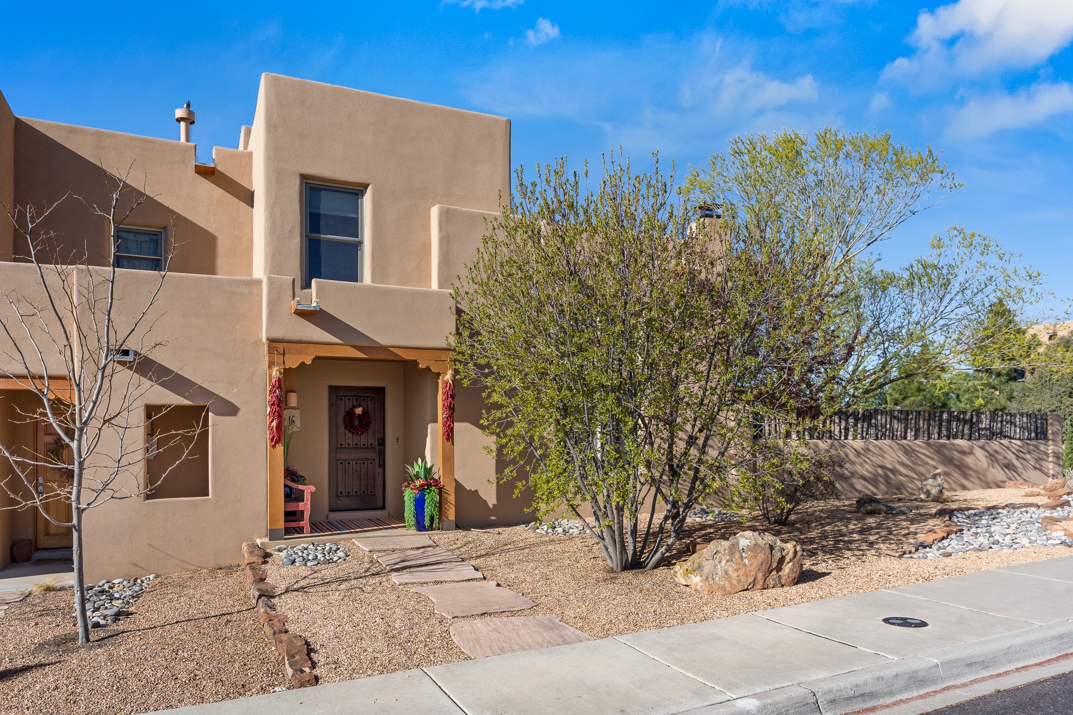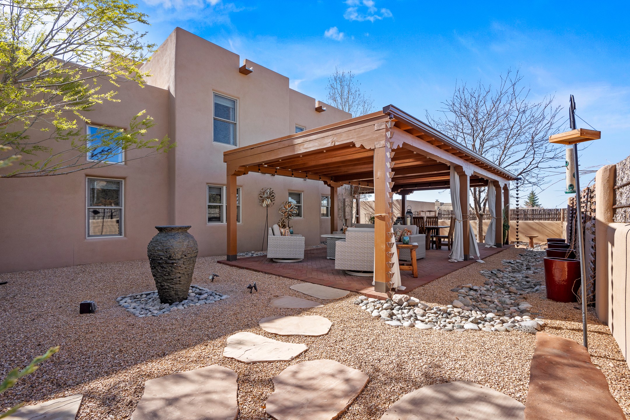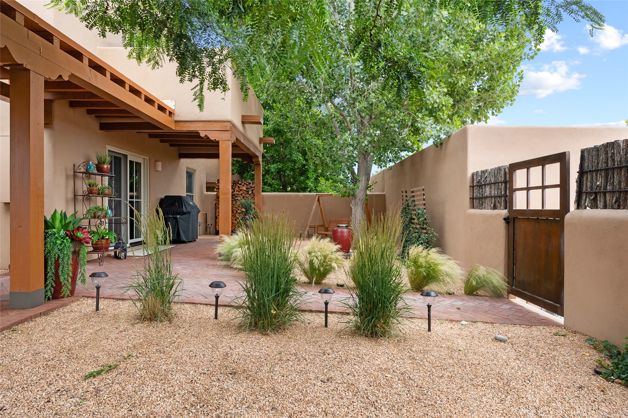 This exceptional 2,266 sq. ft. townhome blends comfort, elegance, and warmth into a beautifully crafted living experience. Move-in ready with new roof, stucco, rear exterior doors, mini splits in every room (2023), and a new furnace and tankless water heater (2022), no maintenance has been deferred. With 3 bedrooms, 2.5 bathrooms, and a 2-car garage plus 2 additional adjacent parking spaces, this home offers elevated style in one of Santa Fe's most sought-after communities. Step inside and be captivated by the dramatic high ceilings, accented with hand-hewn beams and a cozy kiva fireplace that anchors the light-filled living room. Unlike most in Aldea, this residence features a separate family room off the kitchen--a versatile space ideal for intimate gatherings. The kitchen features granite countertops and modern appliances. Step outside into your private courtyard oasis--fully landscaped and designed for both serene unwinding and lively entertaining. Relax under the custom pergola with skylights that filter the perfect touch of sunlight while listening to the soothing sounds of the fountain. Upstairs, the primary suite offers a true sanctuary with a California Closet and a private deck --perfect for sunset reflections or morning coffee. Two additional bedrooms provide space and comfort for guests or a home office. Additional features include custom floor-to-ceiling drapes in living room, pleated cellular blinds, modern lighting, and curated fixtures. From the elegant living and dining room to the thoughtfully designed outdoor haven, this home is more than a residence--it's a feeling. A place where every detail has been considered, every space crafted to invite peace, beauty, and connection. Come home to Aldea--where luxury lives!