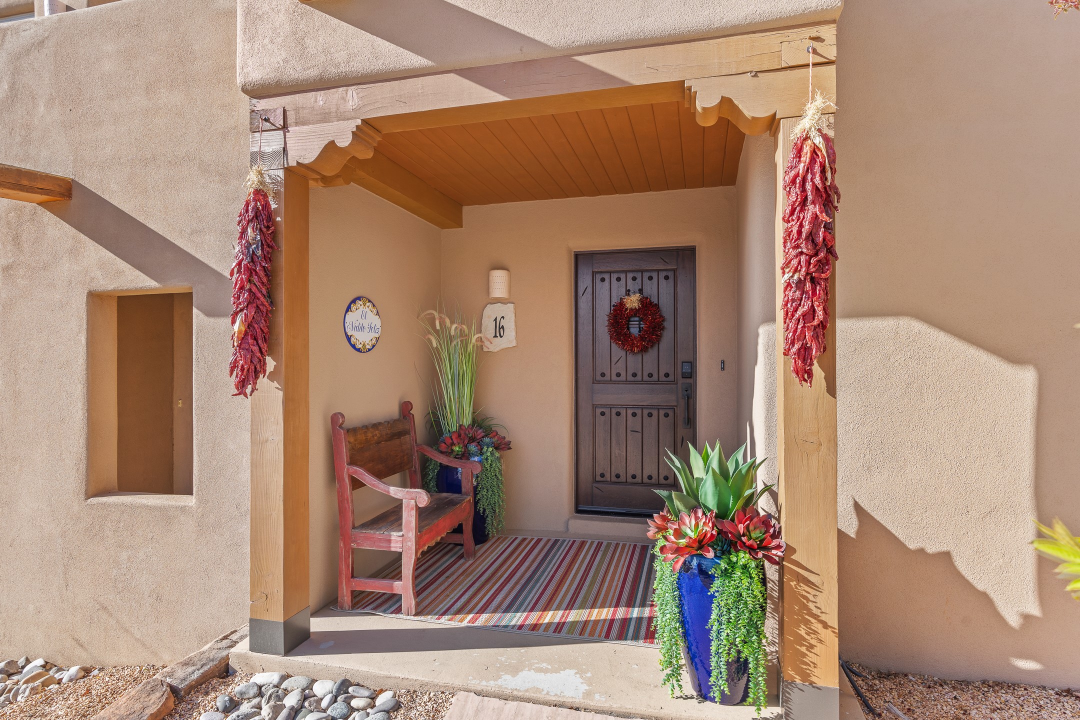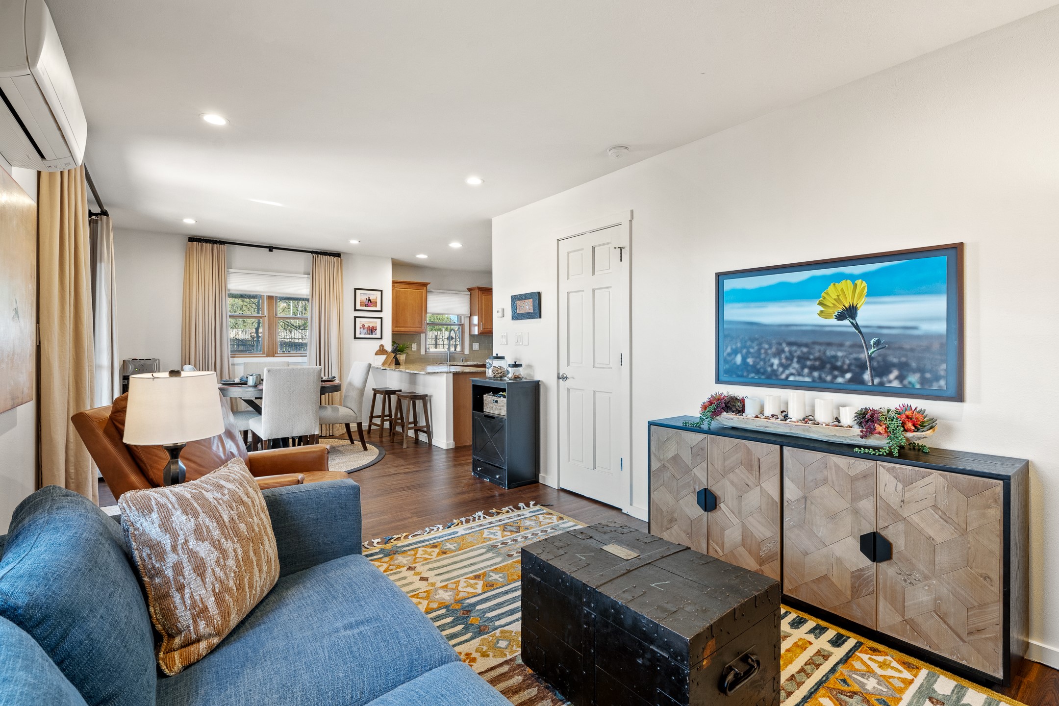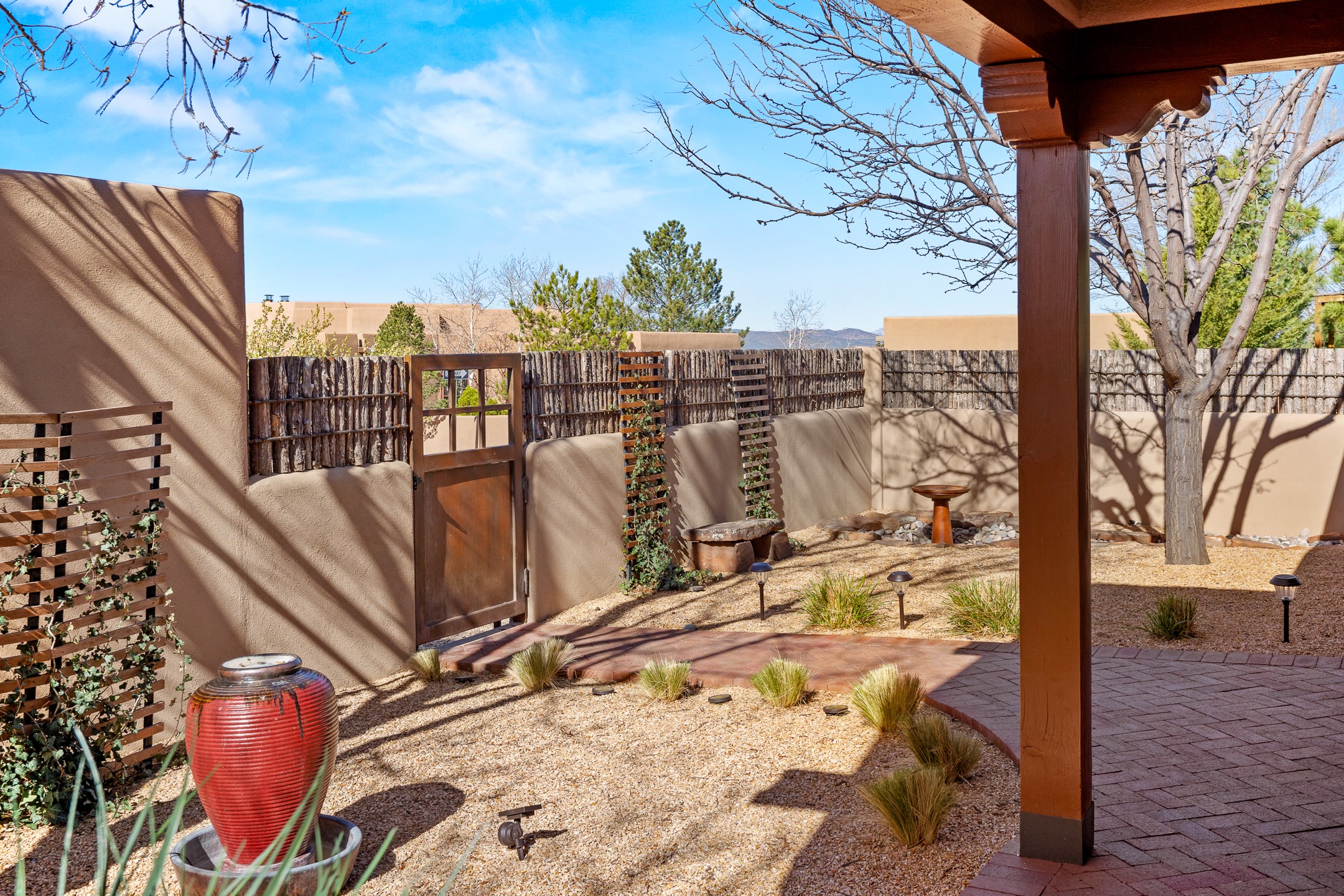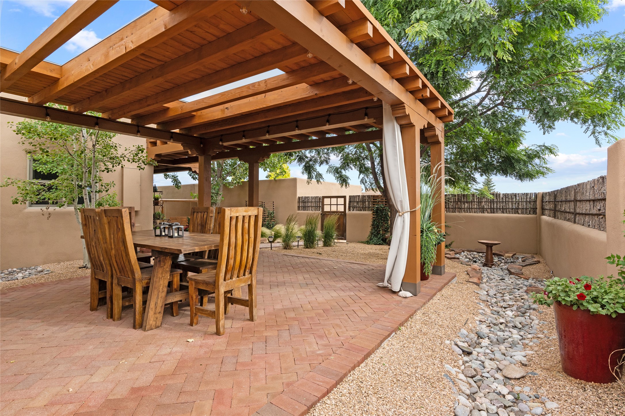 This exceptional 2,266 sq. ft. townhome blends comfort, elegance, and warmth into a beautifully crafted living experience. Move-in ready with new roof, stucco, rear exterior doors, mini splits in every room (2023), and a new furnace and tankless water heater (2022), no maintenance has been deferred. With 3 bedrooms, 2.5 bathrooms, and a 2-car garage plus 2 additional adjacent parking spaces, this home offers elevated style in one of Santa Fe's most sought-after communities. Step inside and be captivated by the dramatic high ceilings, accented with hand-hewn beams and a cozy kiva fireplace that anchors the light-filled living room. Unlike most in Aldea, this residence features a separate family room off the kitchen--a versatile space ideal for intimate gatherings. The kitchen features granite countertops and modern appliances. Step outside into your private courtyard oasis--fully landscaped and designed for both serene unwinding and lively entertaining. Relax under the custom pergola with skylights that filter the perfect touch of sunlight while listening to the soothing sounds of the fountain. Upstairs, the primary suite offers a true sanctuary with a California Closet and a private deck --perfect for sunset reflections or morning coffee. Two additional bedrooms provide space and comfort for guests or a home office. Additional features include custom floor-to-ceiling drapes in living room, pleated cellular blinds, modern lighting, and curated fixtures. From the elegant living and dining room to the thoughtfully designed outdoor haven, this home is more than a residence--it's a feeling. A place where every detail has been considered, every space crafted to invite peace, beauty, and connection. Come home to Aldea--where luxury lives!