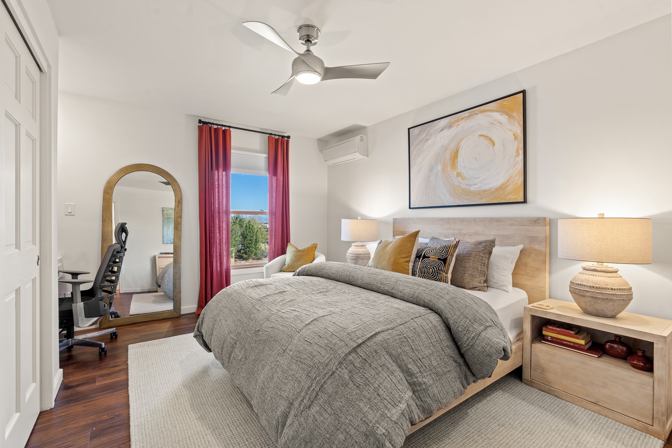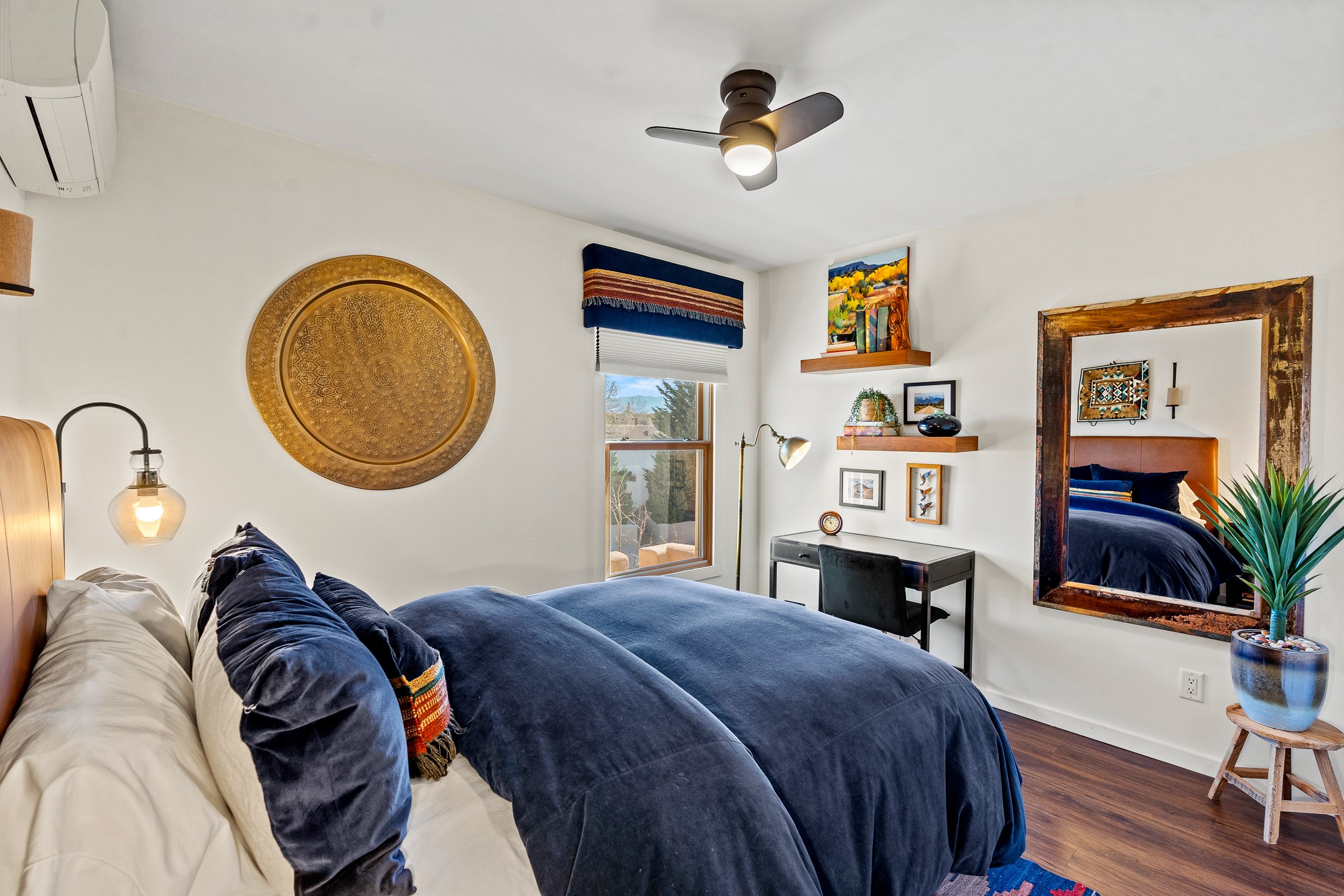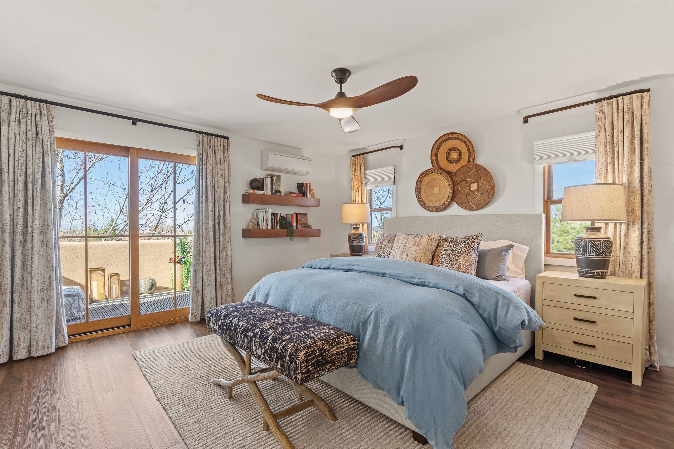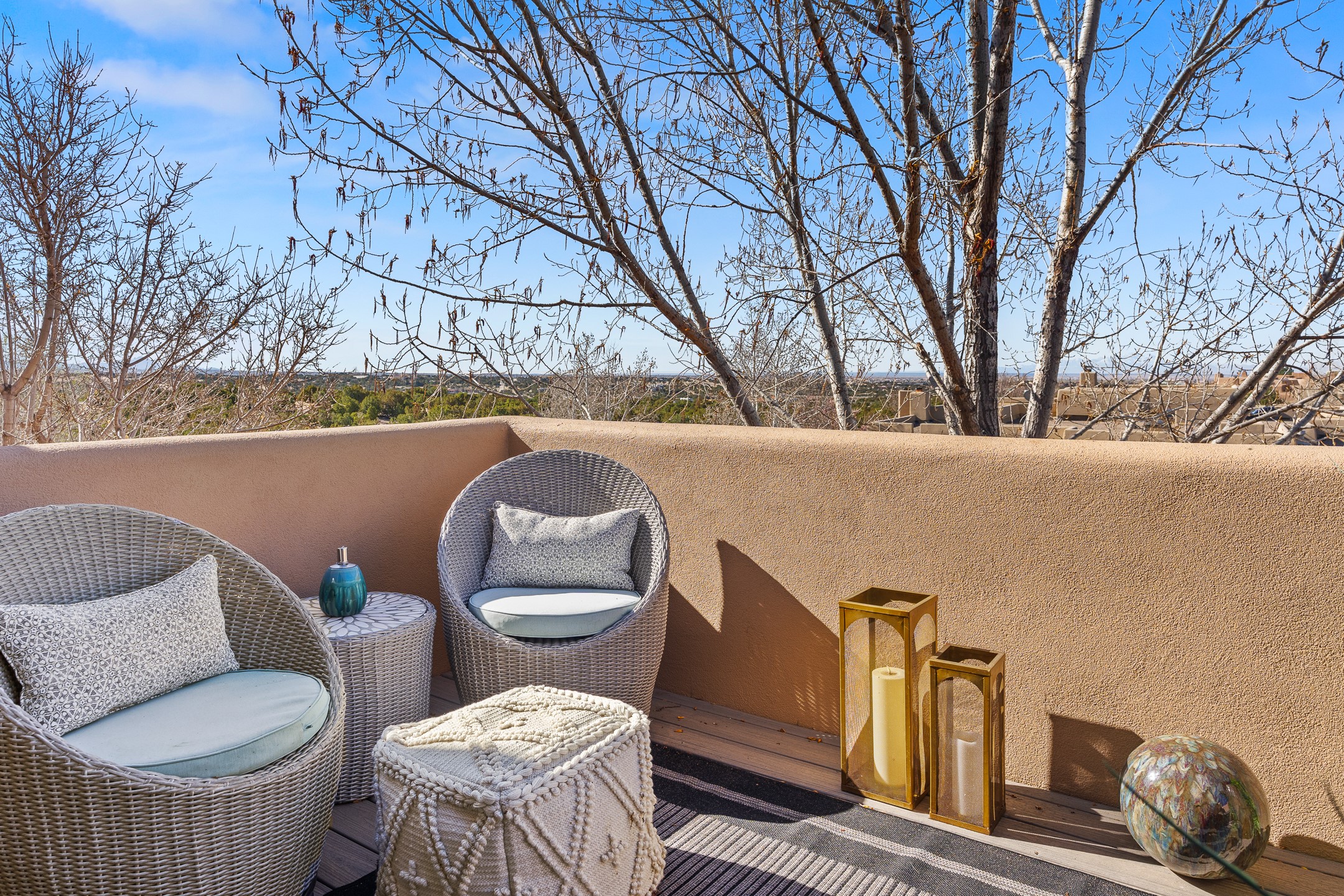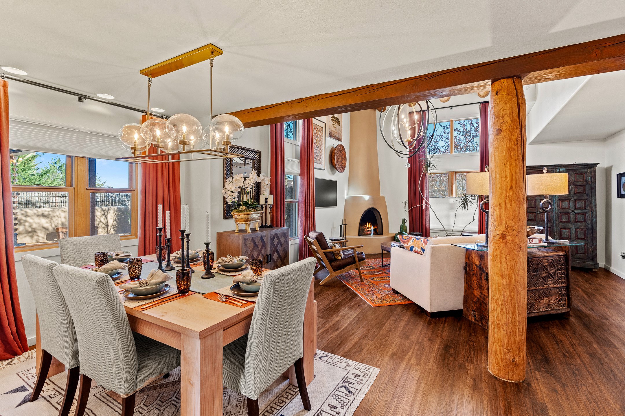 This exceptional 2,266 sq. ft. townhome blends comfort, elegance, and warmth into a beautifully crafted living experience. Move-in ready with new roof, stucco, rear exterior doors, mini splits in every room (2023), and a new furnace and tankless water heater (2022), no maintenance has been deferred. With 3 bedrooms, 2.5 bathrooms, and a 2-car garage plus 2 additional adjacent parking spaces, this home offers elevated style in one of Santa Fe's most sought-after communities. Step inside and be captivated by the dramatic high ceilings, accented with hand-hewn beams and a cozy kiva fireplace that anchors the light-filled living room. Unlike most in Aldea, this residence features a separate family room off the kitchen--a versatile space ideal for intimate gatherings. The kitchen features granite countertops and modern appliances. Step outside into your private courtyard oasis--fully landscaped and designed for both serene unwinding and lively entertaining. Relax under the custom pergola with skylights that filter the perfect touch of sunlight while listening to the soothing sounds of the fountain. Upstairs, the primary suite offers a true sanctuary with a California Closet and a private deck --perfect for sunset reflections or morning coffee. Two additional bedrooms provide space and comfort for guests or a home office. Additional features include custom floor-to-ceiling drapes in living room, pleated cellular blinds, modern lighting, and curated fixtures. From the elegant living and dining room to the thoughtfully designed outdoor haven, this home is more than a residence--it's a feeling. A place where every detail has been considered, every space crafted to invite peace, beauty, and connection. Come home to Aldea--where luxury lives!