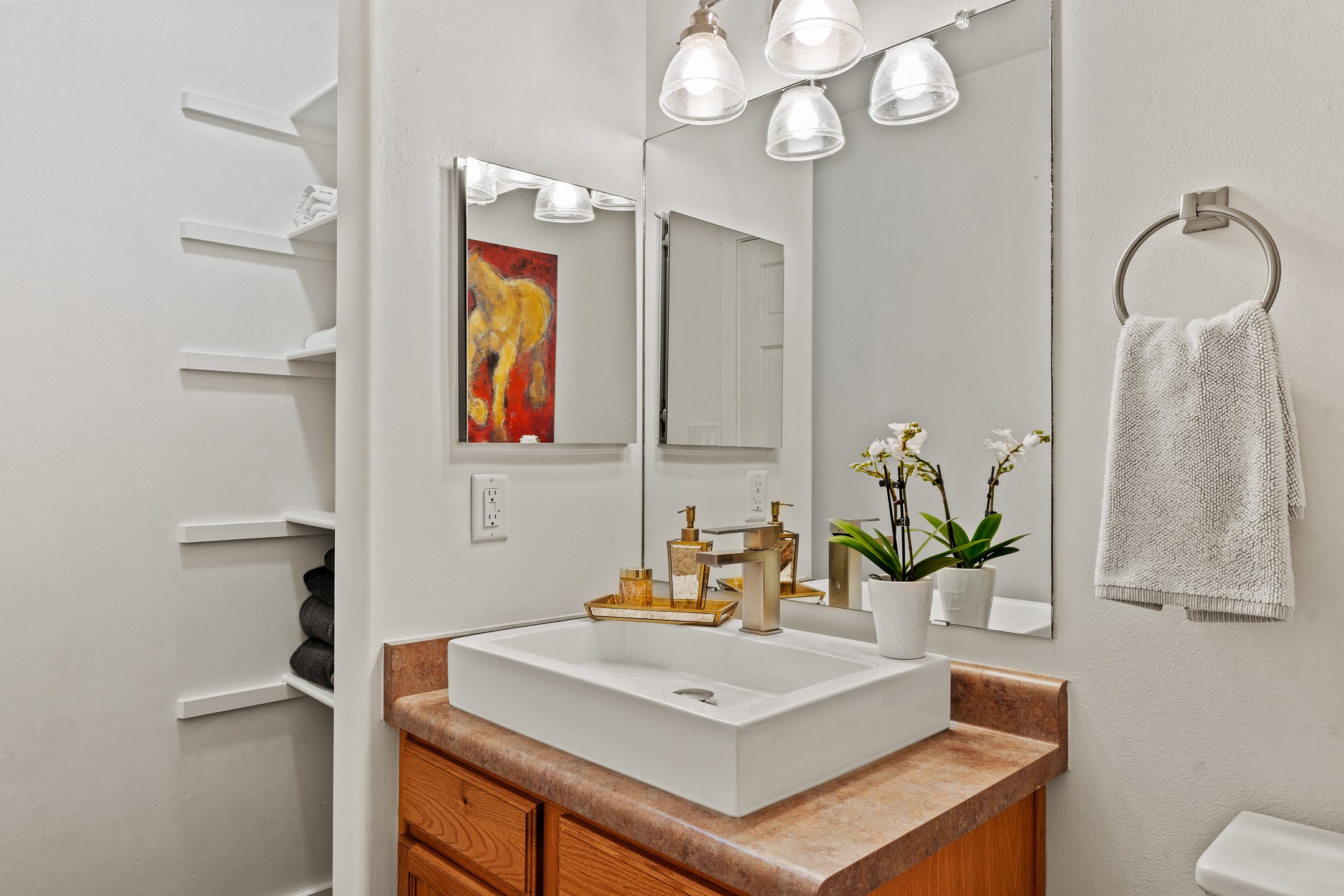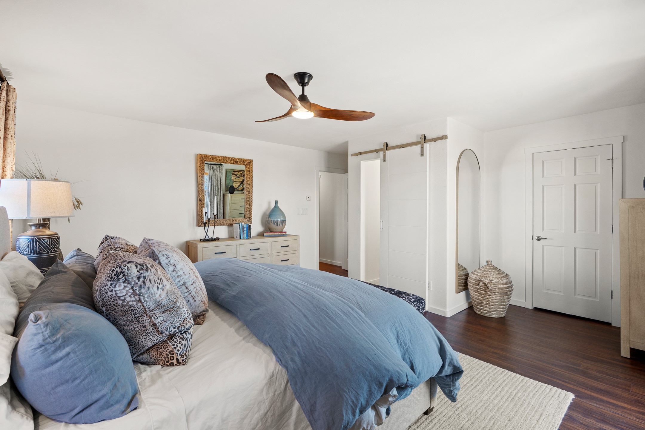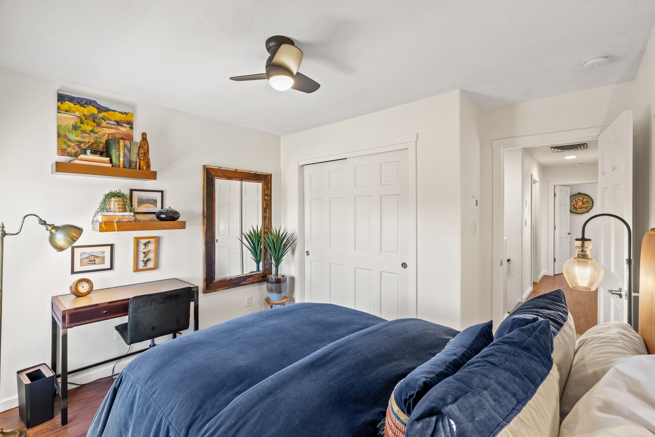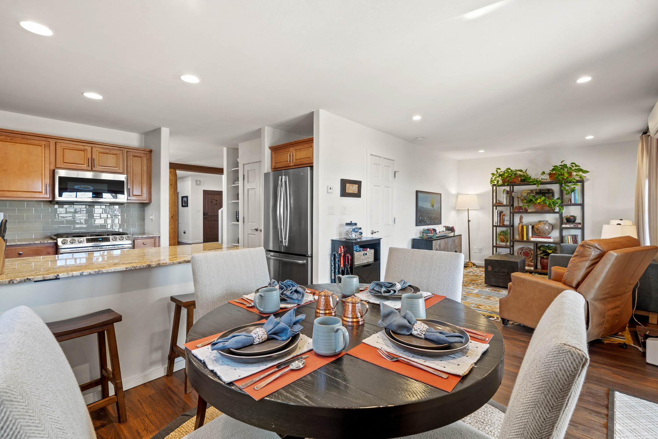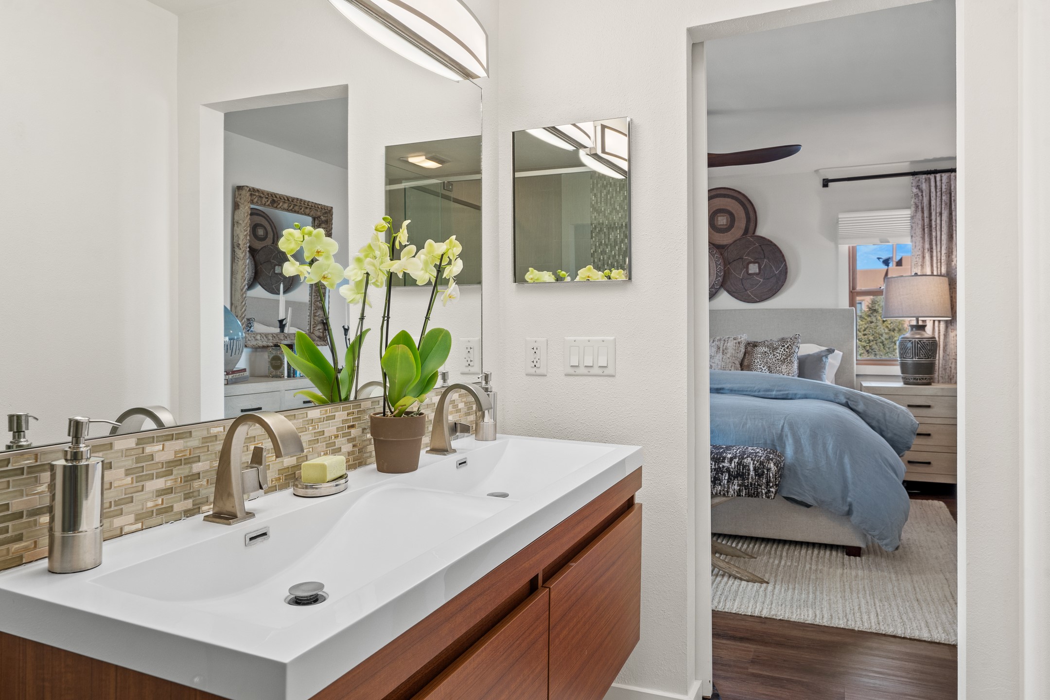 This exceptional 2,266 sq. ft. townhome blends comfort, elegance, and warmth into a beautifully crafted living experience. Move-in ready with new roof, stucco, rear exterior doors, mini splits in every room (2023), and a new furnace and tankless water heater (2022), no maintenance has been deferred. With 3 bedrooms, 2.5 bathrooms, and a 2-car garage plus 2 additional adjacent parking spaces, this home offers elevated style in one of Santa Fe's most sought-after communities. Step inside and be captivated by the dramatic high ceilings, accented with hand-hewn beams and a cozy kiva fireplace that anchors the light-filled living room. Unlike most in Aldea, this residence features a separate family room off the kitchen--a versatile space ideal for intimate gatherings. The kitchen features granite countertops and modern appliances. Step outside into your private courtyard oasis--fully landscaped and designed for both serene unwinding and lively entertaining. Relax under the custom pergola with skylights that filter the perfect touch of sunlight while listening to the soothing sounds of the fountain. Upstairs, the primary suite offers a true sanctuary with a California Closet and a private deck --perfect for sunset reflections or morning coffee. Two additional bedrooms provide space and comfort for guests or a home office. Additional features include custom floor-to-ceiling drapes in living room, pleated cellular blinds, modern lighting, and curated fixtures. From the elegant living and dining room to the thoughtfully designed outdoor haven, this home is more than a residence--it's a feeling. A place where every detail has been considered, every space crafted to invite peace, beauty, and connection. Come home to Aldea--where luxury lives!