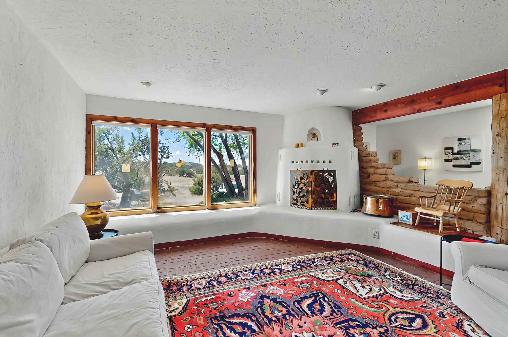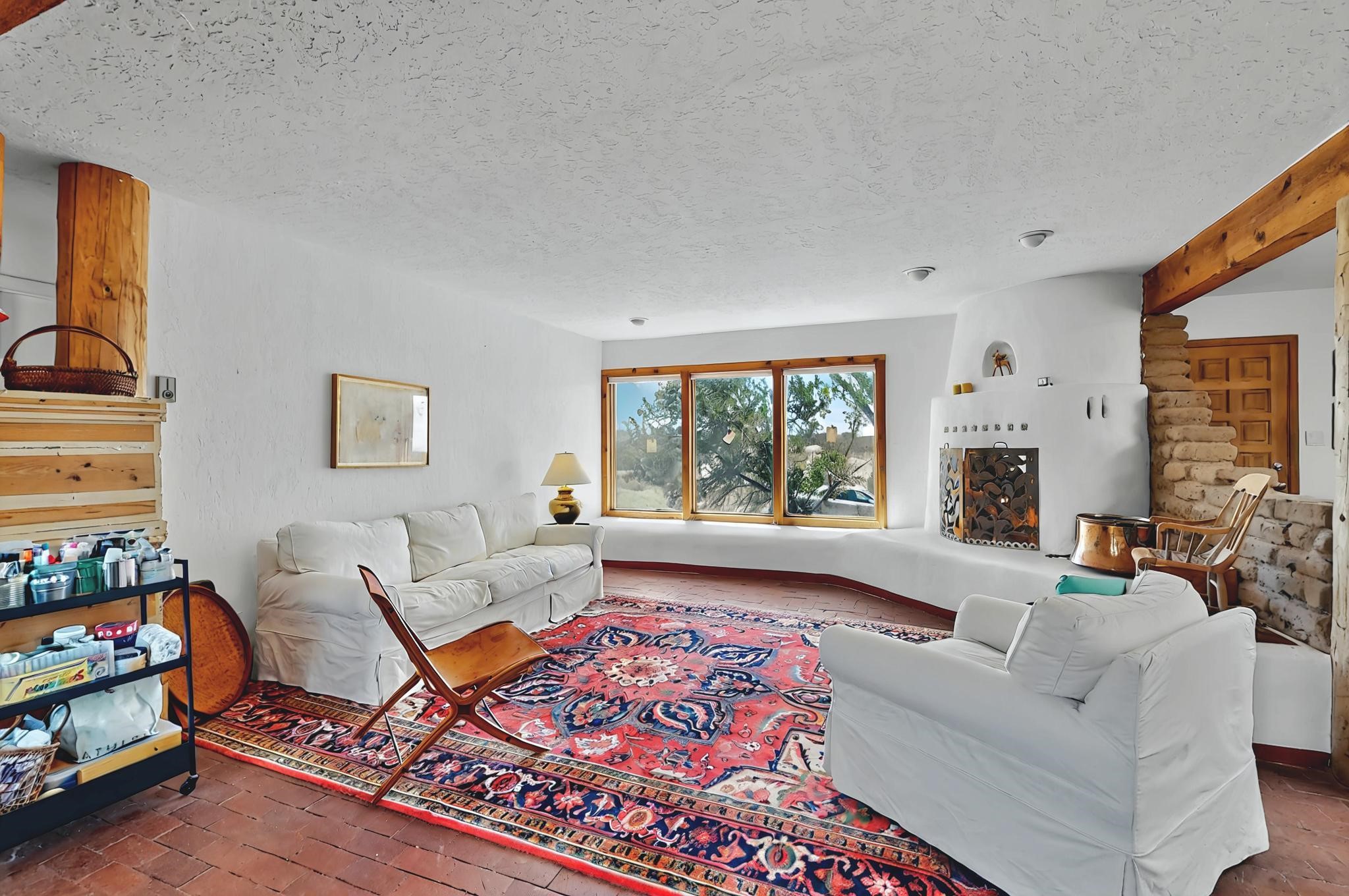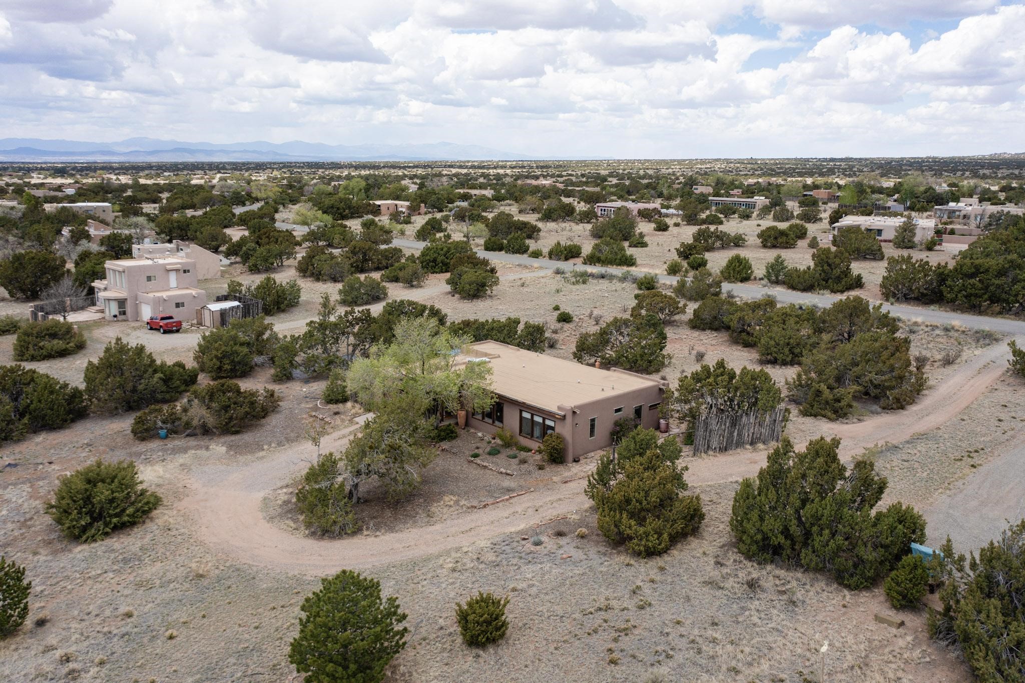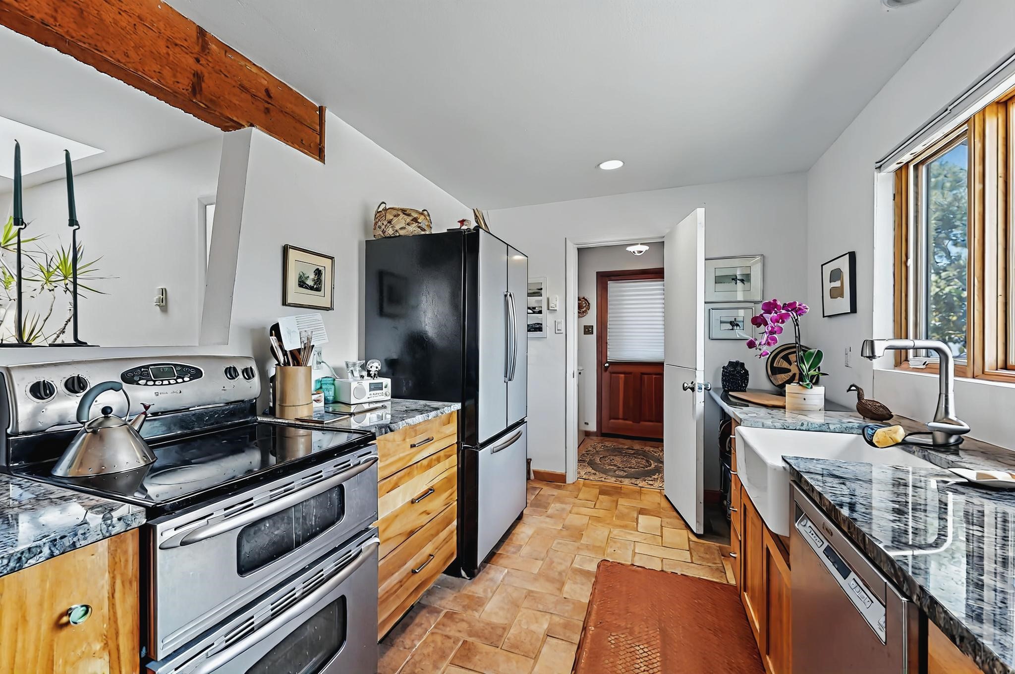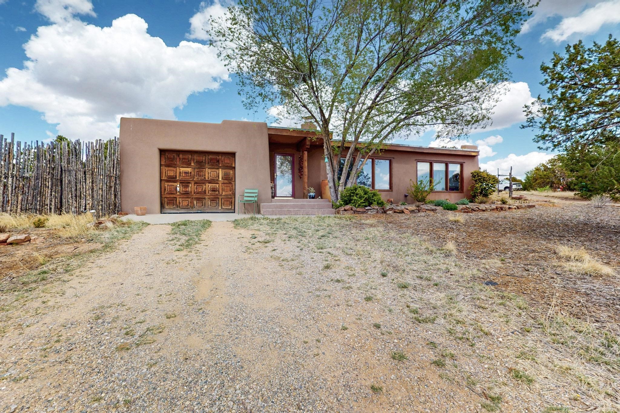 VIEWS VIEWS VIEWS from every room. Mountains, green belt and trees in a very private location. Traditional banco and kiva fireplace in living area, brick floors, and adobe wall at entry. Totally renovated kitchen with granite counters and totally renovated modern bathroom. Two bedrooms either side of updated bathroom have unfinished cement floors due to owner's allergies. Plantings on drip. 2 1/2 year old heat pump with electric baseboard backup; refrigerator 2020; dishwasher 2019; washing machine 2018; newer stucco with remaining 5 year warranty; roof refresh 2024 with 2 year warranty; water heater 2025. No VOC paints.