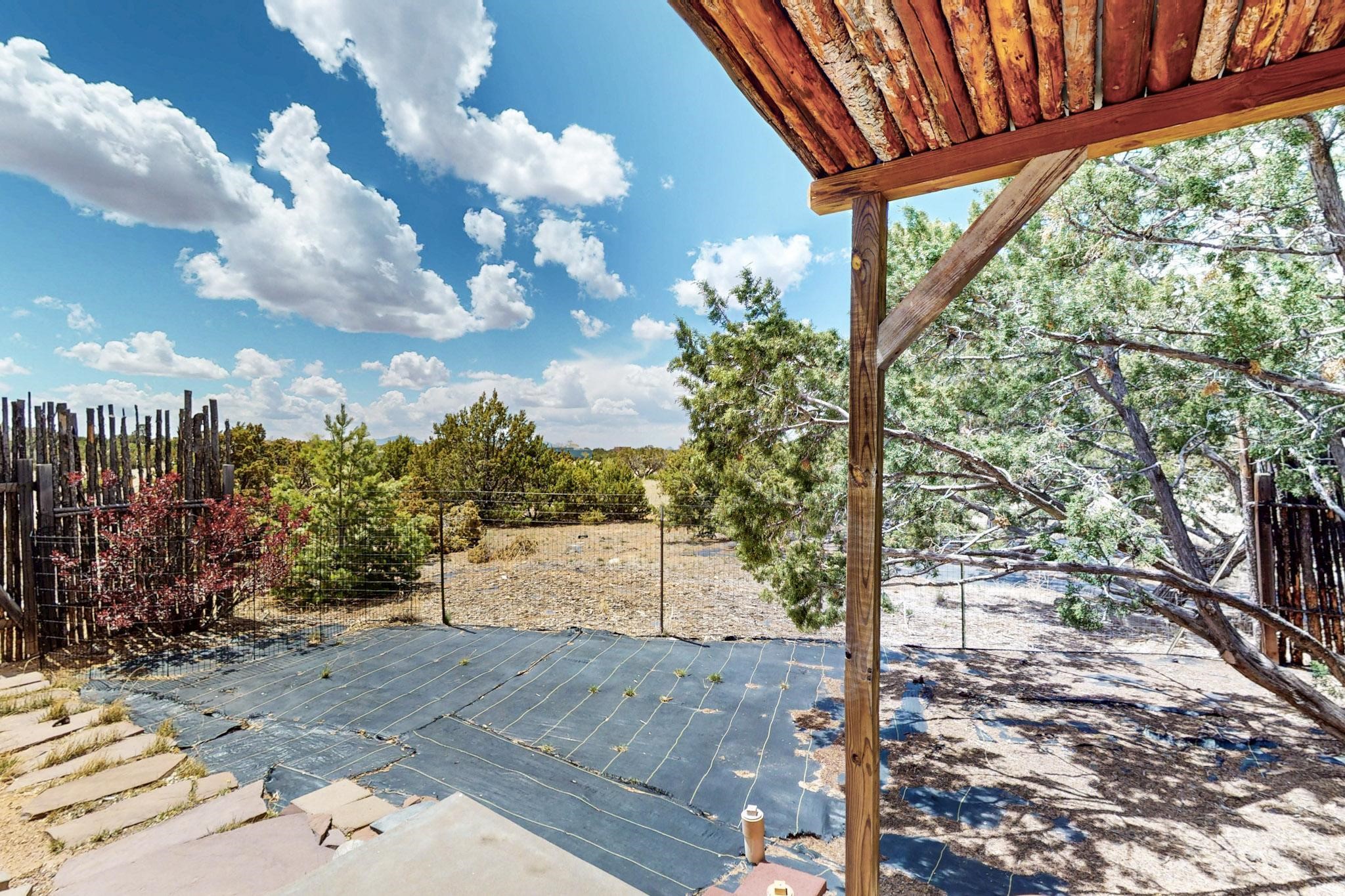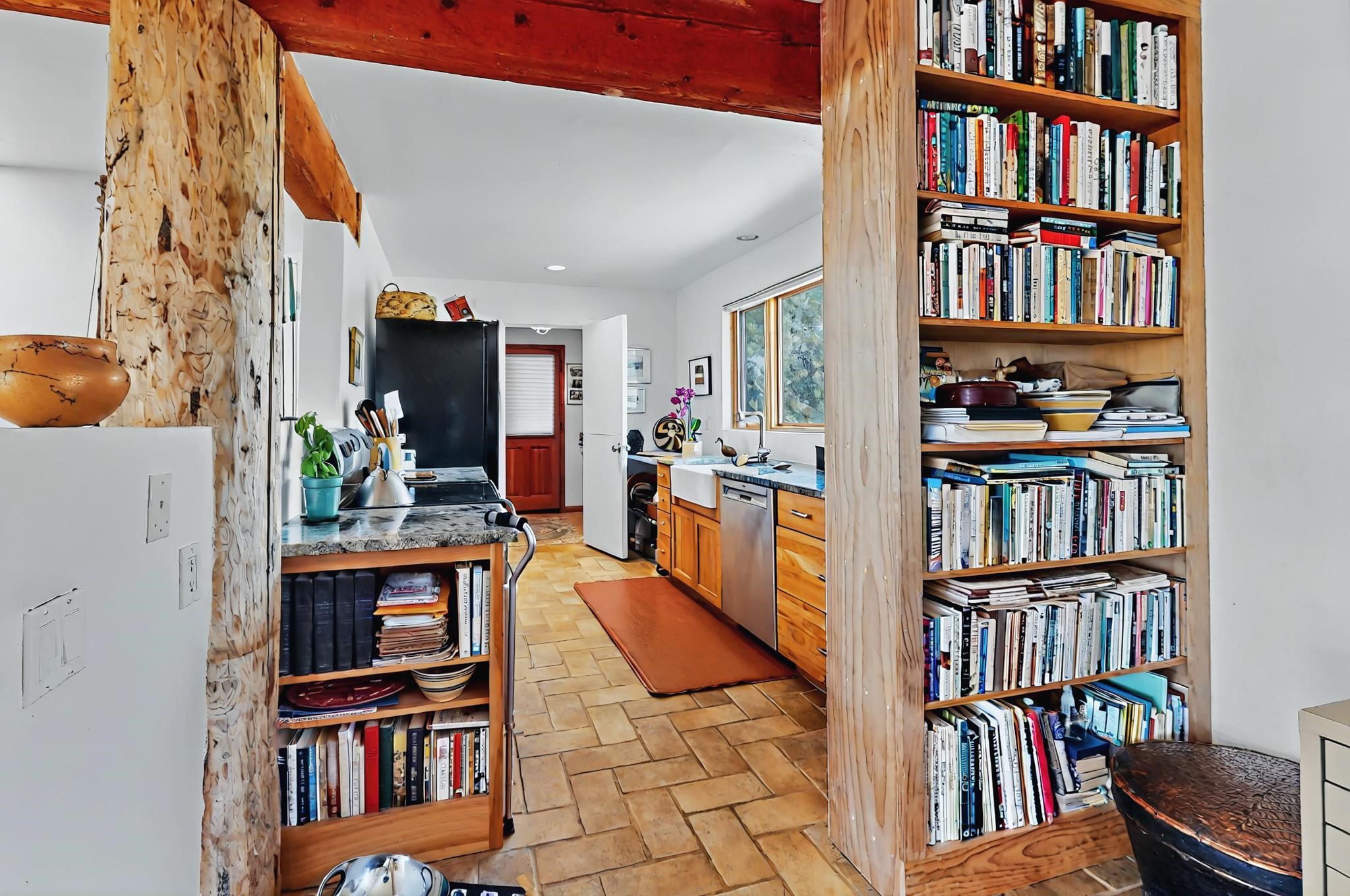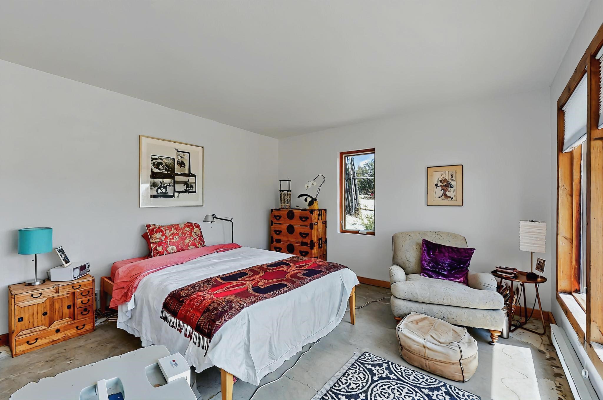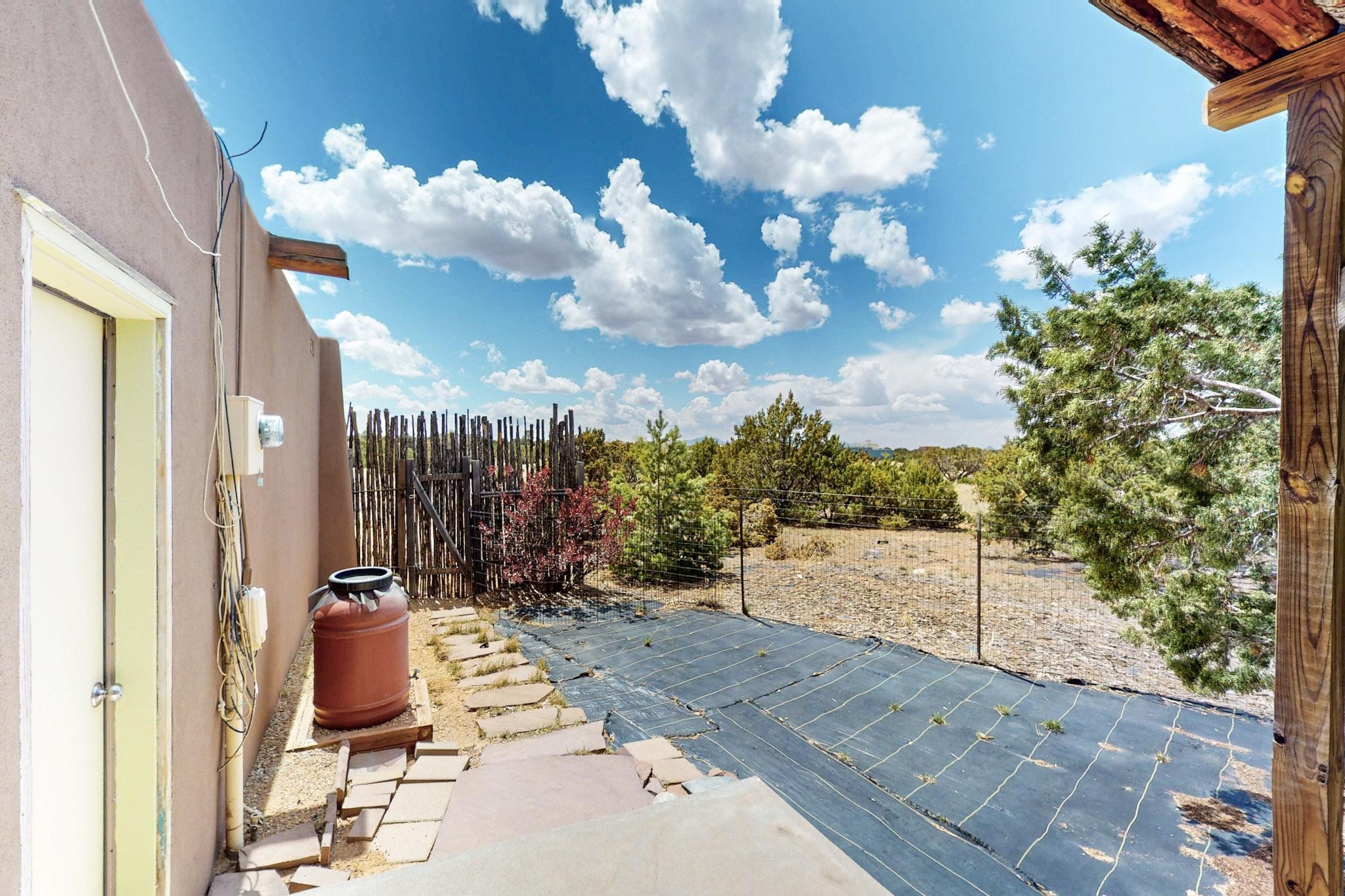 VIEWS VIEWS VIEWS from every room. Mountains, green belt and trees in a very private location. Traditional banco and kiva fireplace in living area, brick floors, and adobe wall at entry. Totally renovated kitchen with granite counters and totally renovated modern bathroom. Two bedrooms either side of updated bathroom have unfinished cement floors due to owner's allergies. Plantings on drip. 2 1/2 year old heat pump with electric baseboard backup; refrigerator 2020; dishwasher 2019; washing machine 2018; newer stucco with remaining 5 year warranty; roof refresh 2024 with 2 year warranty; water heater 2025. No VOC paints.